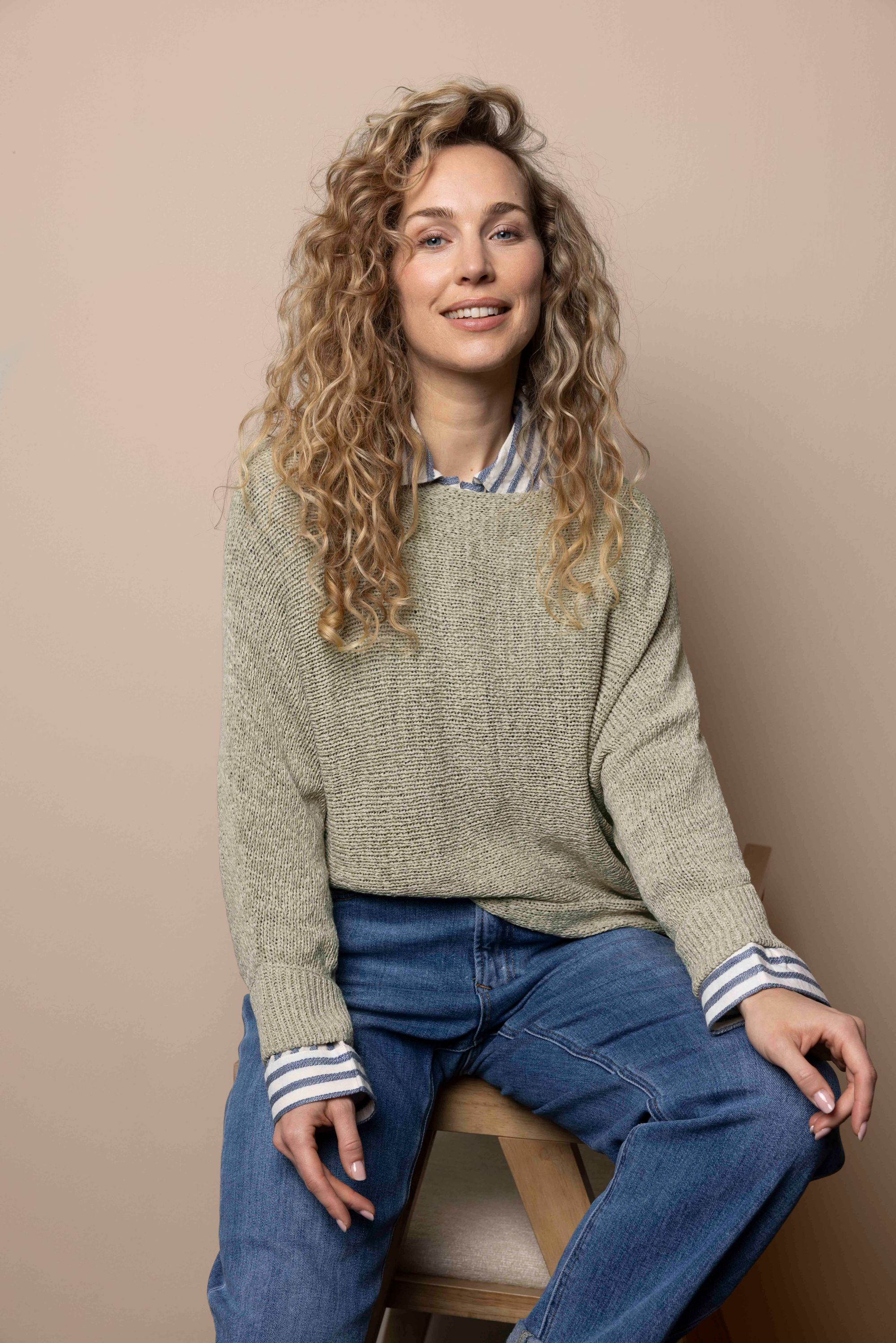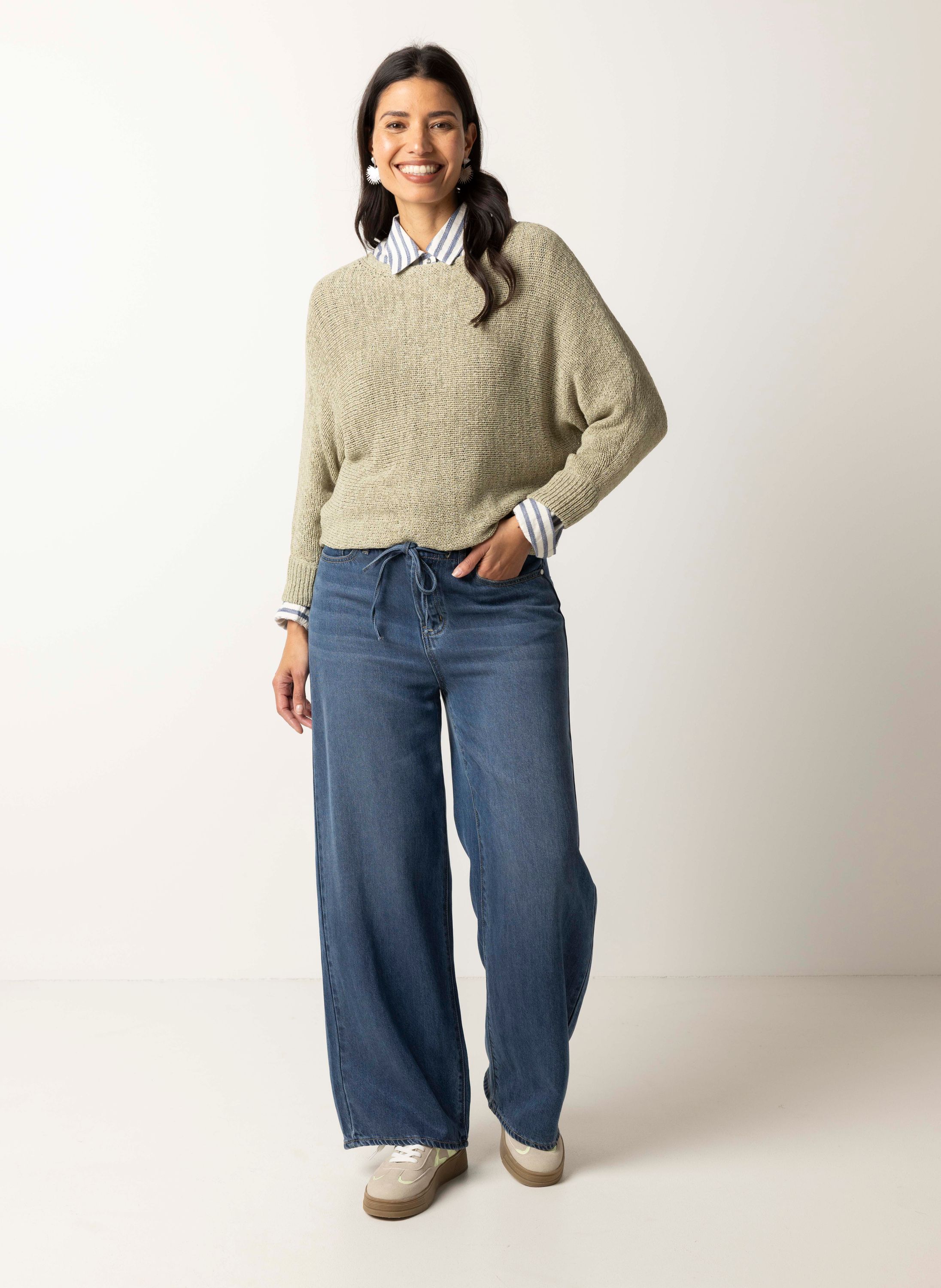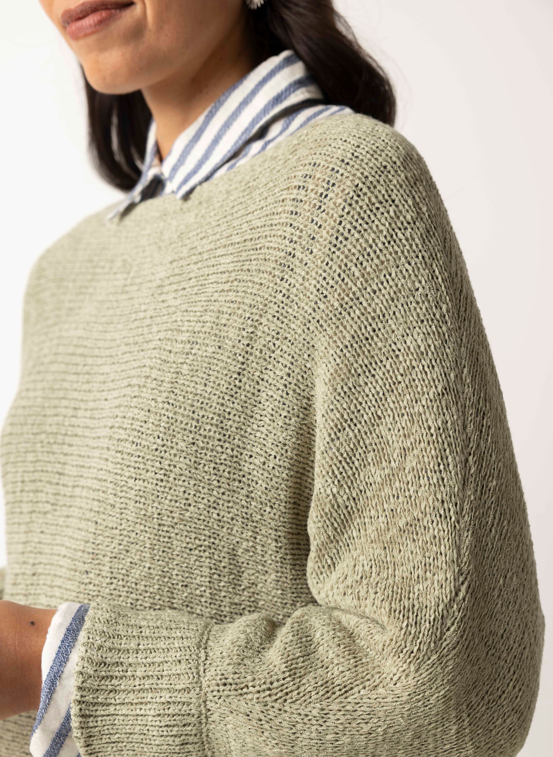 Deze gebreide trui met ronde hals heeft driekwart mouwen.