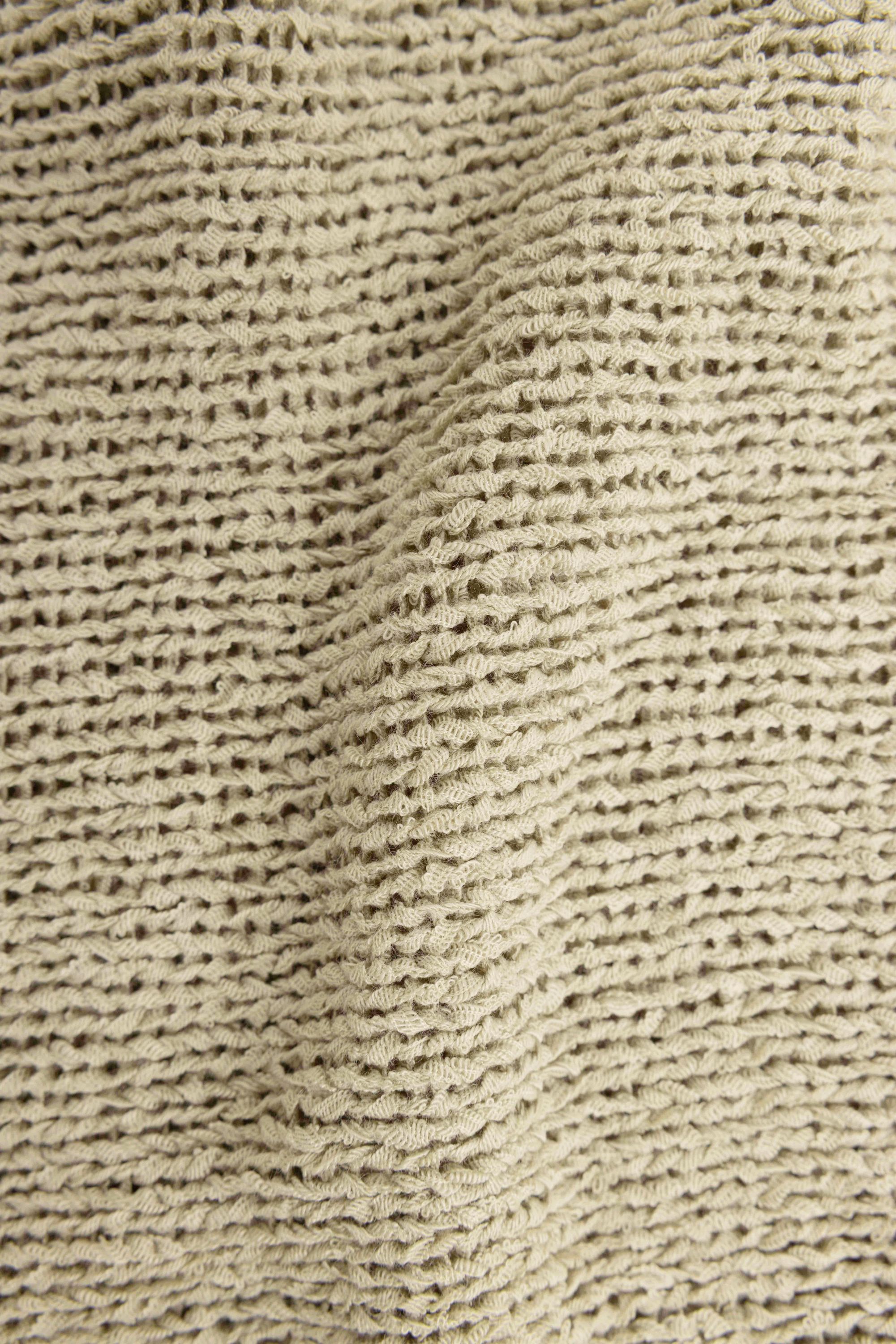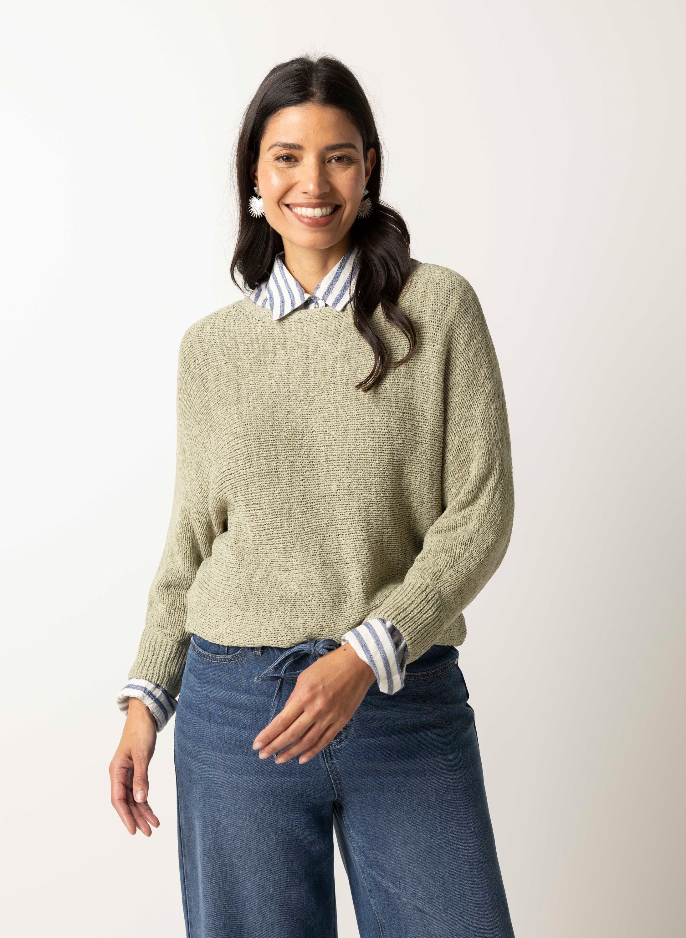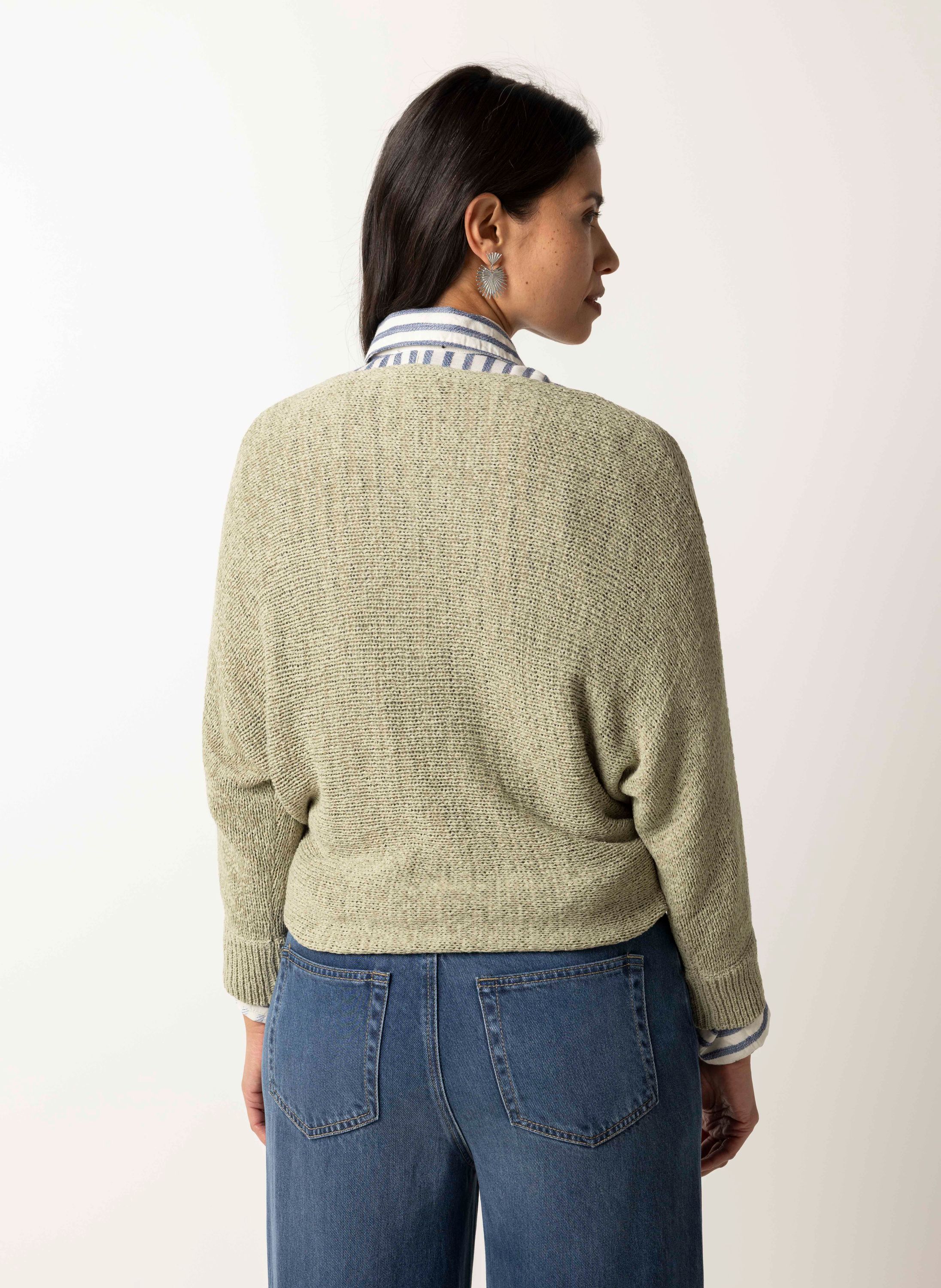 Deze gebreide trui met ronde hals heeft driekwart mouwen.