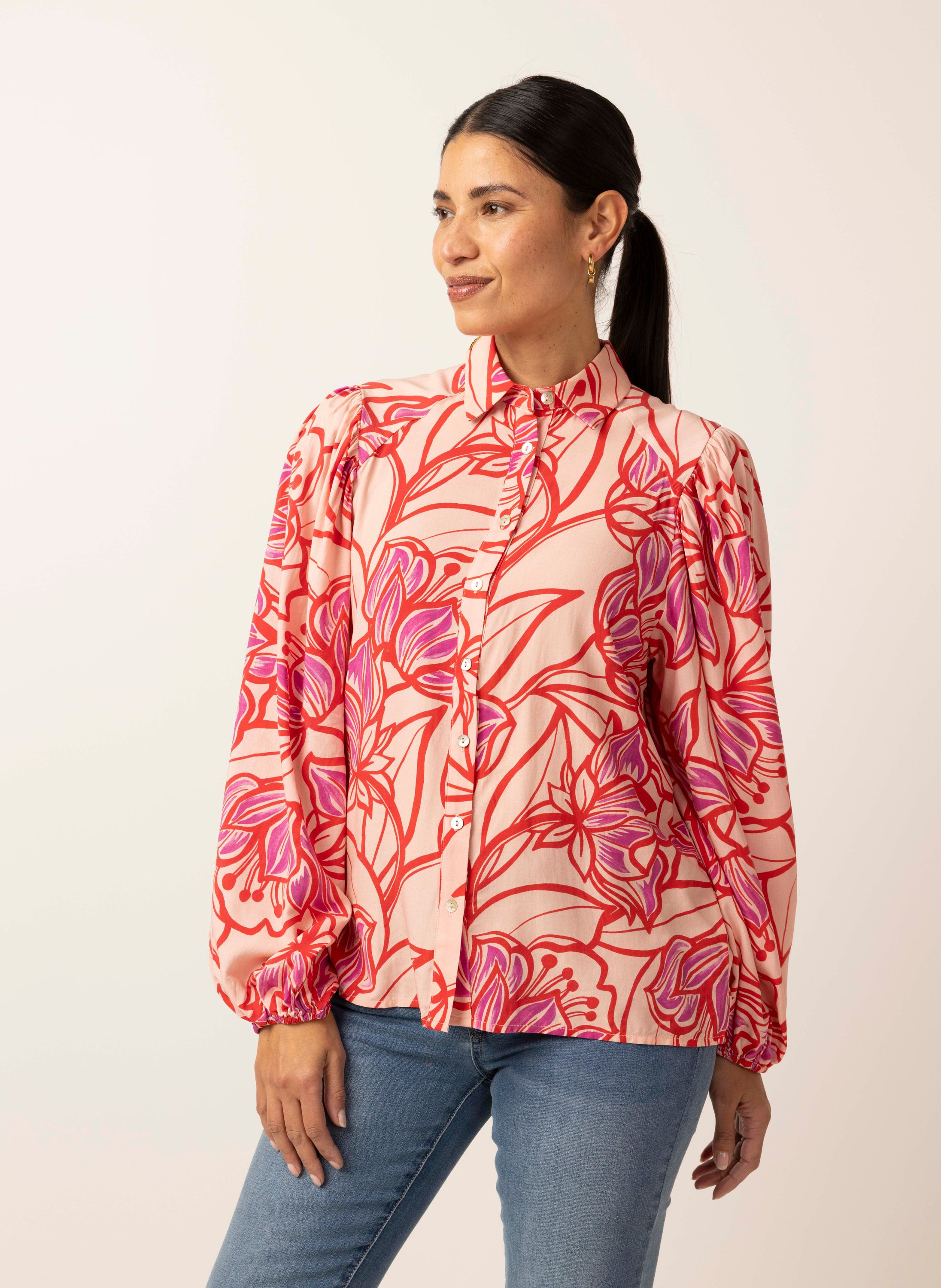 Deze blouse met klassieke kraag heeft een knoopsluiting en lange pofmouwen met elastische boorden.