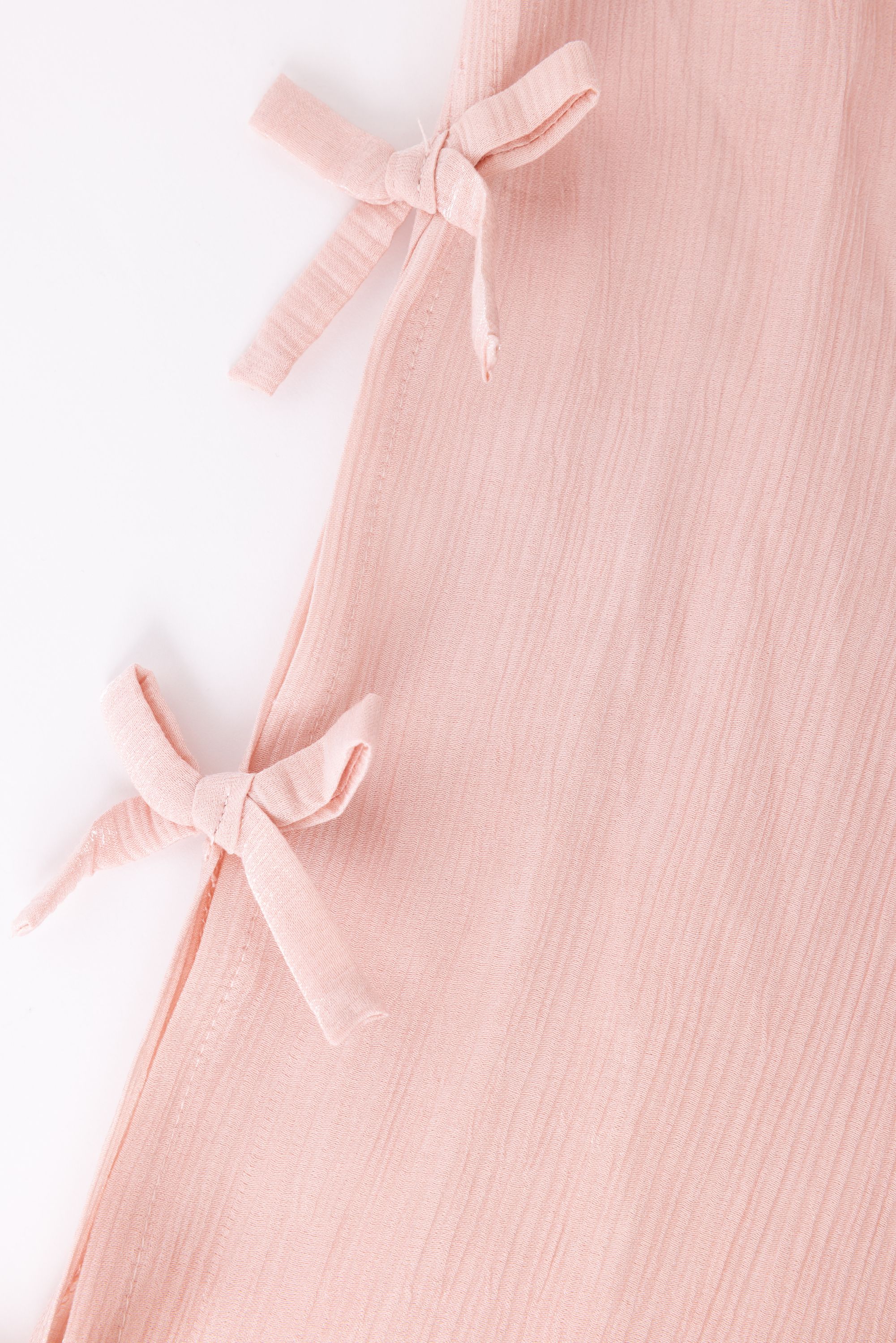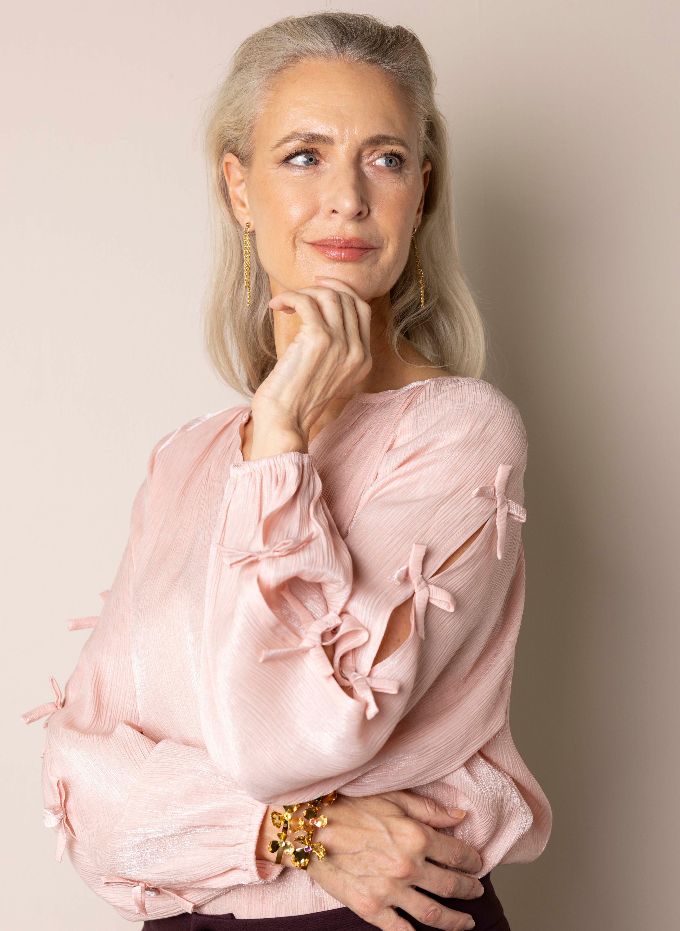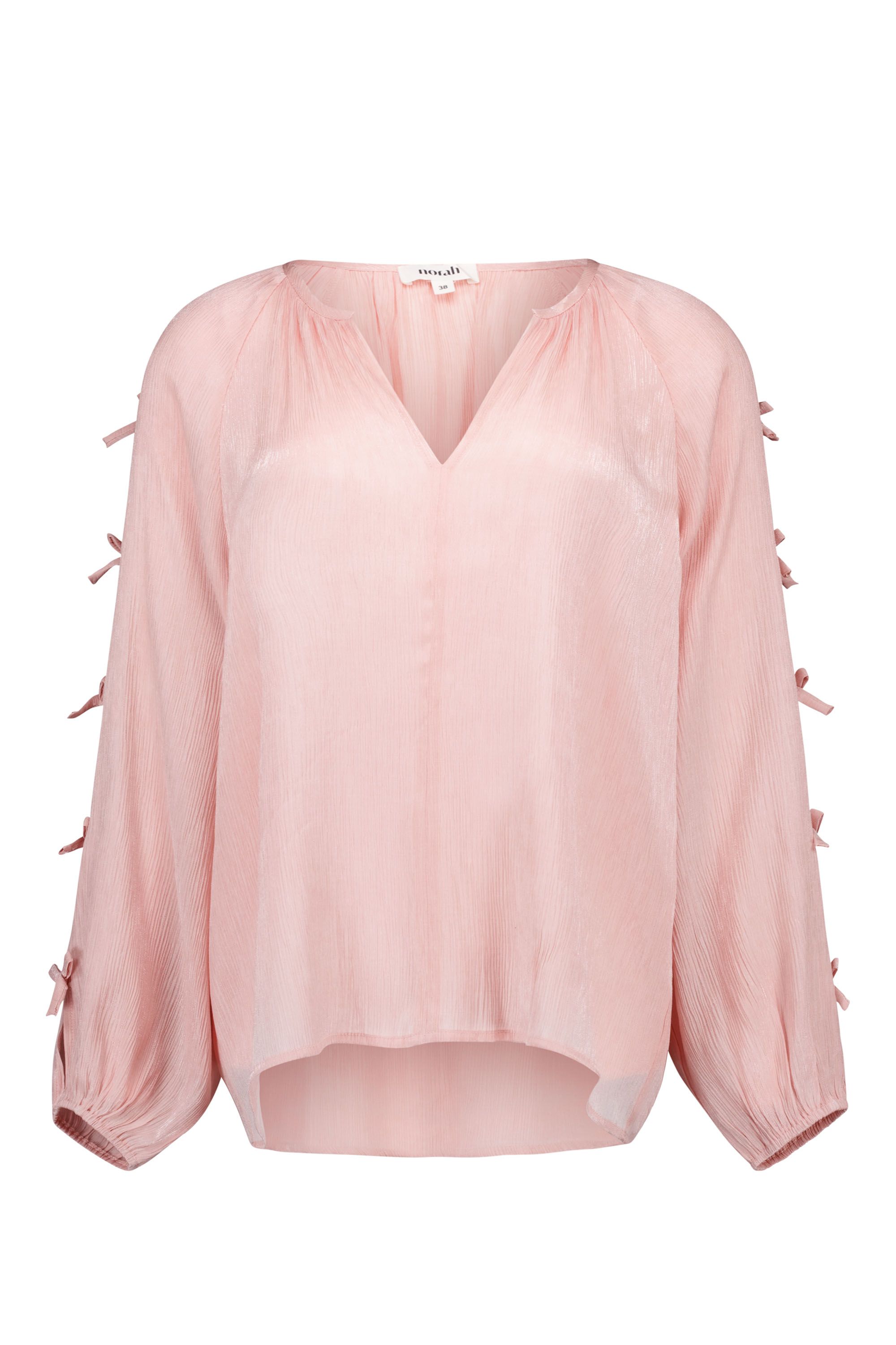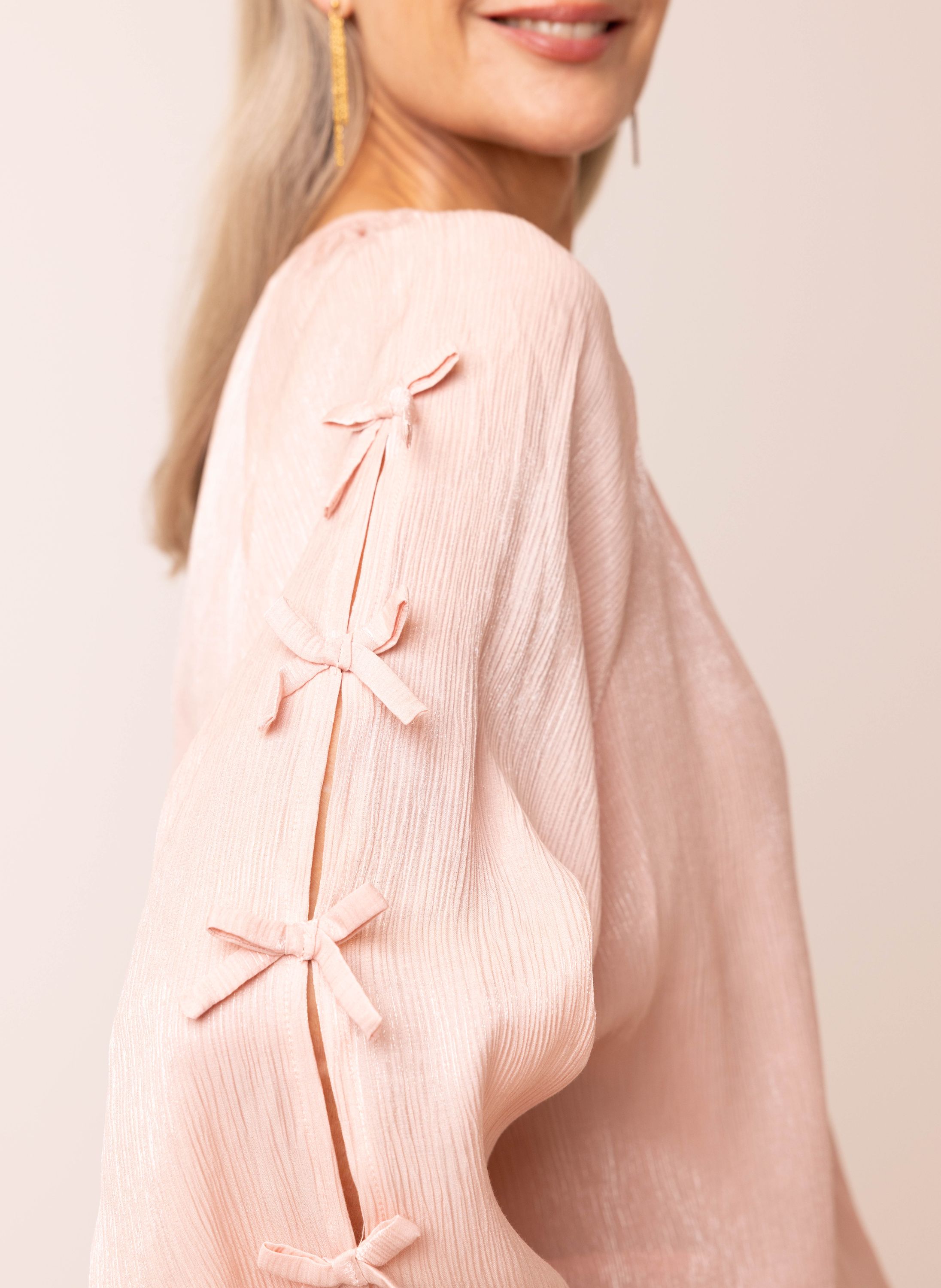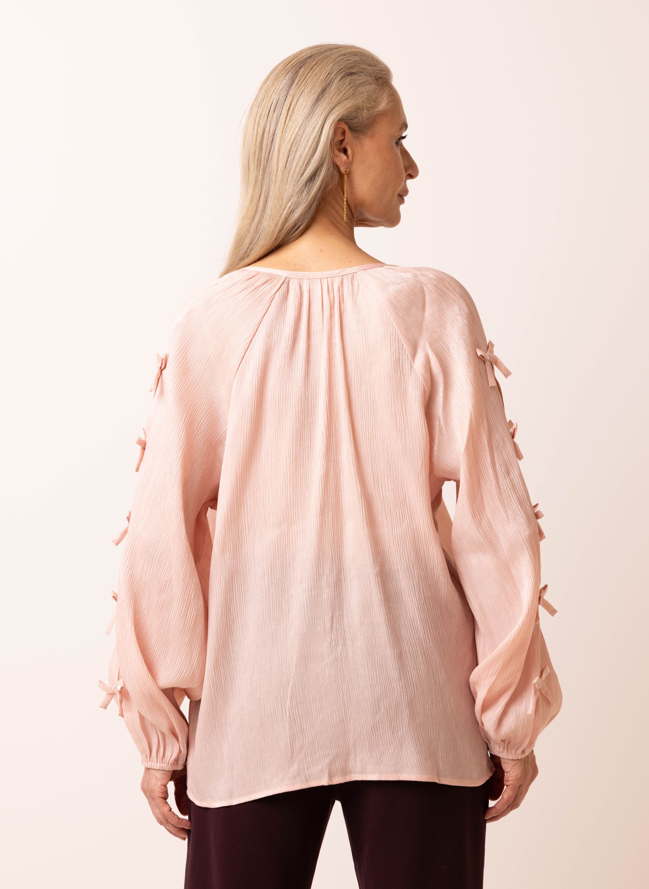Deze blouse met V-hals en lange mouwen met elastische boorden en strikjes heeft een glanzende uitstraling.