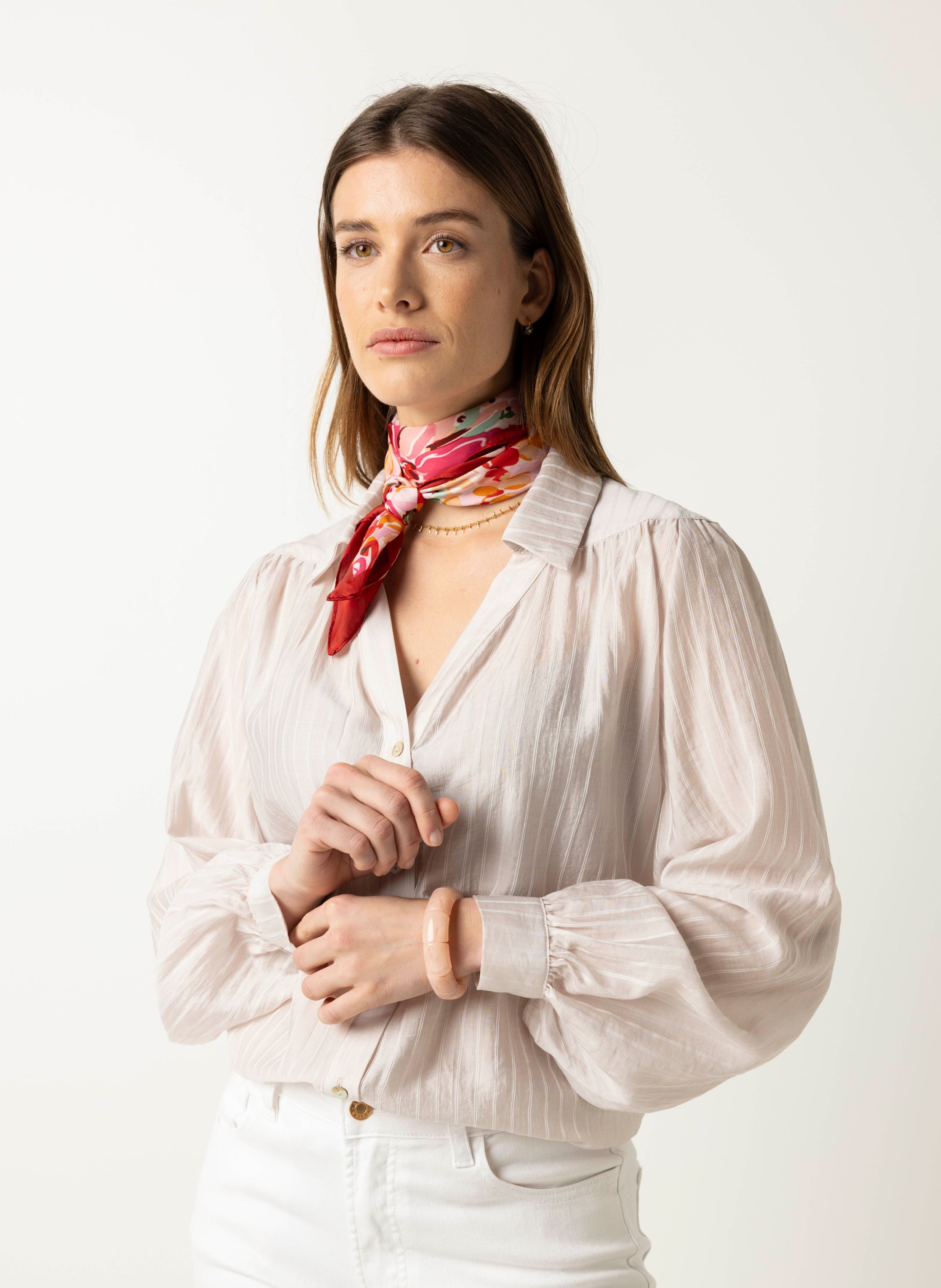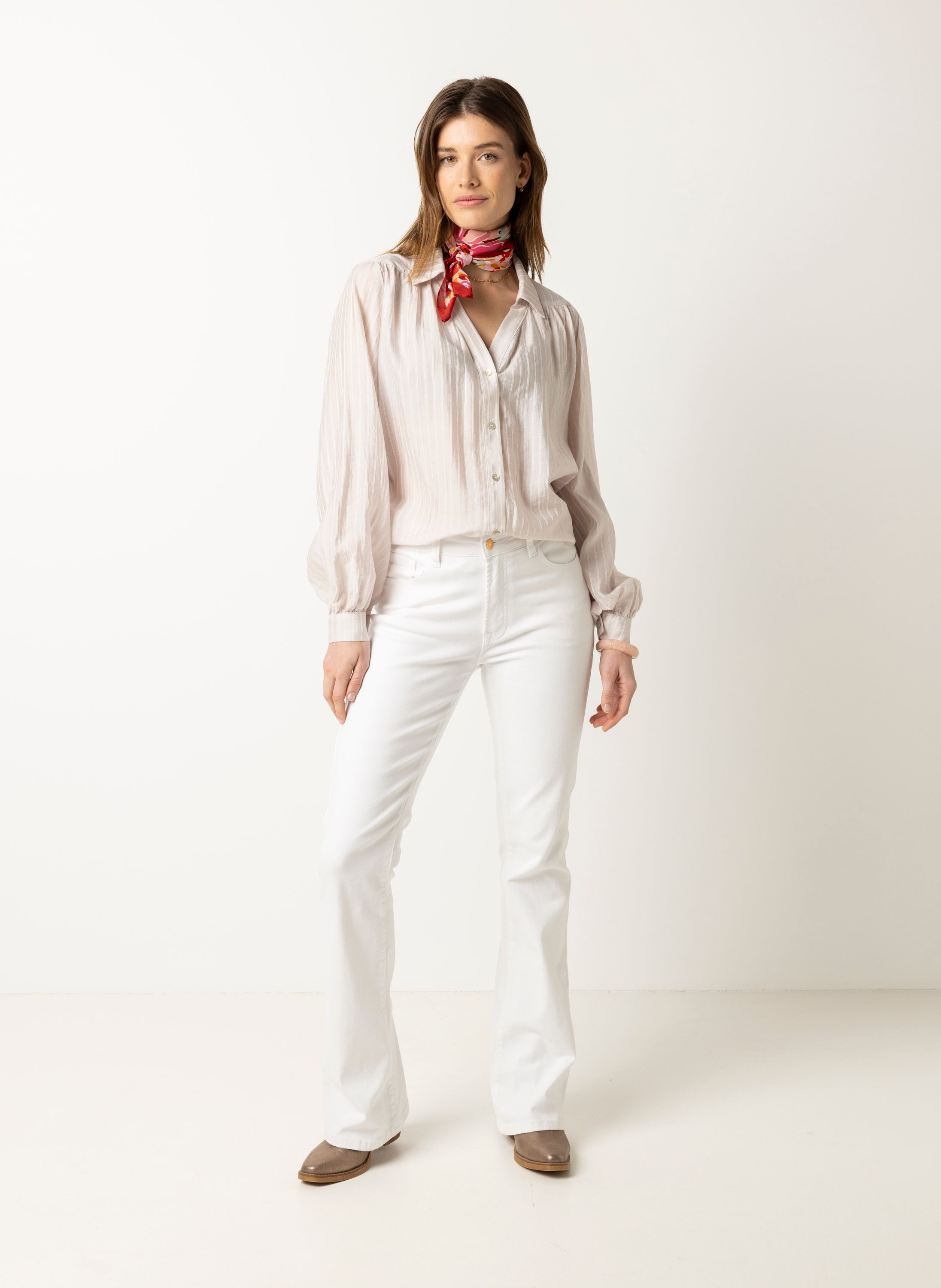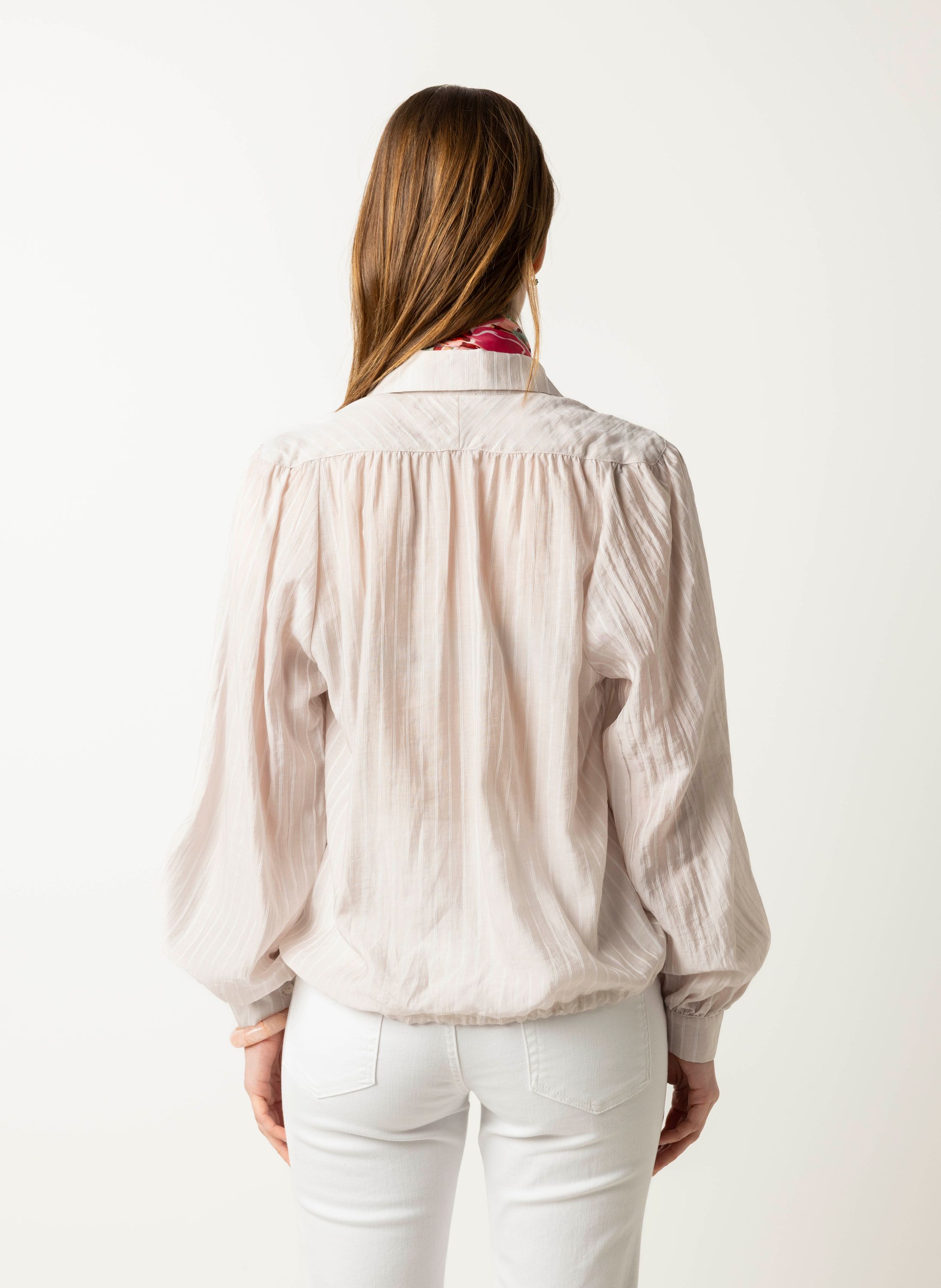 Deze blouse met klassieke kraag heeft lange mouwen en een trekkoord aan de onderzijde.