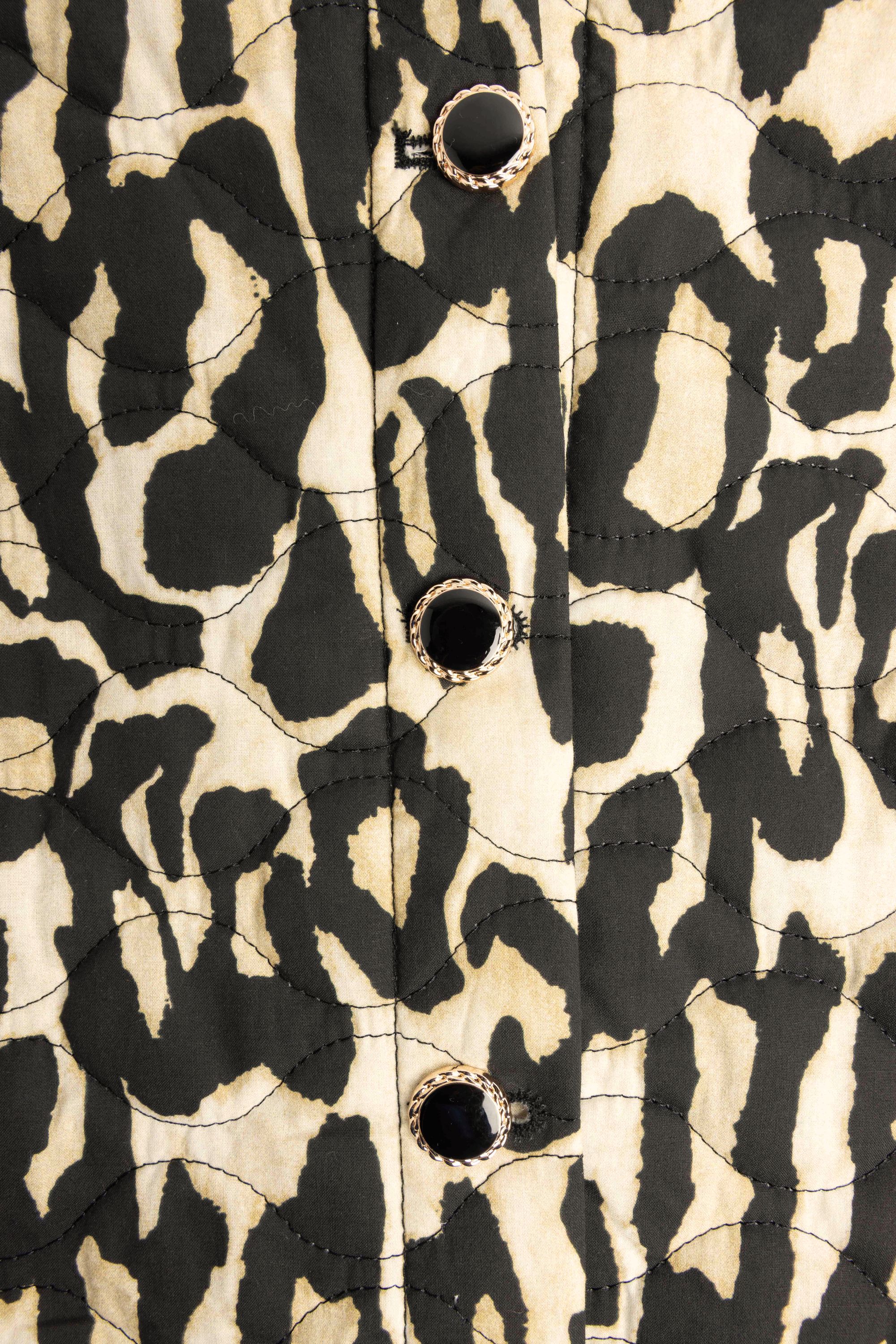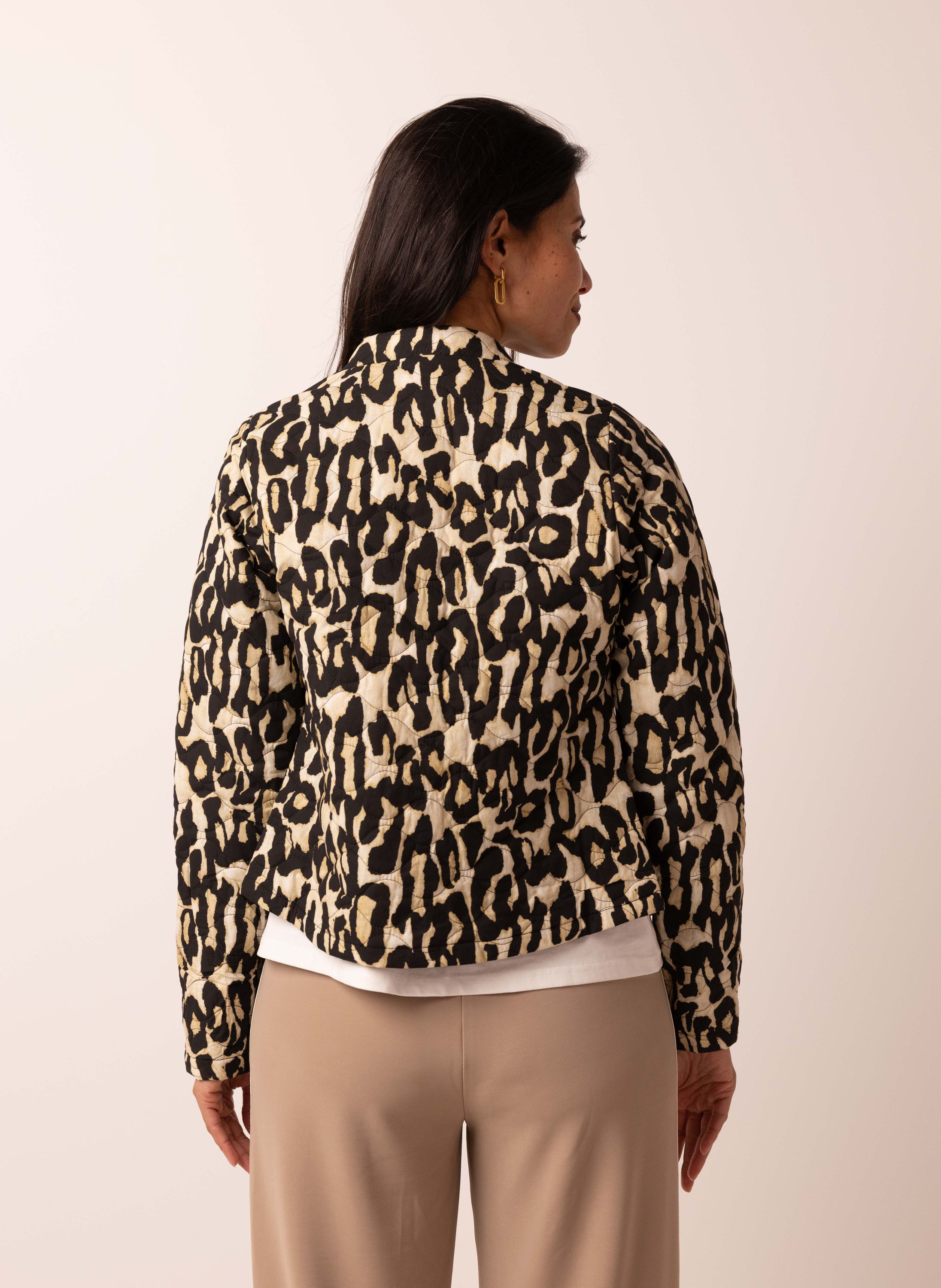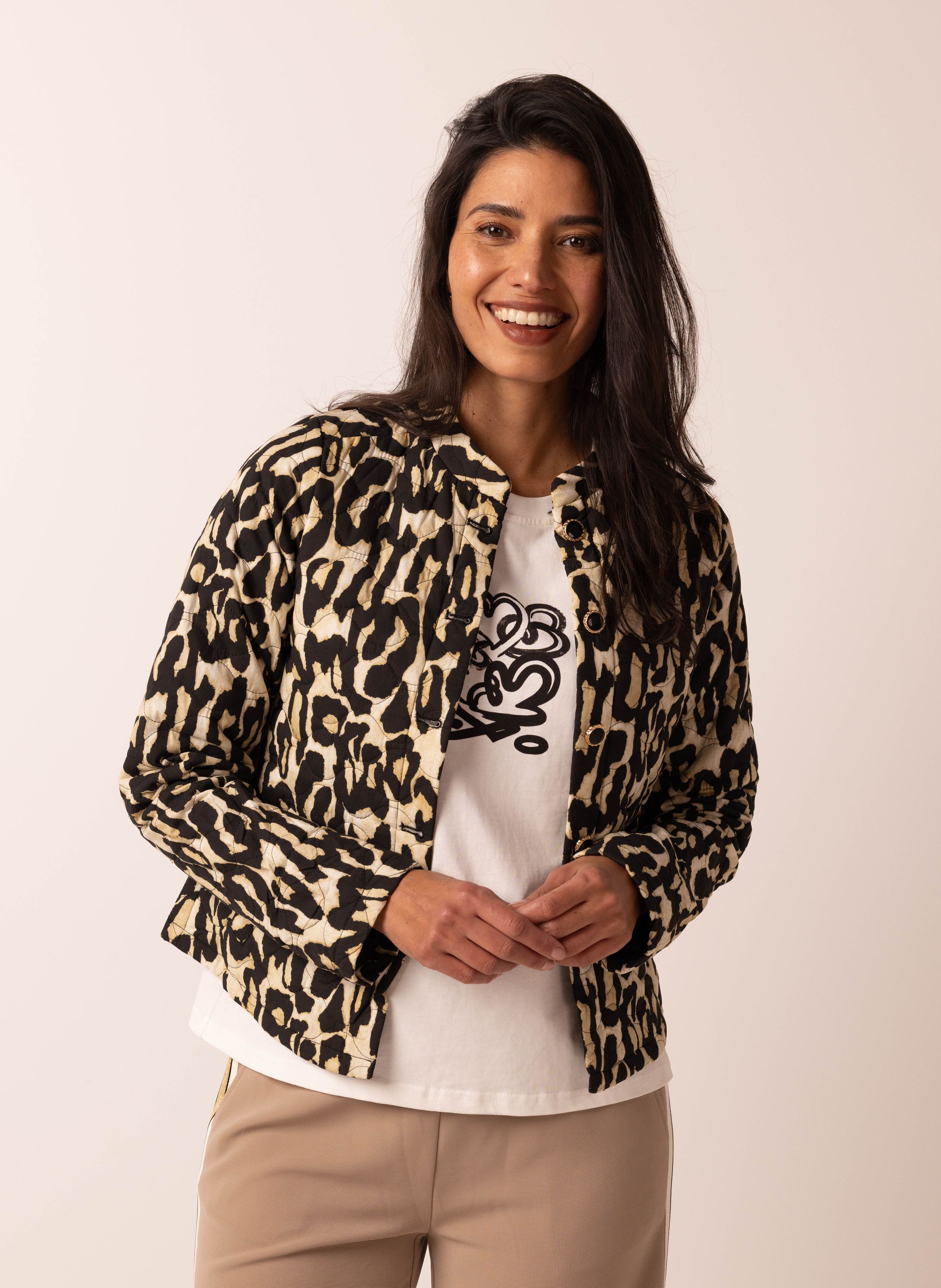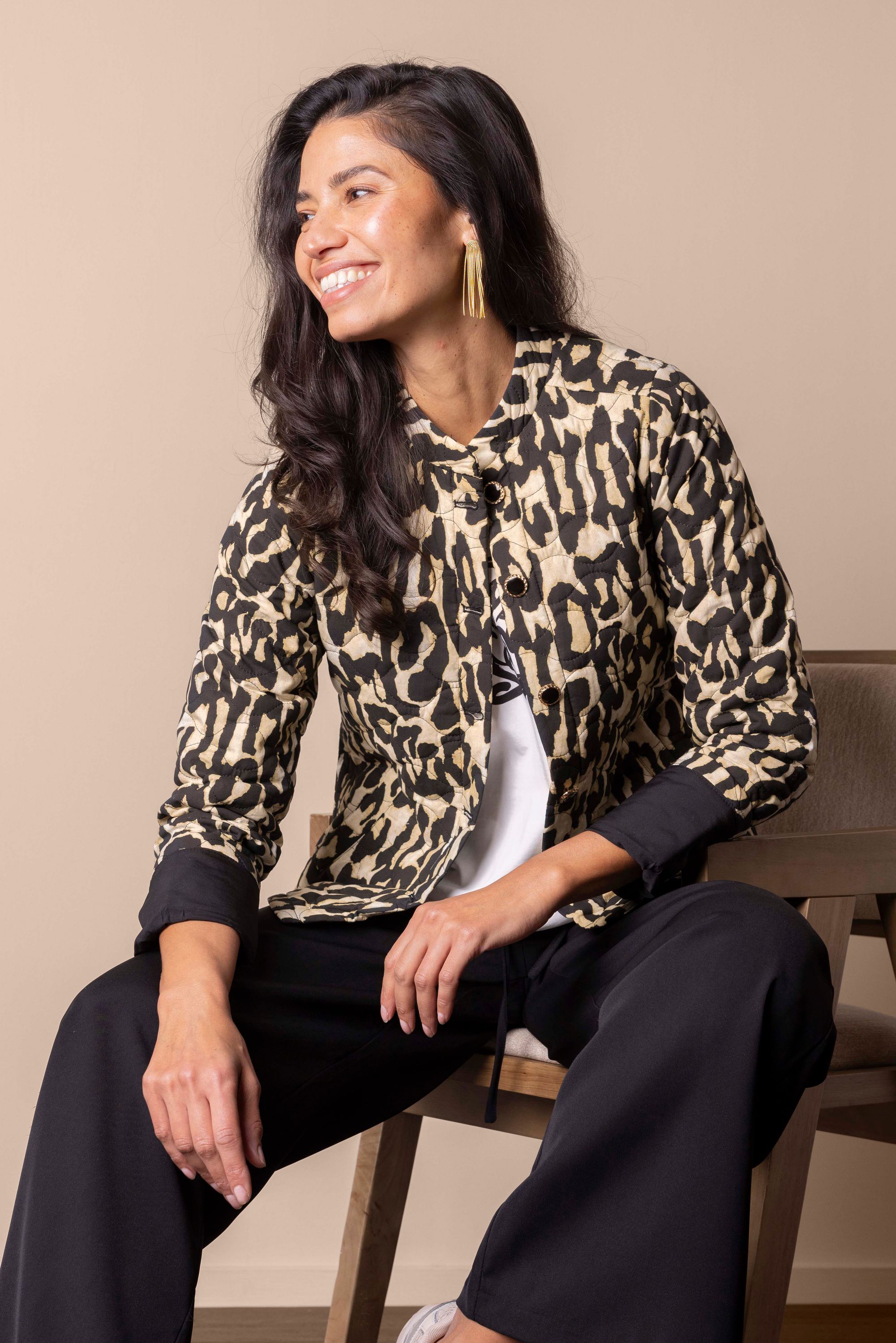 Deze jas is een echte eyecatcher en geeft elke outfit direct een modieuze uitstraling. Het model heeft een ronde hals, lange mouwen en een goudkleurige knoopsluiting aan de voorzijde.De jas heeft een comfortabele pasvorm en is perfect om zowel casual als gekleed te combineren. Let op: dit jasje valt één maar kleiner. We adviseren je een maat groter te nemen.