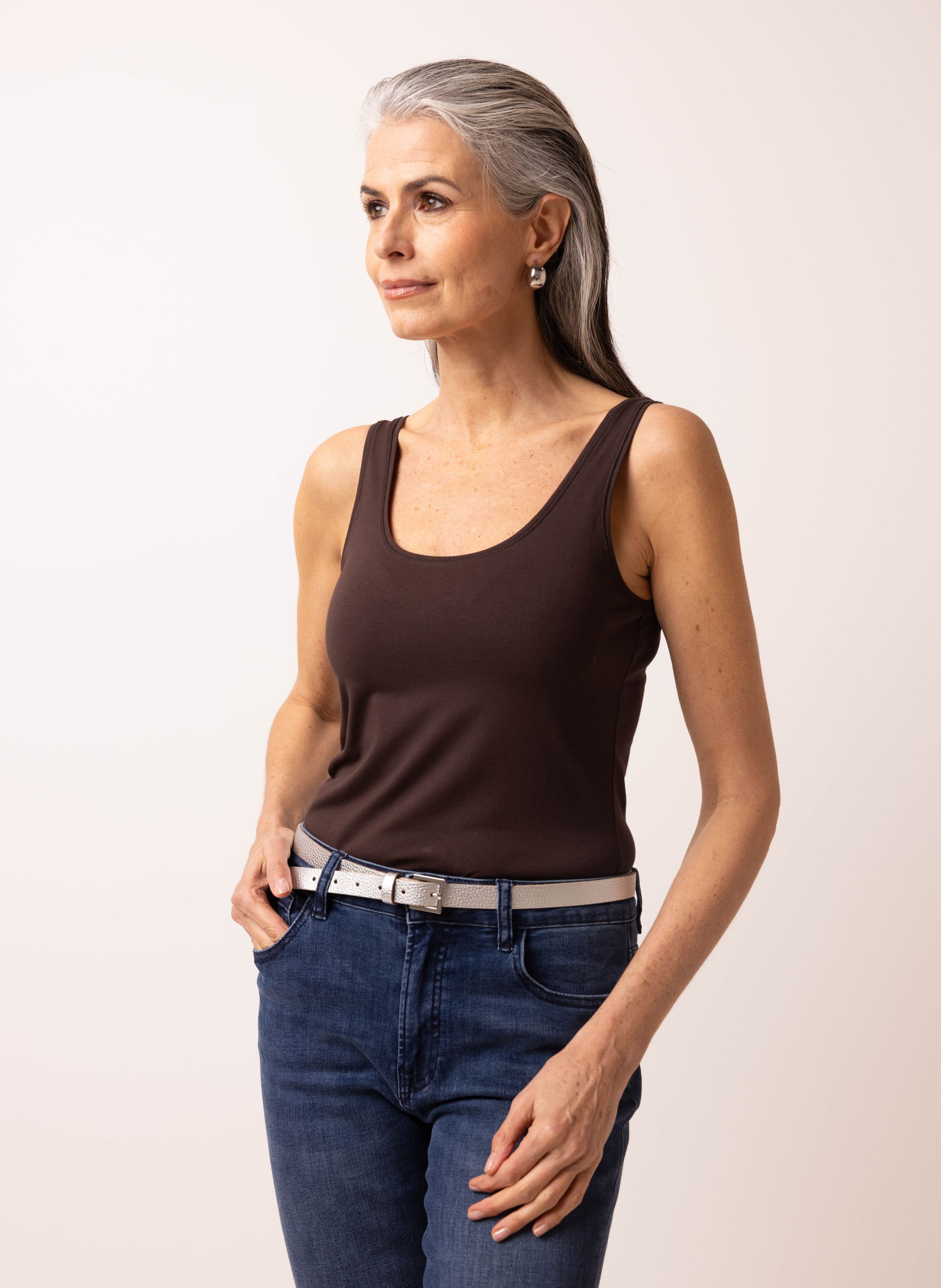 Deze basis top met veel stretch kun je zowel los dragen als onder een blouse of trui. De zachte stof en aangesloten pasvorm maken het een onmisbare basic in je garderobe.