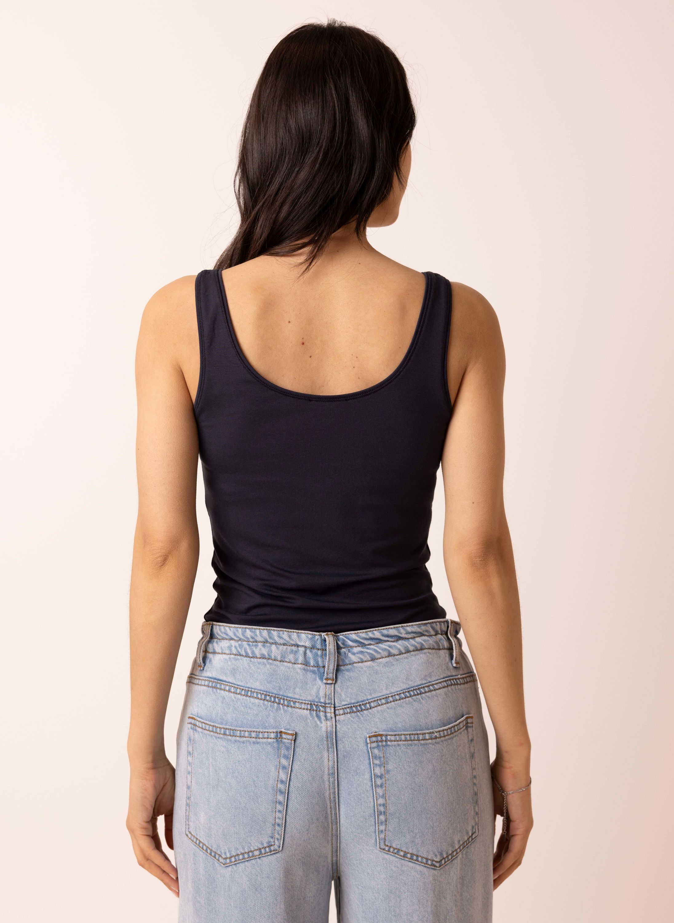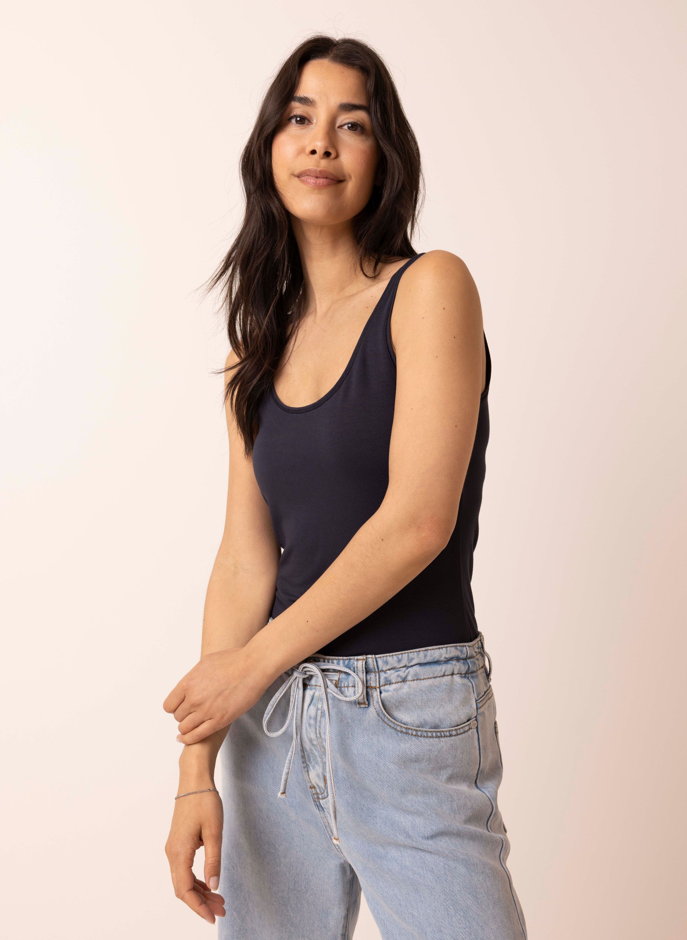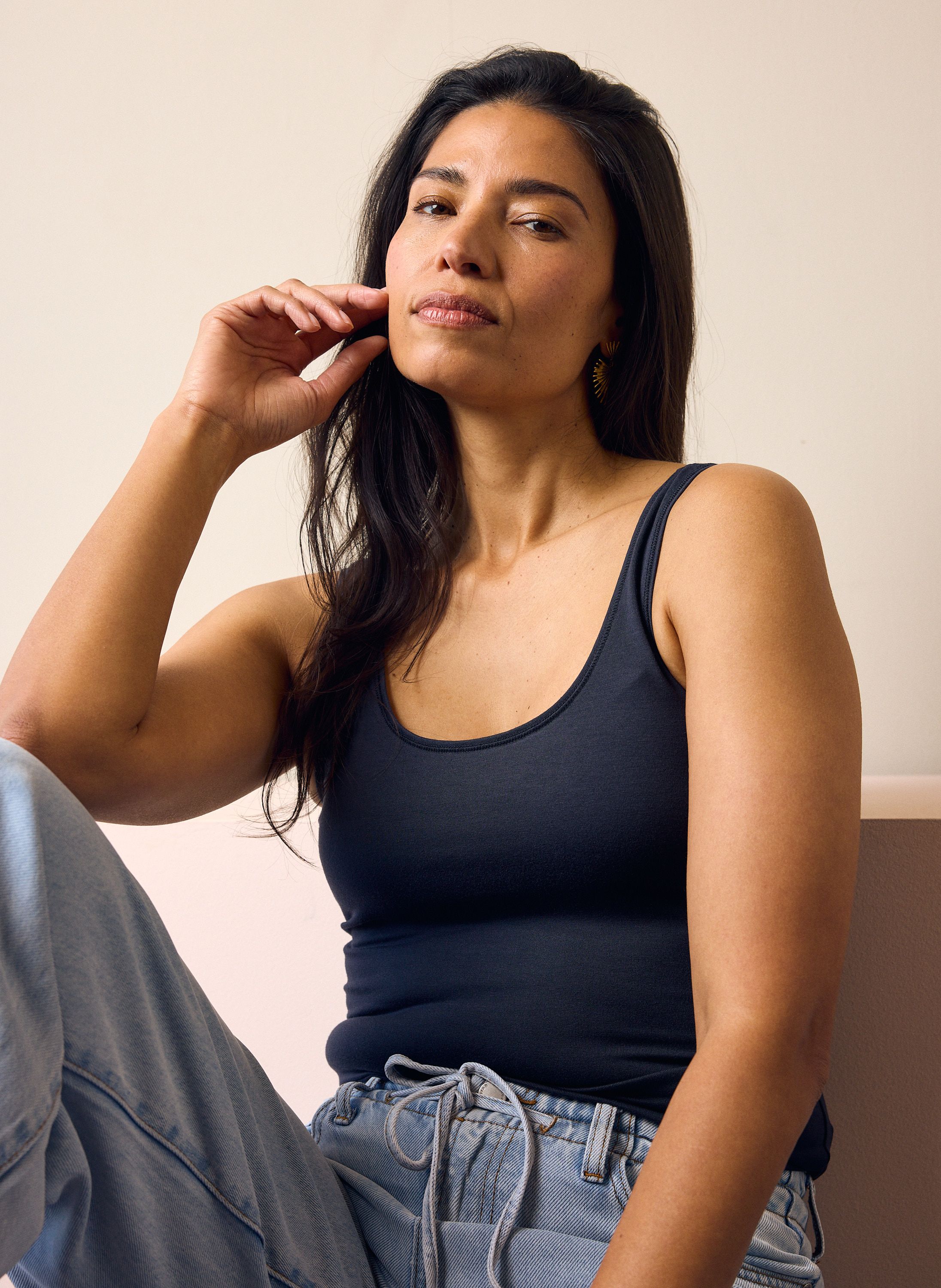 Deze basis top met veel stretch kun je zowel los dragen als onder een blouse of trui. De zachte stof en aangesloten pasvorm maken het een onmisbare basic in je garderobe.