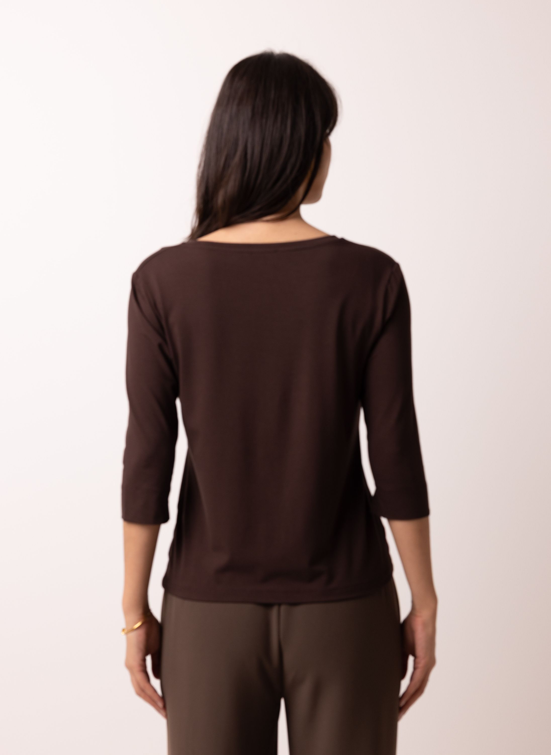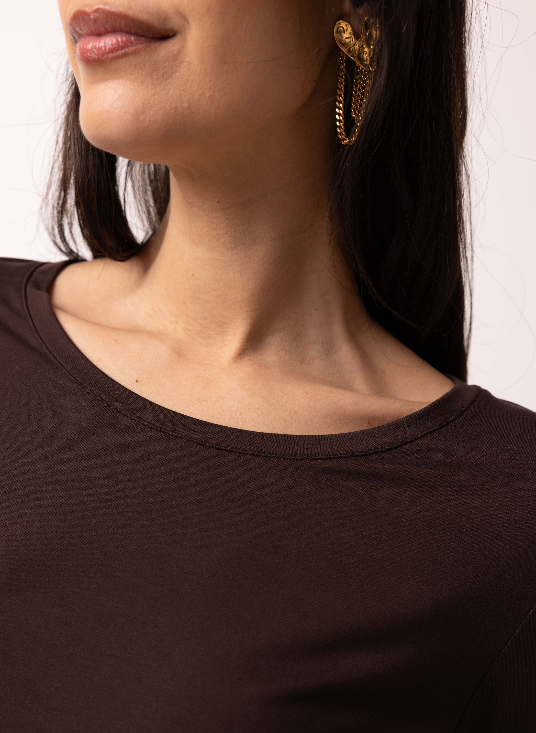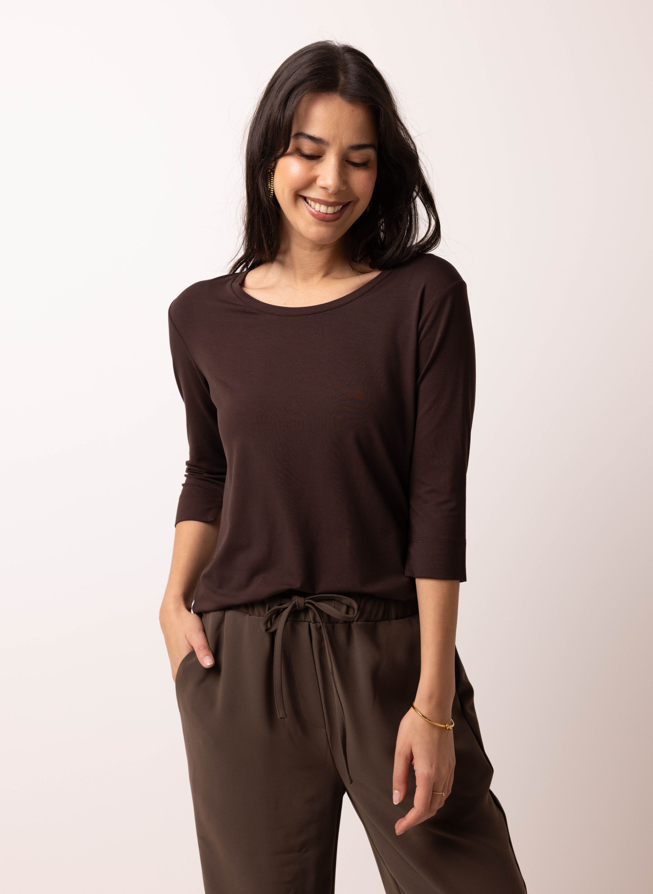 Dit shirt met wijde ronde hals heeft driekwart mouwen met kleine split en veel stretch.