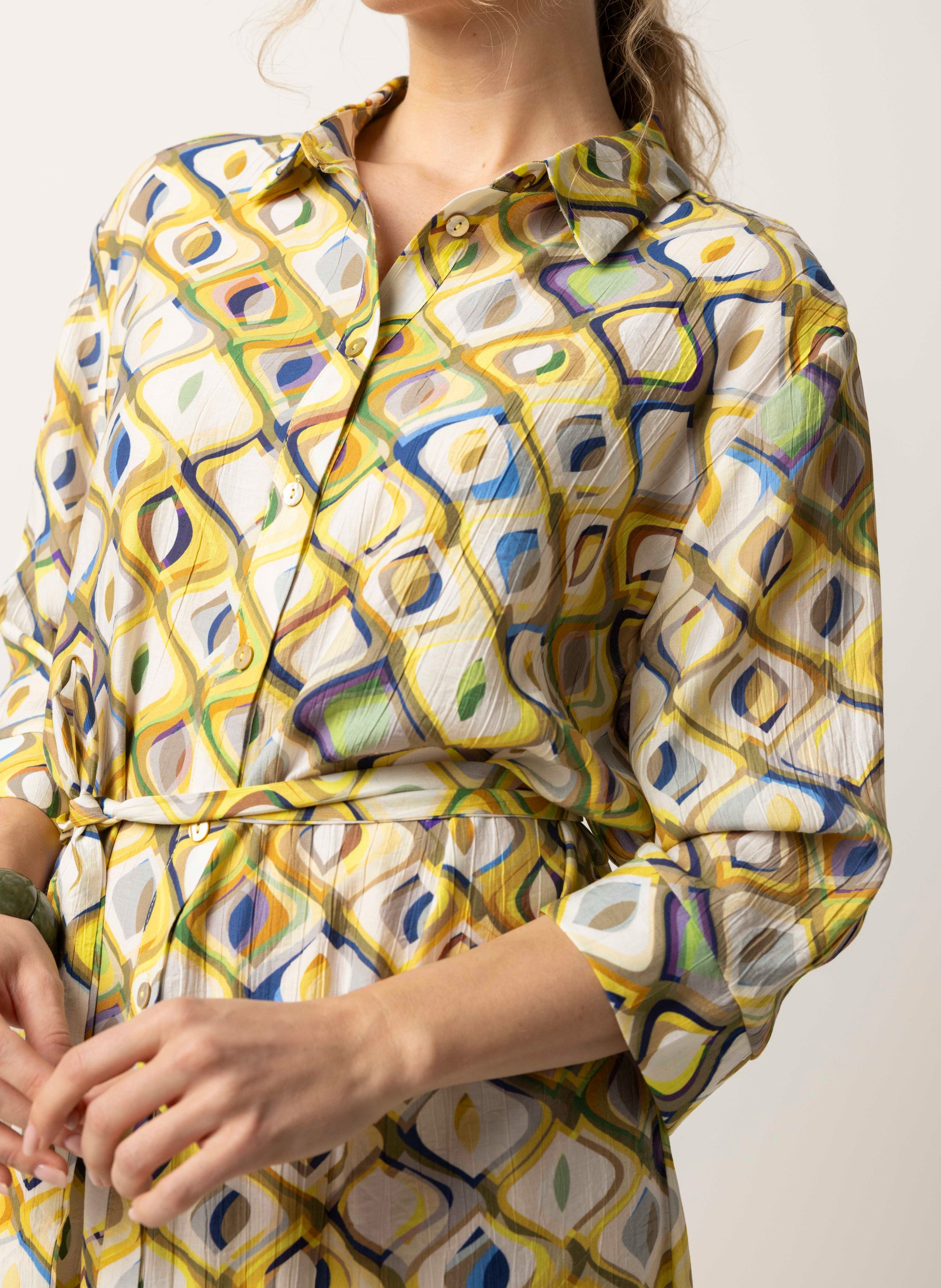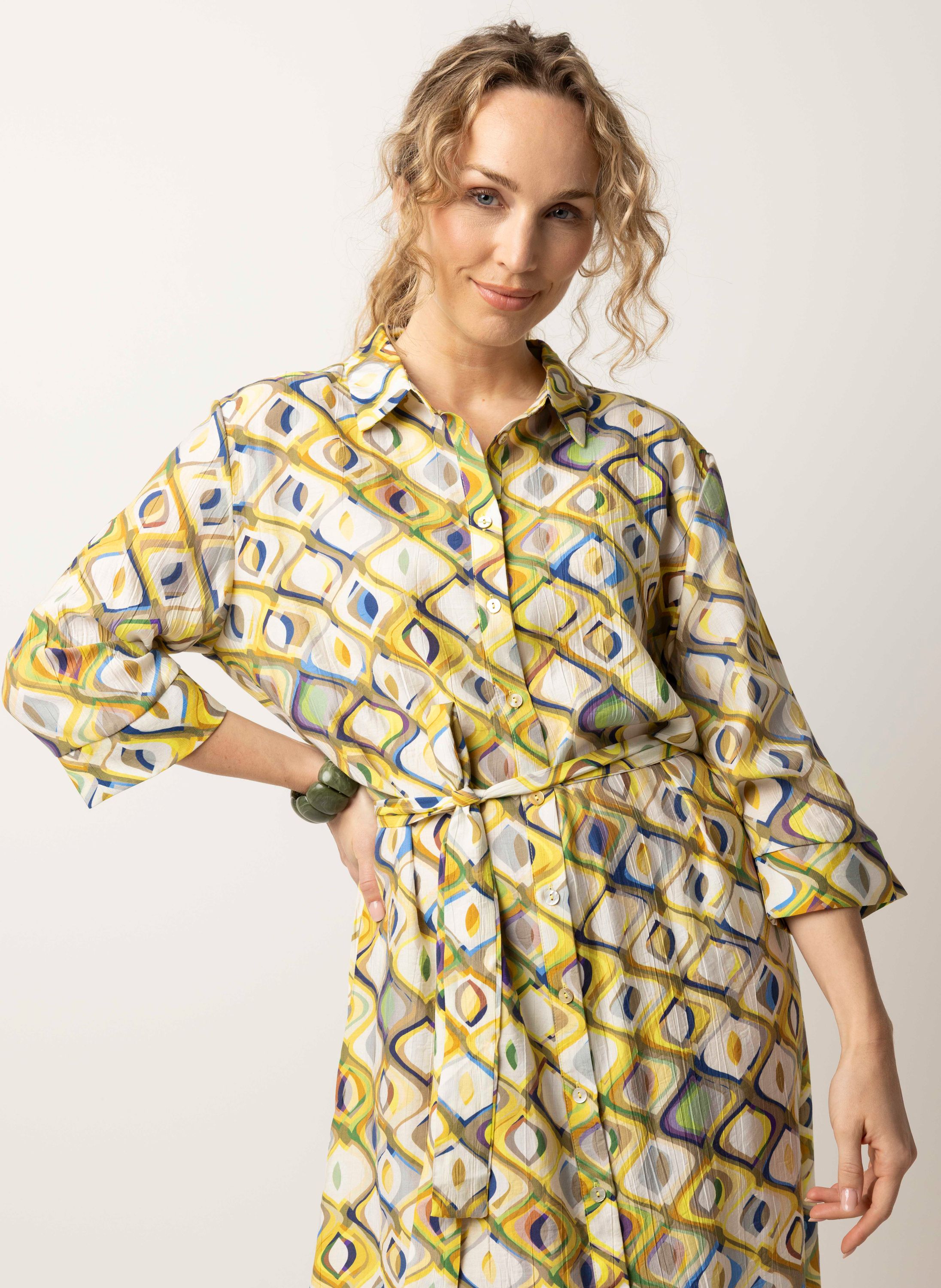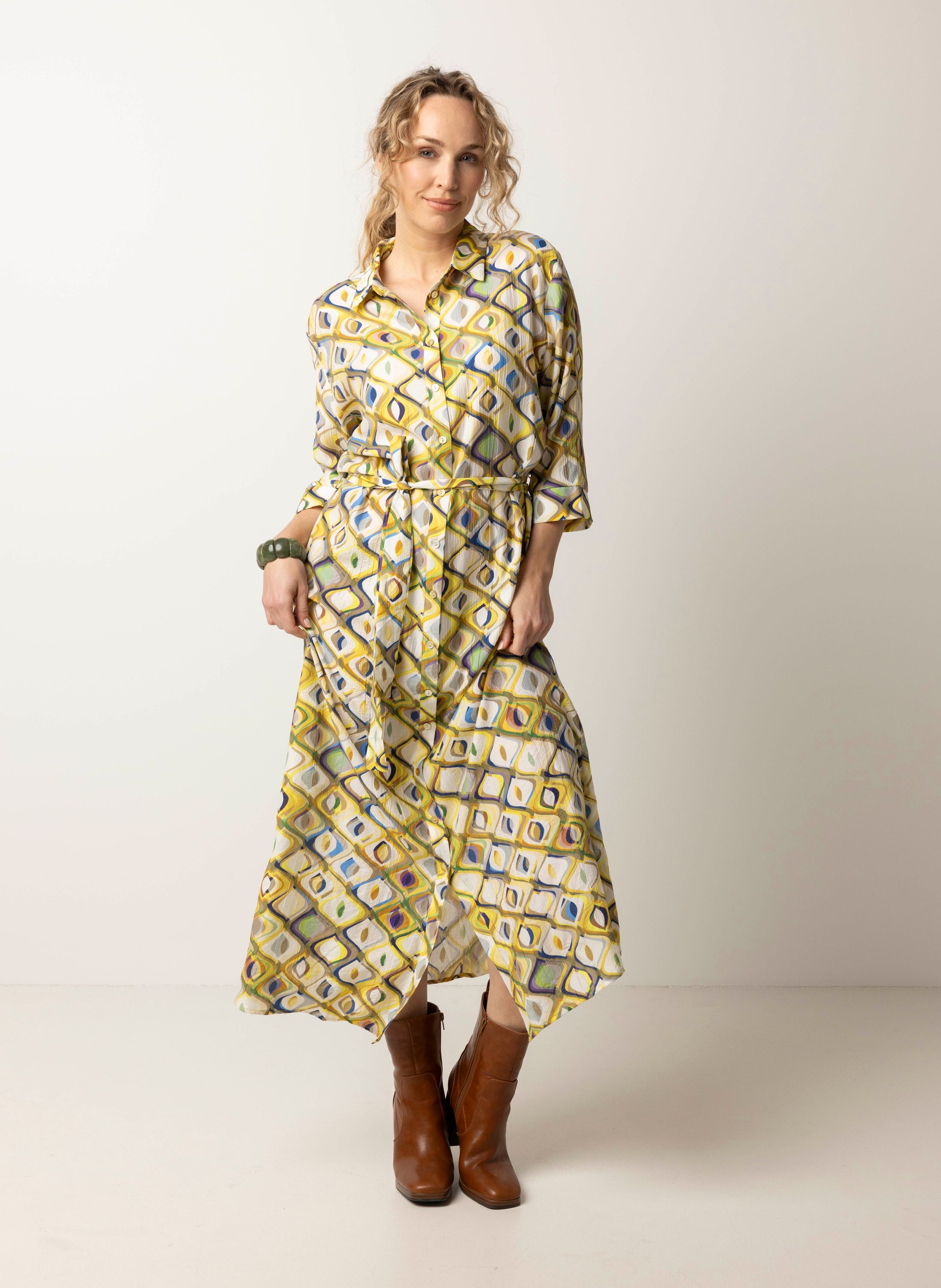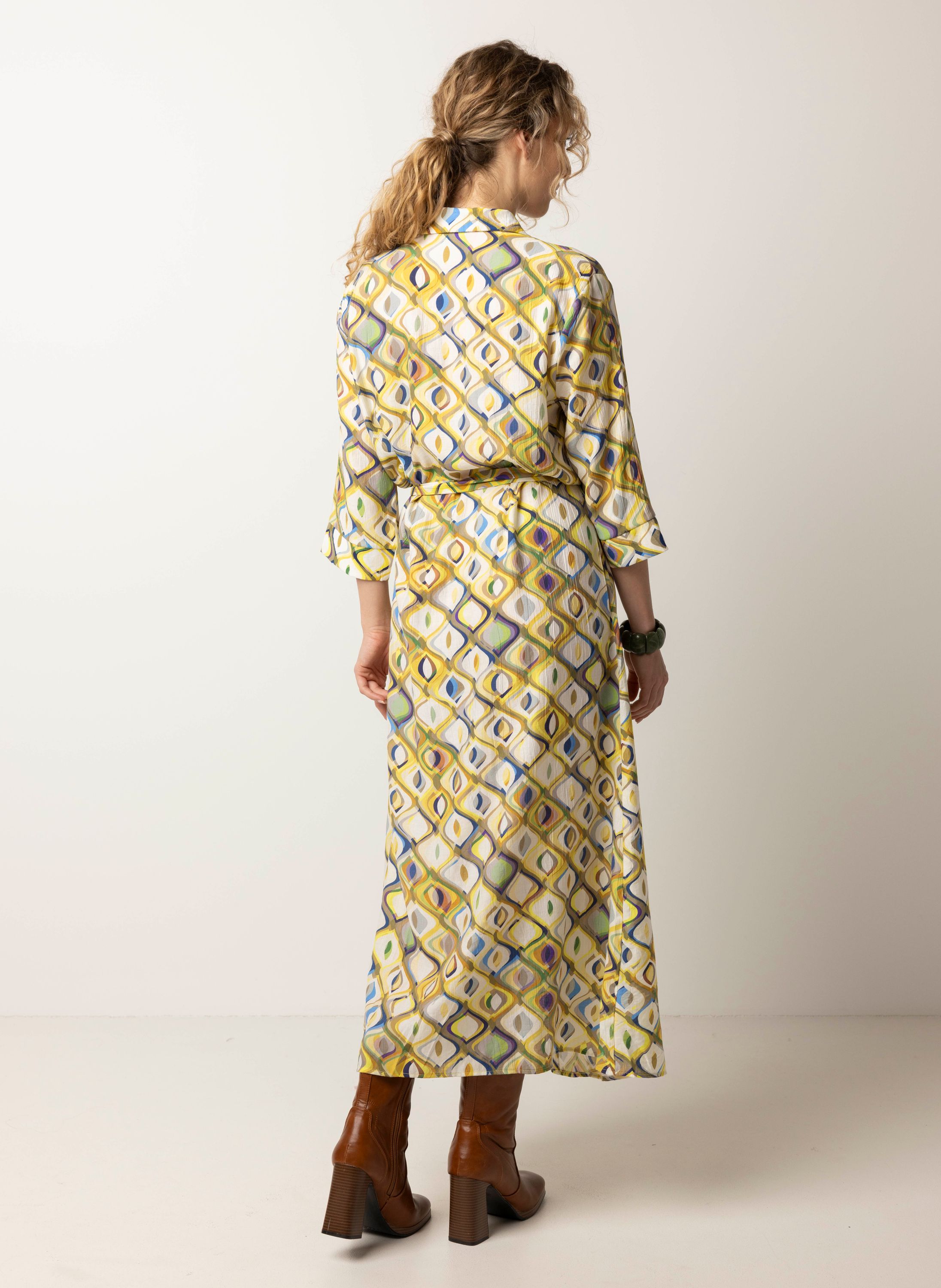 Deze maxi jurk met klassieke kraag heeft een knoopsluiting, driekwart mouwen en een ceintuur.