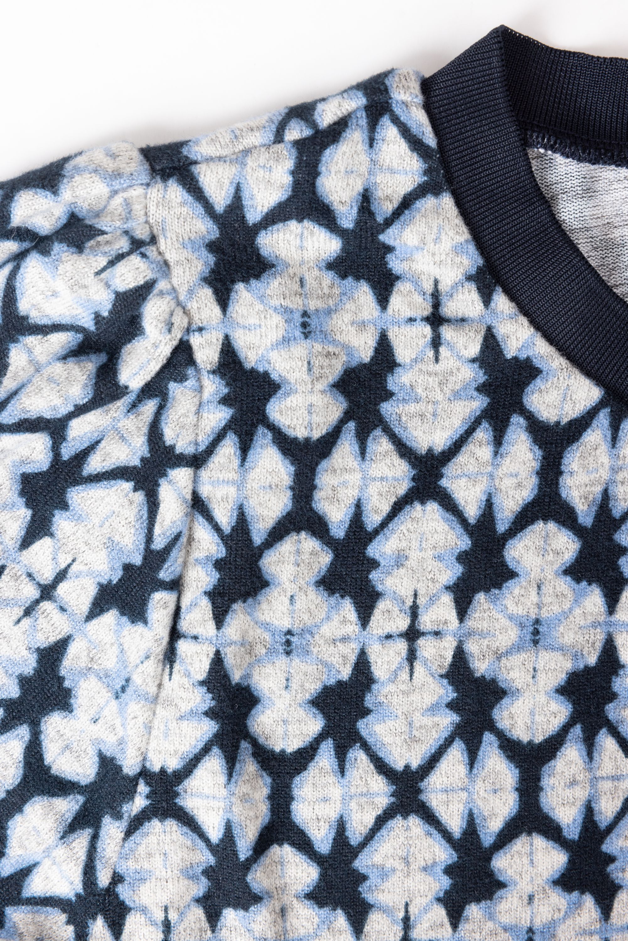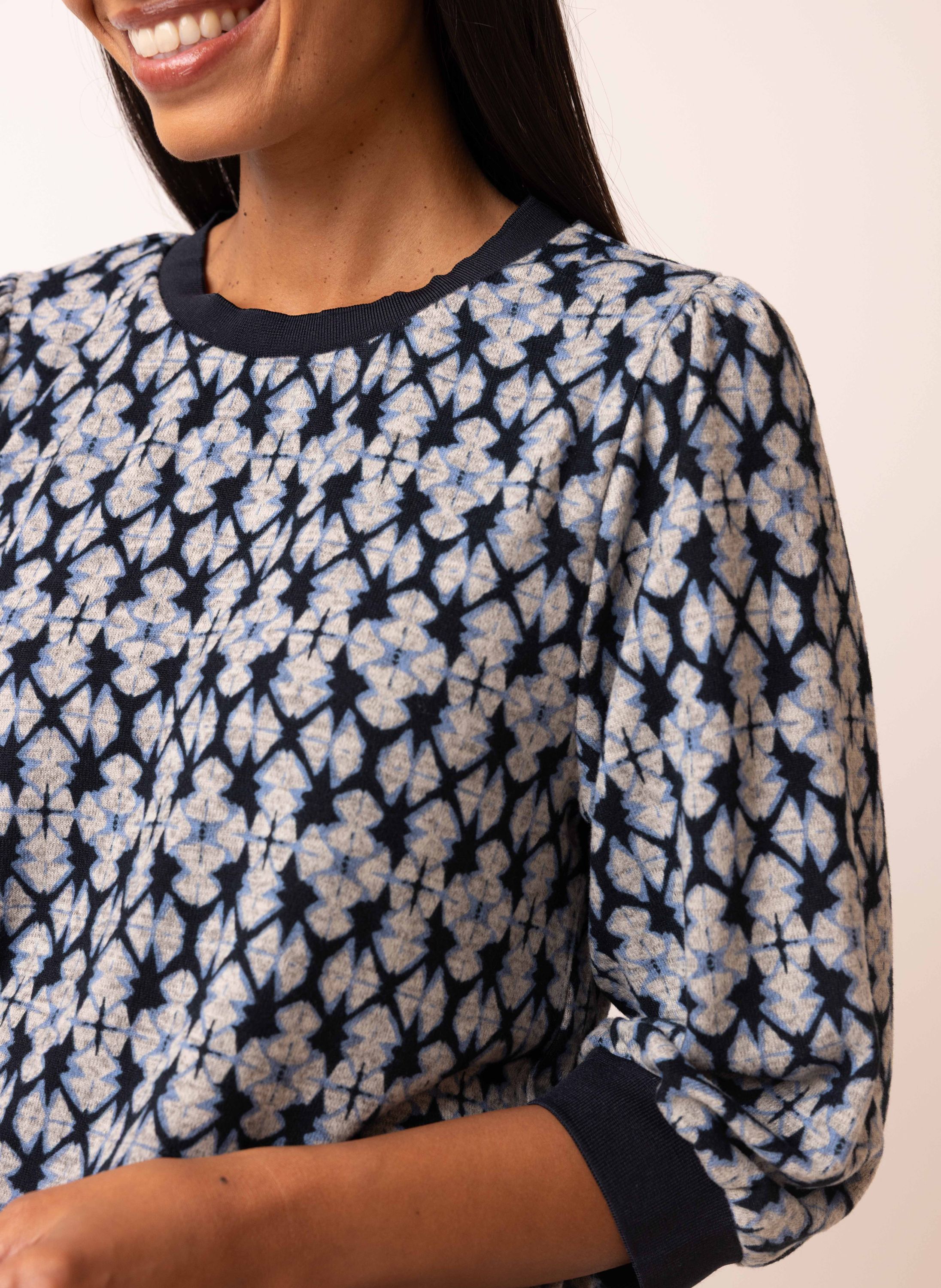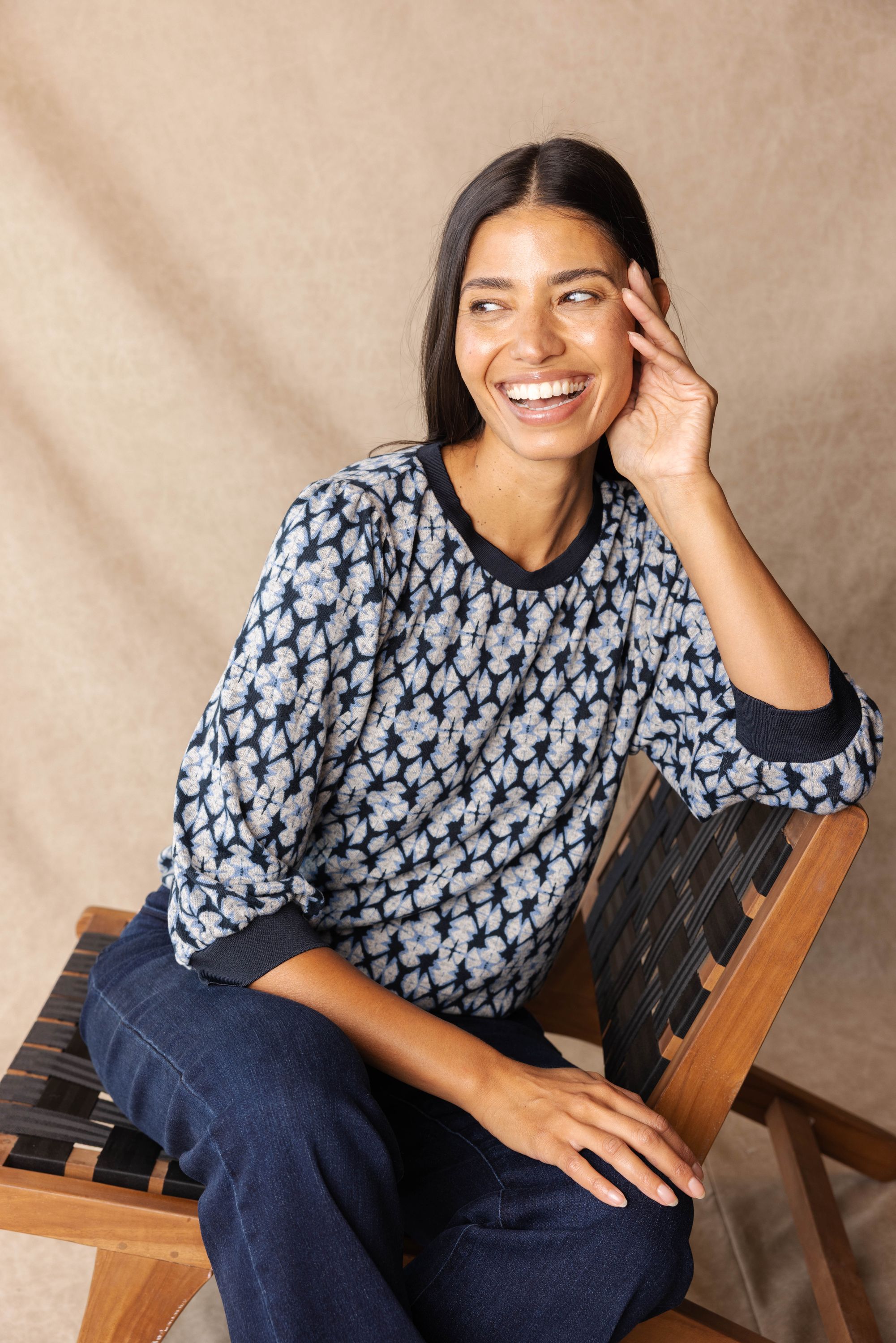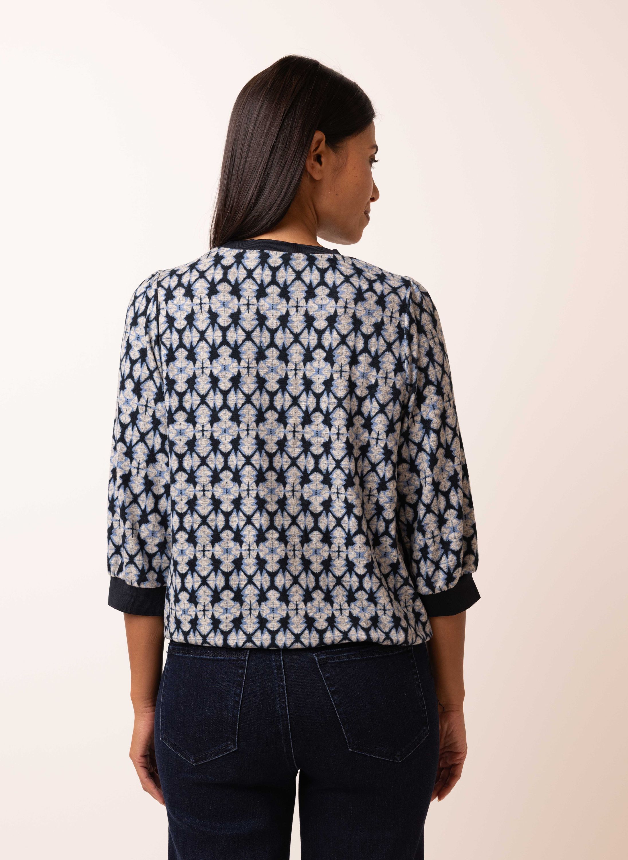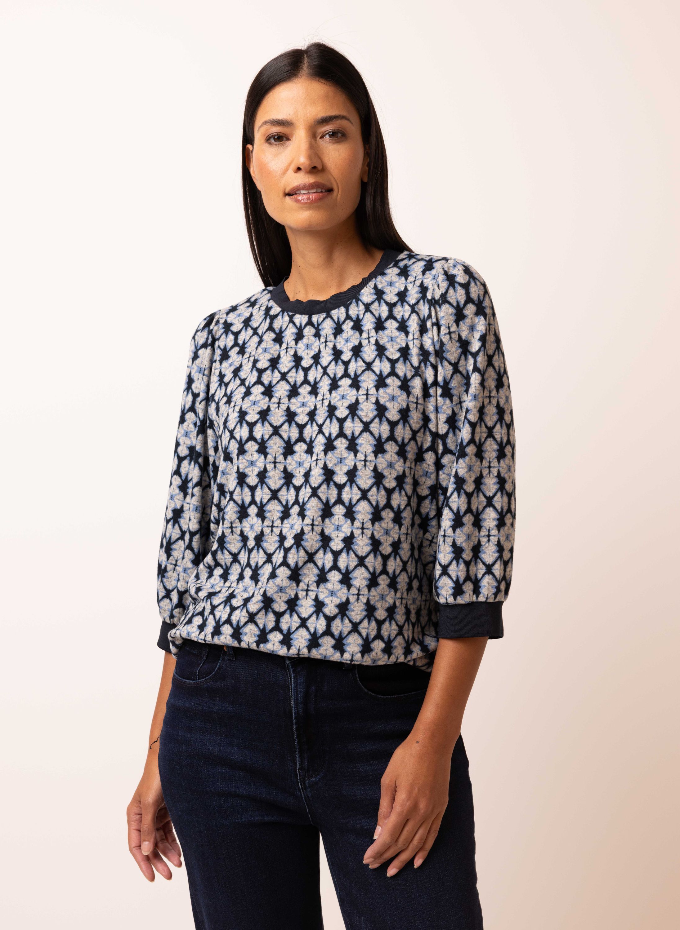 Dit shirt met ronde hals heeft driekwart mouwen en elastische banden aan de uiteindes en de onderzijde.