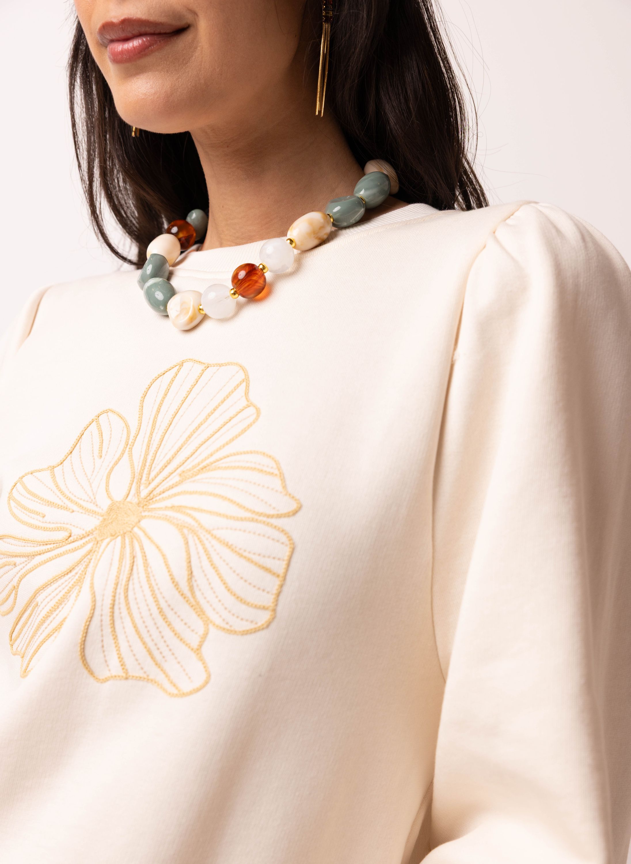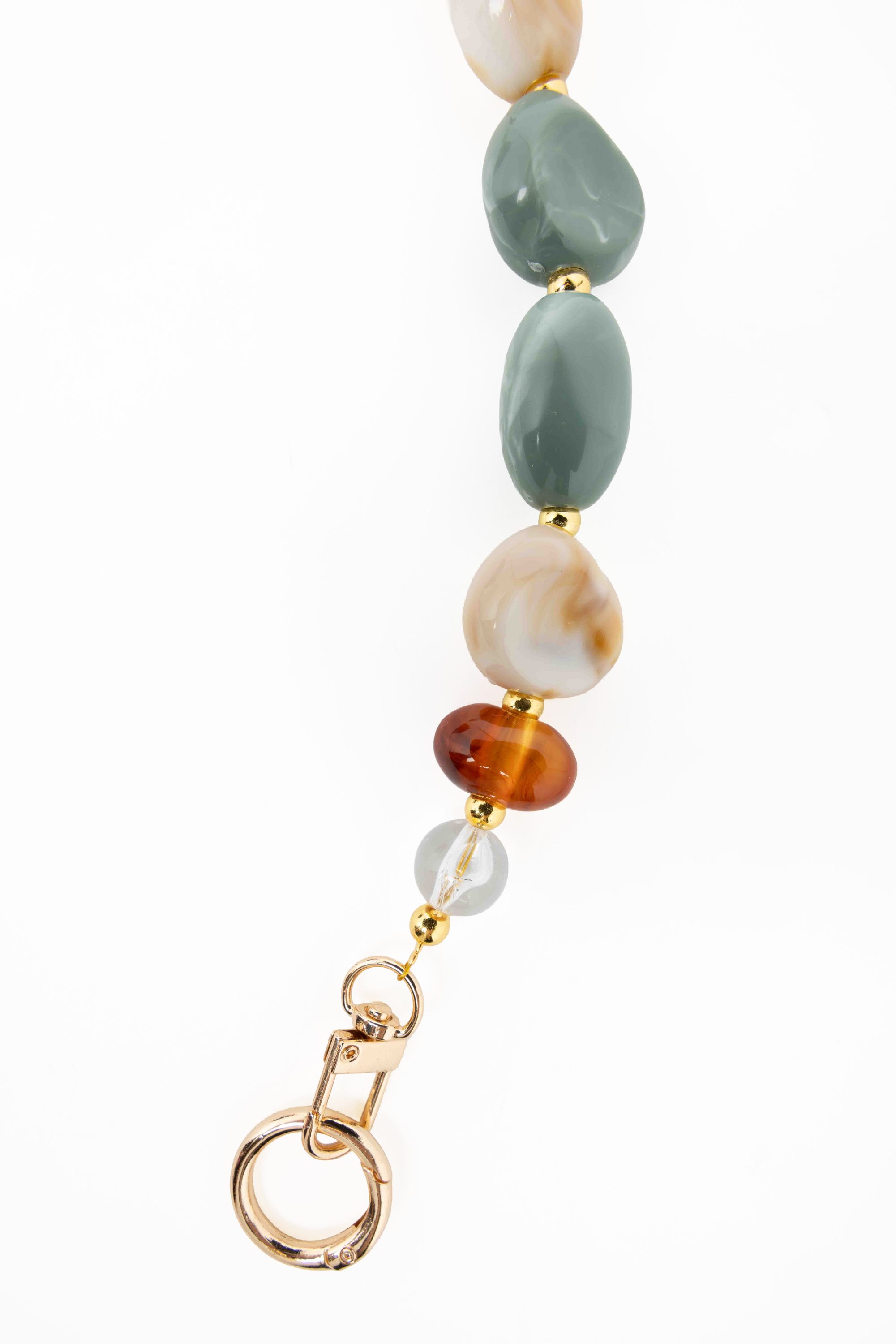 Dit lange telefoonkoord is samengesteld uit kralen in verschillende kleuren en vormen voor een speels effect. Het koord is iets langer ontworpen zodat je het ook als ketting kunt dragen.