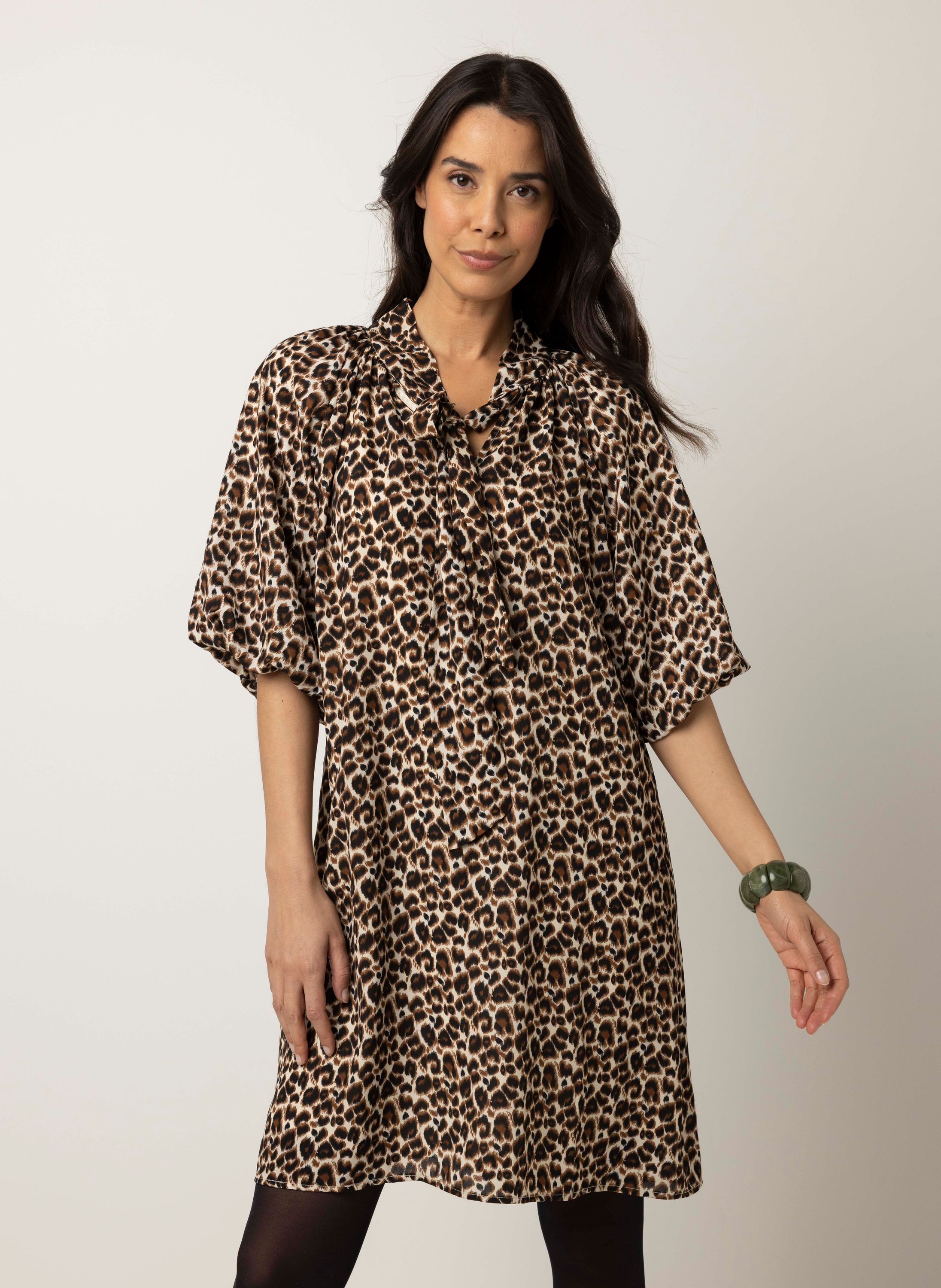 Deze losvallende jurk met ronde hals heeft een strikdetail en halflange mouwen met elastische boorden.