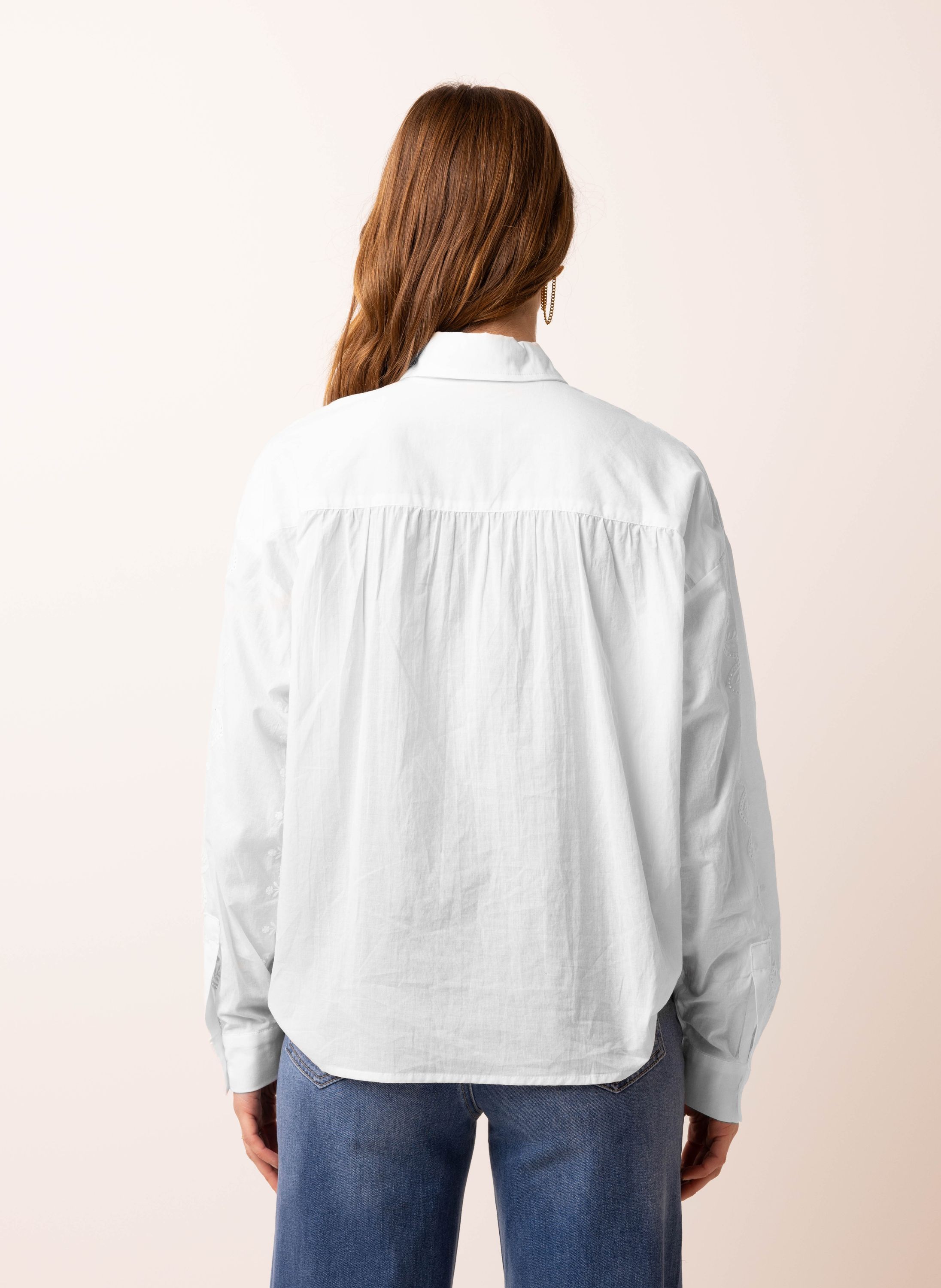 Deze katoenen blouse met klassieke kraag heeft een knoopsluiting, lange mouwen en een plooirand aan de achterzijde. Dit item is exclusief verkrijgbaar in geselecteerde winkels en online. Controleer de winkelvoorraad om de beschikbaarheid in een winkel bij jou in de buurt te bekijken.