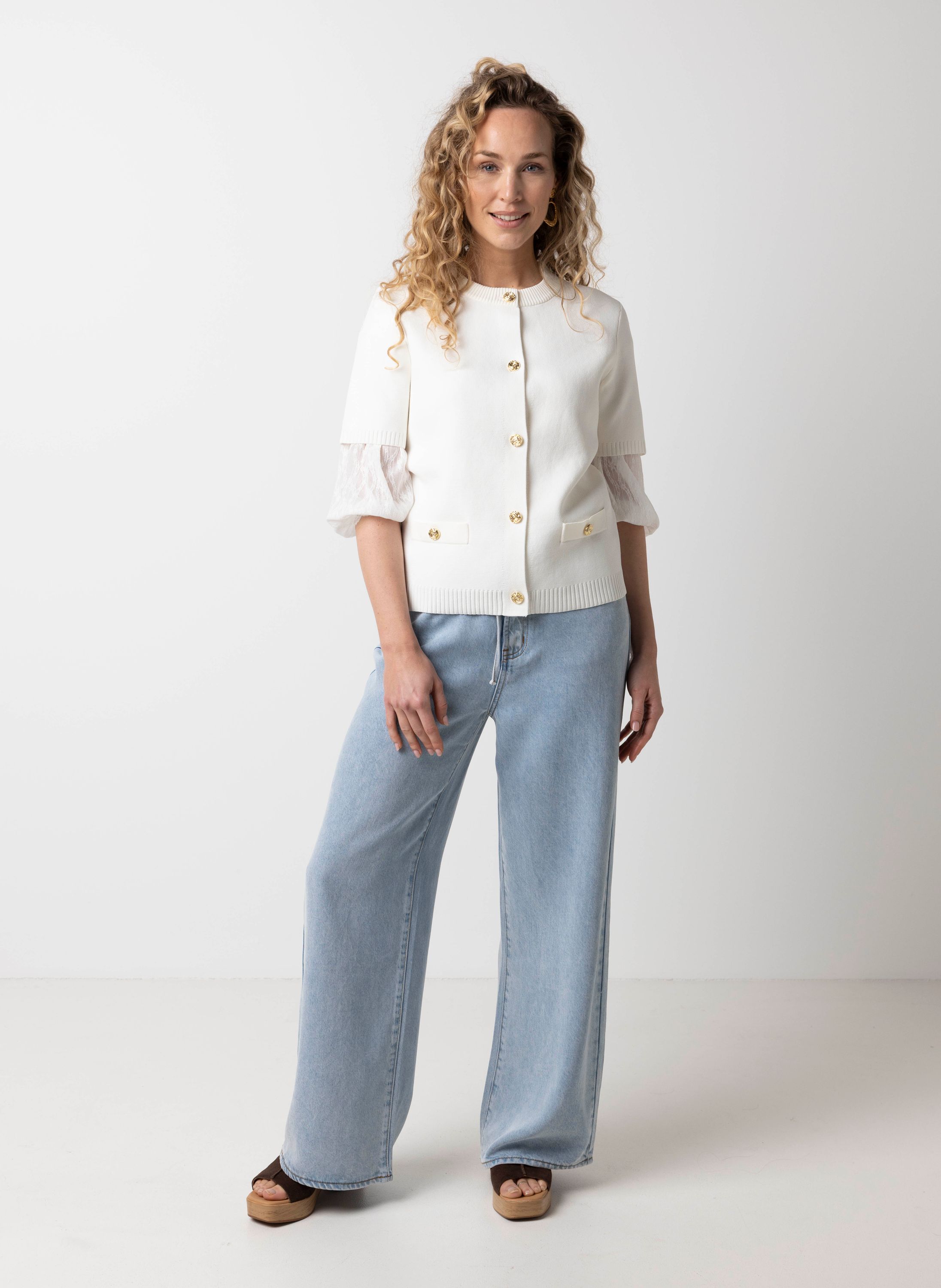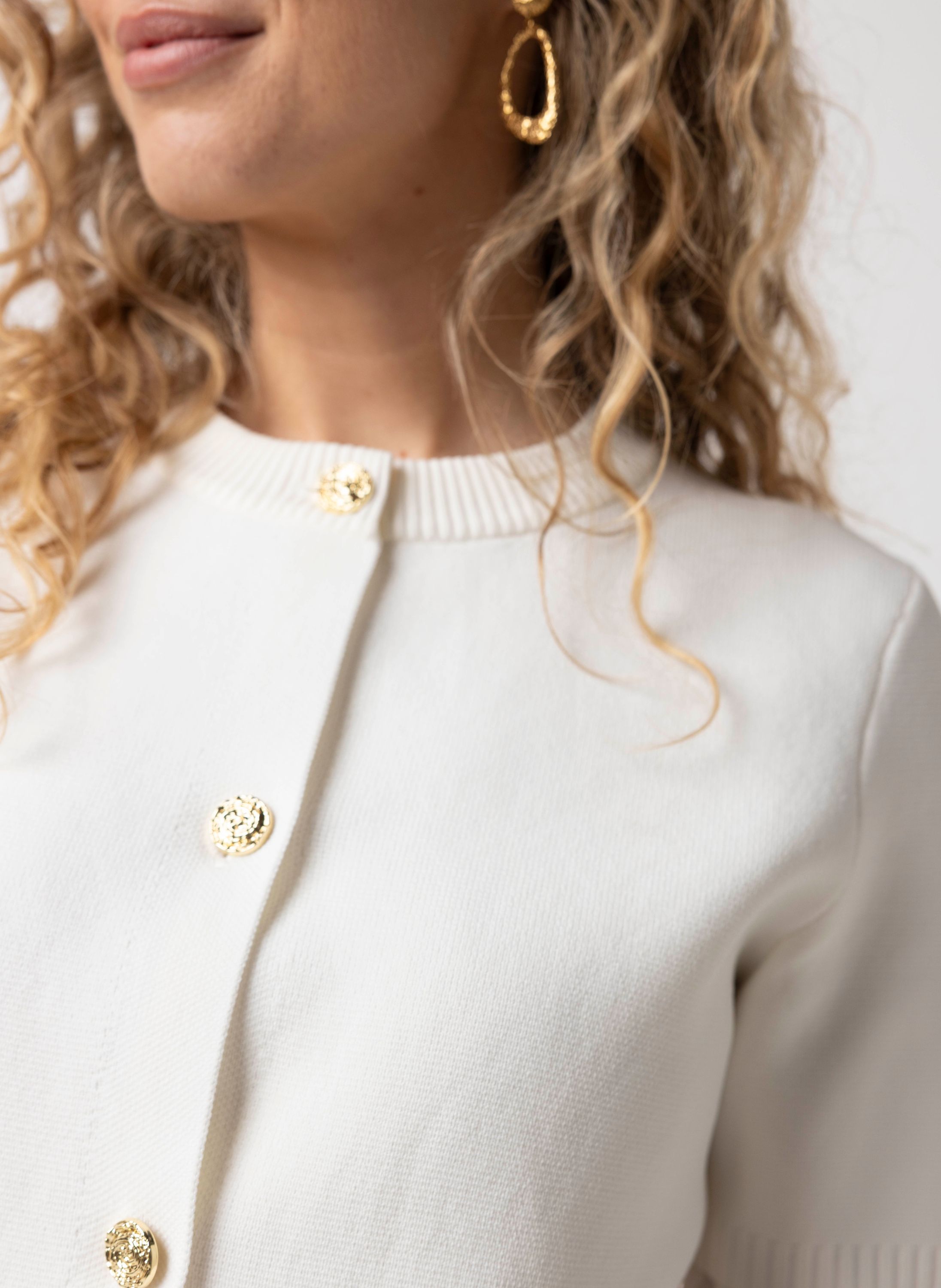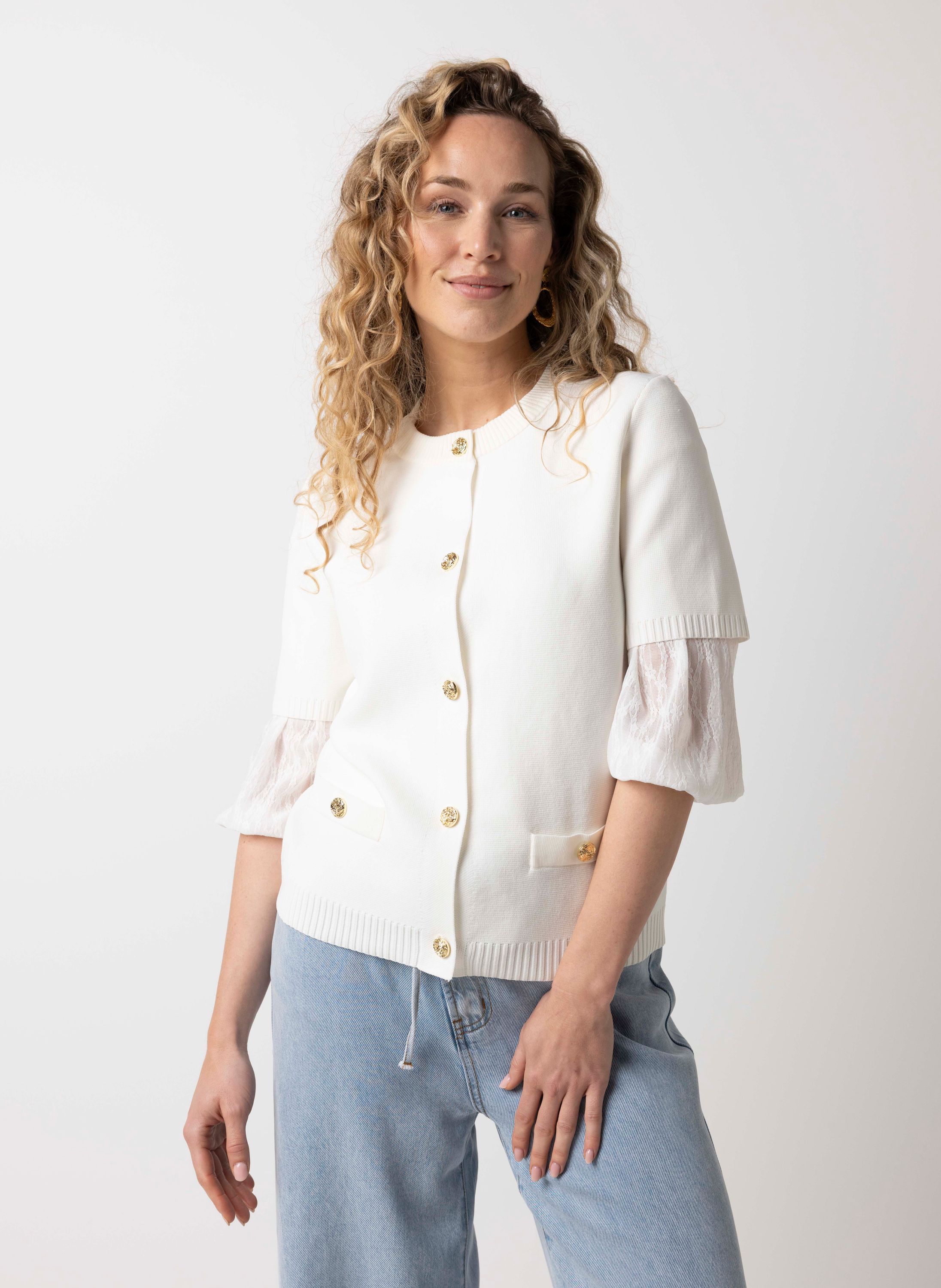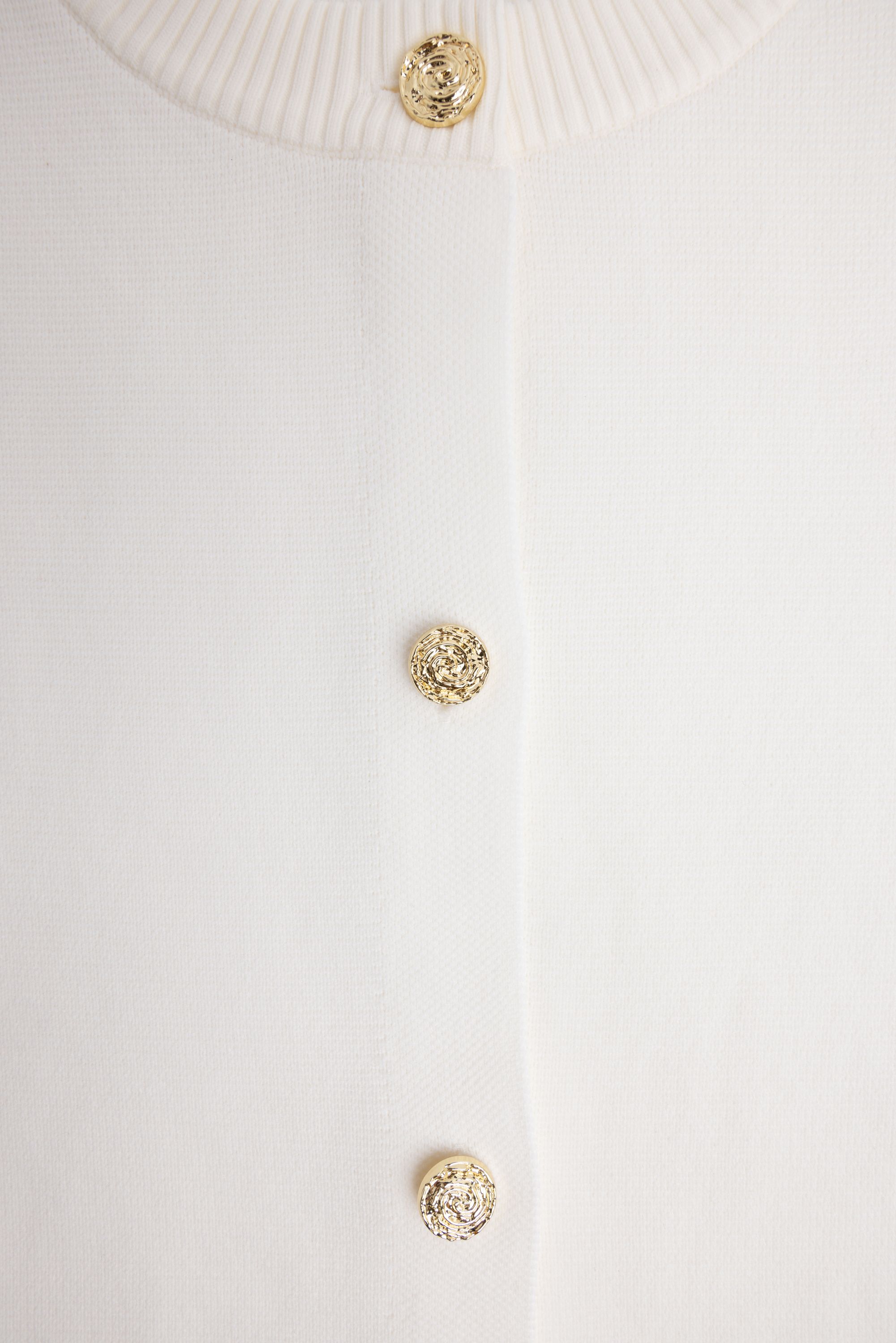 Dit gebreide vest met ronde hals, korte mouwen, goudkleurige knoopsluiting en decoratieve zakken aan de voorzijde heeft een elegante uitstraling.