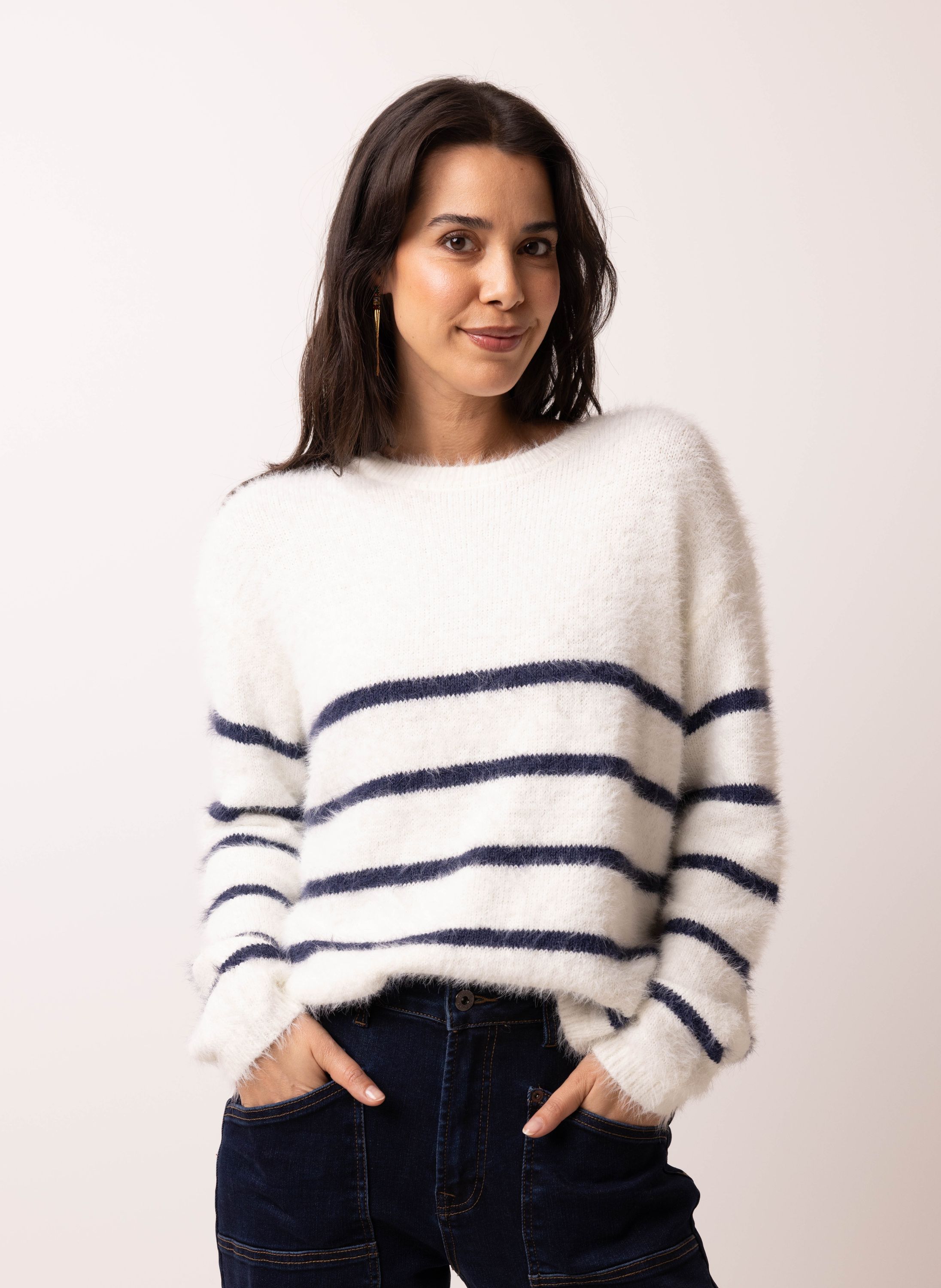 Deze gebreide trui met ronde hals heeft lange mouwen en een comfortabele fit.