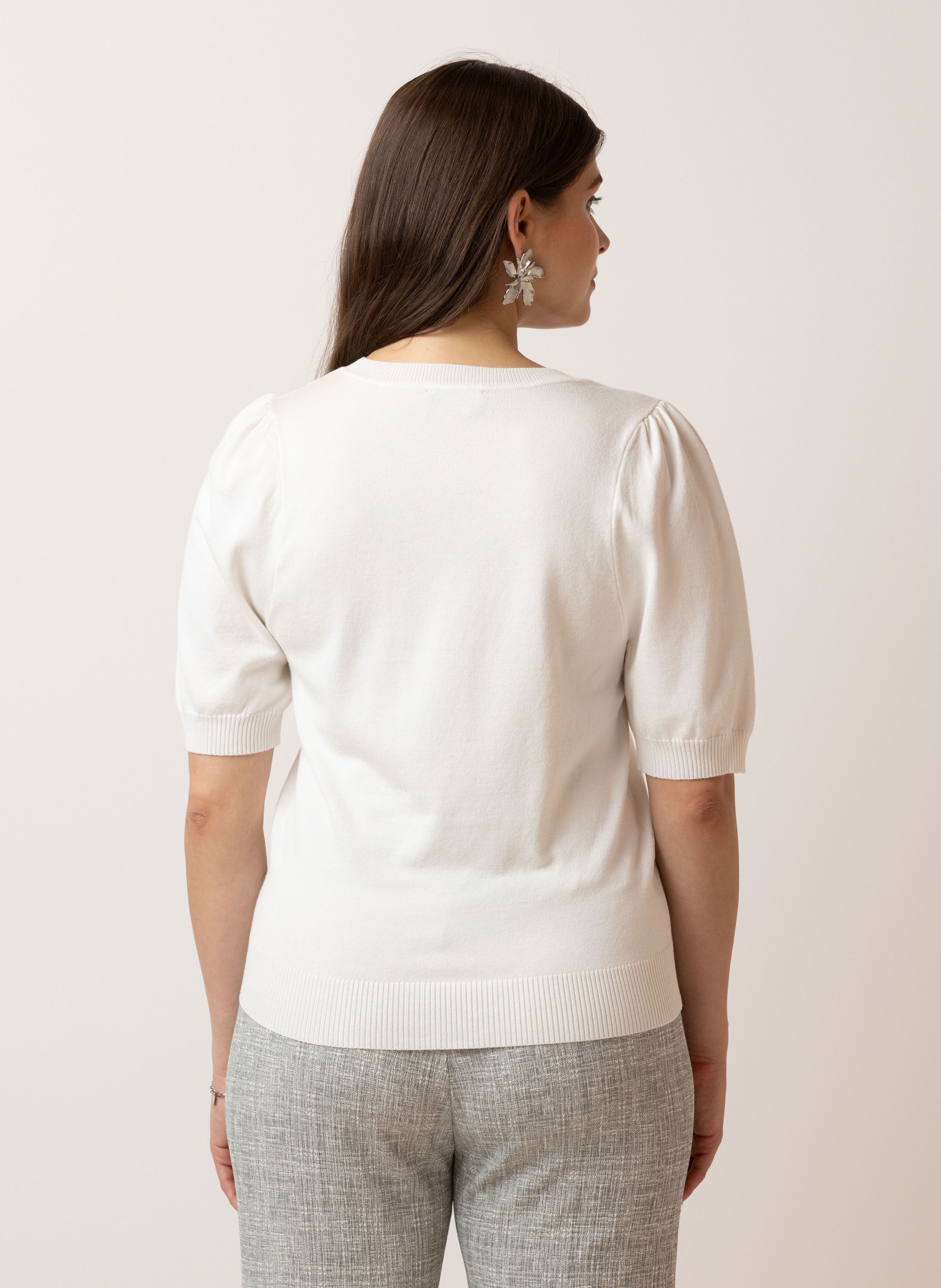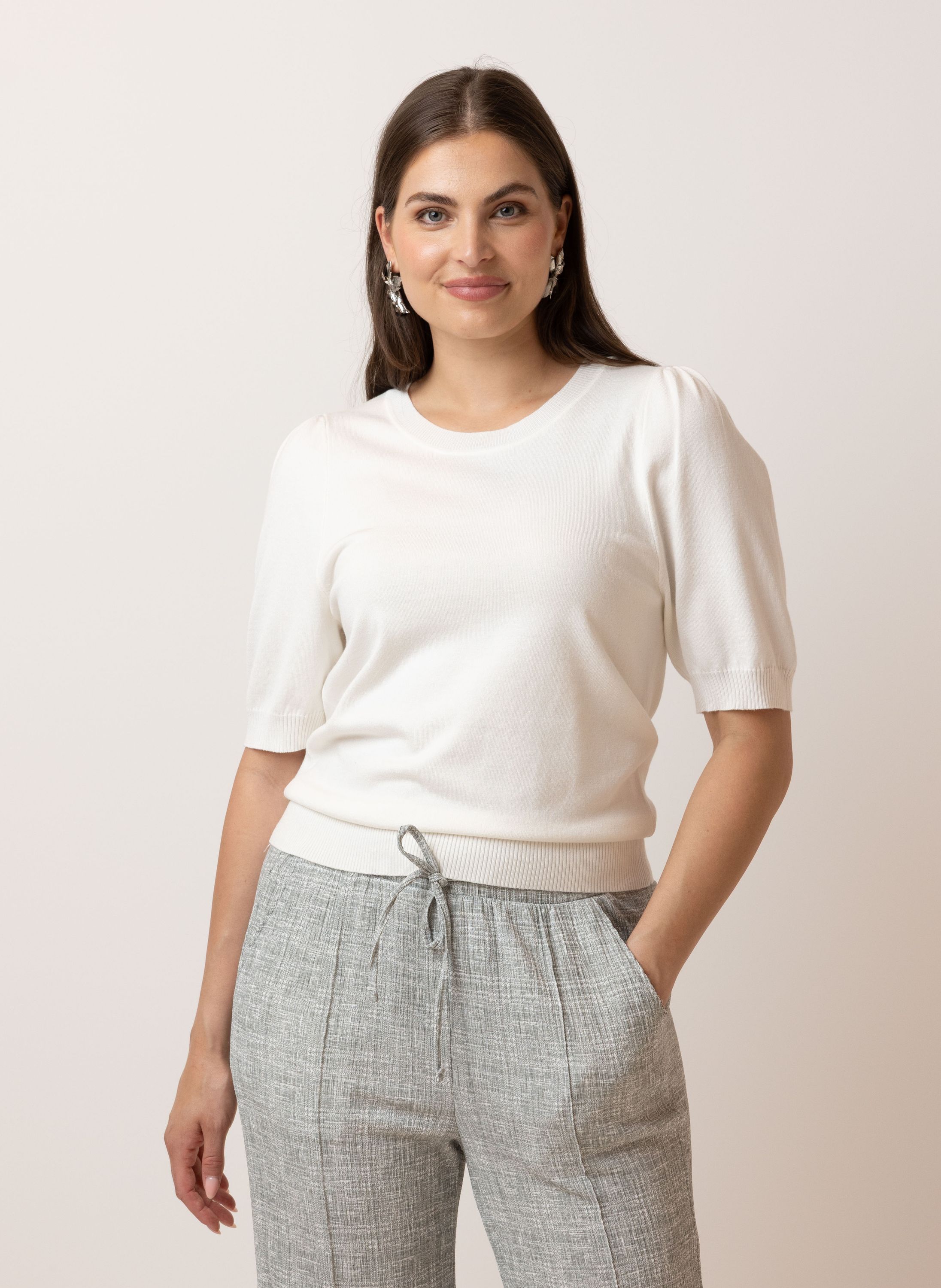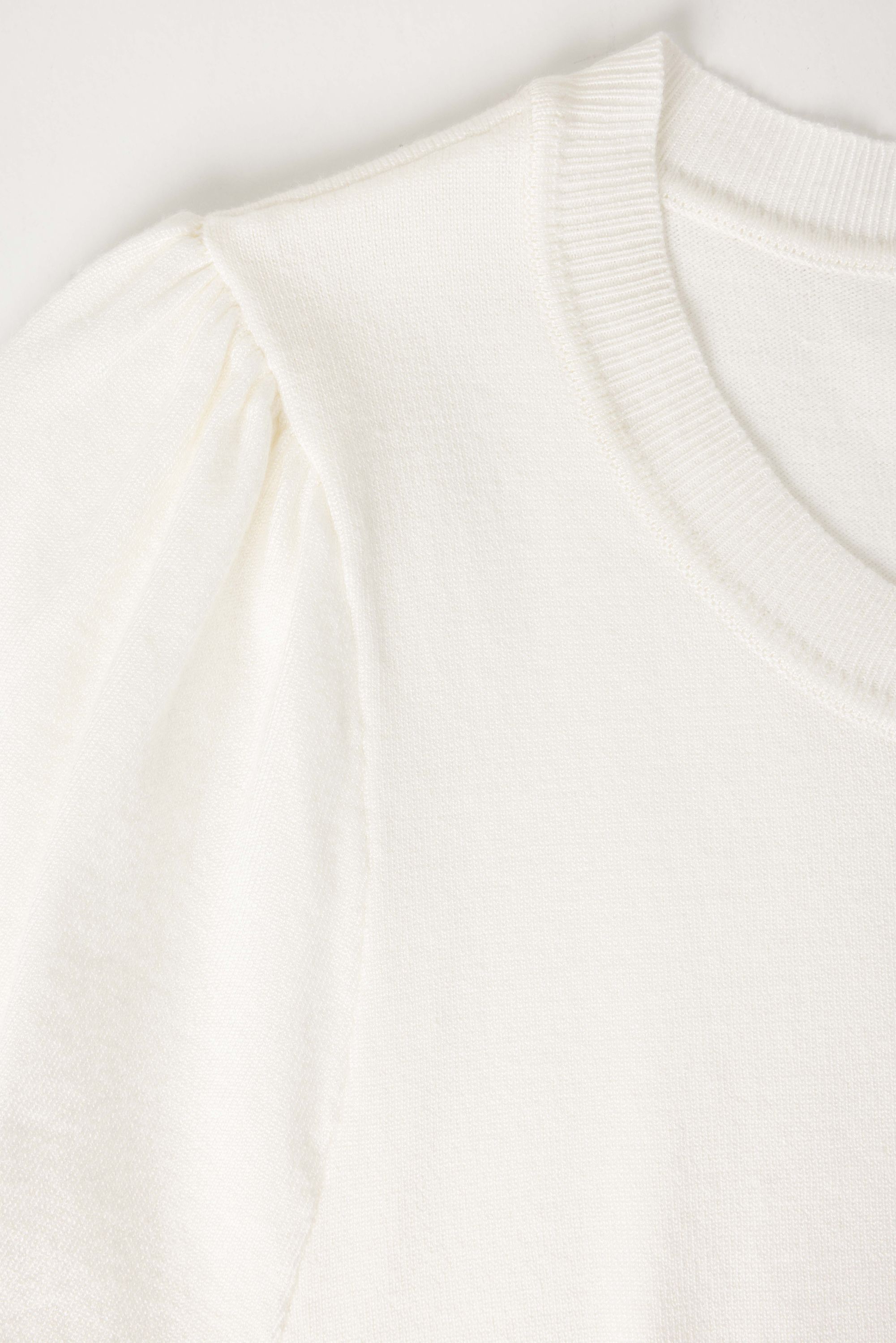 Deze fijngebreide trui met ronde hals heeft halflange pofmouwen.