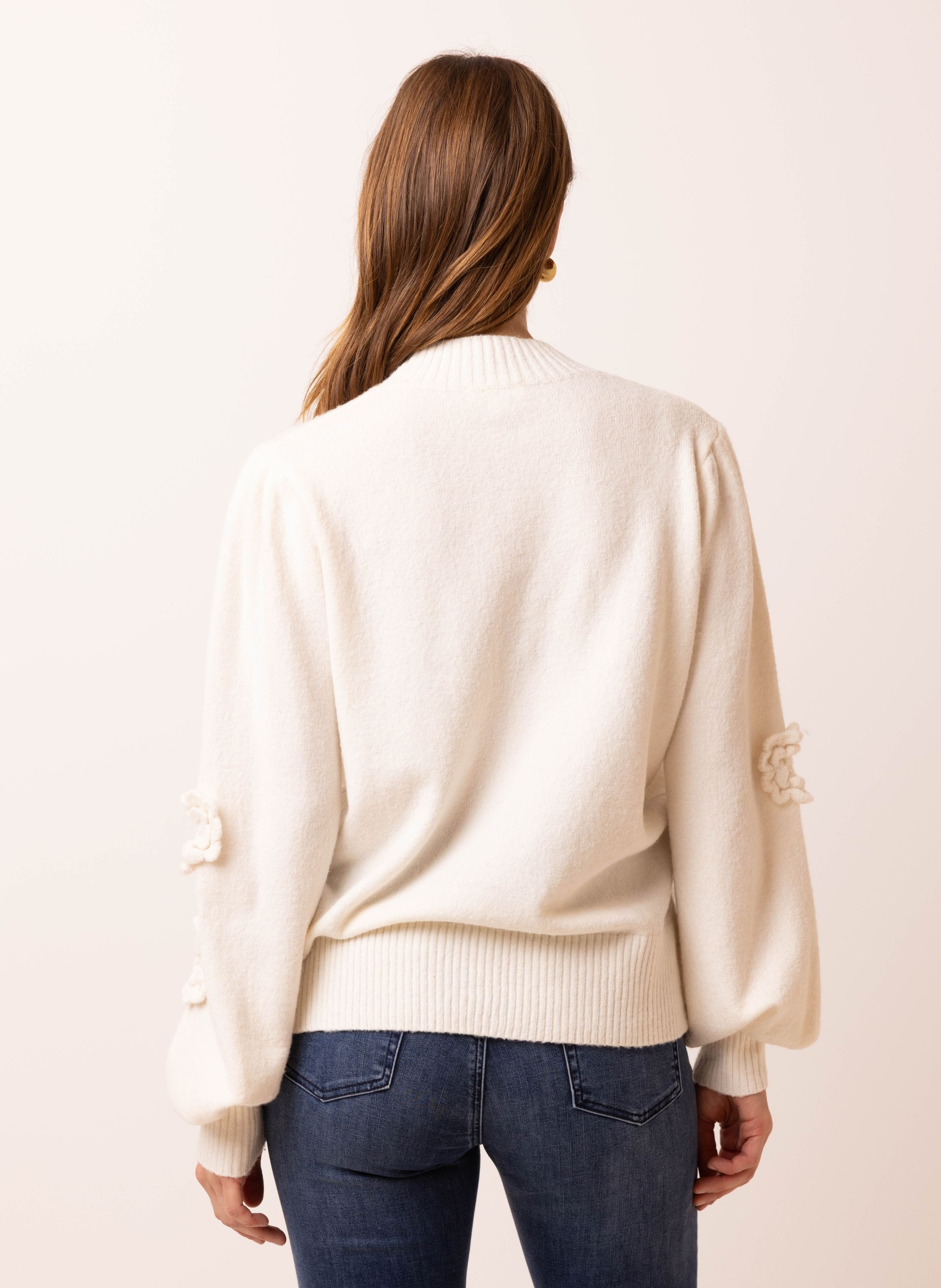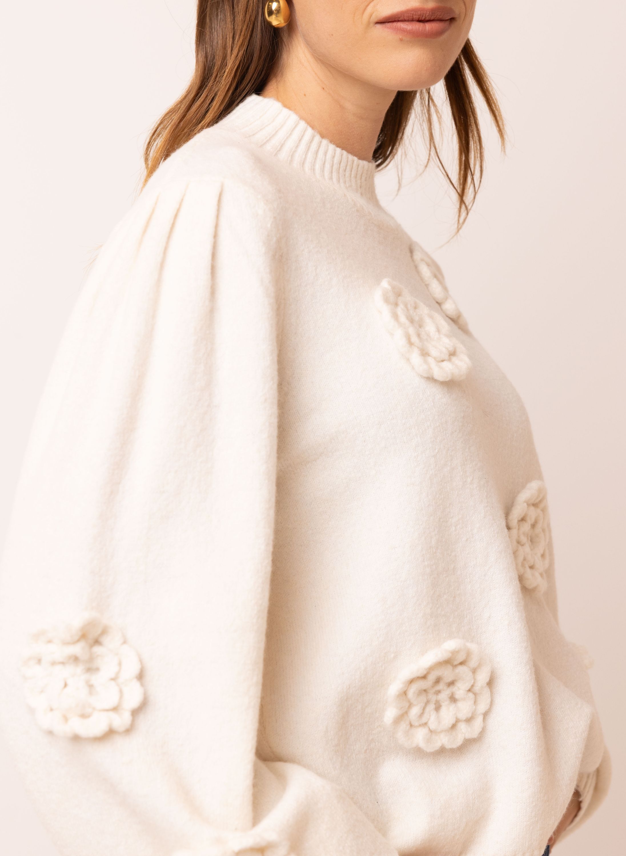 Deze gebreide trui met ronde hals, lange pofmouwen en gehaakte bloemen heeft een vrouwelijke uitstraling.