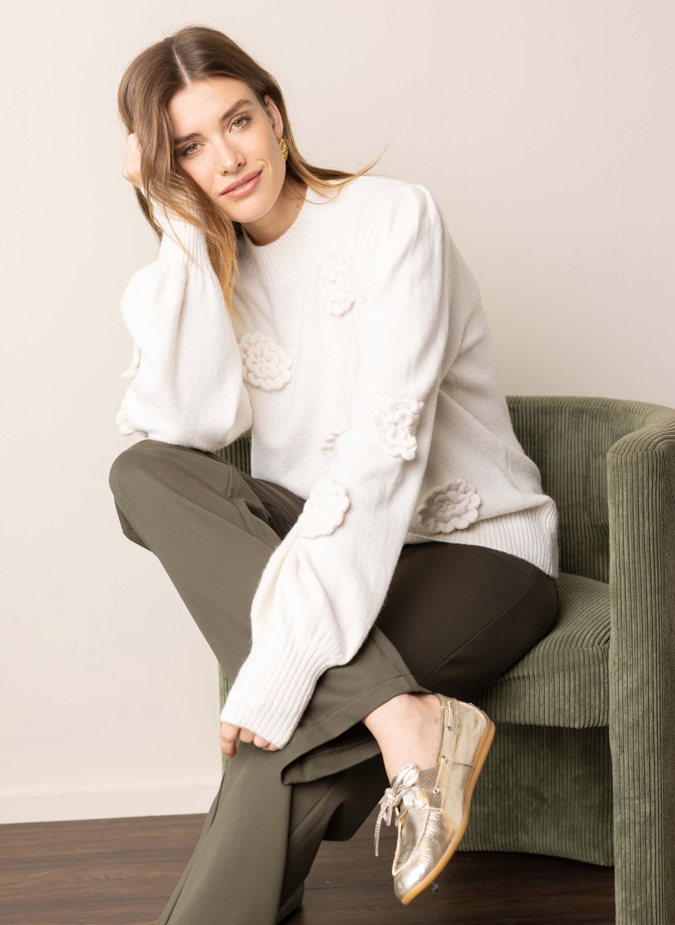 Off-white trui met gehaakte bloemen