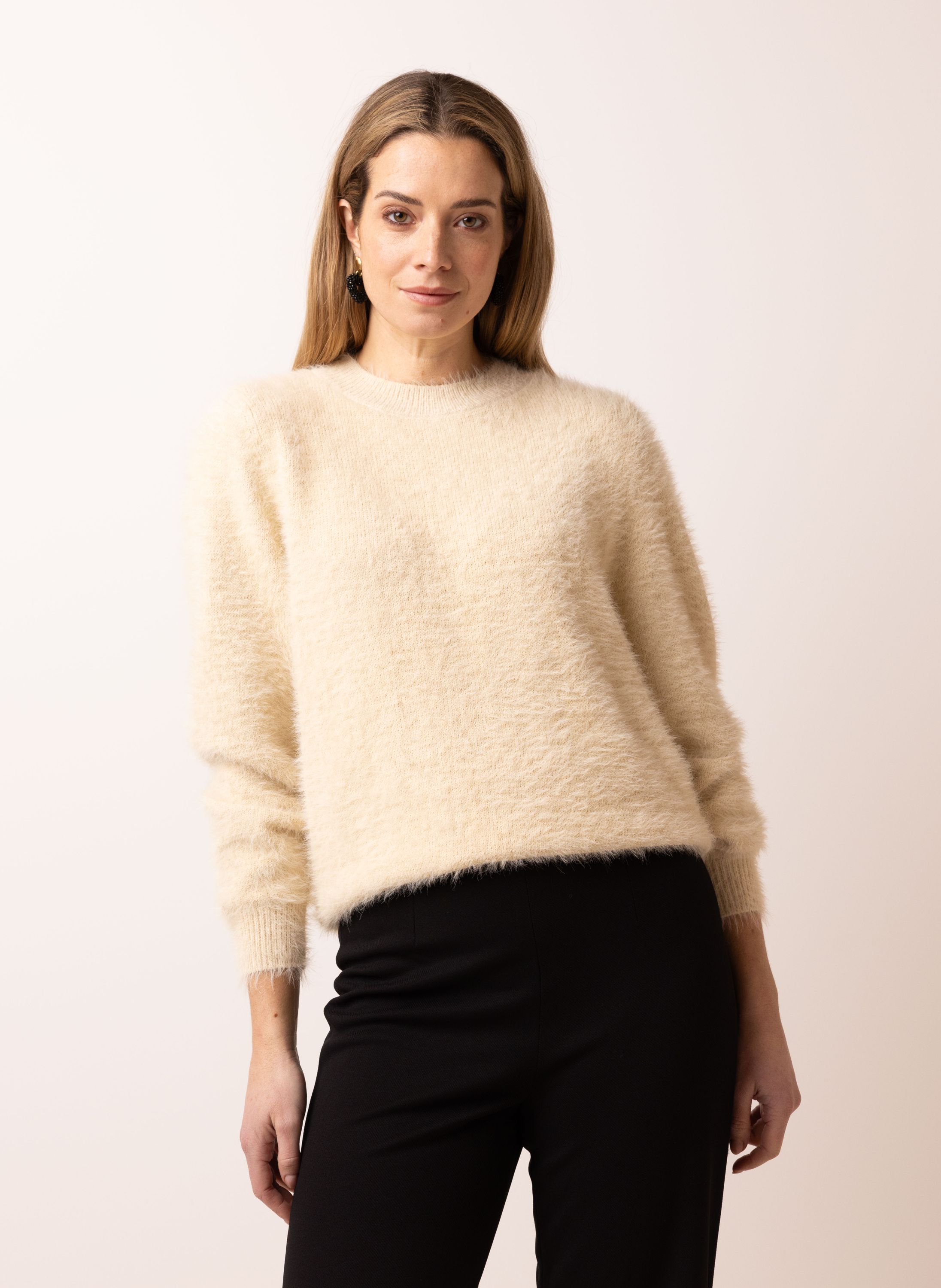 Deze fijngebreide trui heeft een ronde halslijn en lange mouwen.