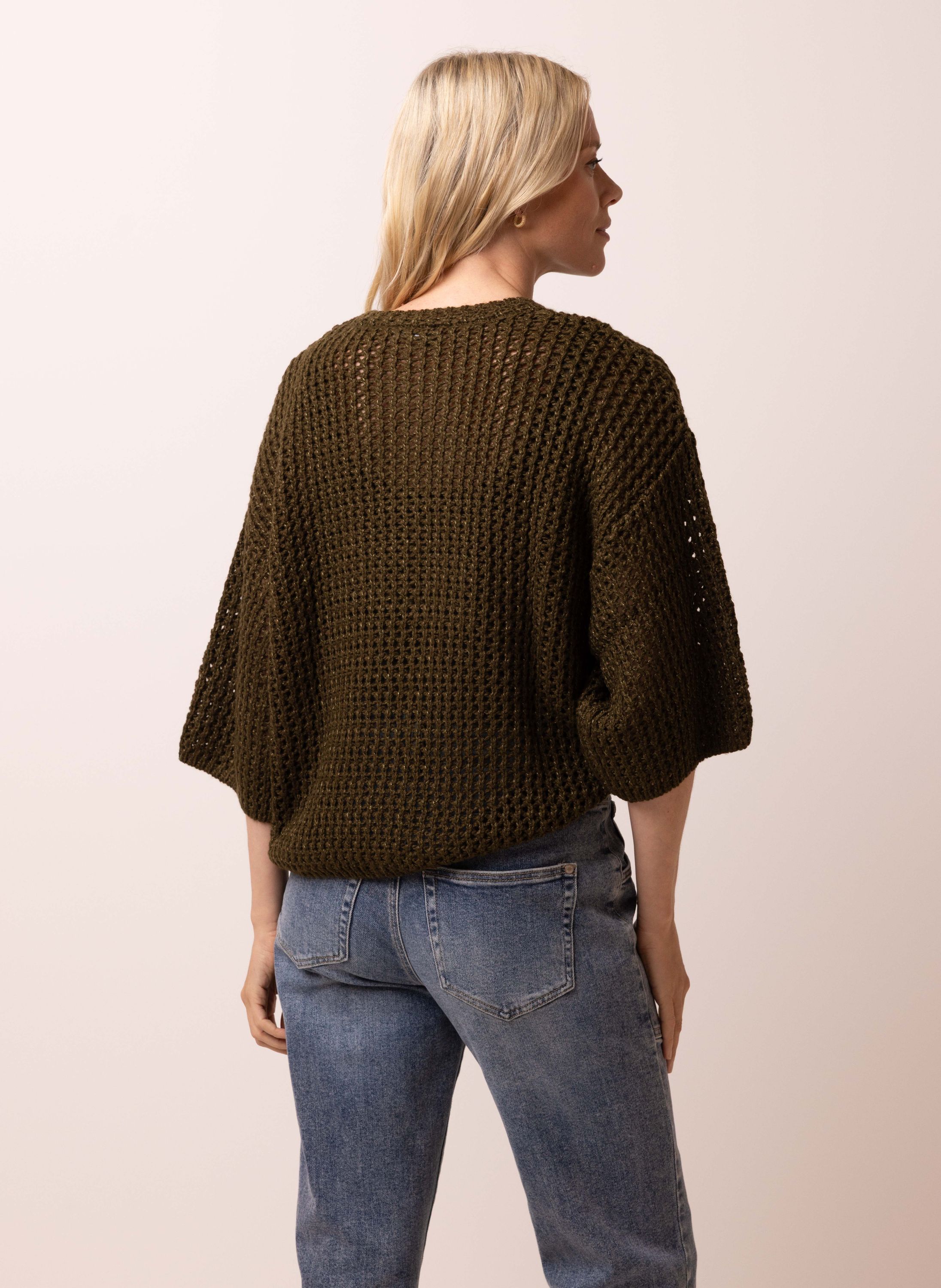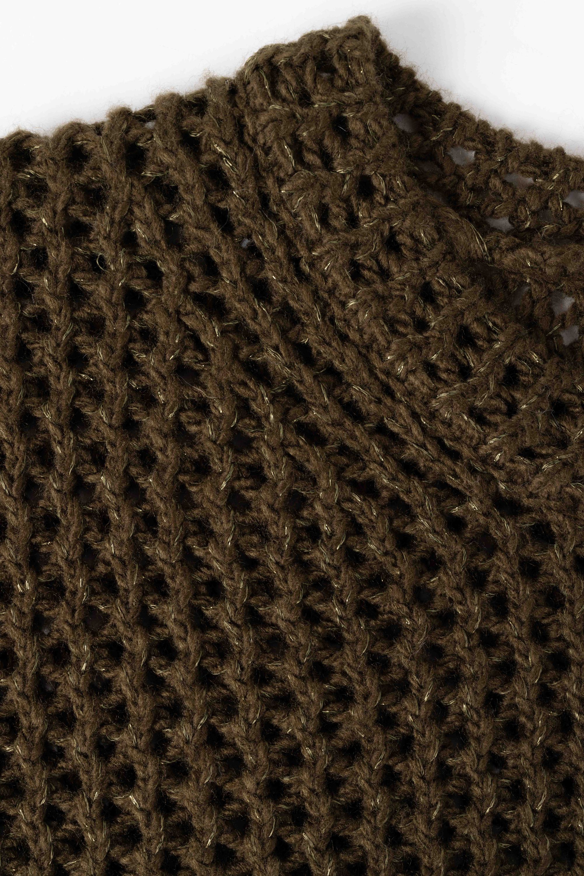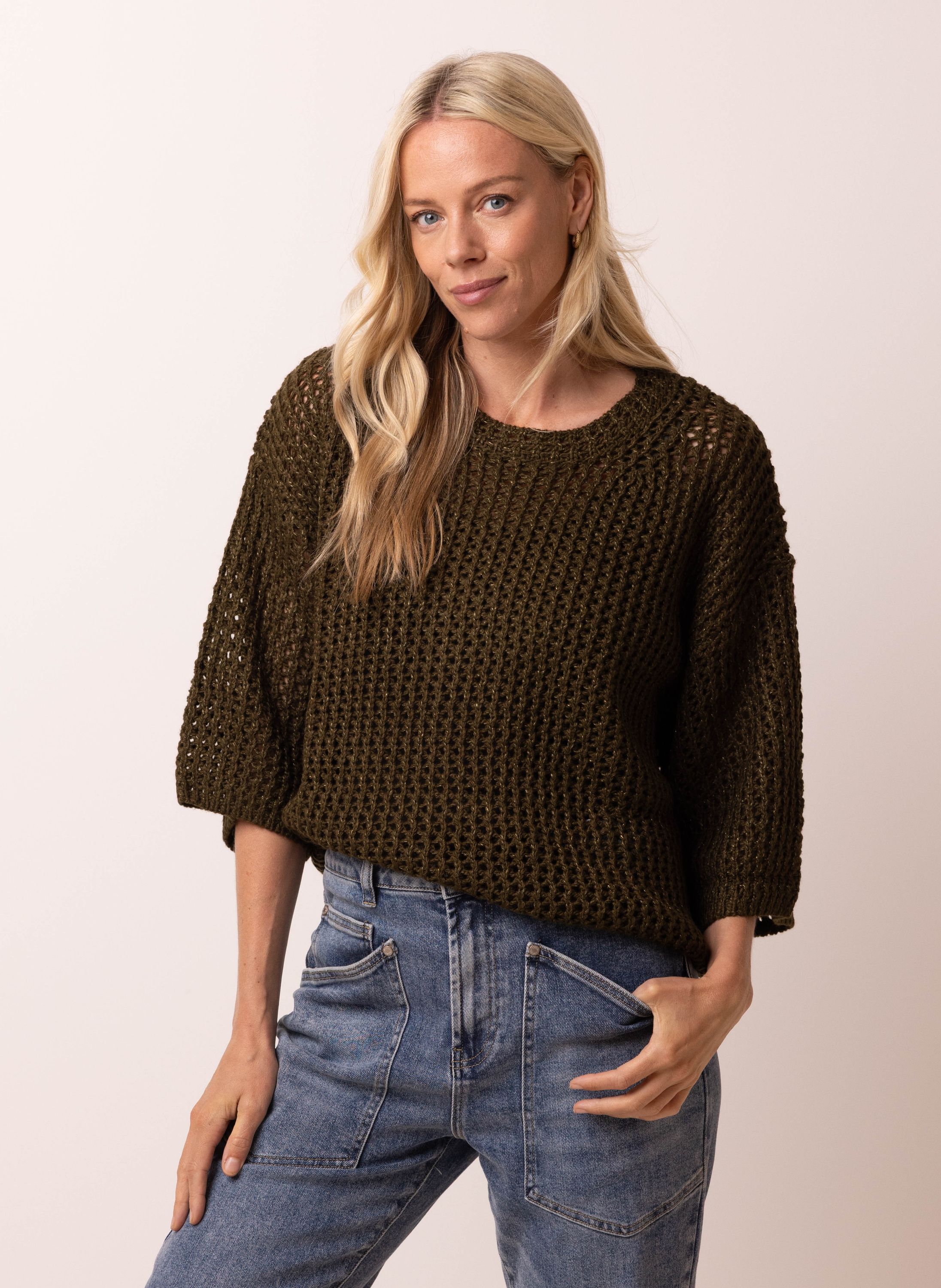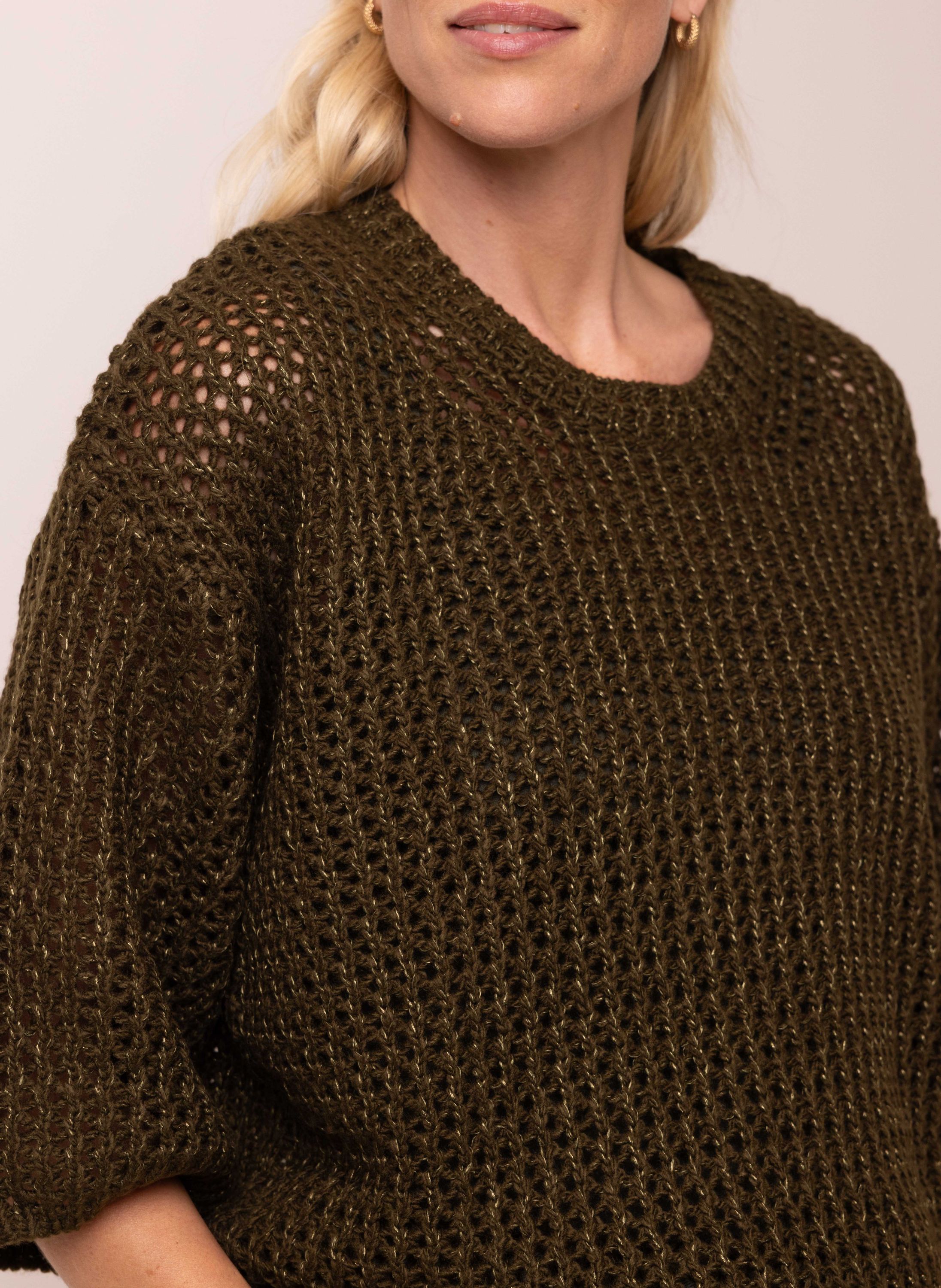 Deze gehaakte trui met ronde hals heeft halflange mouwen en glanzend lurexdraad.