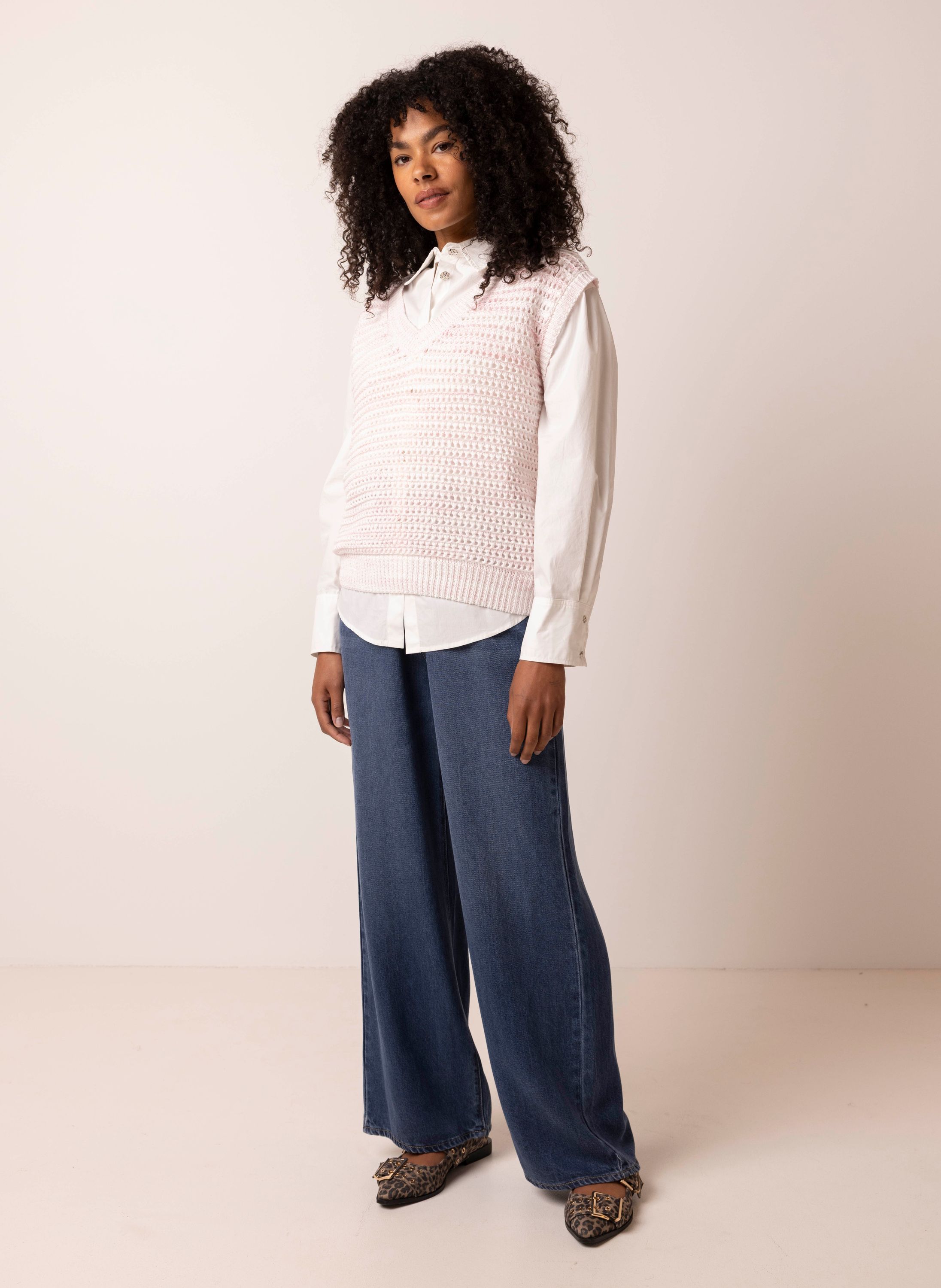 Deze opengebreide top met V-hals en korte mouwen heeft een luchtige uitstraling. We adviseren je er een Marianne top onder te dragen.
