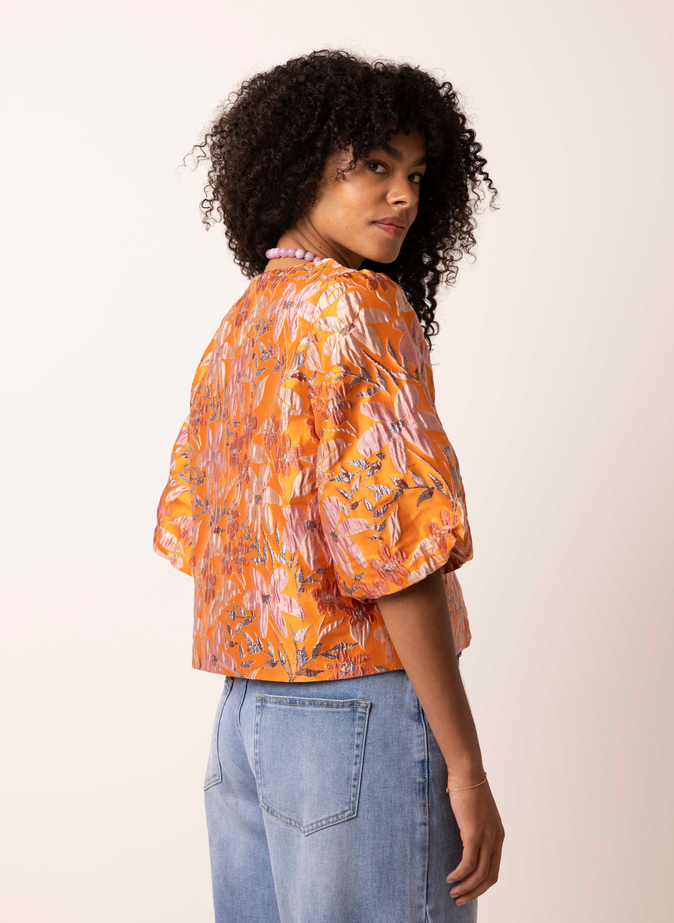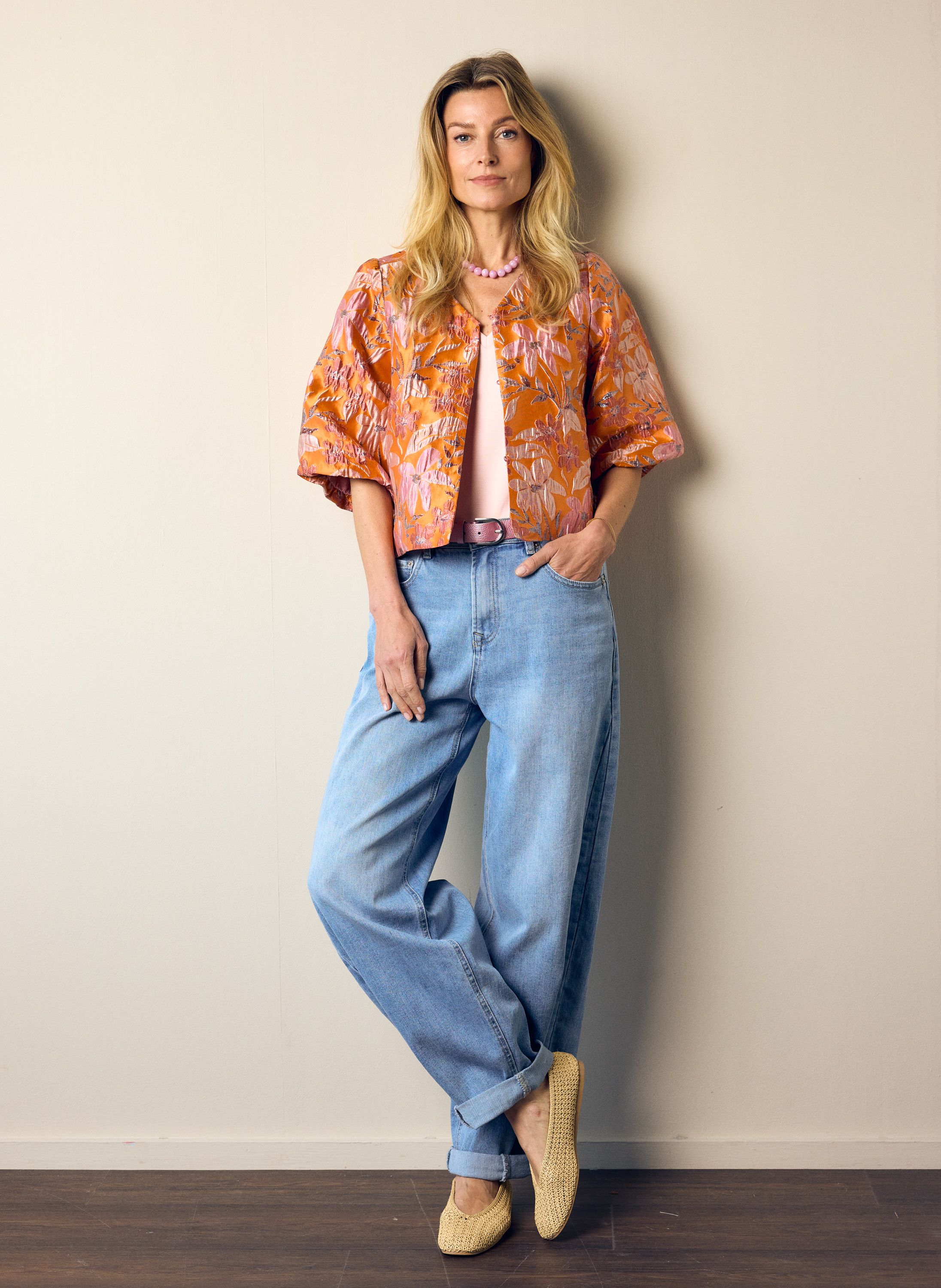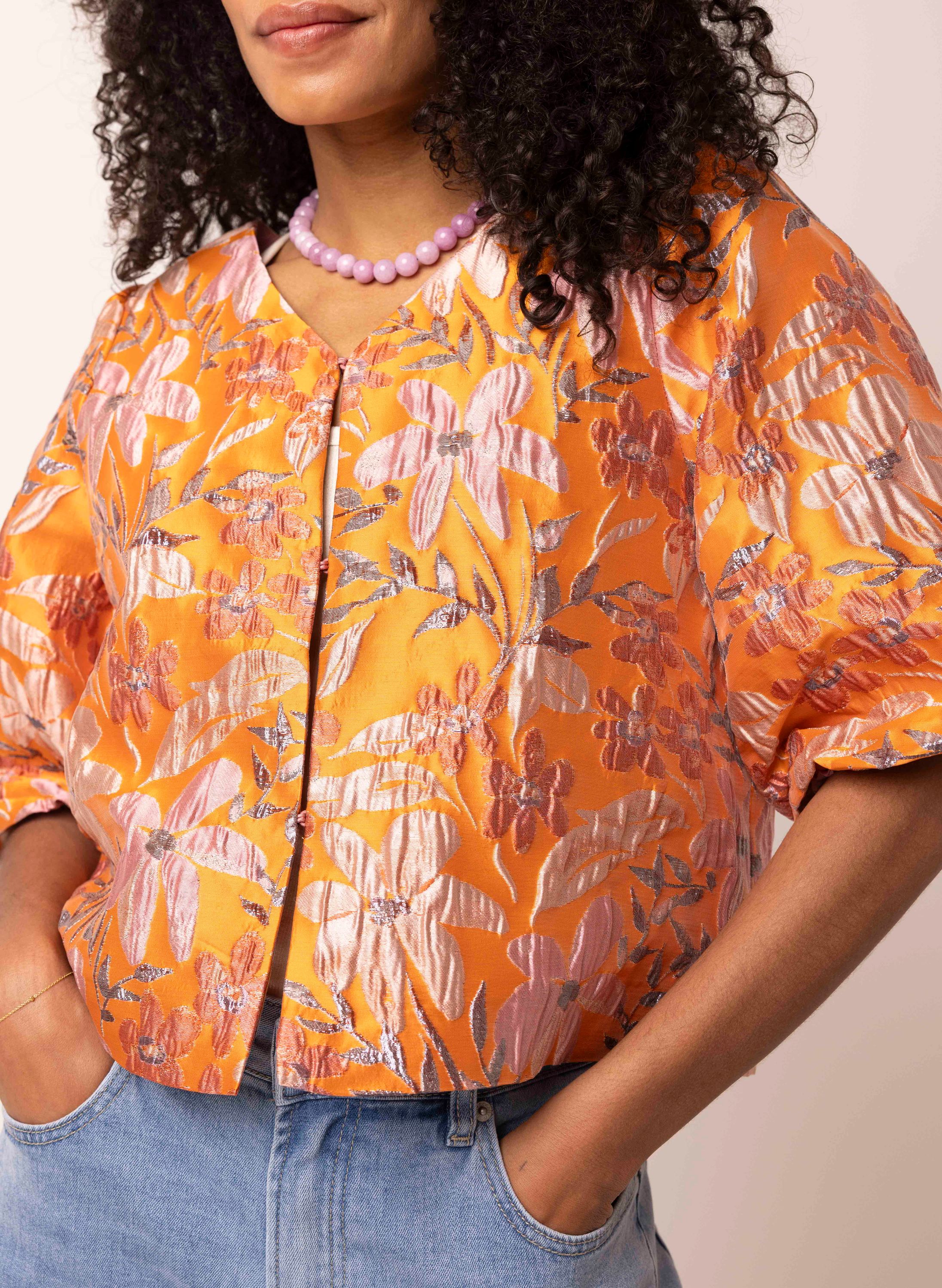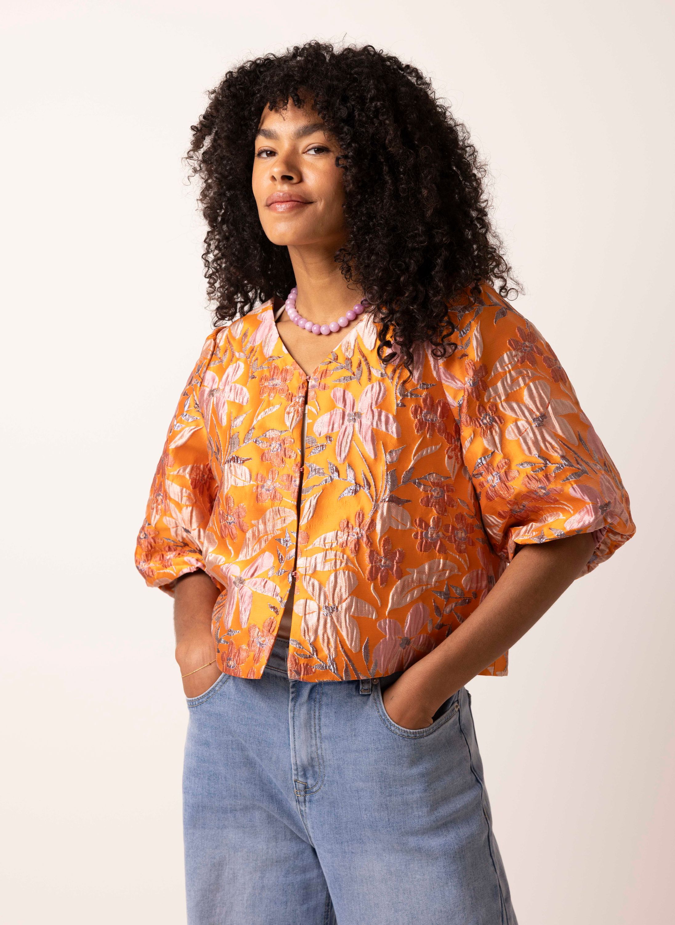 Dit jasje met V-hals, halflange pofmouwen en haakjessluiting heeft een vrouwelijke uitstraling.
