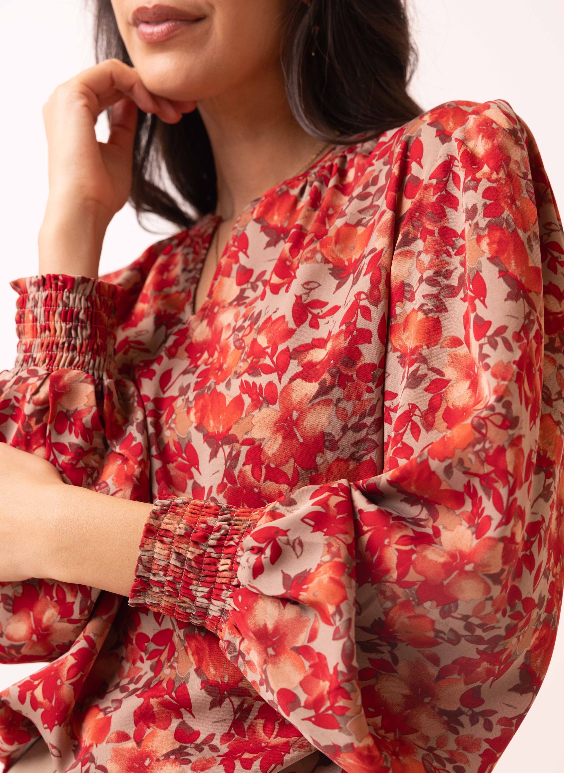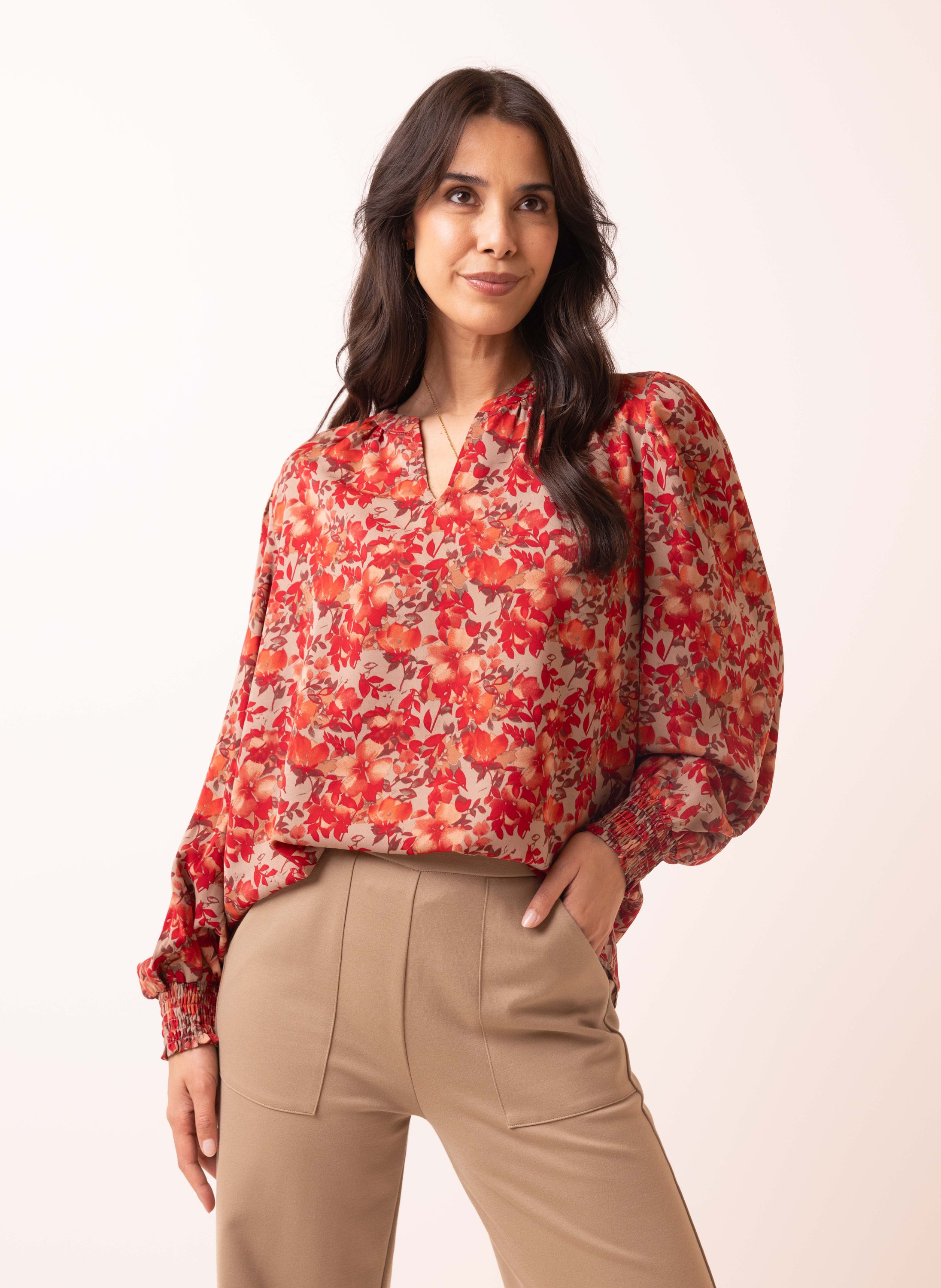 Deze blouse met geplooide V-hals en lange pofmouwen met smokboorden is een elegante keuze voor elke gelegenheid. Dit item is exclusief verkrijgbaar in geselecteerde winkels en online. Controleer de winkelvoorraad om de beschikbaarheid in een winkel bij jou in de buurt te bekijken.