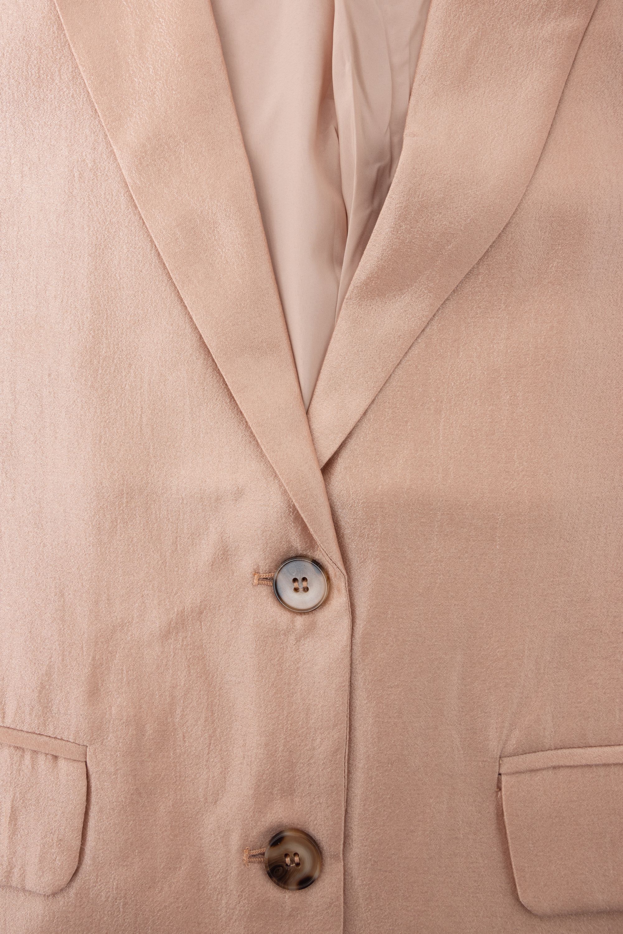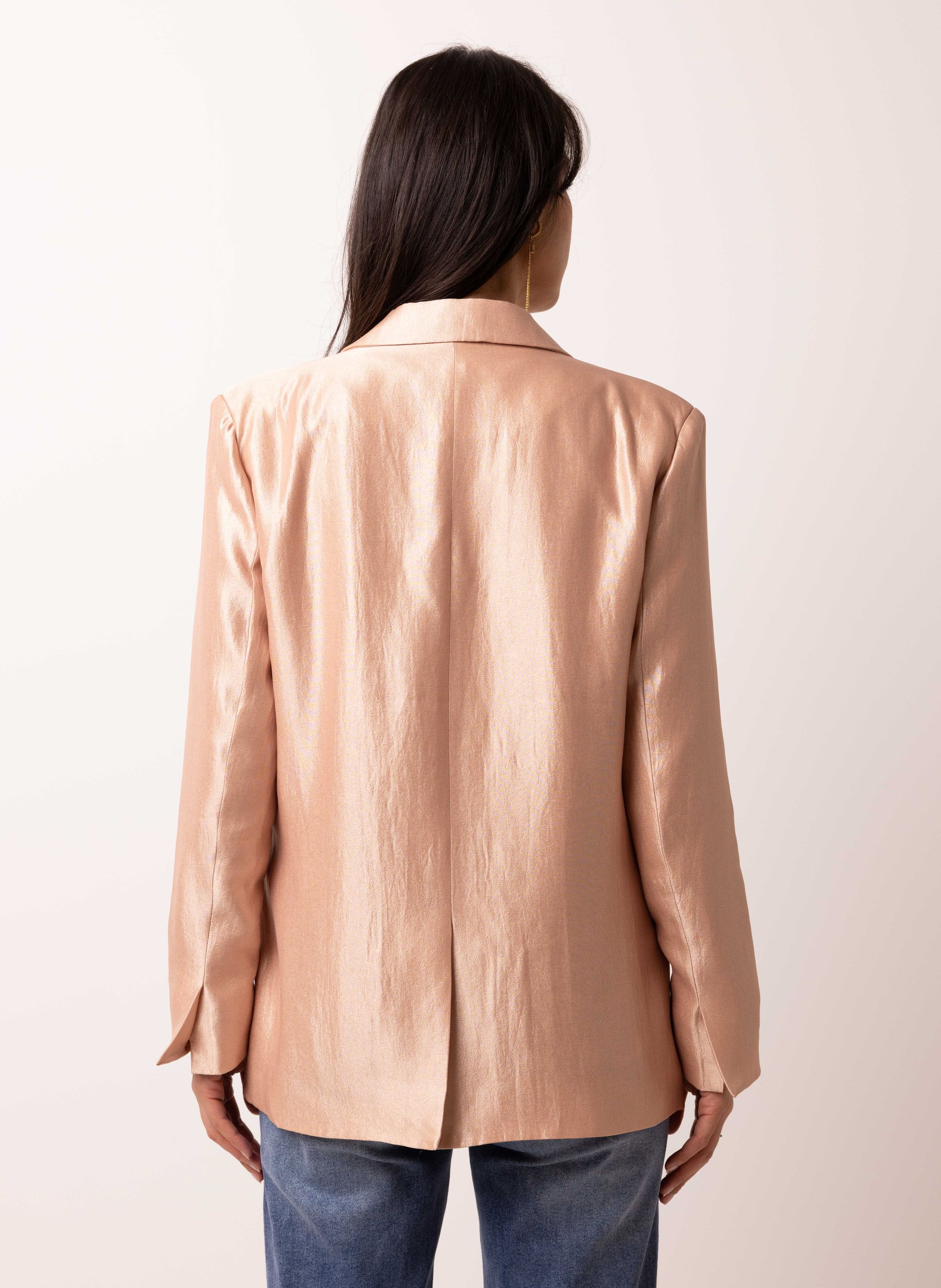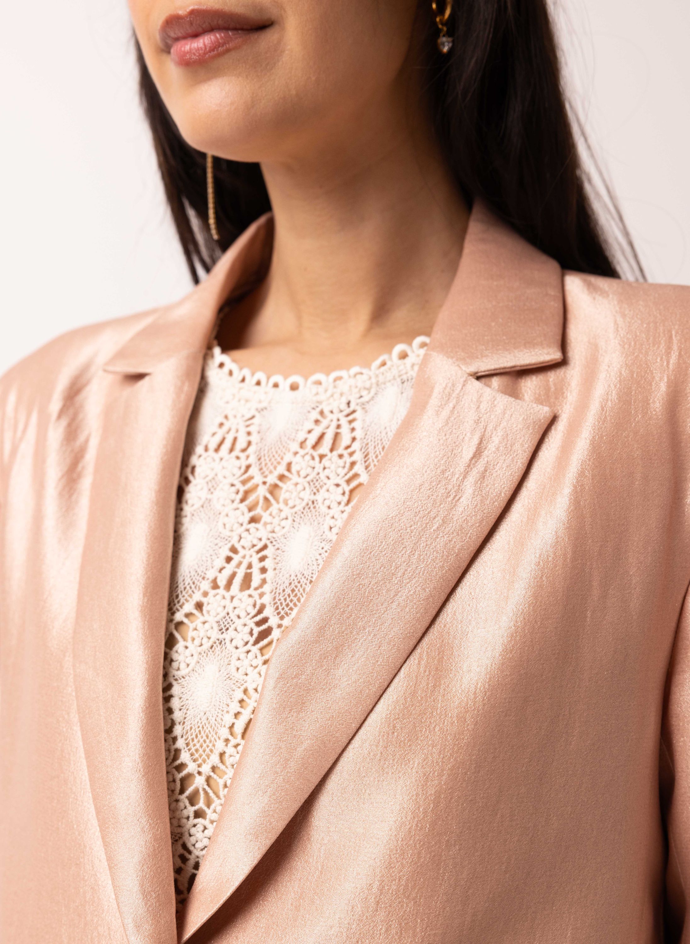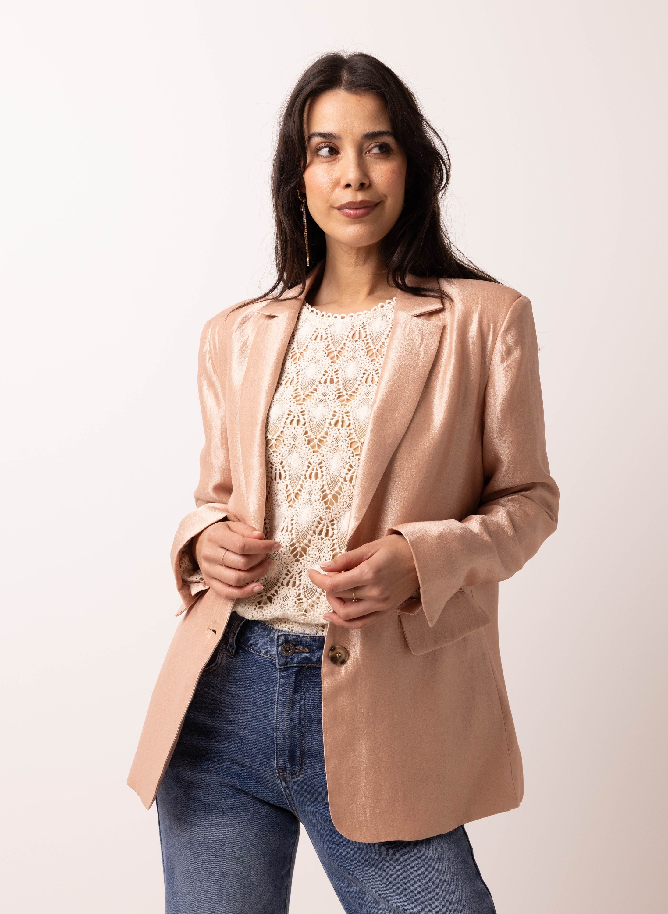 Deze blazer met reverskraag heeft een knoopsluiting, lange mouwen en decoratieve zakken en heeft een feestelijke glans.