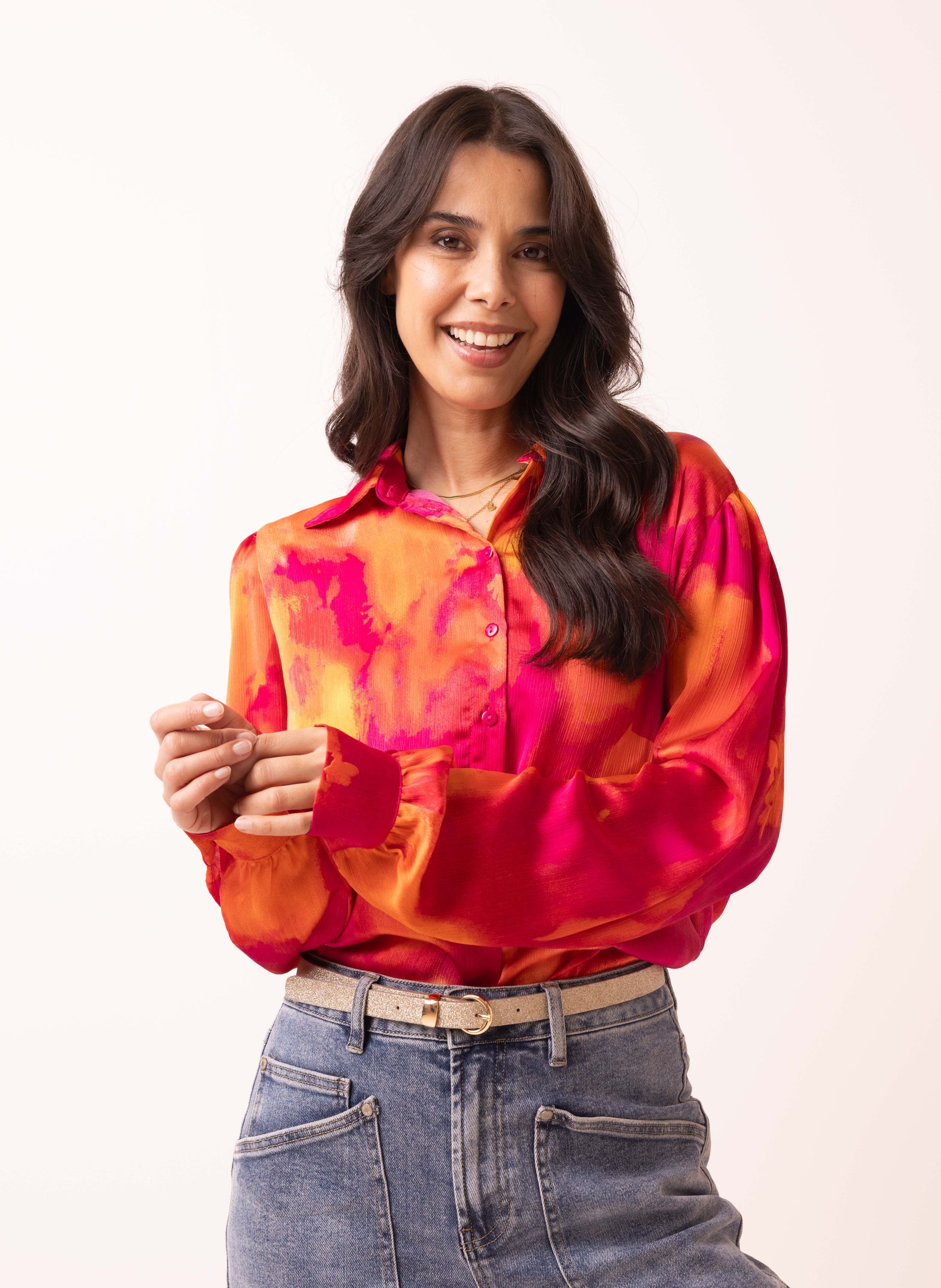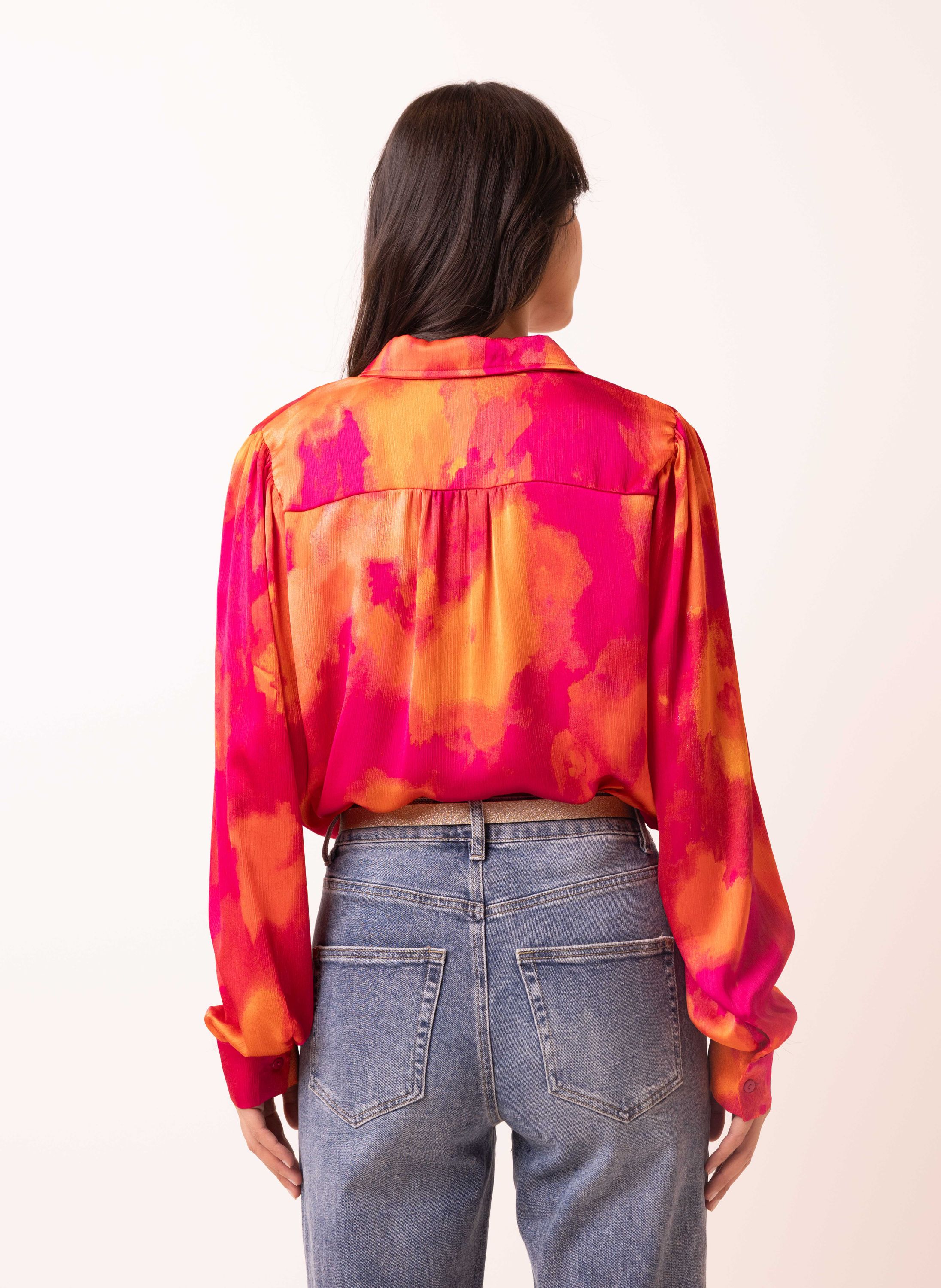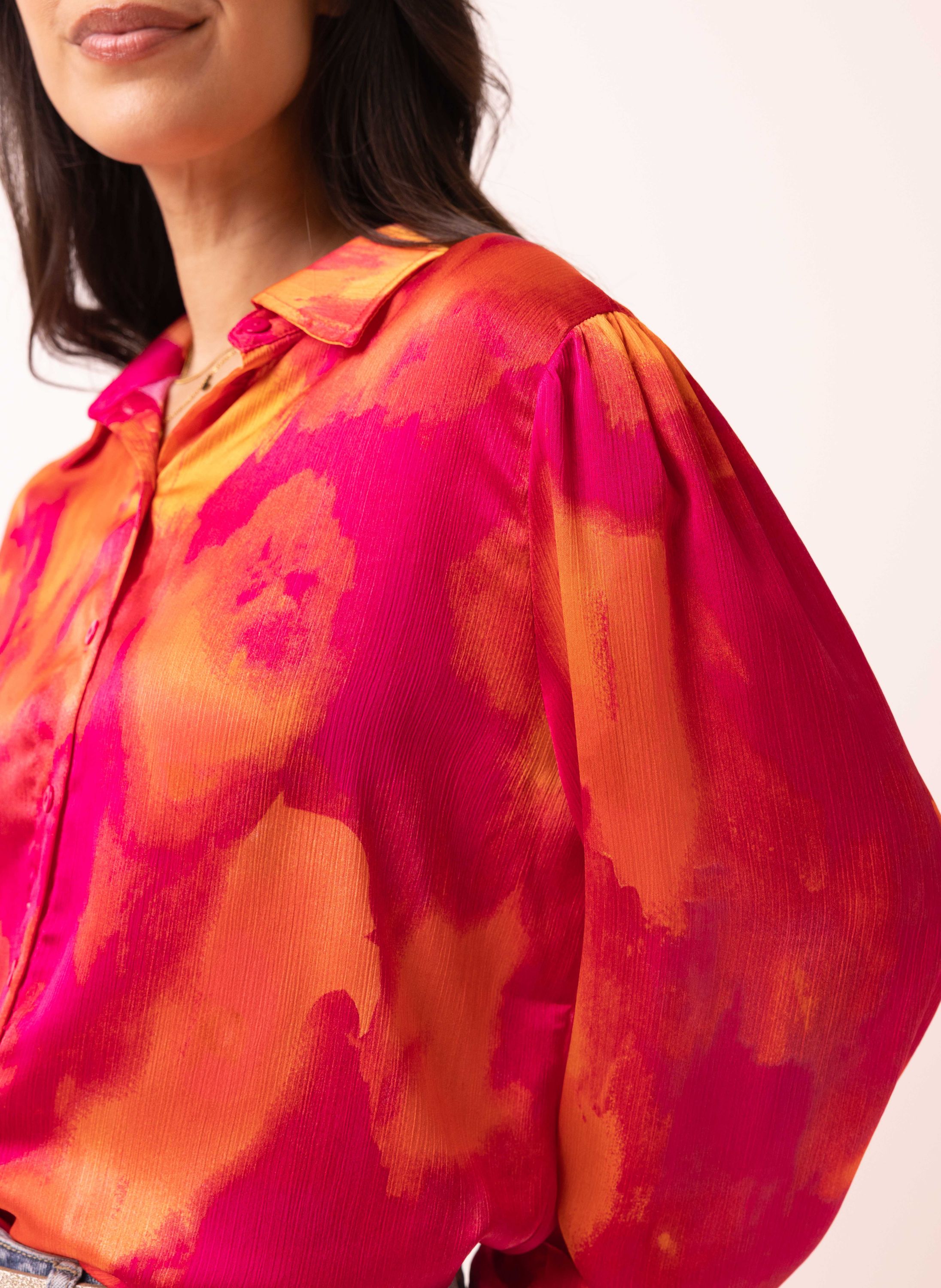 Deze subtiel glanzende blouse heeft een klassieke kraag, knoopsluiting, lange pofmouwen en plooirand op de achterzijde.