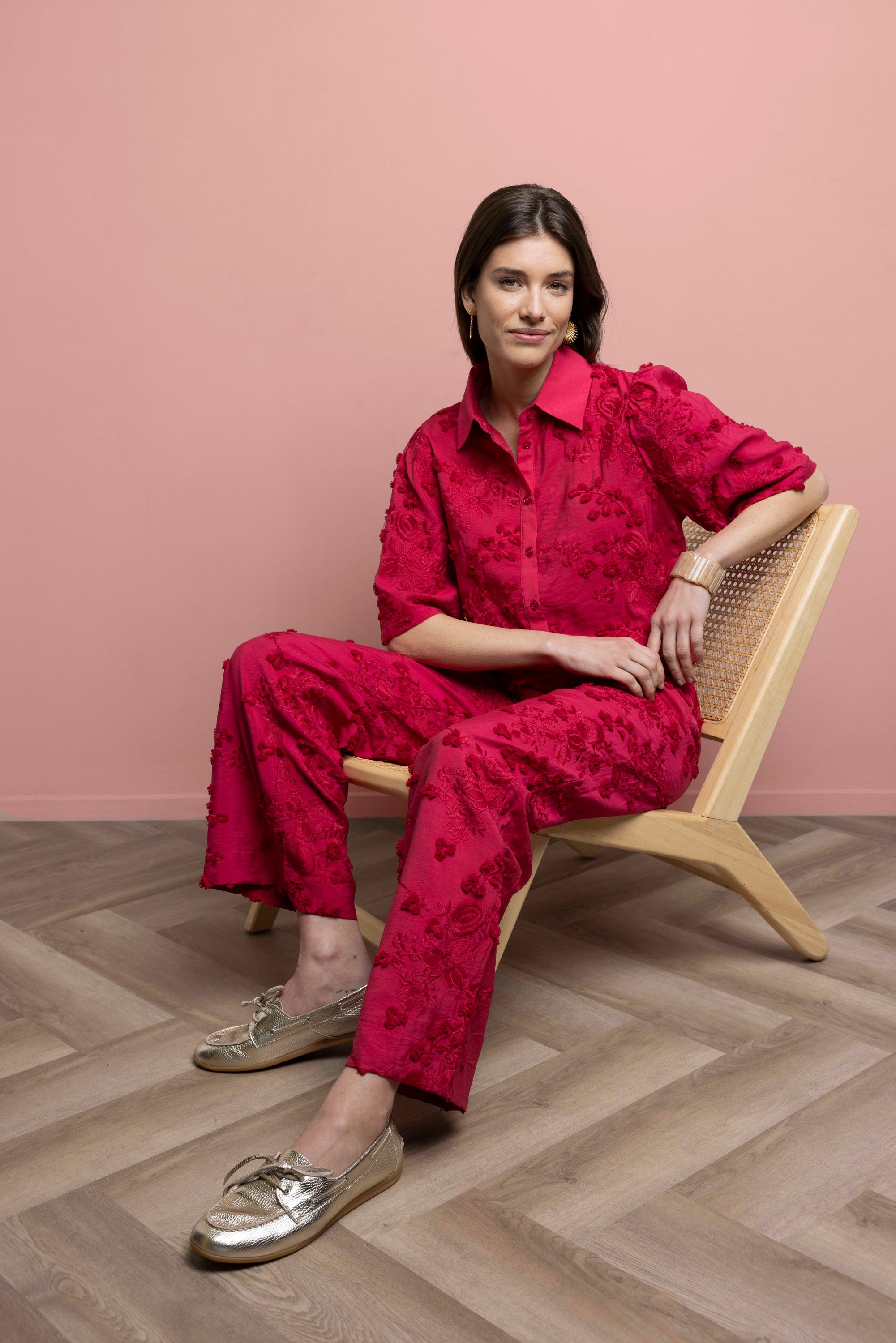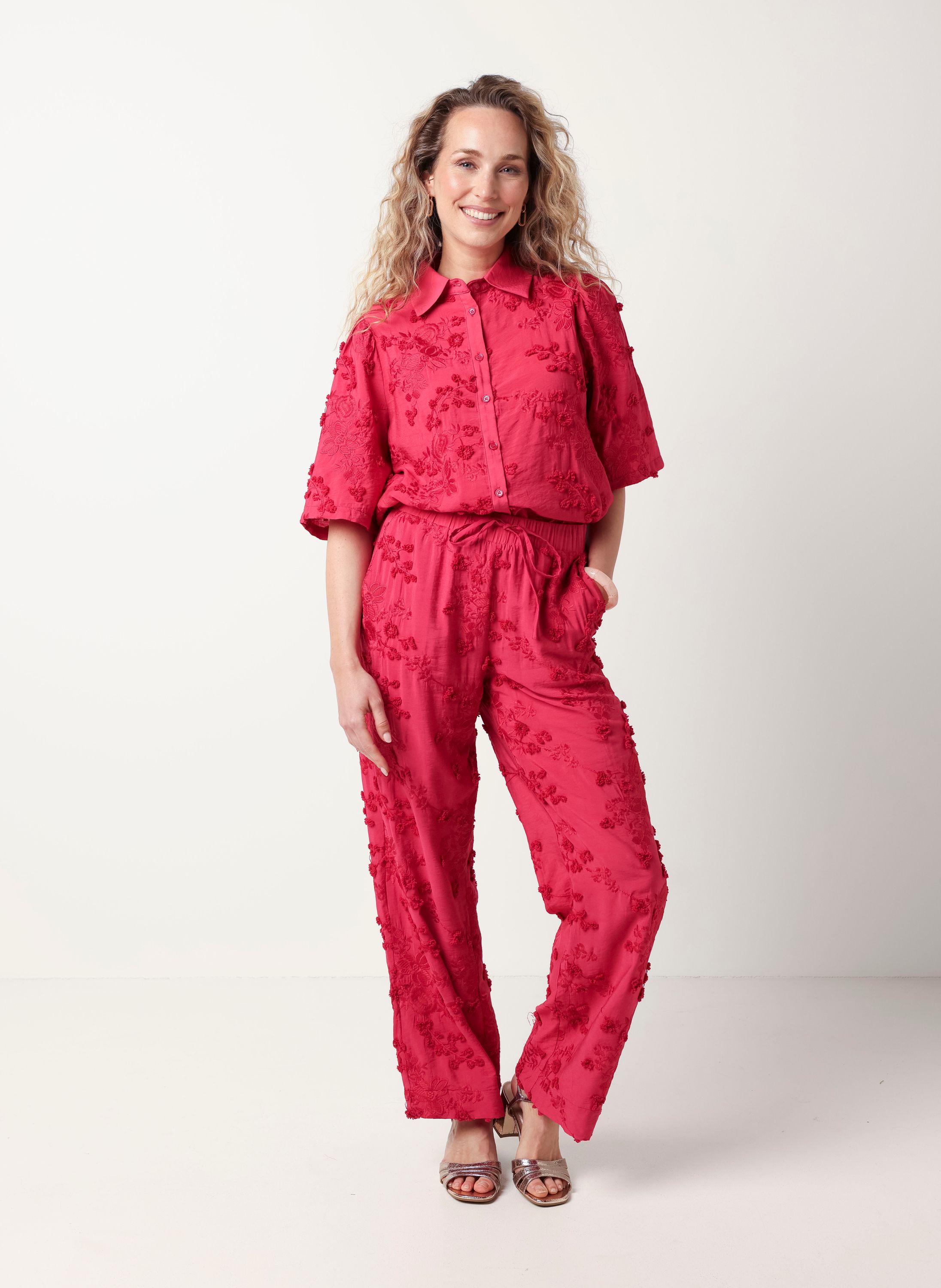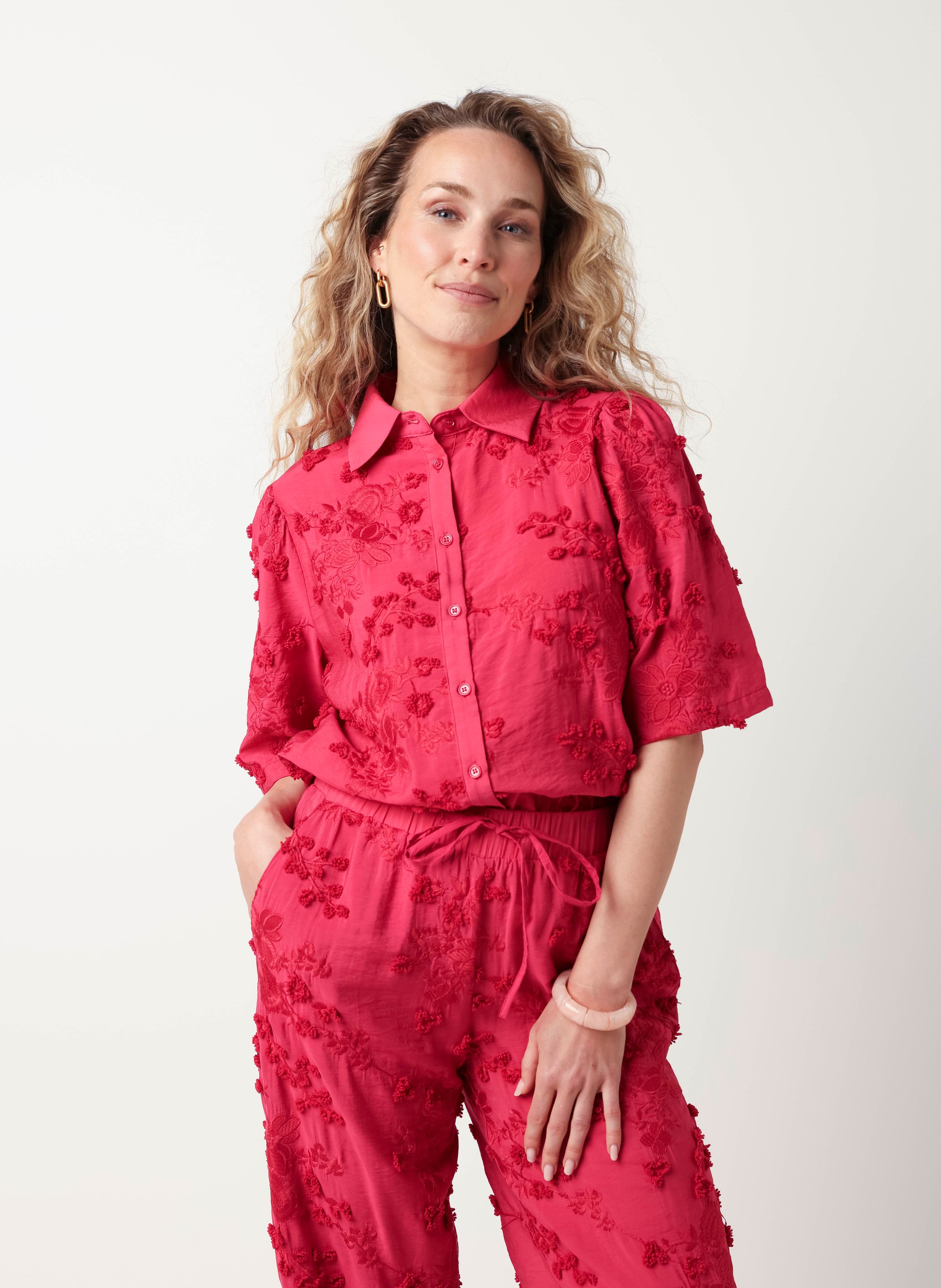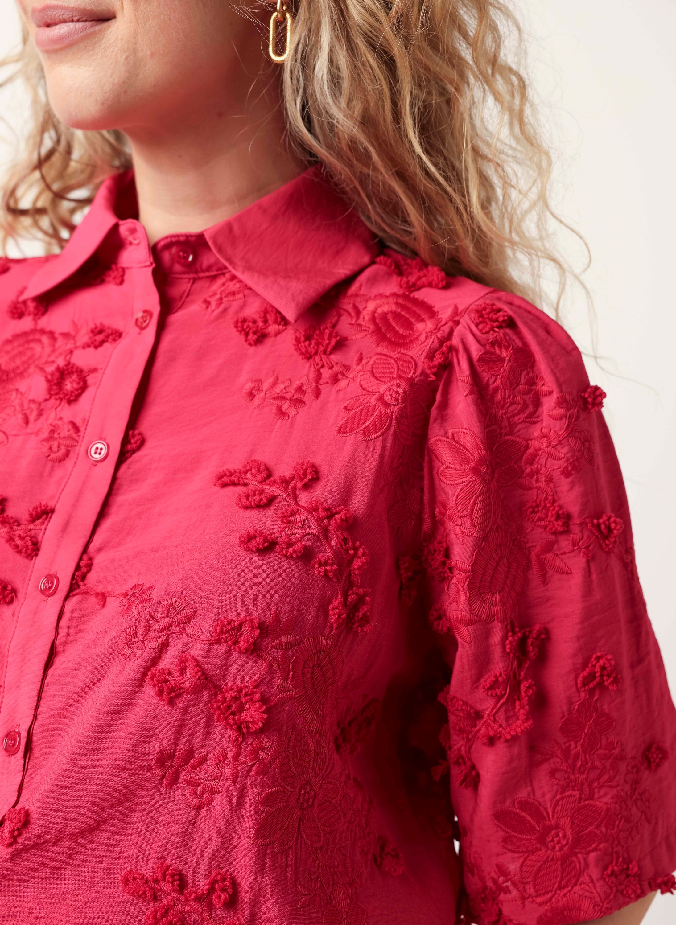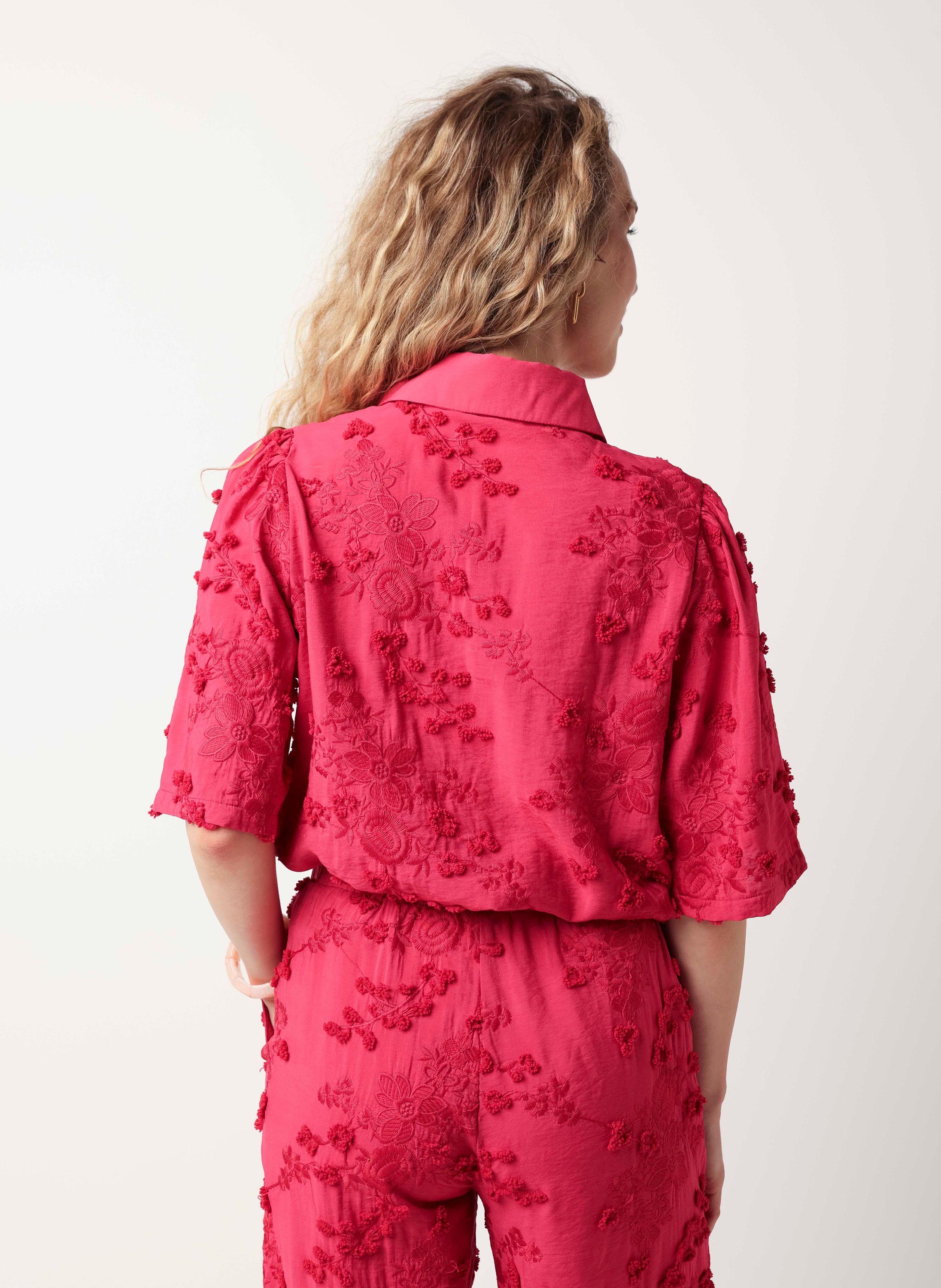 Deze blouse met klassieke kraag heeft halflange mouwen, een knoopsluiting en geborduurde bloemen over de gehele blouse. Deze blouse is onderdeel van een co-ord set.