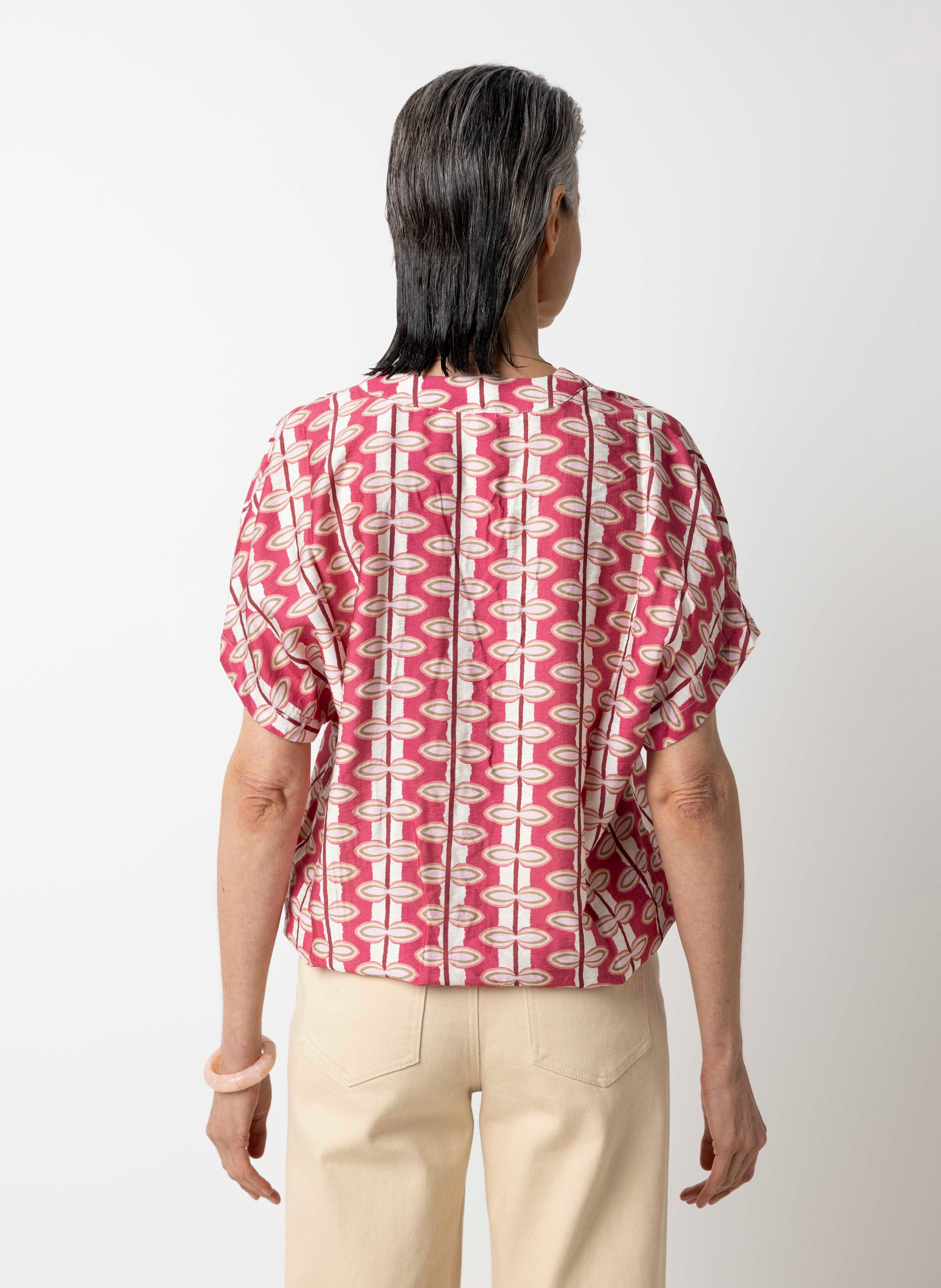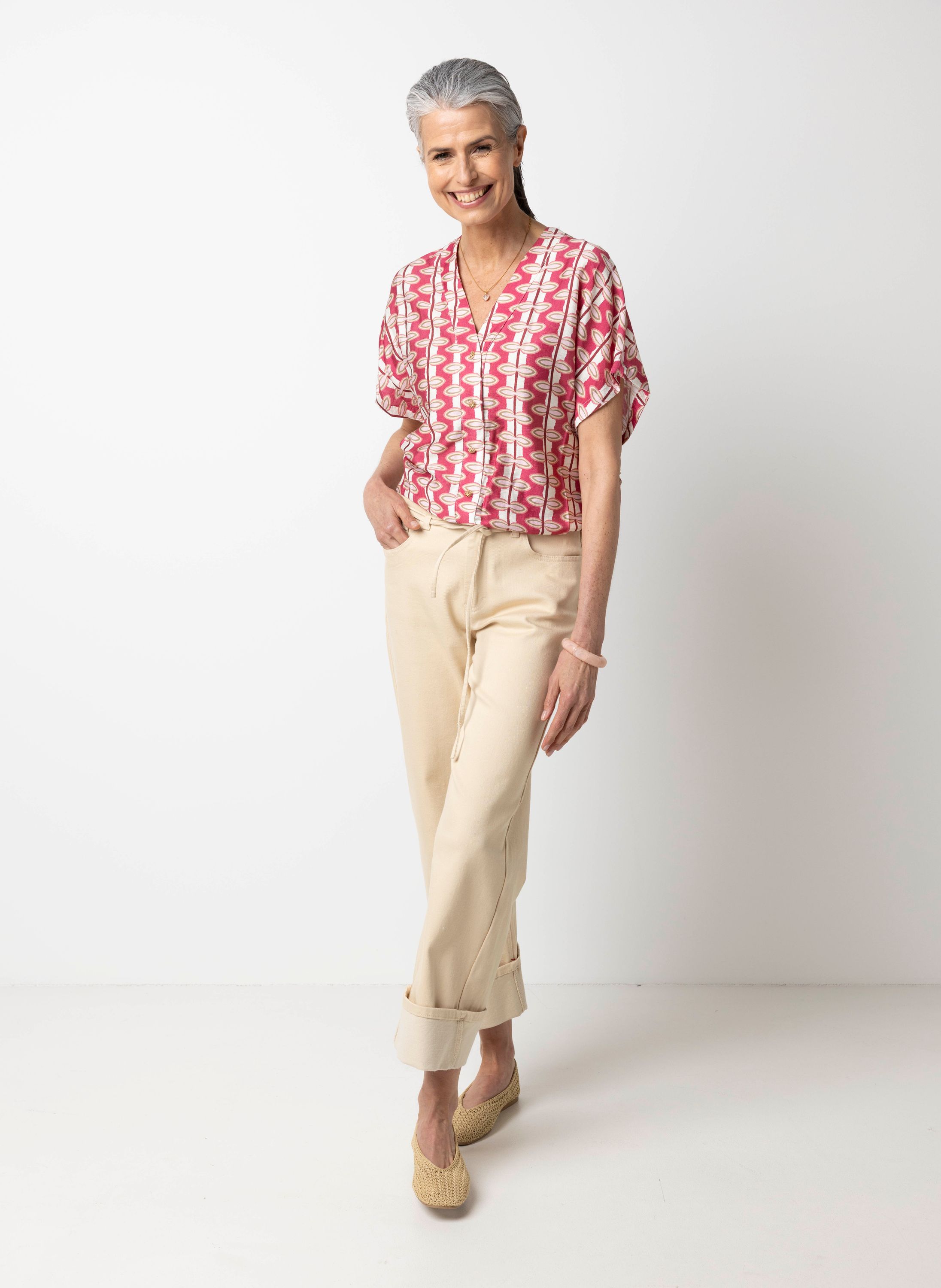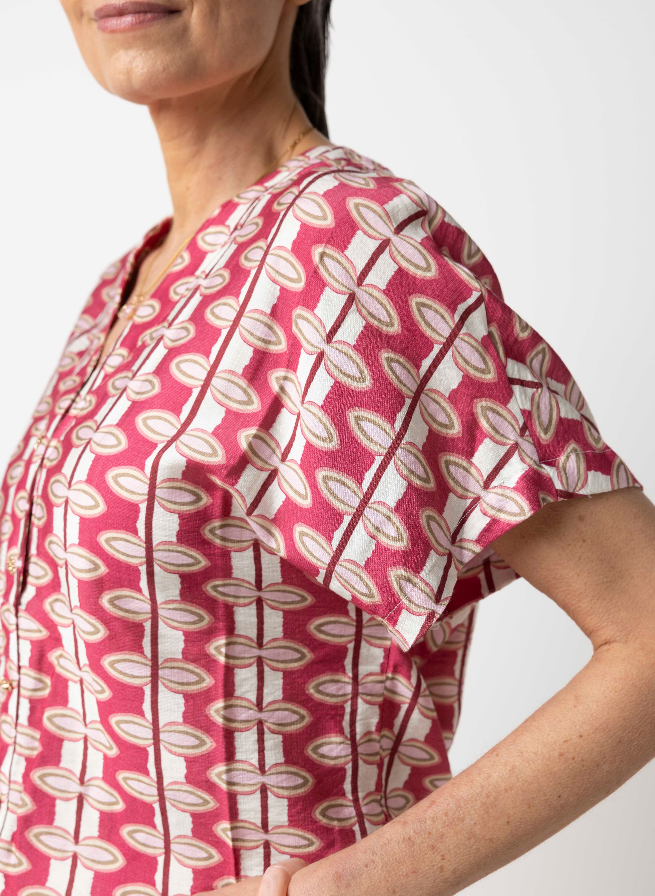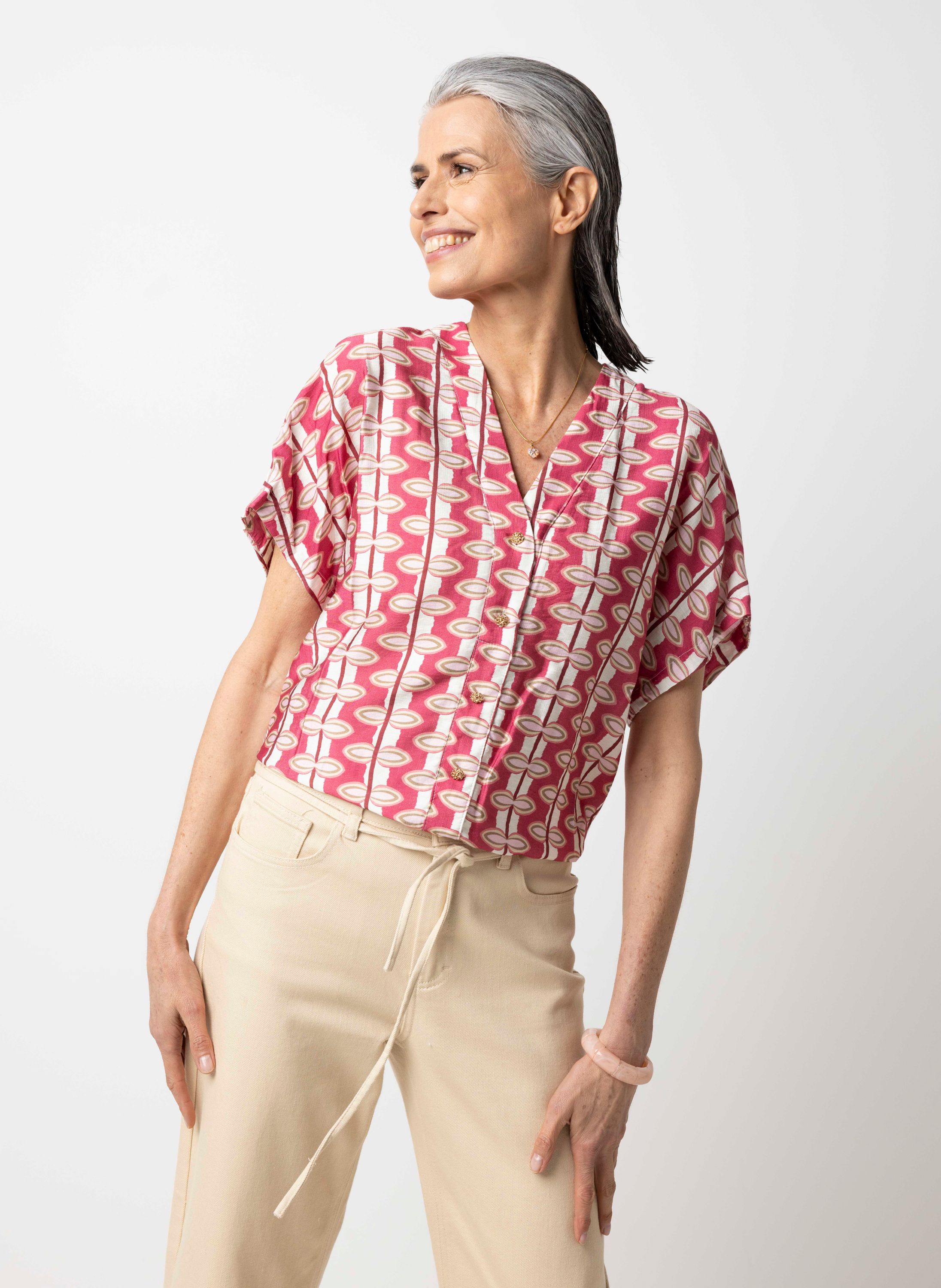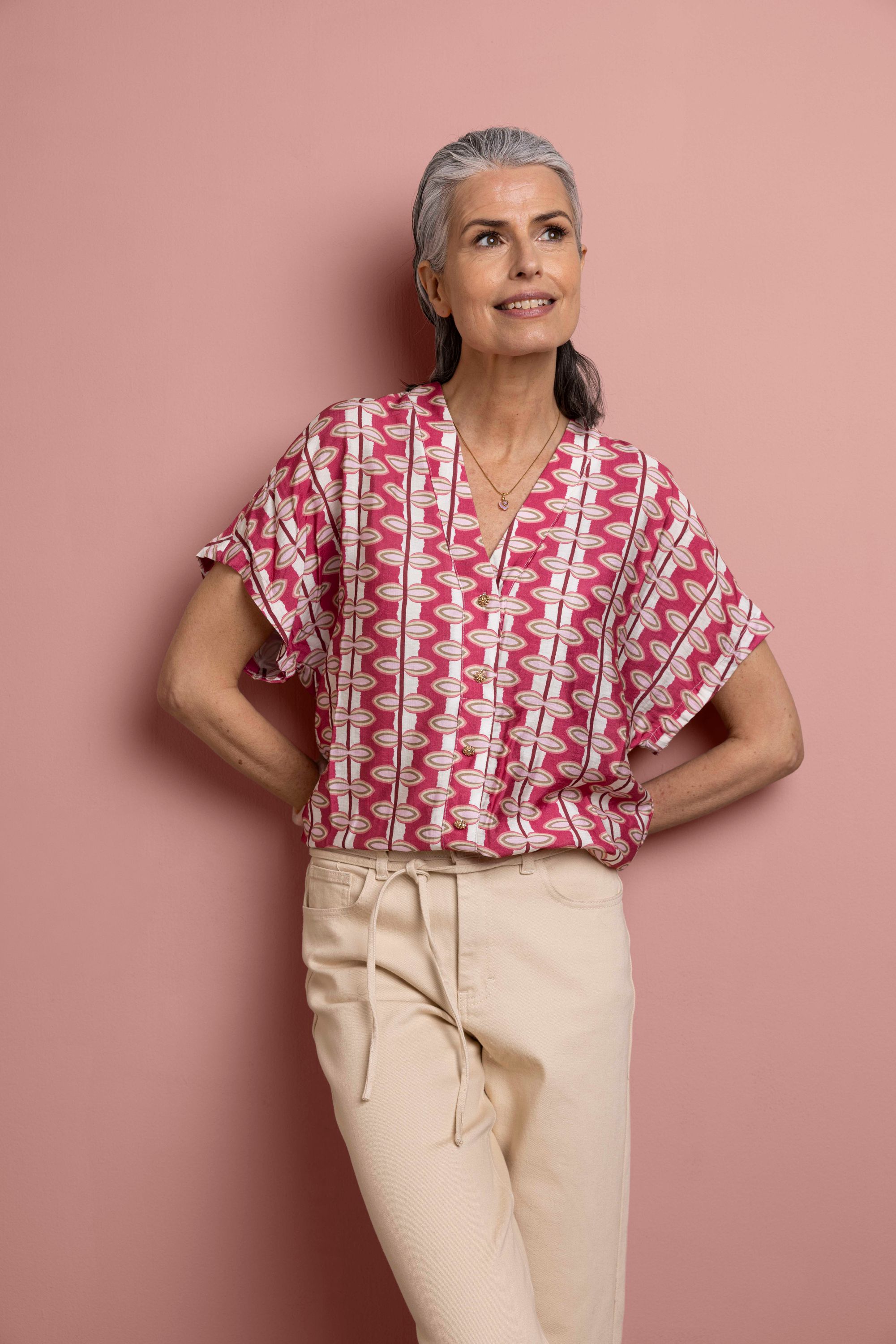 Deze blouse met V-hals en aangeknipte korte mouwen is afgewerkt met een goudkleurige knoopsluiting voor een elegante touch.