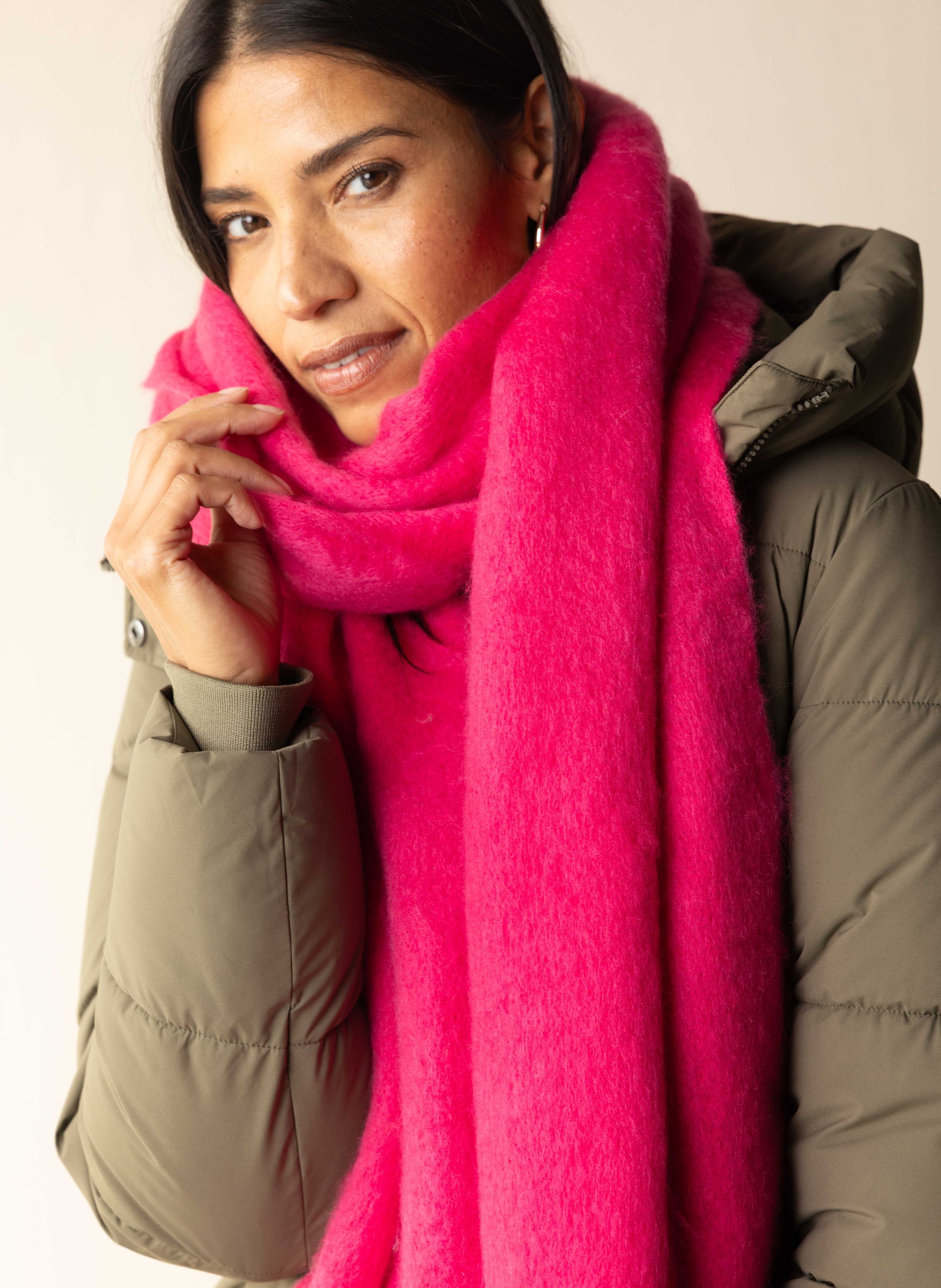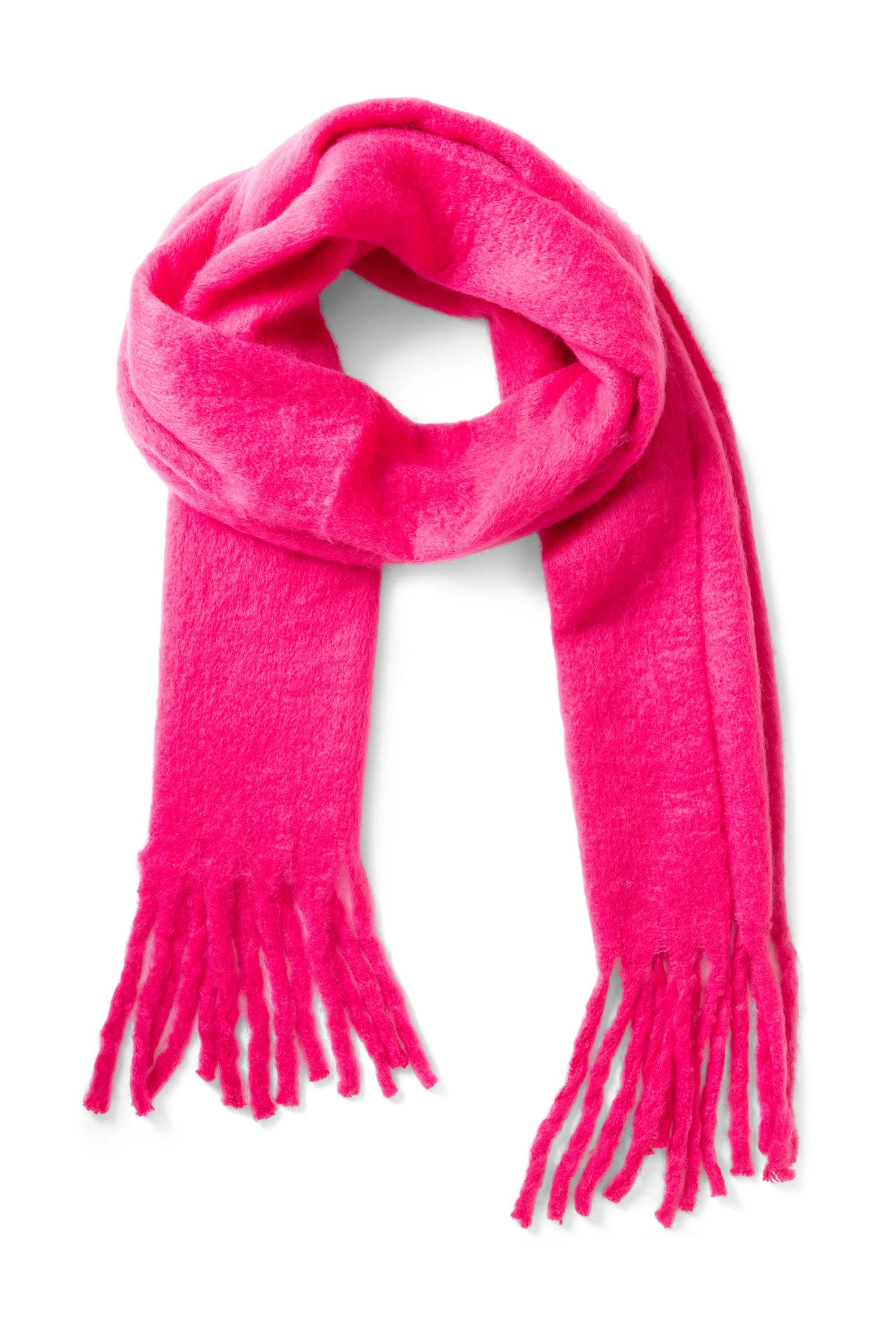 Deze gebreide zachte sjaal met franjes is een warm laagje voor frisse dagen.