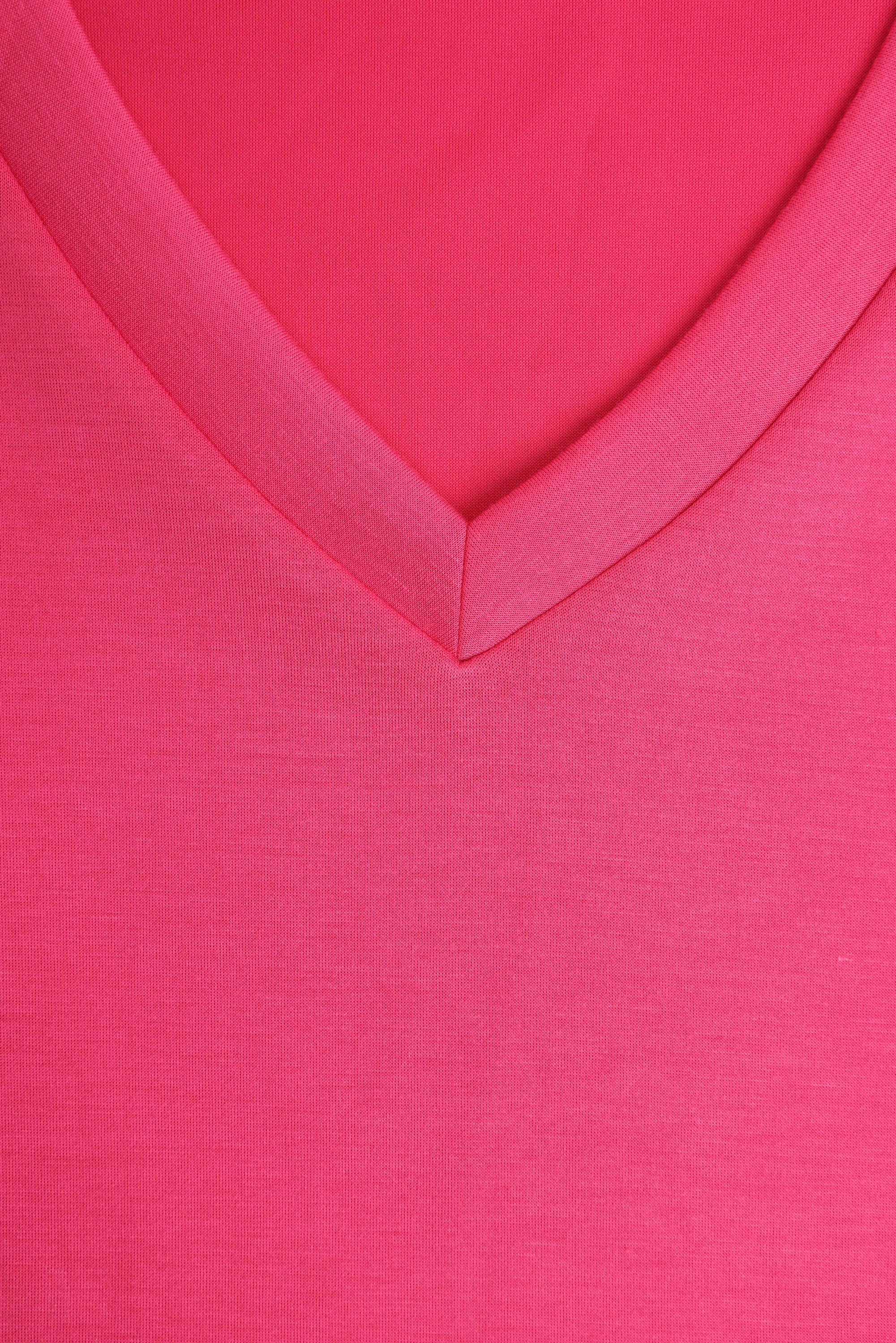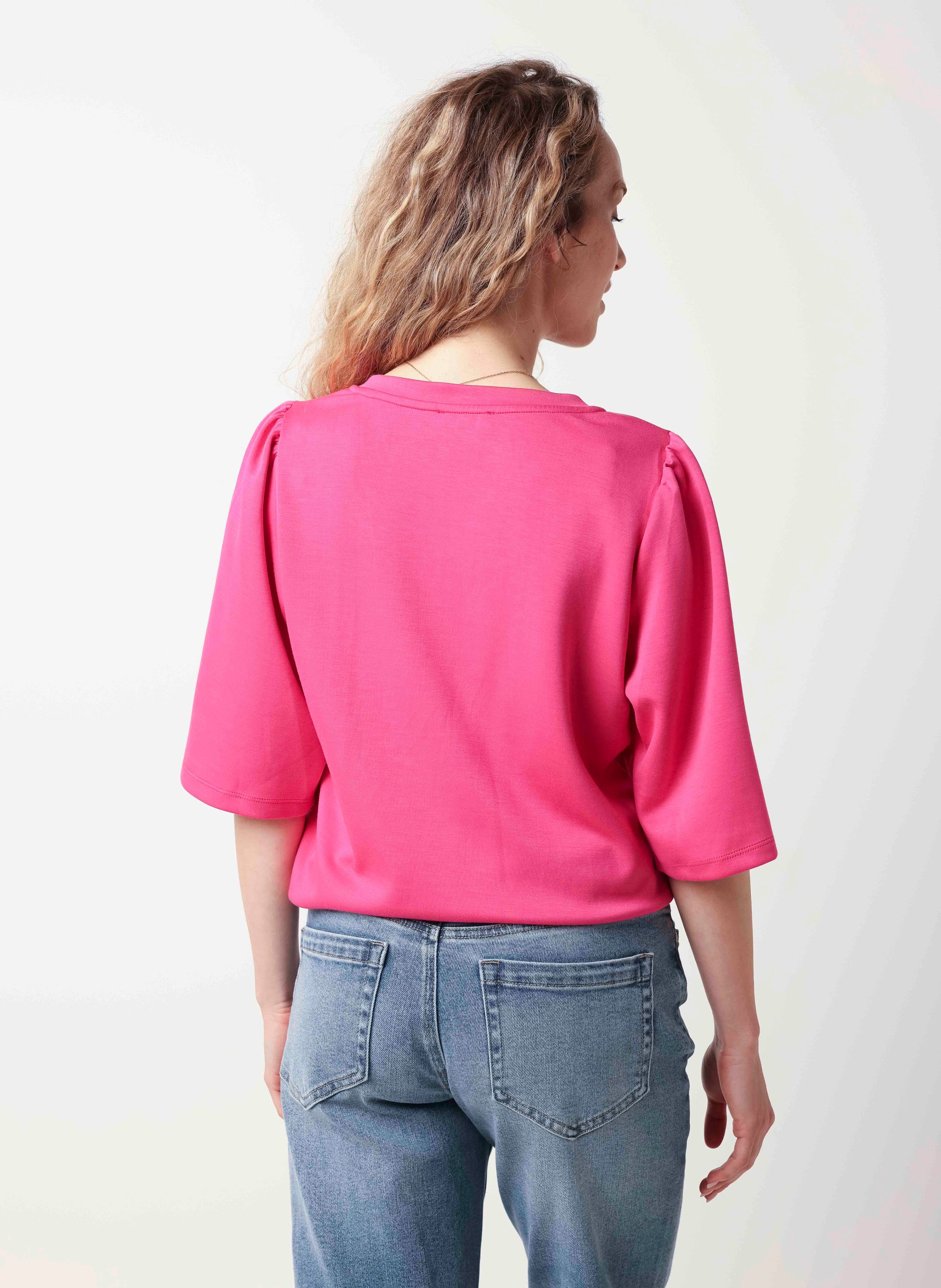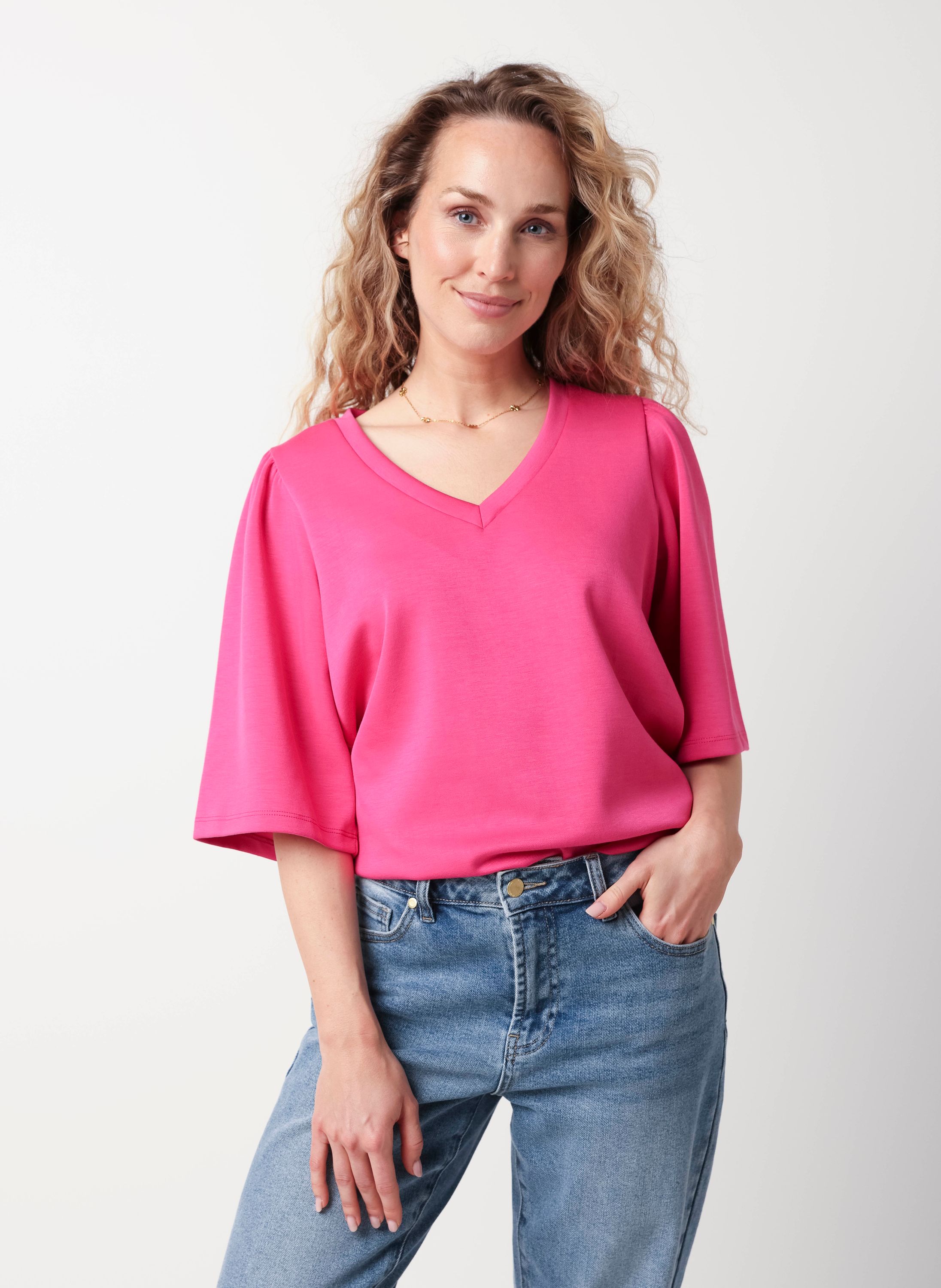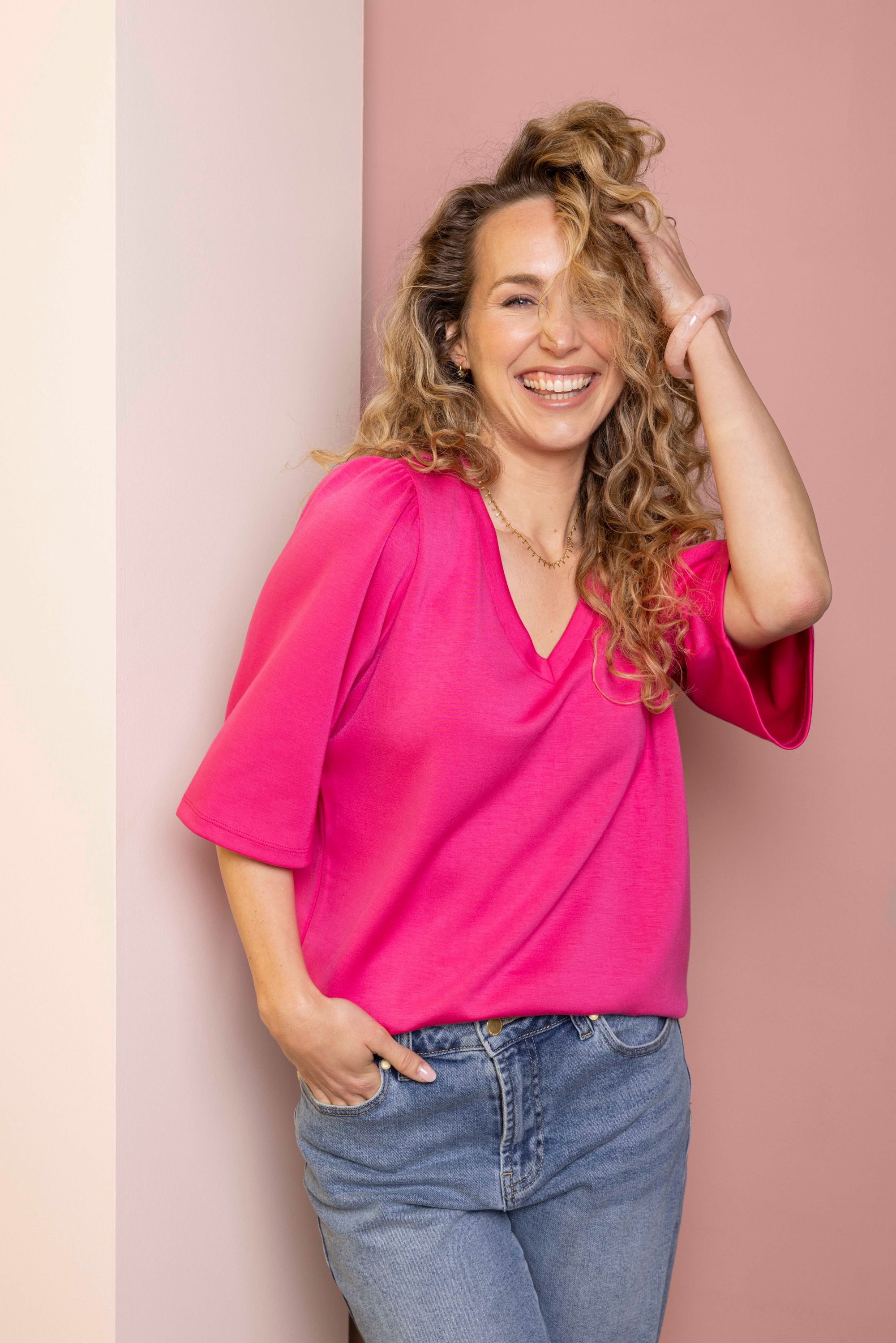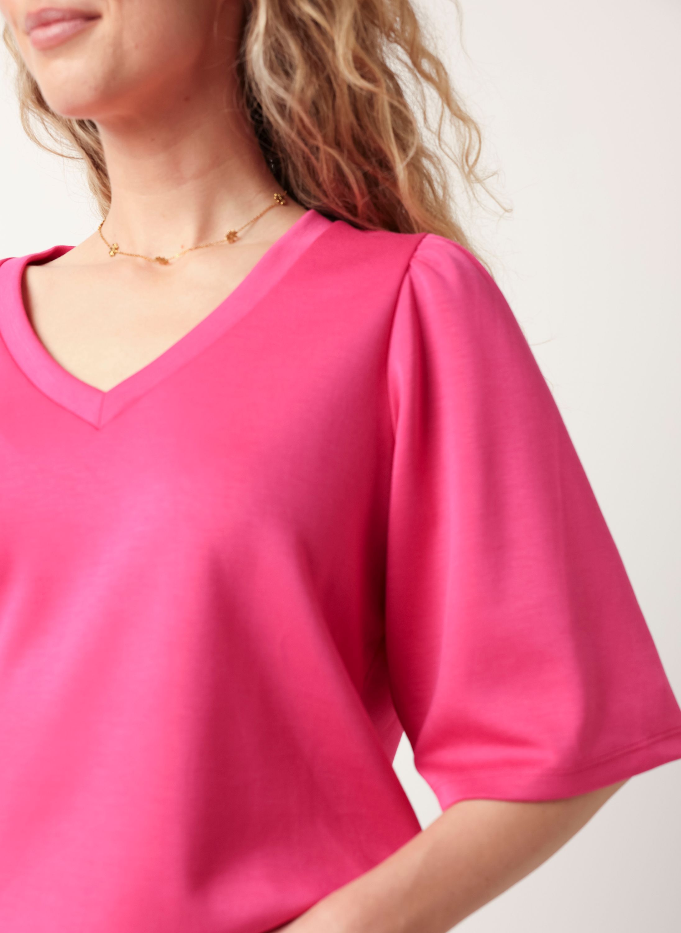Dit shirt met V-hals heeft korte pofmouwen voor een vrouwelijke look.