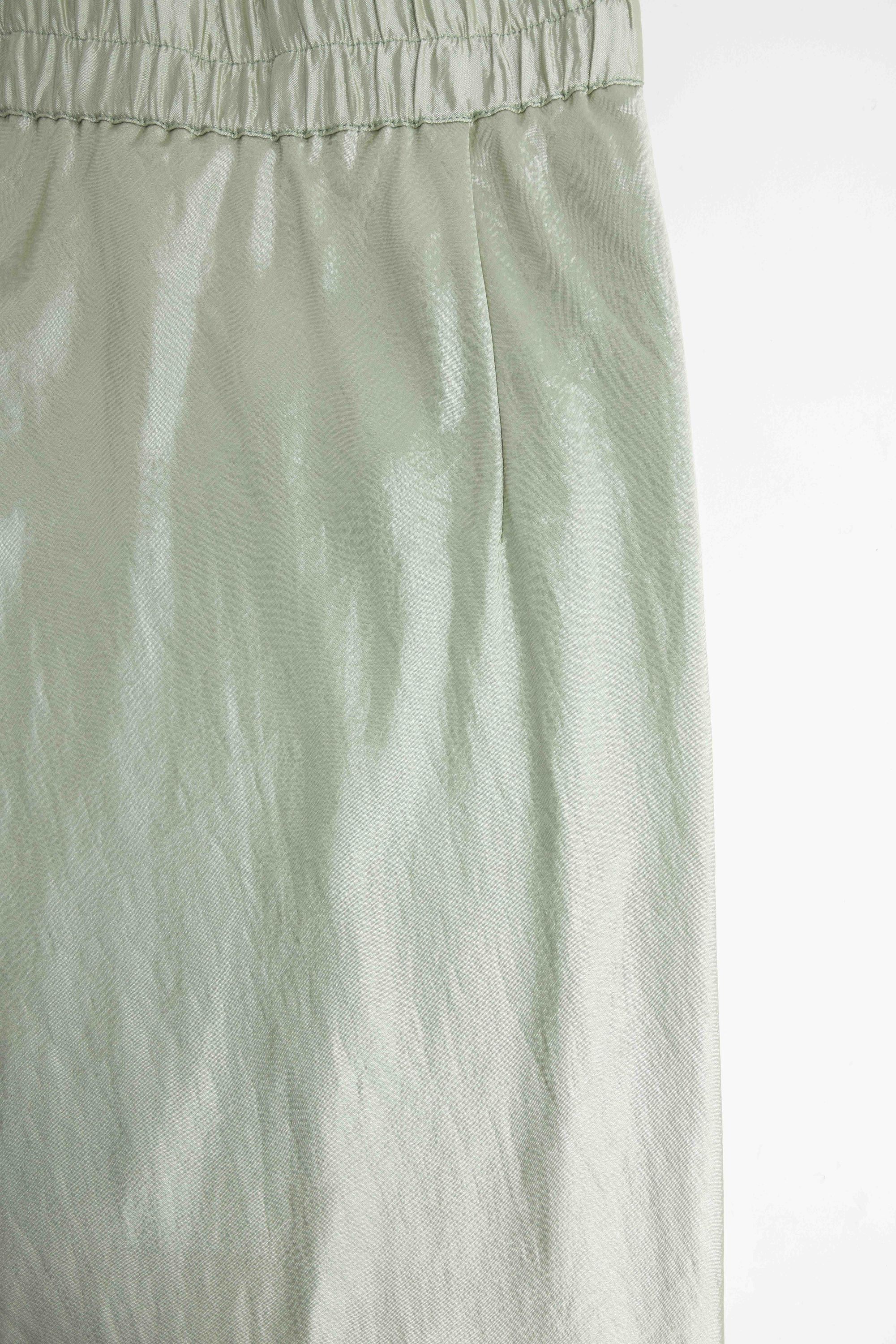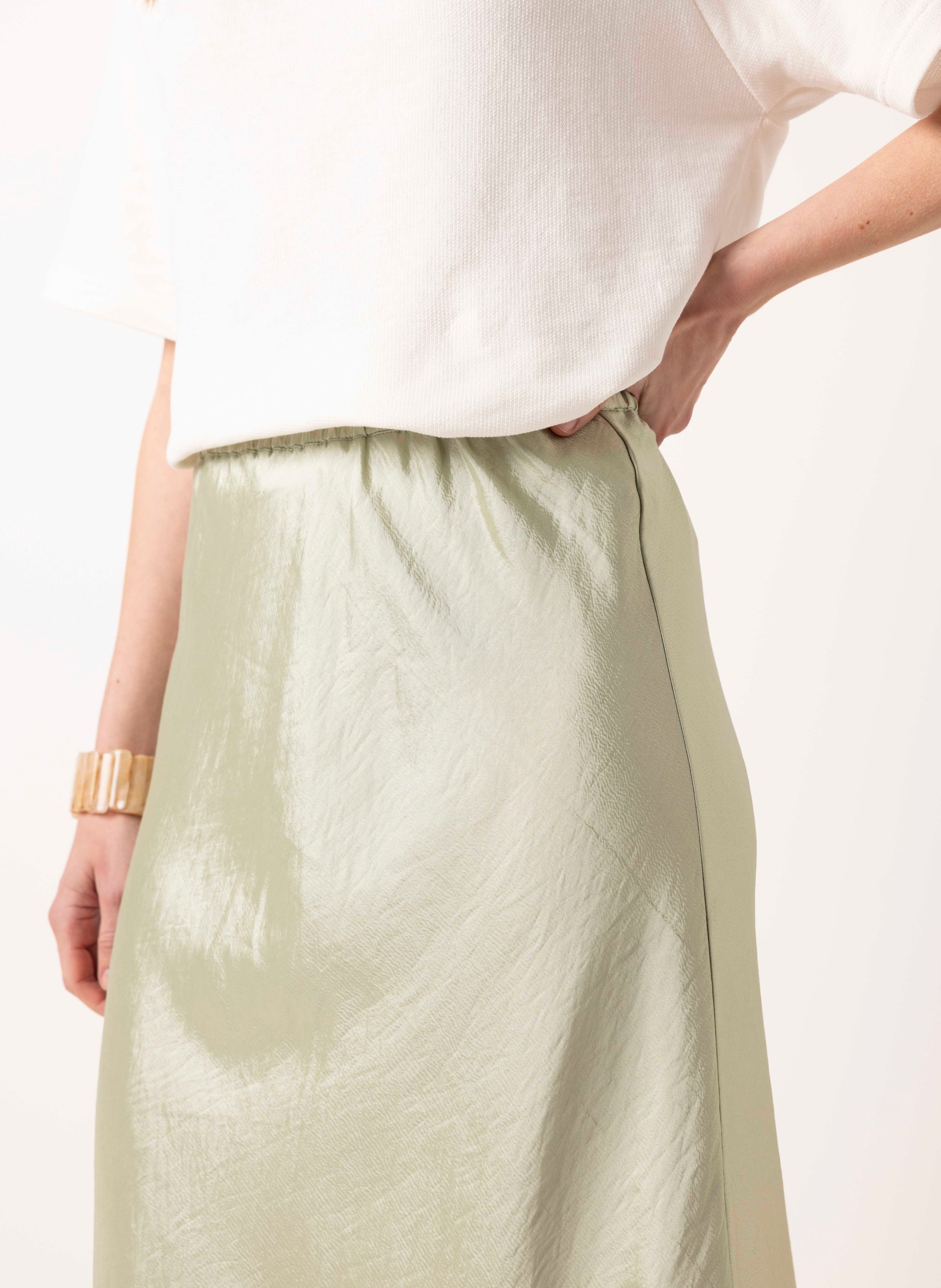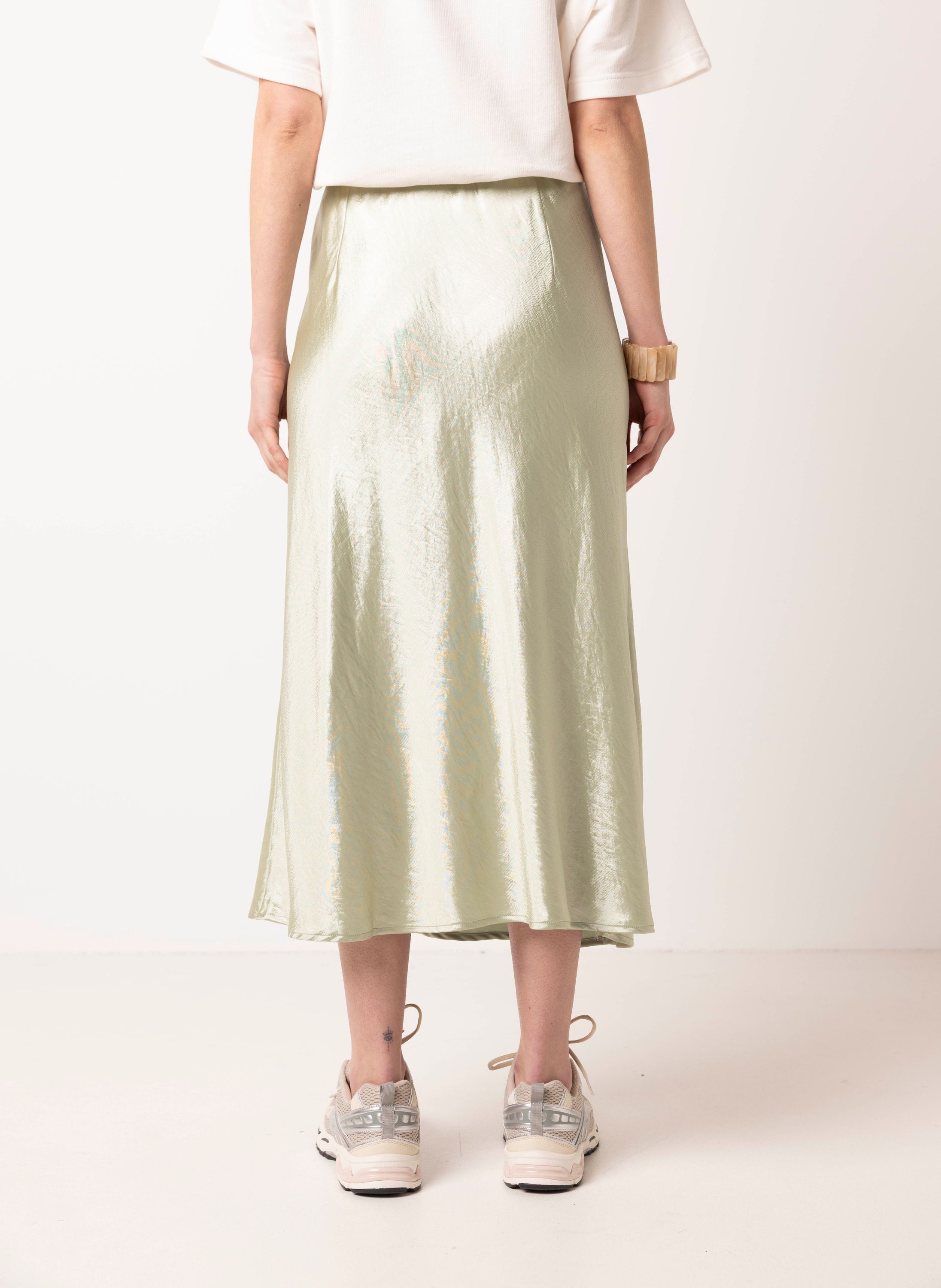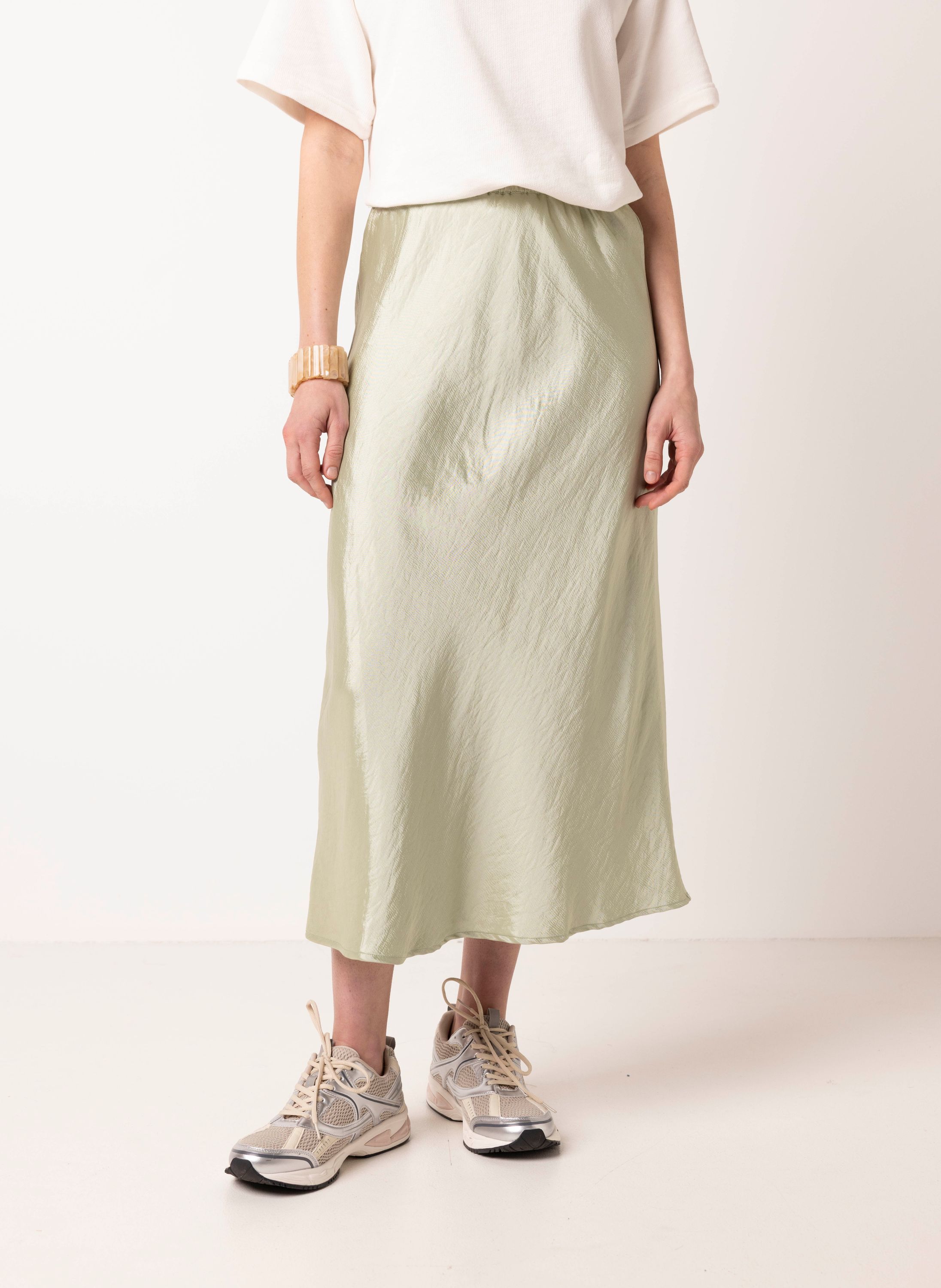 Deze satijnen midi rok met elastische tailleband heeft een soepele en elegante uitstraling. Let op: deze rok valt één maat kleiner. We adviseren je een maat groter te nemen.
