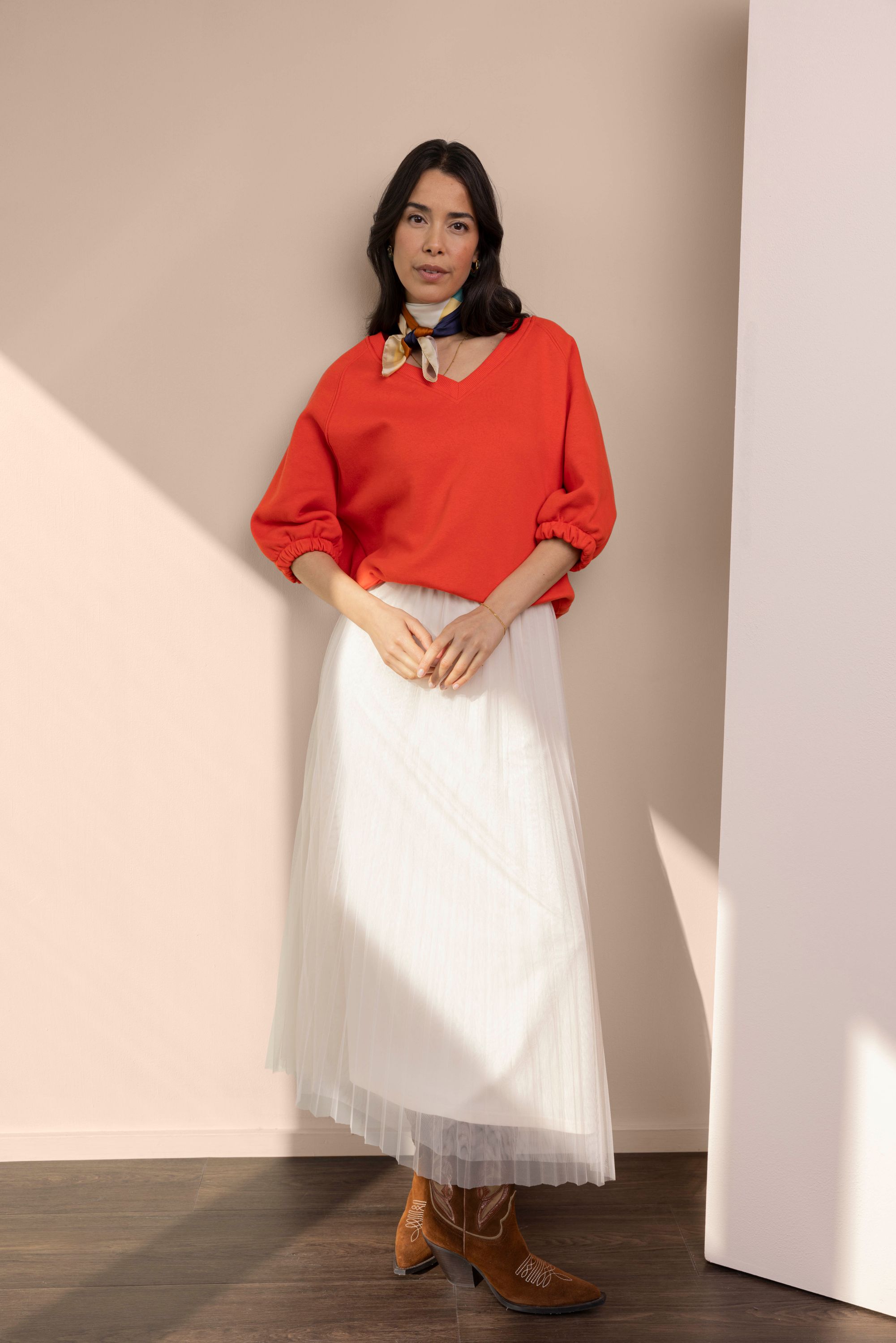 Deze glanzende sjaal is een veelzijdig accessoire dat je op verschillende manieren kunt stylen.