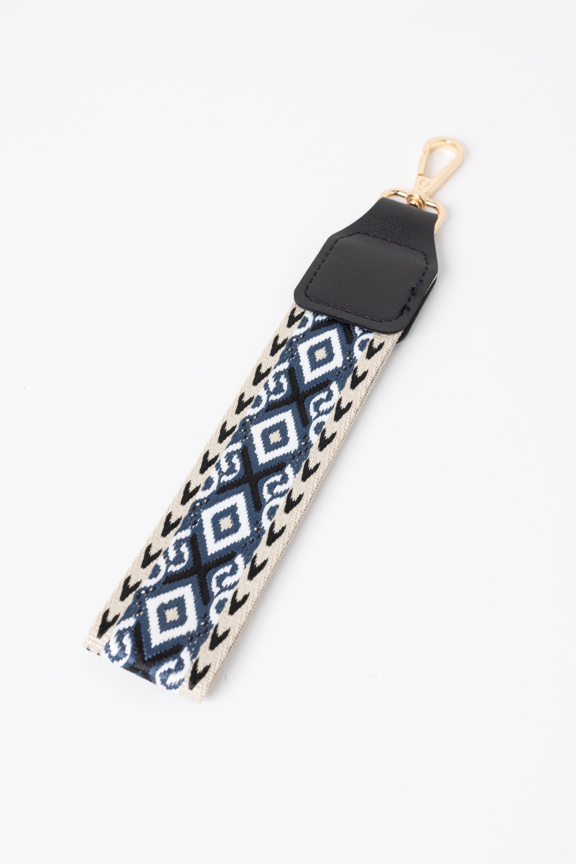 Blauwe hanger met goudkleurige sluiting. De sleutelhanger is 18 centimeter lang en 3,5 centimeter breed.