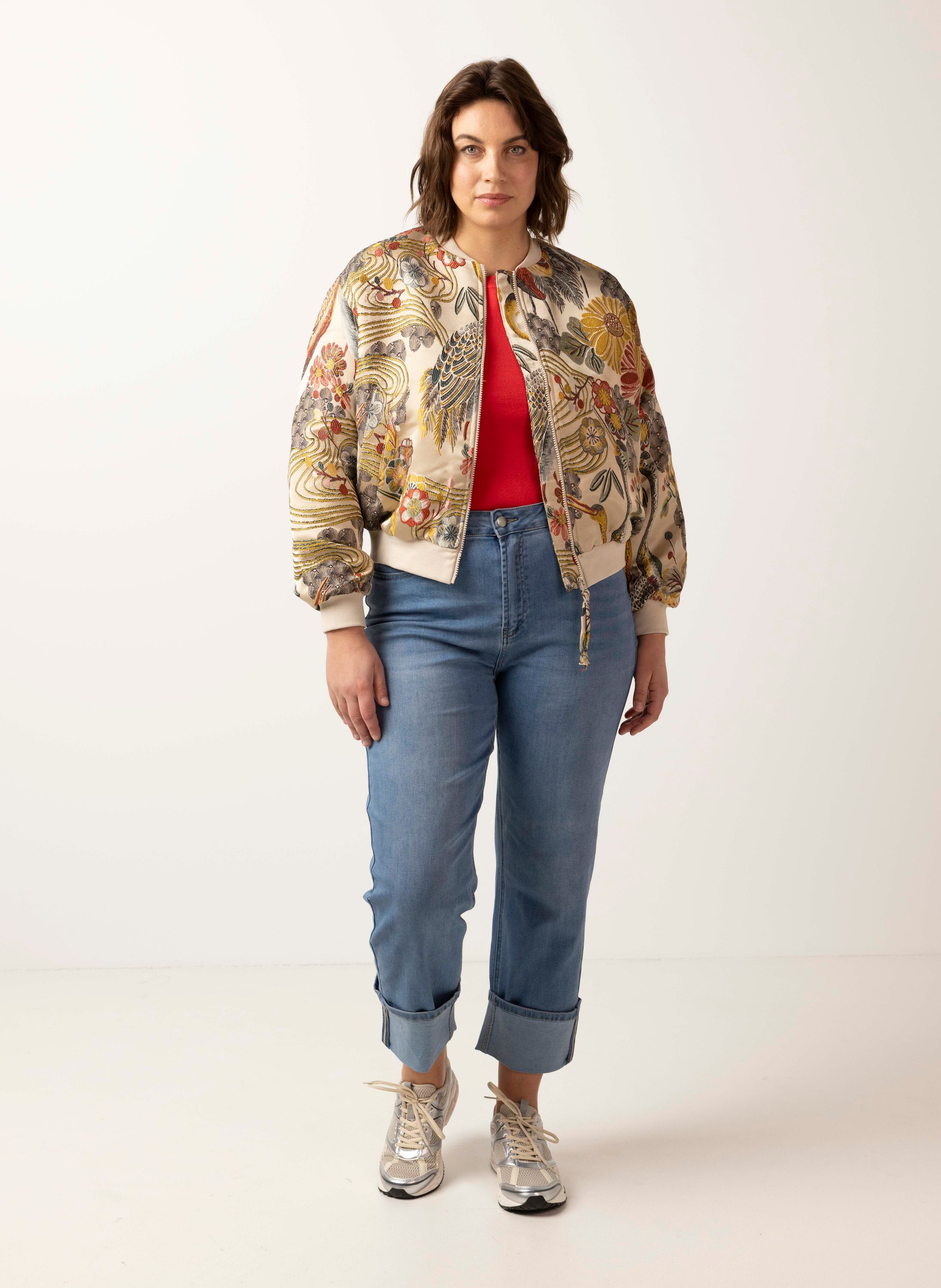 Deze high waist straight fit jeans heeft een rits- en knoopsluiting en een vastgestikte omslag aan de onderzijde van de broekspijpen.