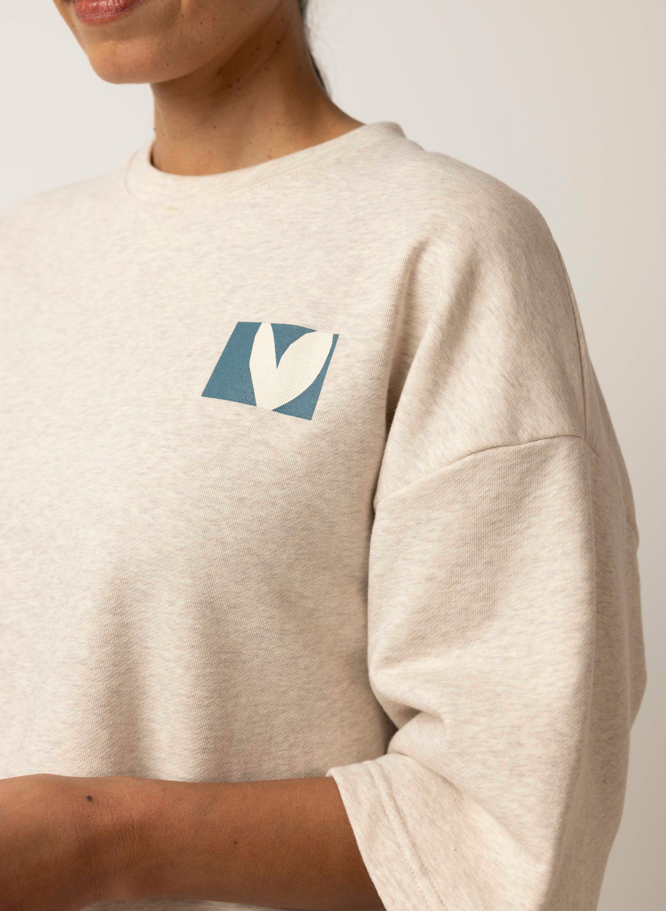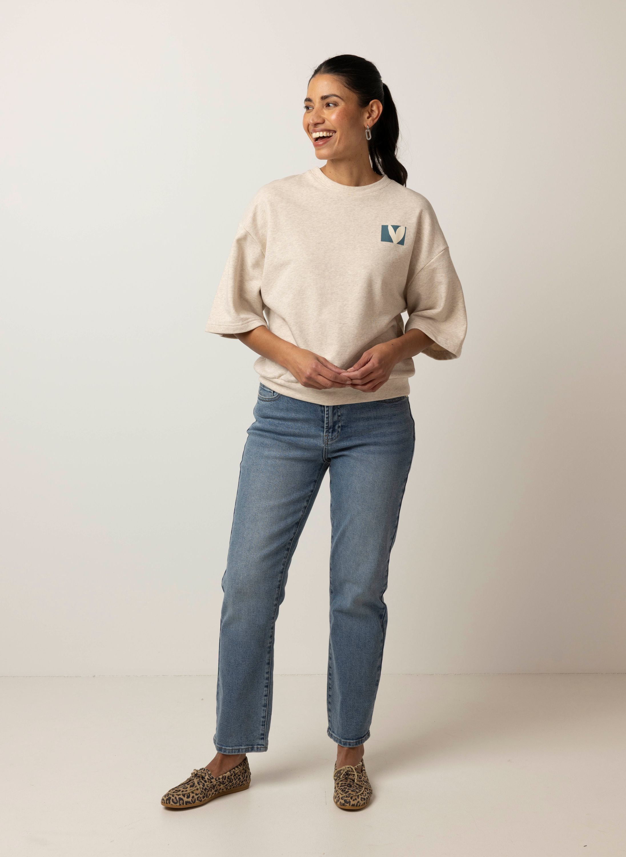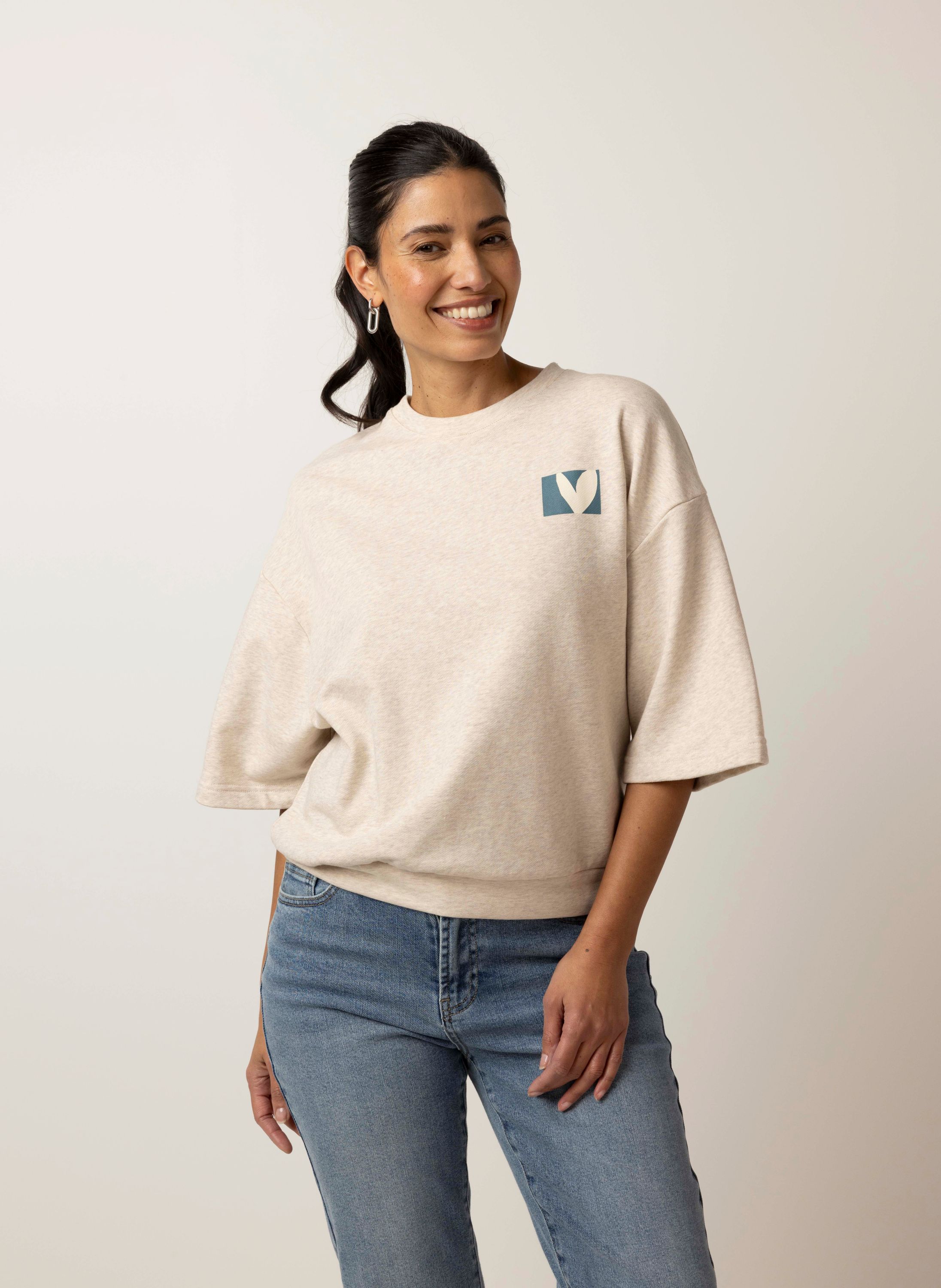 Deze sweater met ronde hals heeft halflange mouwen en een comfortabele fit.