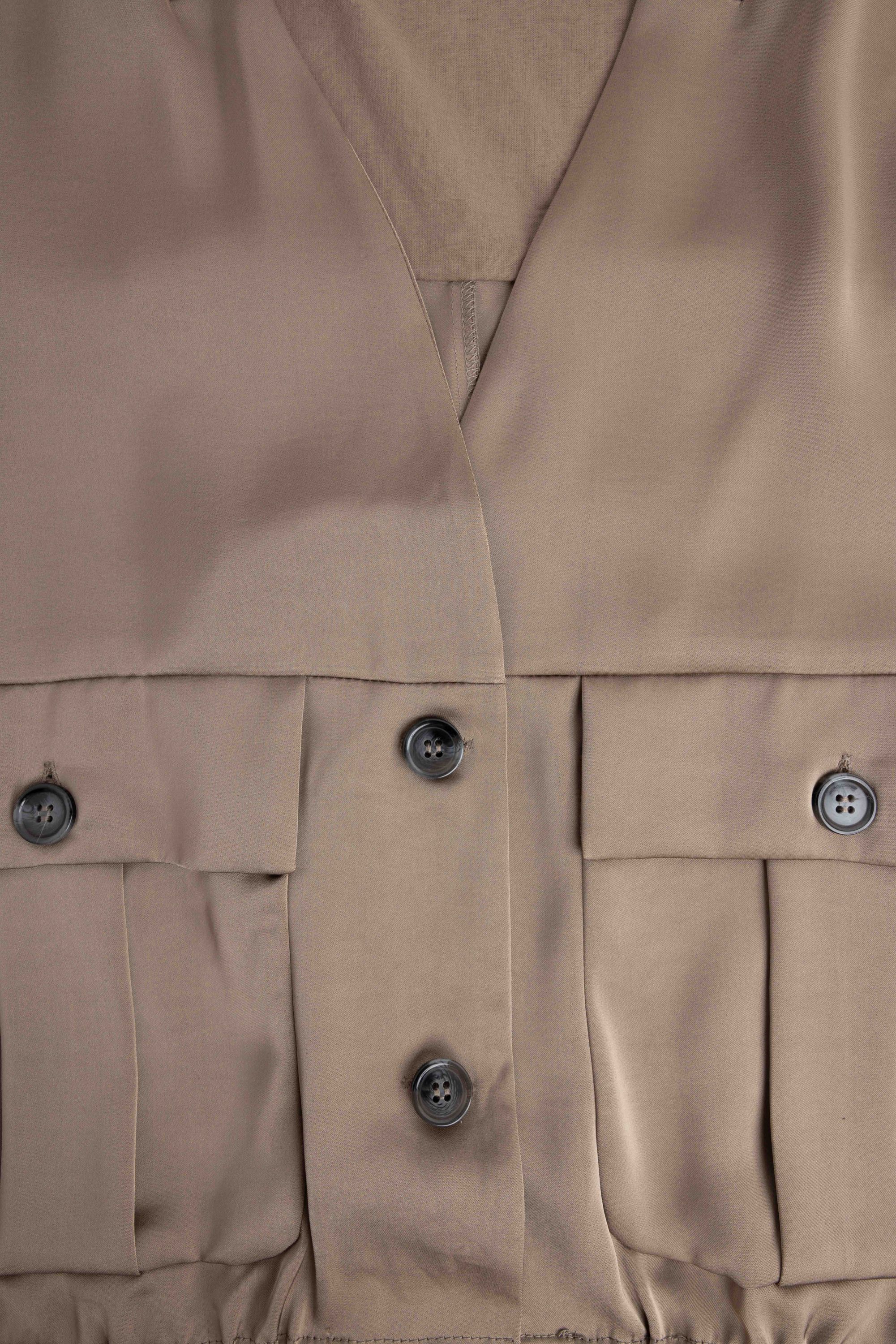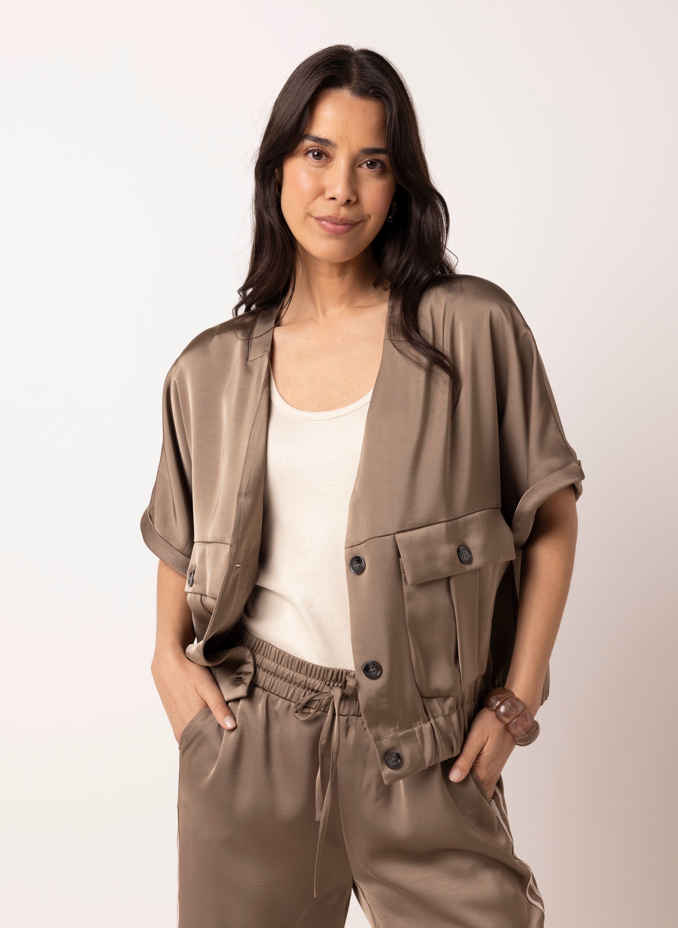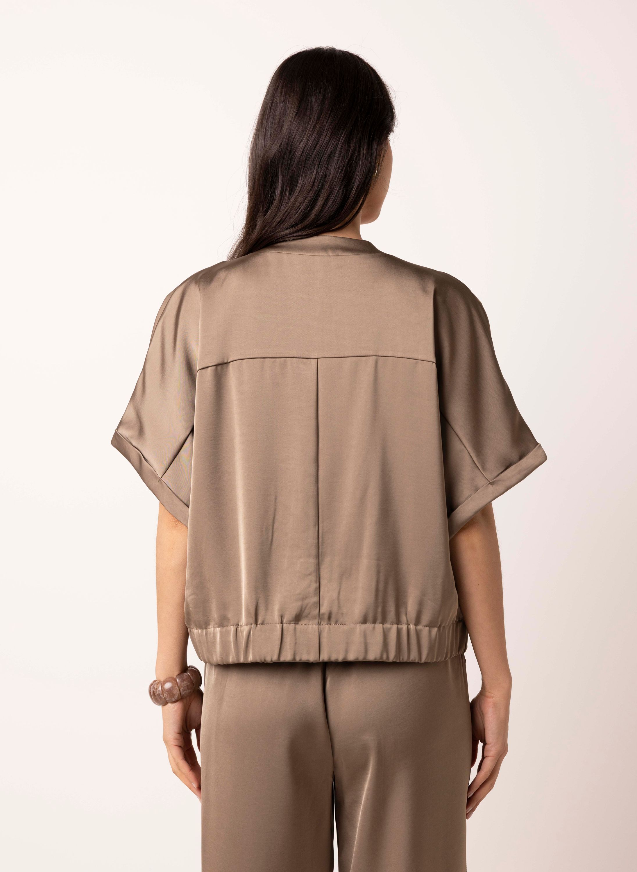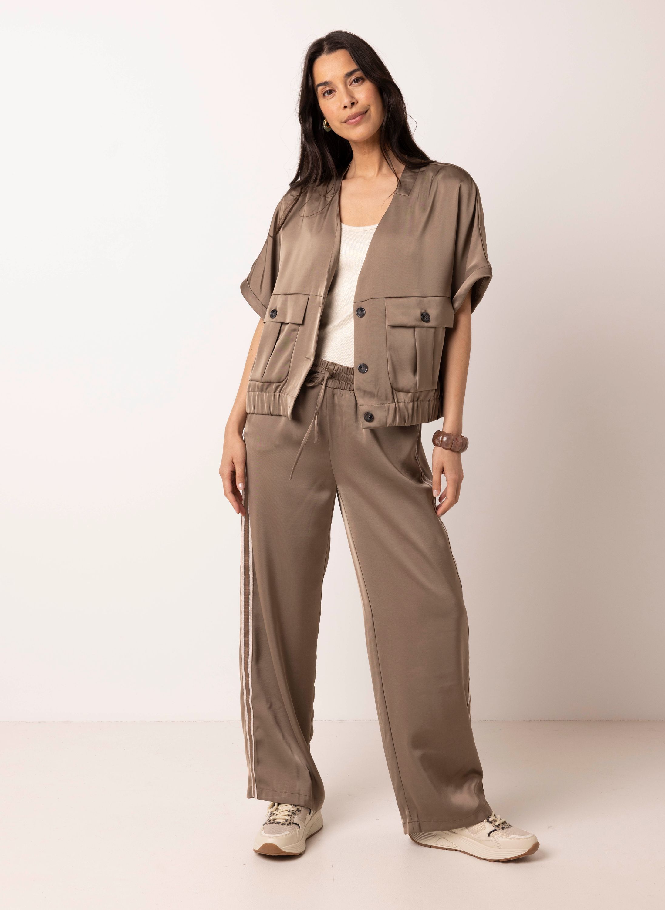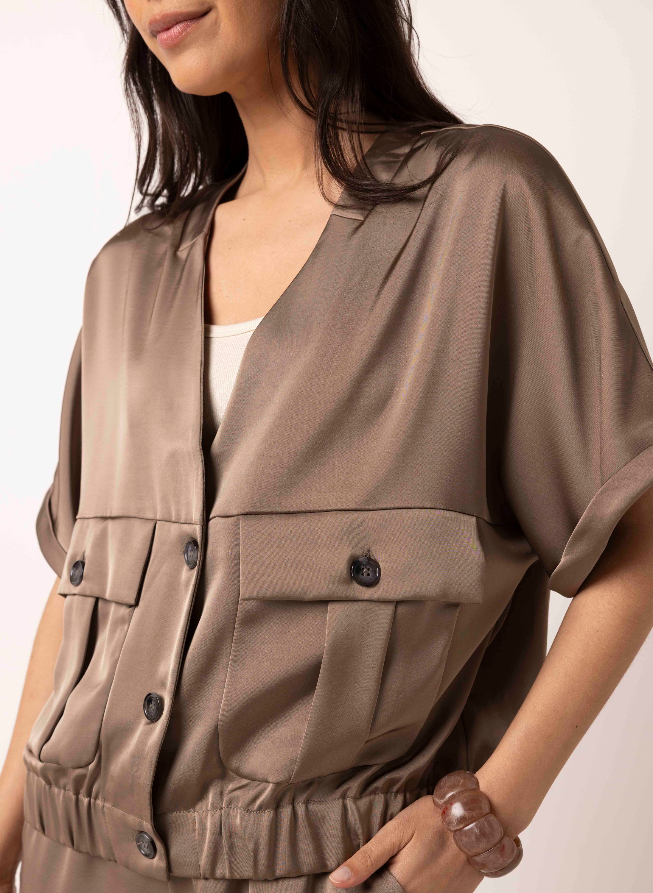 Dit jasje met V-hals, korte mouwen, knoopsluiting, elastische band aan de onderzijde en zakken maakt deel uit van een co-ord set.
