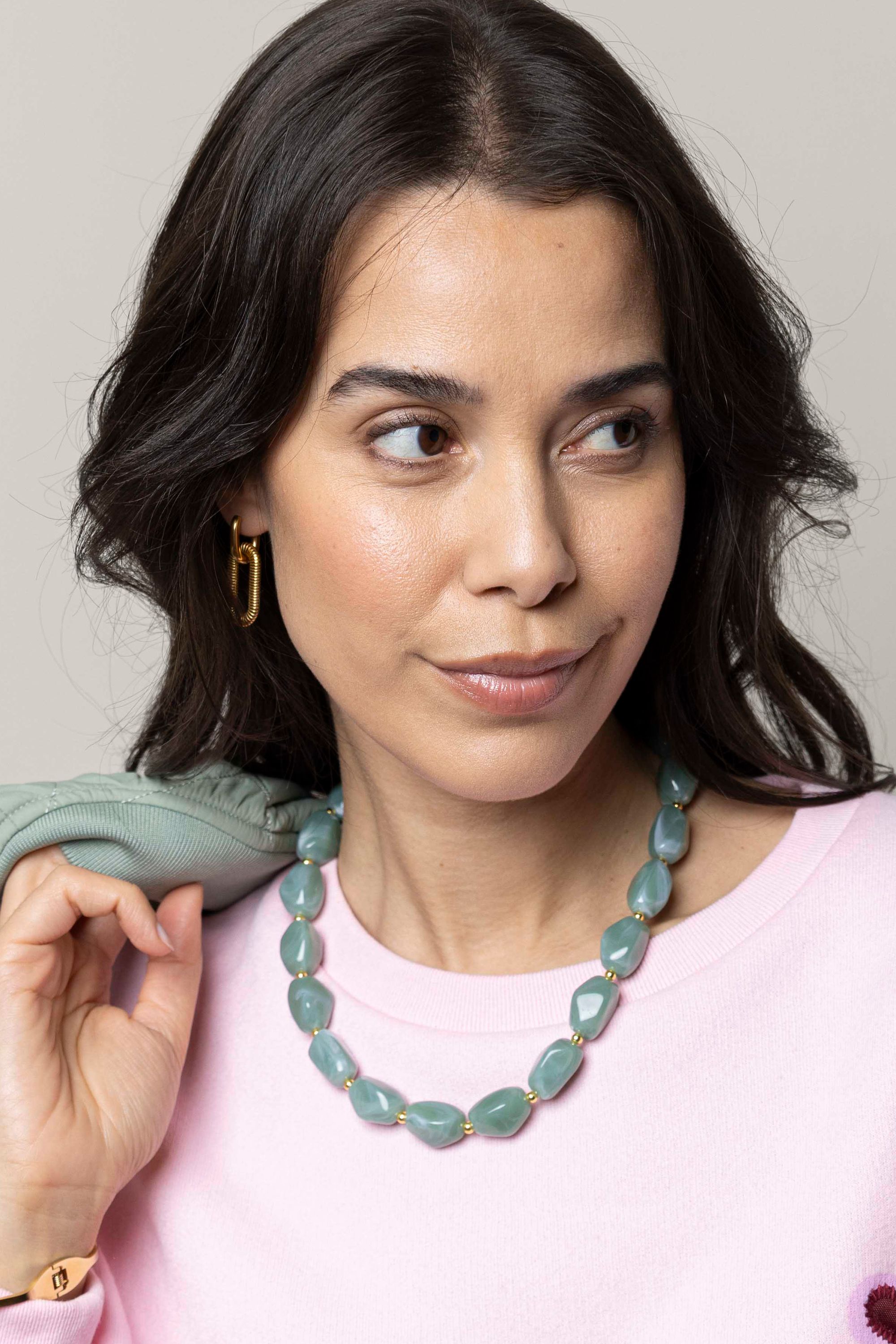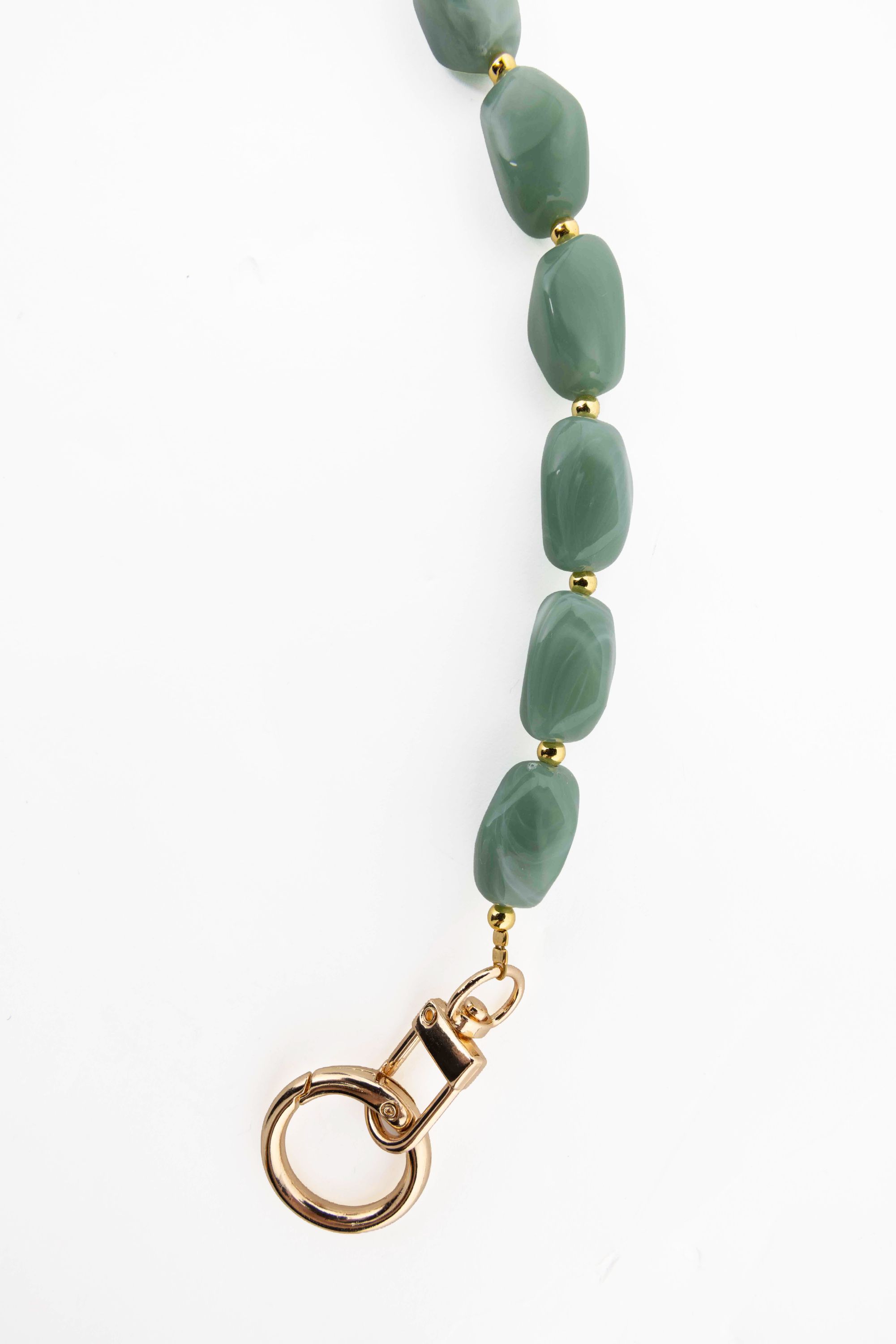 Dit telefoonkoord is gemaakt van gladde kralen in aquakleurige tinten en afgewerkt met goudkleurige details. Het koord is iets langer ontworpen zodat je het ook als ketting kunt dragen.
