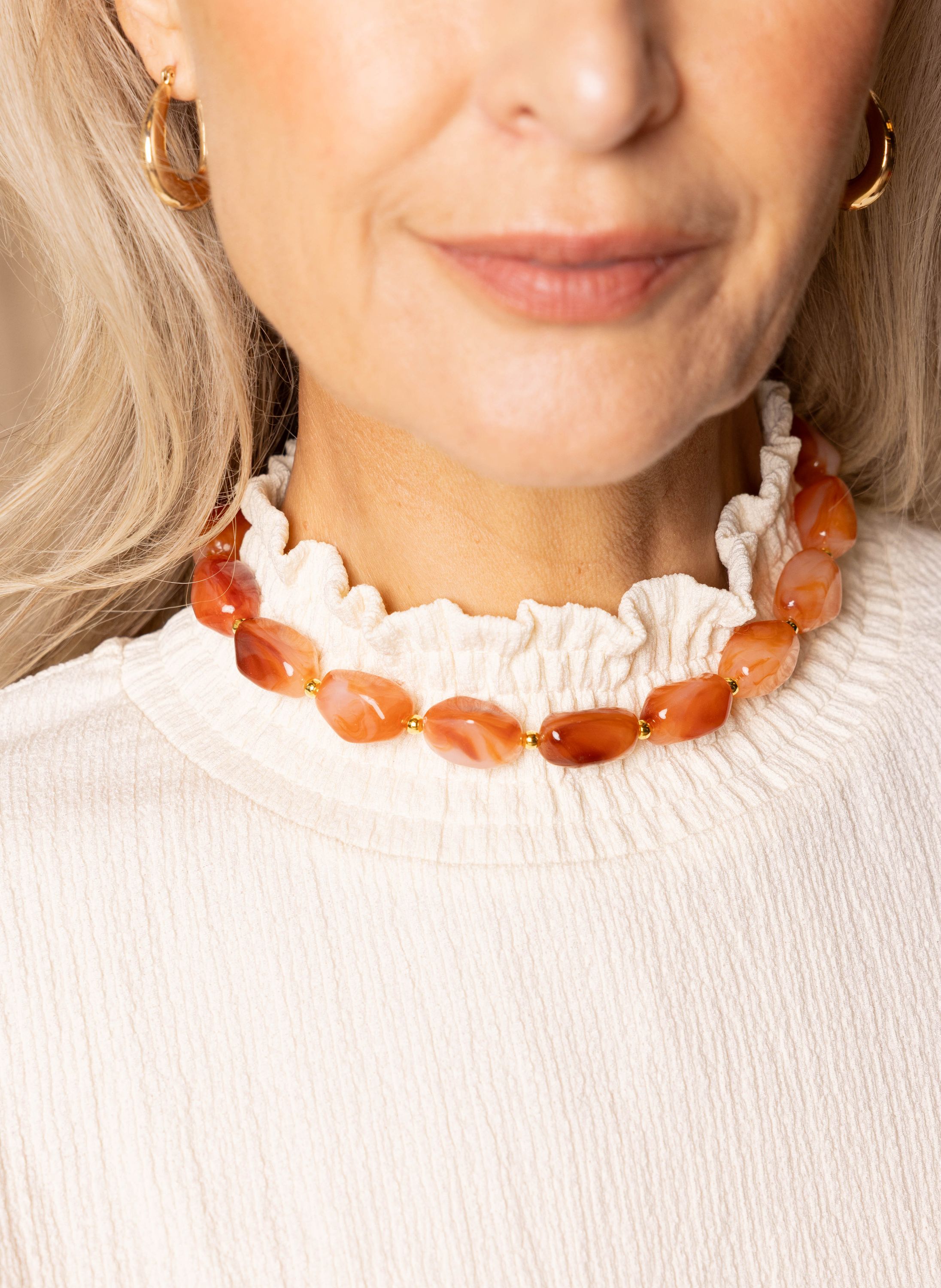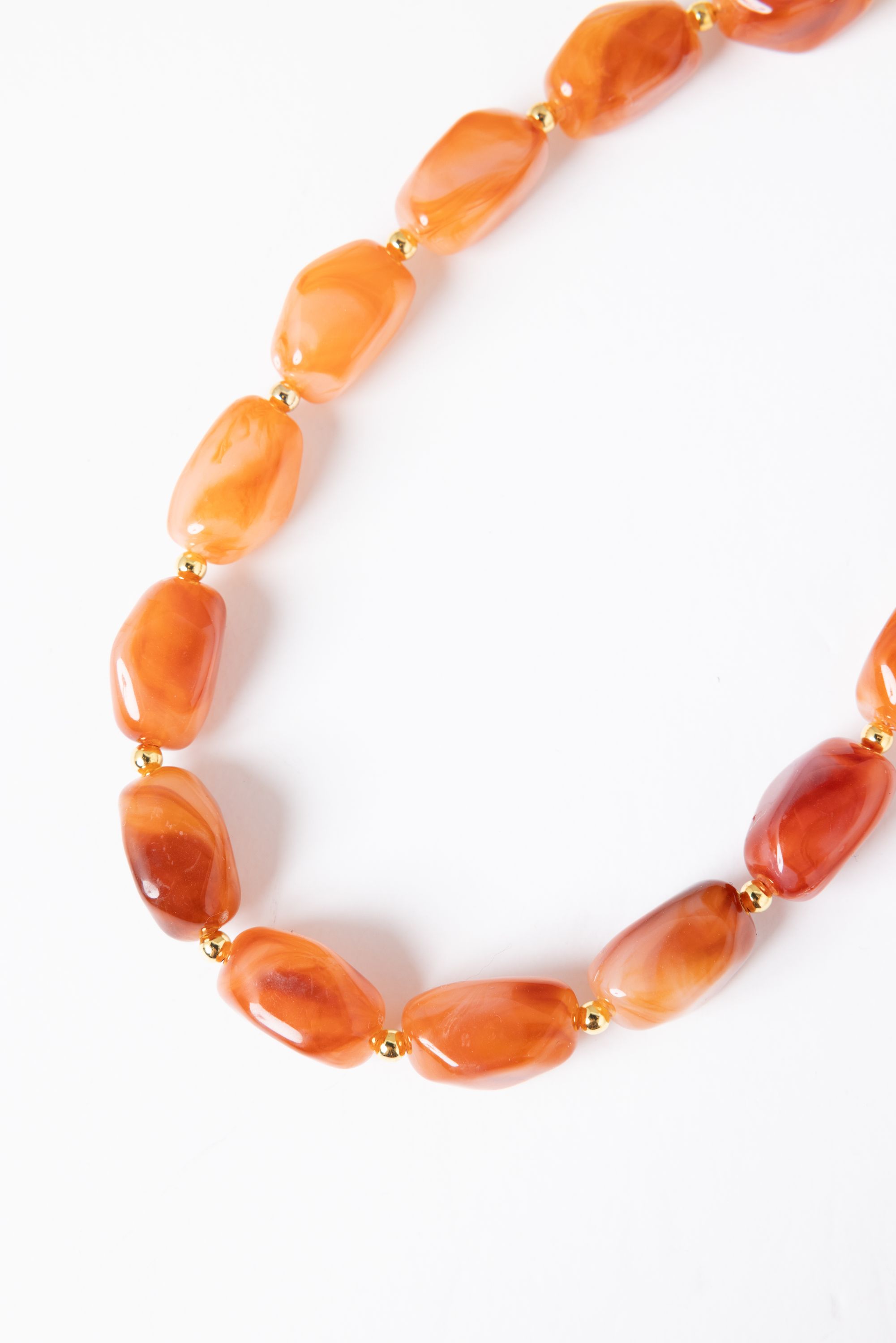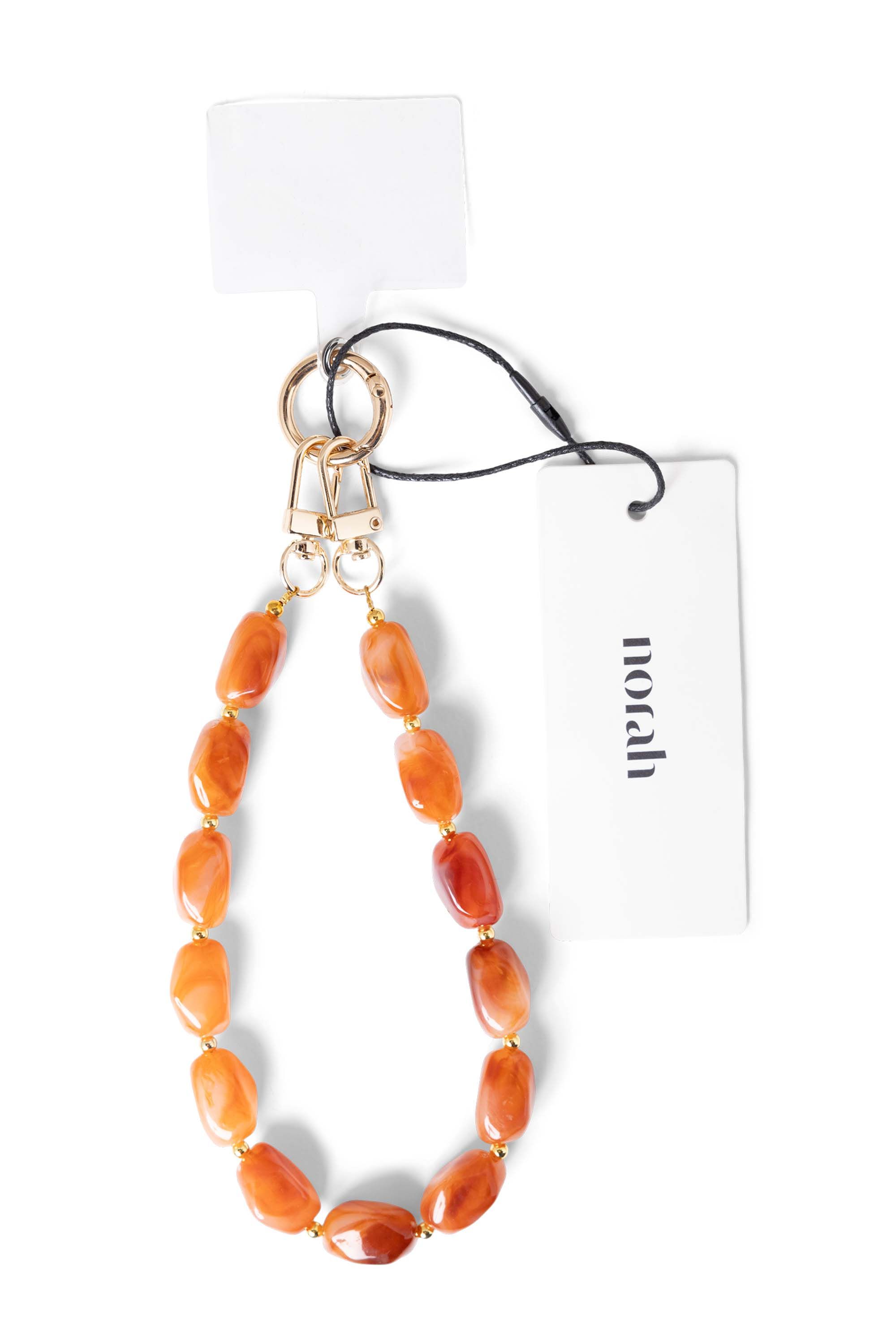 Dit telefoonkoord met grote oranje kralen en goudkleurige details is praktisch om je telefoon altijd bij je te dragen en tegelijk een stijlvol accent. Afmeting: 40 cm.