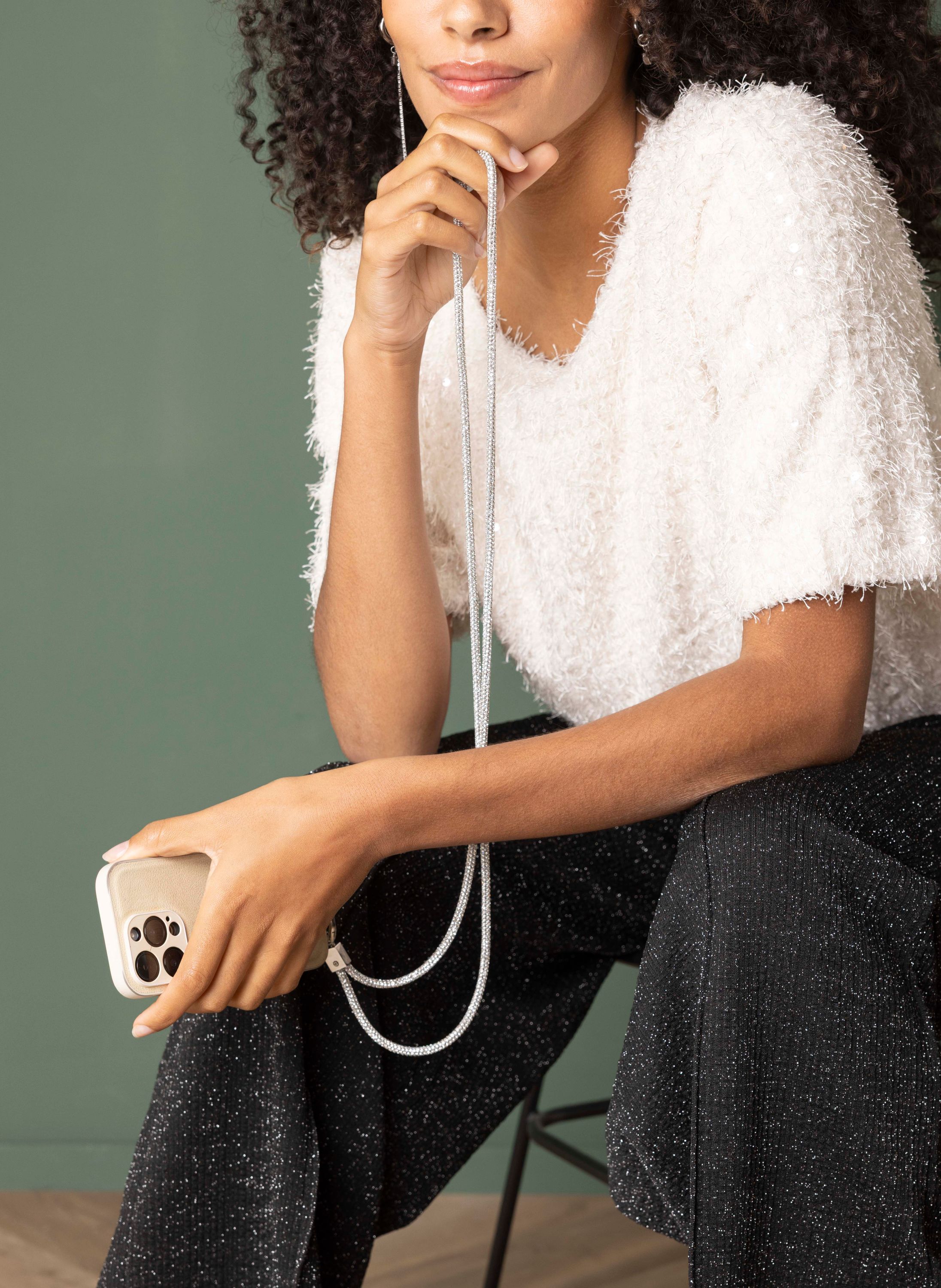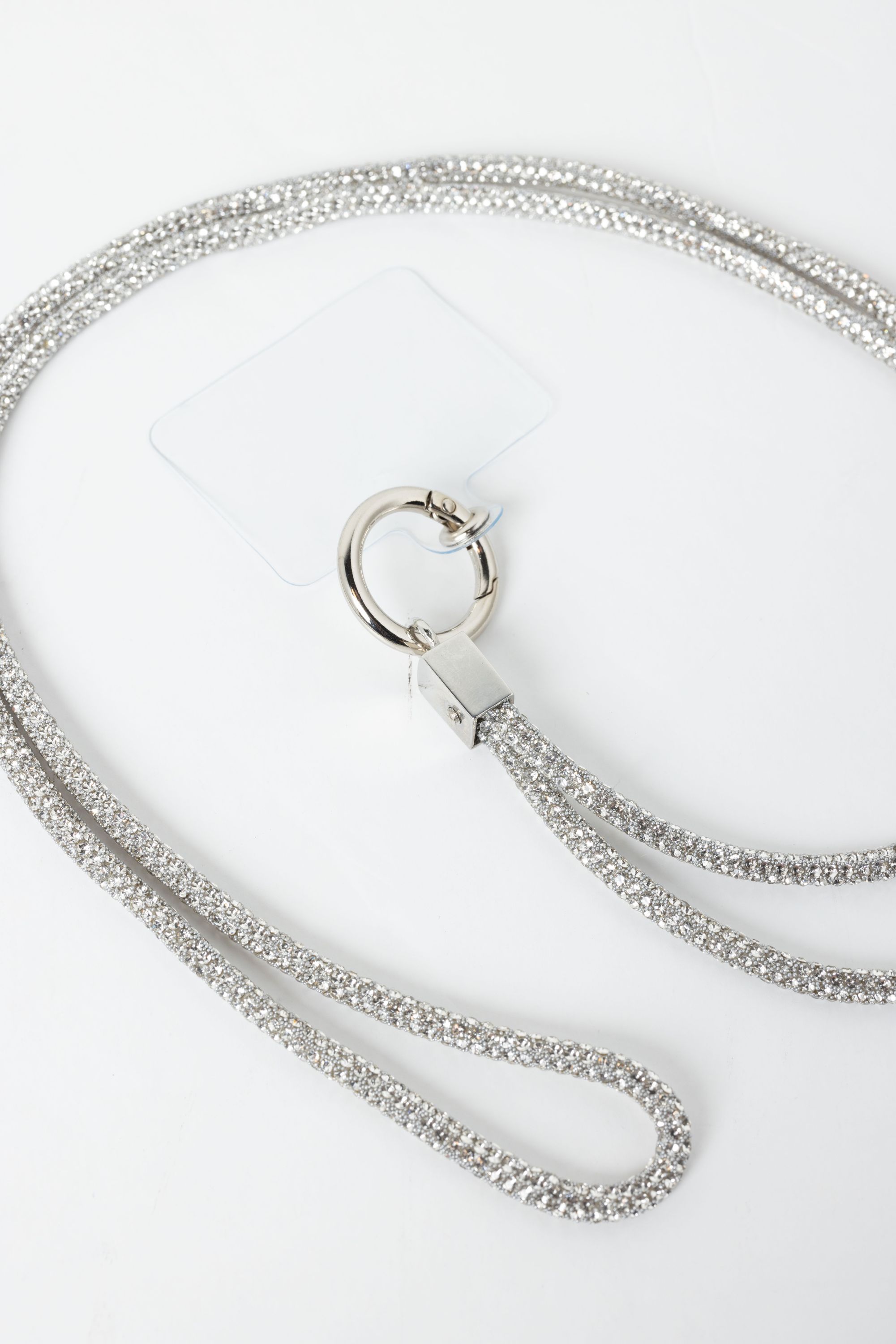 Dit feestelijke telefoonkoord met zilverkleurige steentjes is een stijlvolle accessoire voor elke gelegenheid. Afmeting: 112 cm.