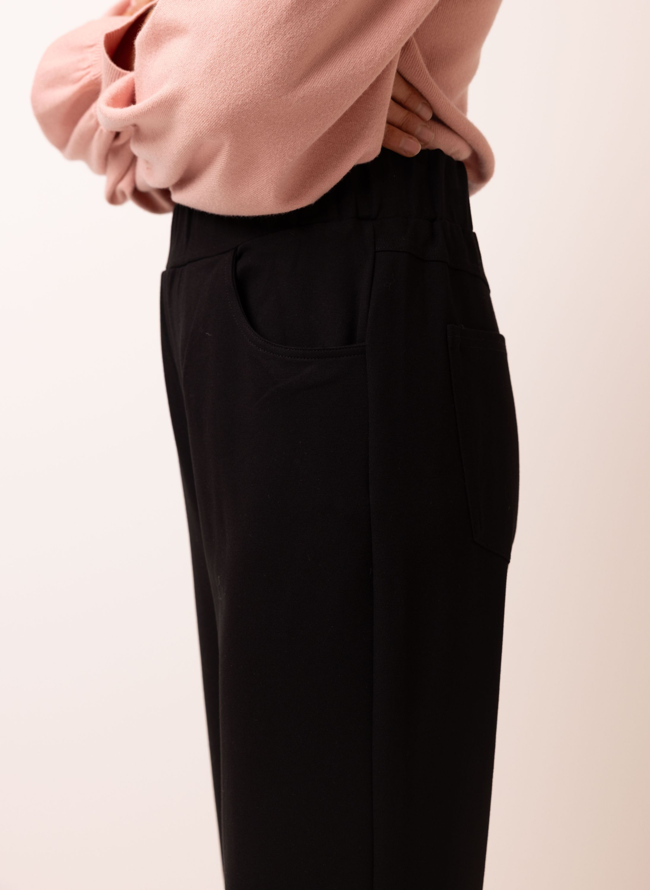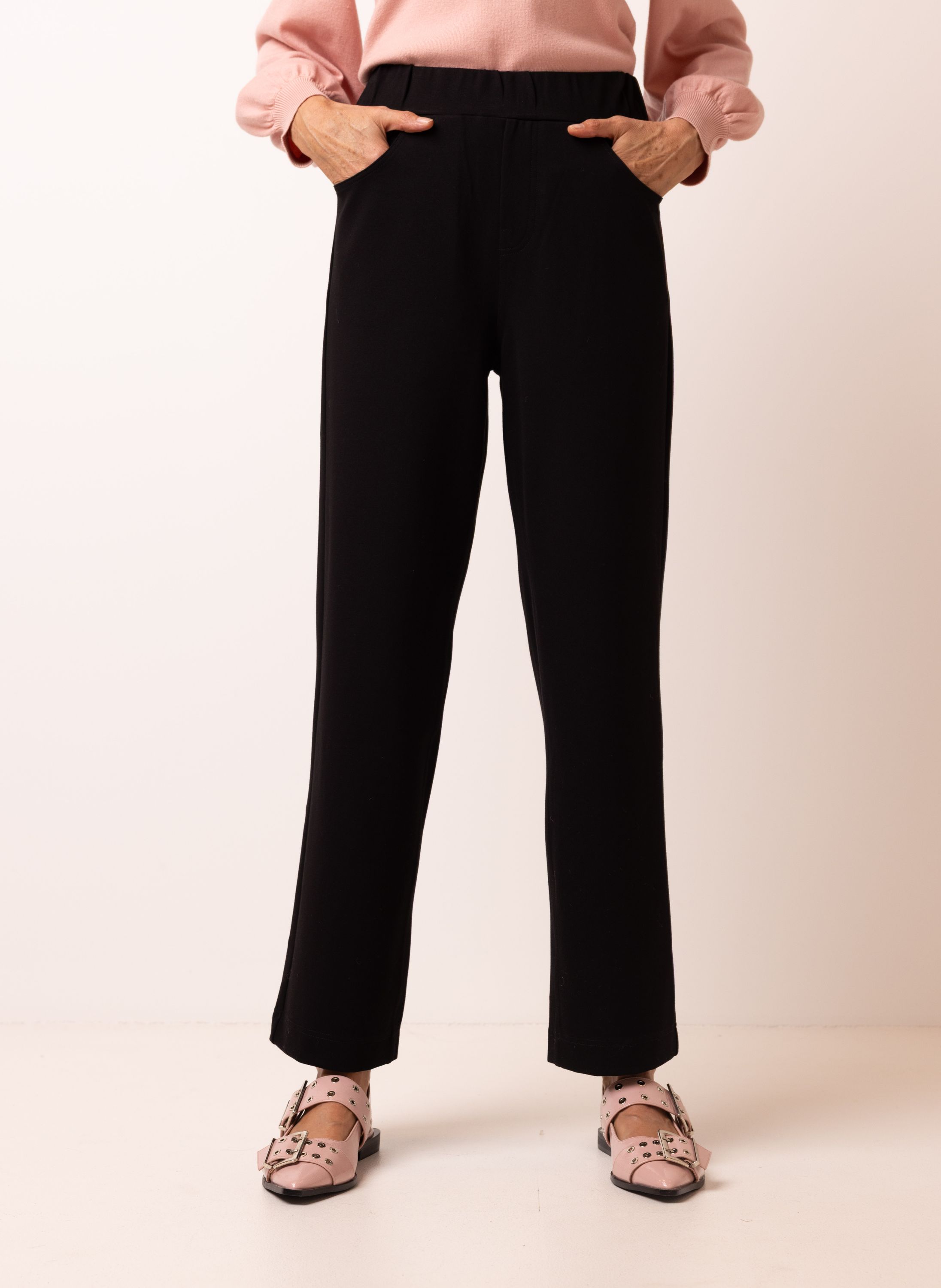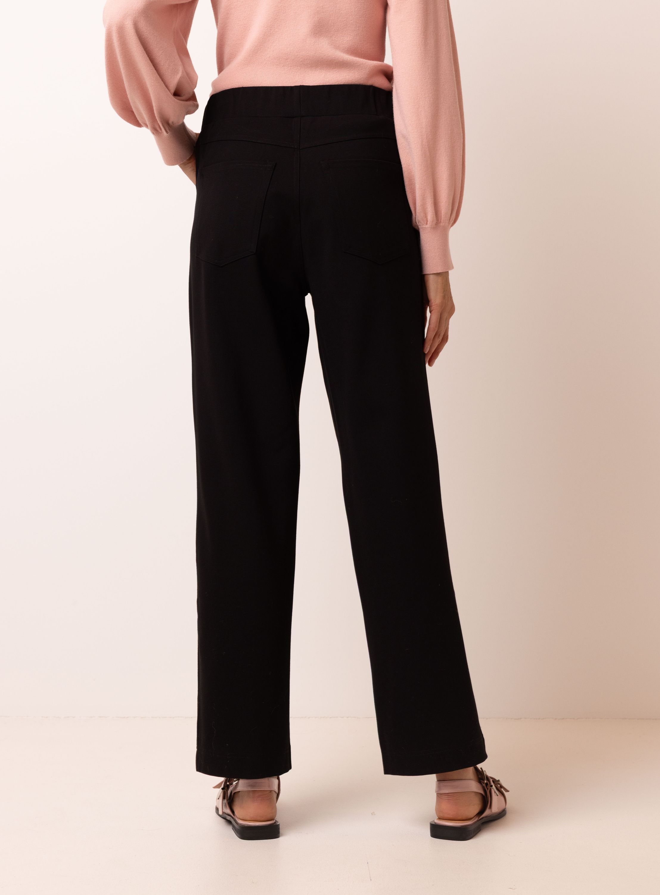Deze high waist straight fit broek met elastische tailleband, steekzakken aan de voorzijde en open zakken aan de achterzijde draagt comfortabel.