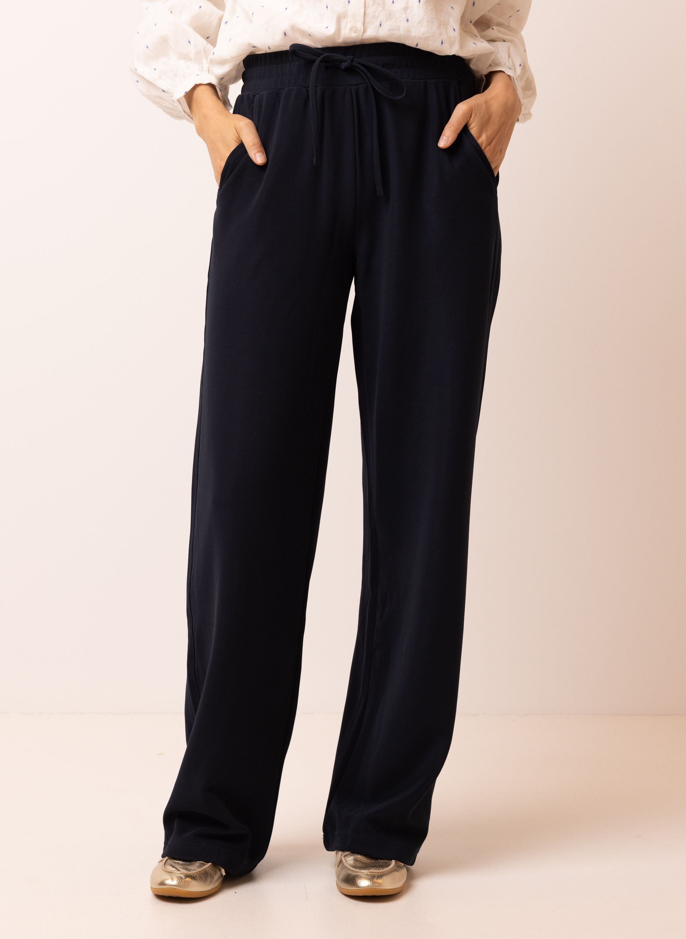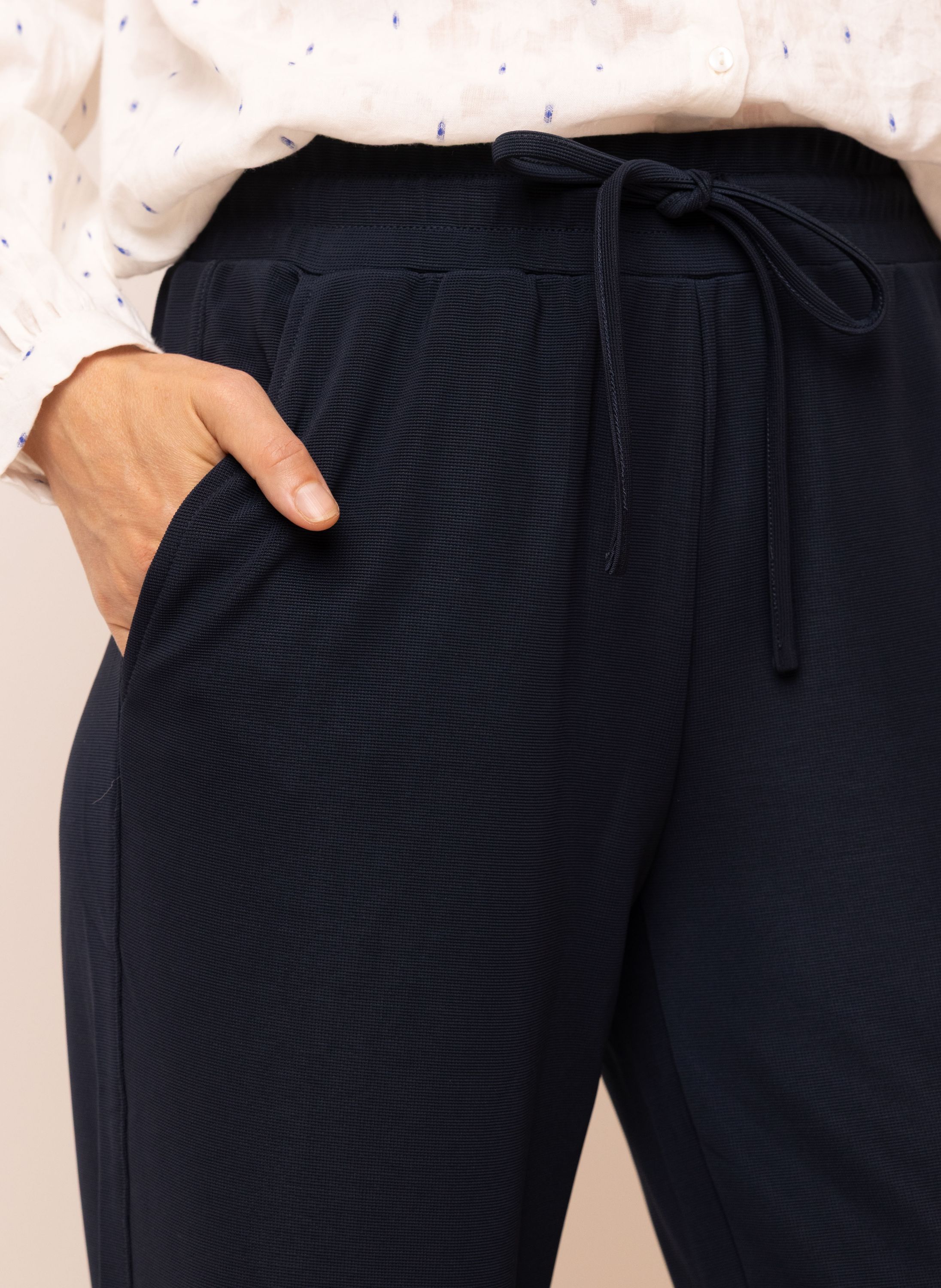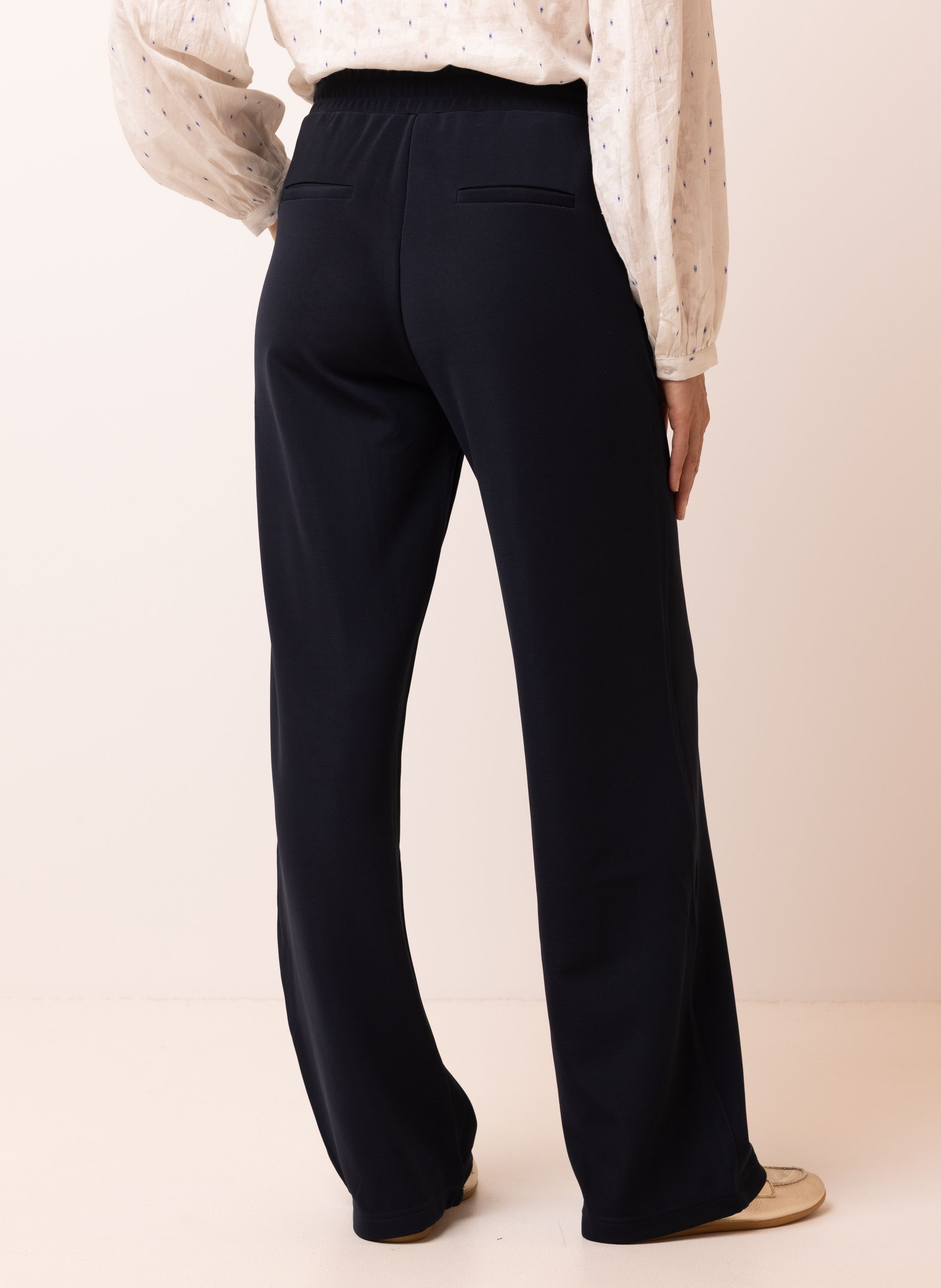 Deze high waist straight fit broek met elastische band, trekkoord, steekzakken voor en dichte paspelzakken achter is ook verkrijgbaar in lengtemaat 30.