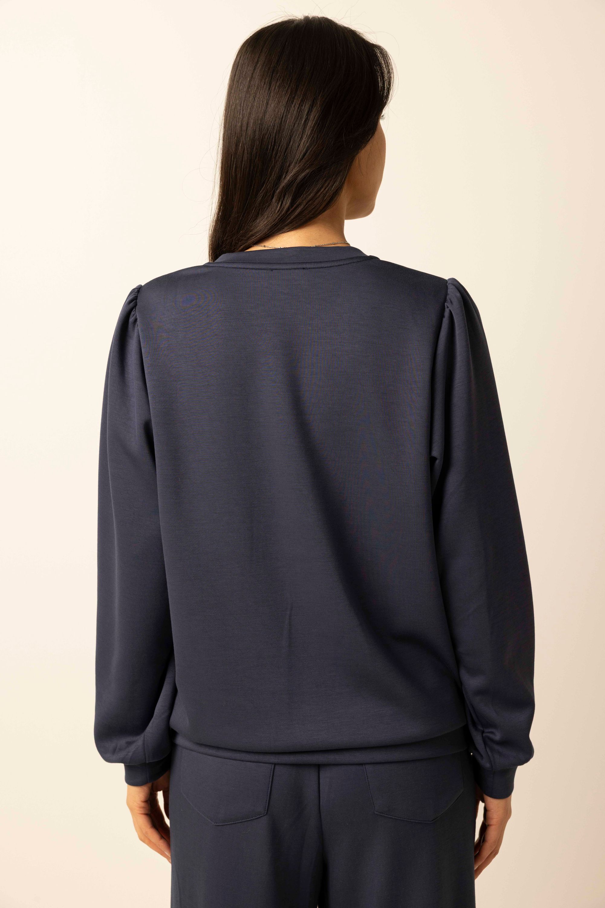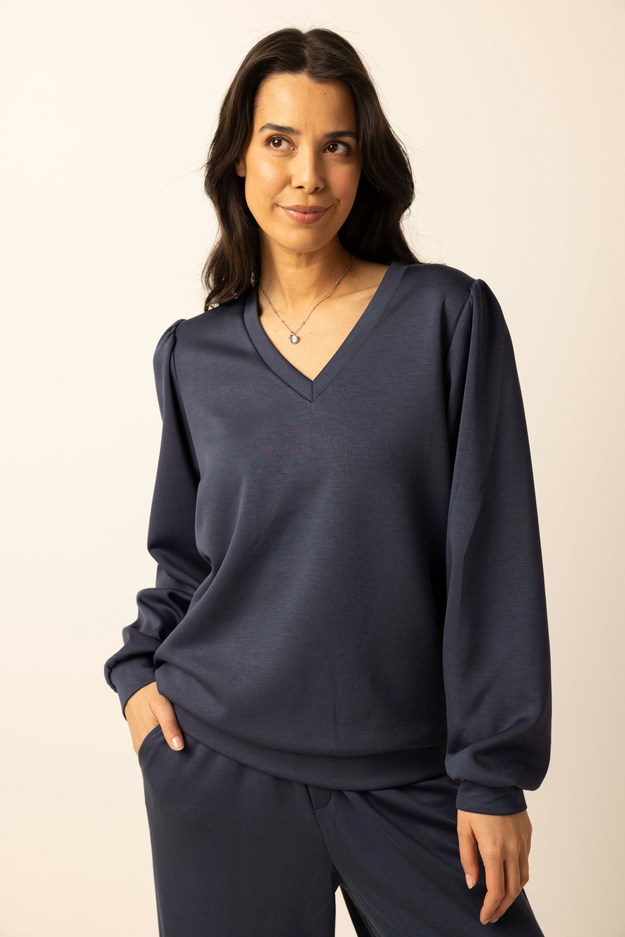 Deze sweater met V-hals en lange pofmouwen is een comfortabele basic met een vrouwelijke touch.