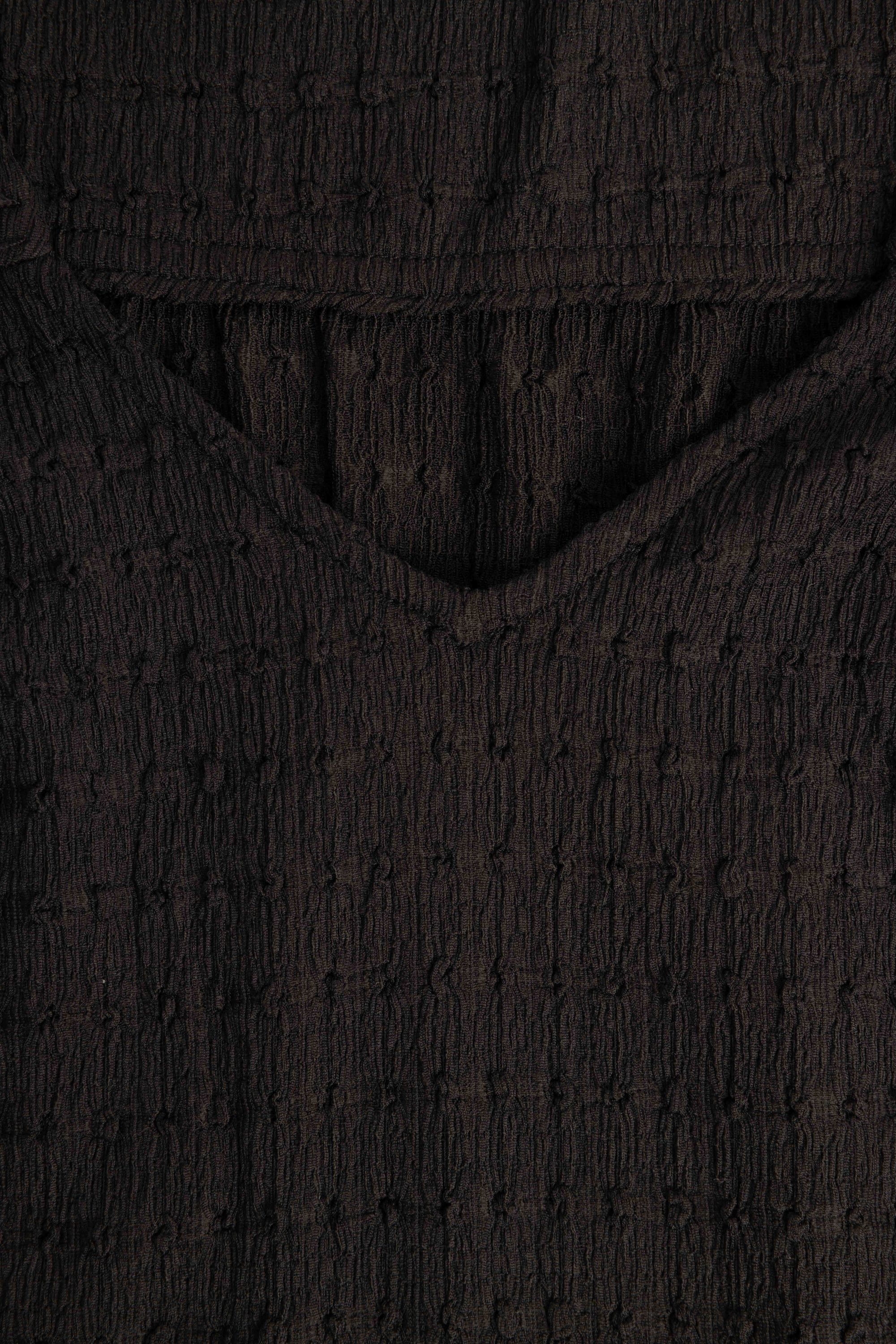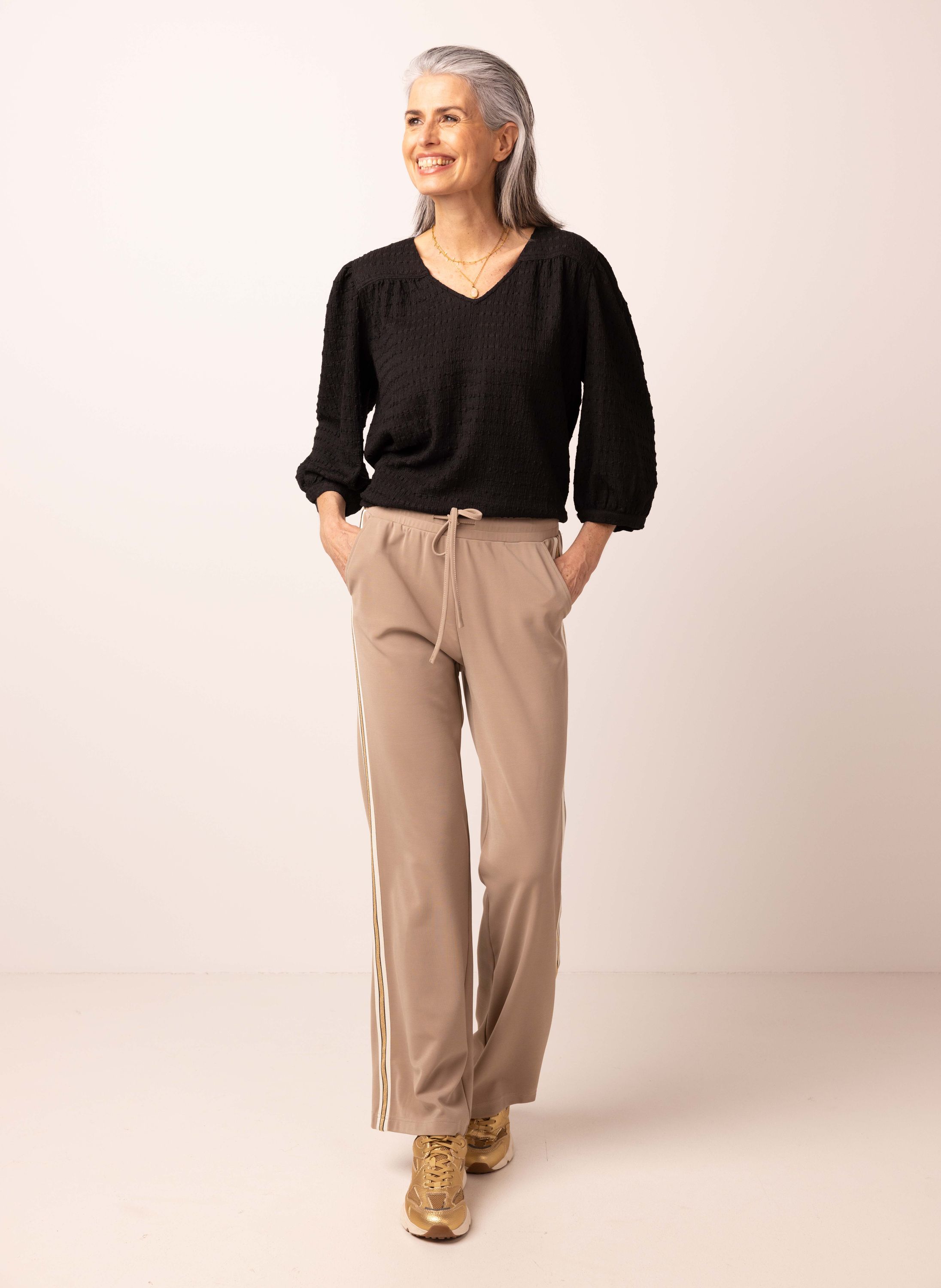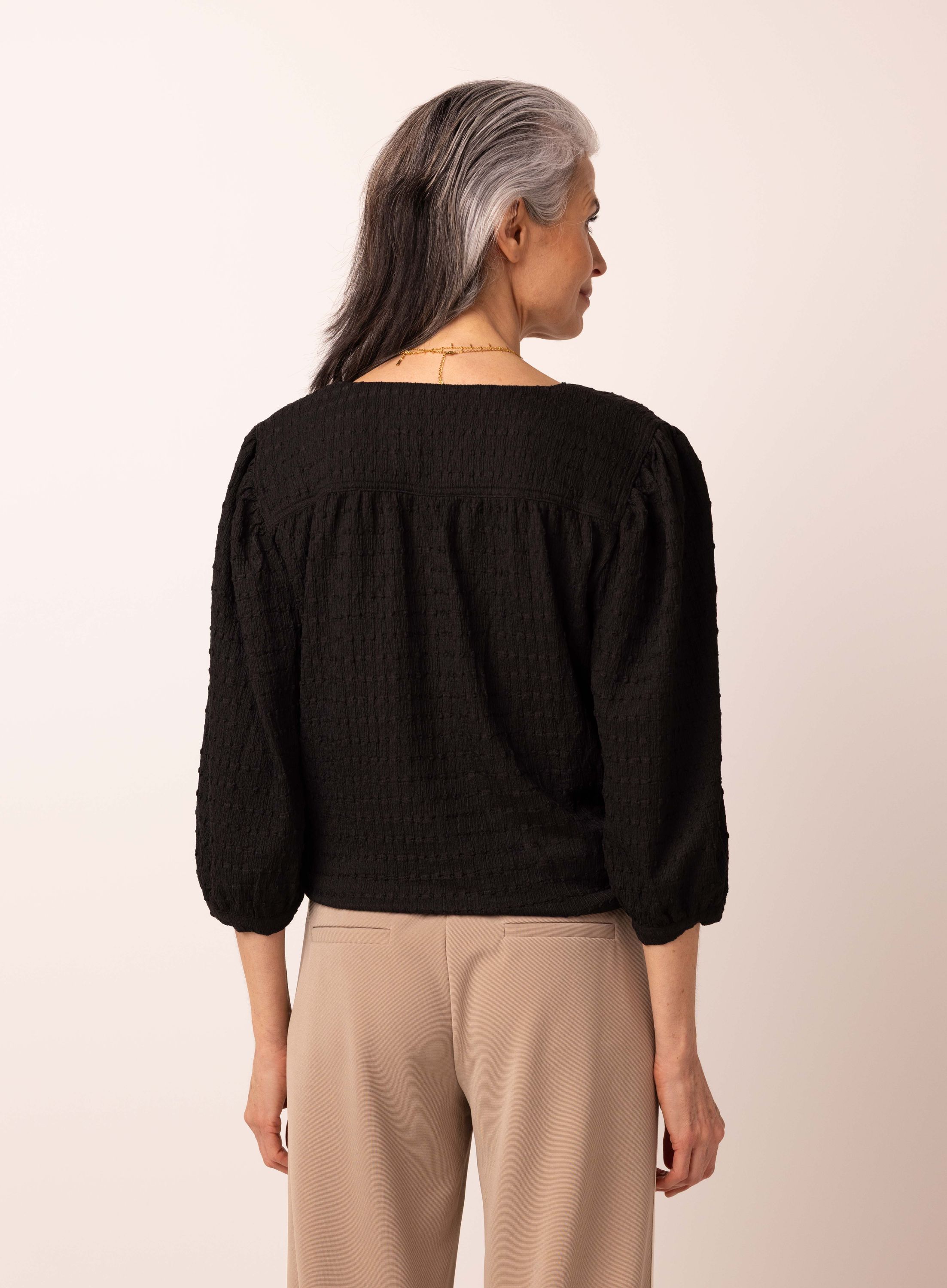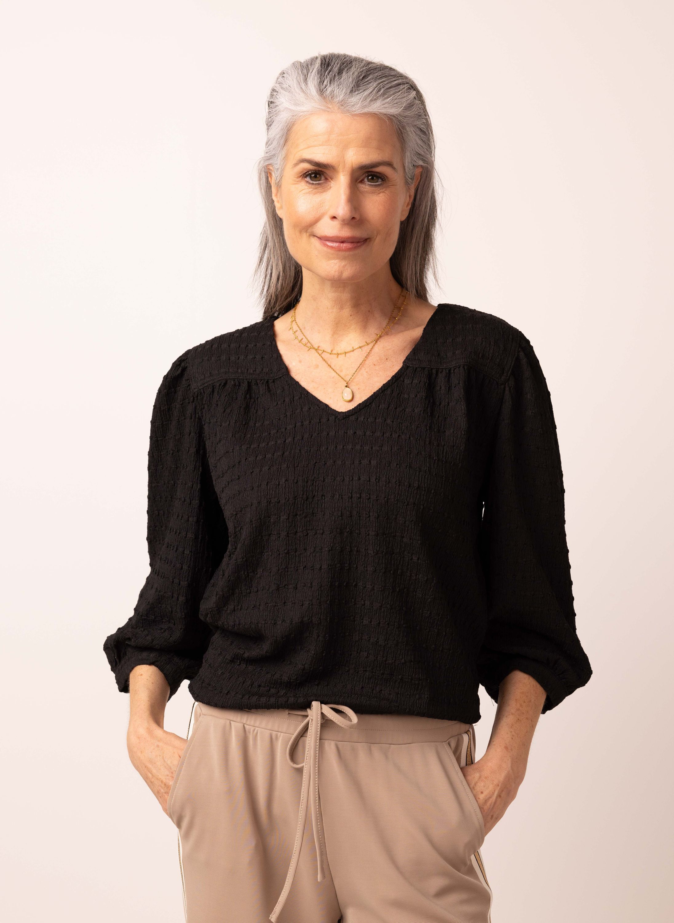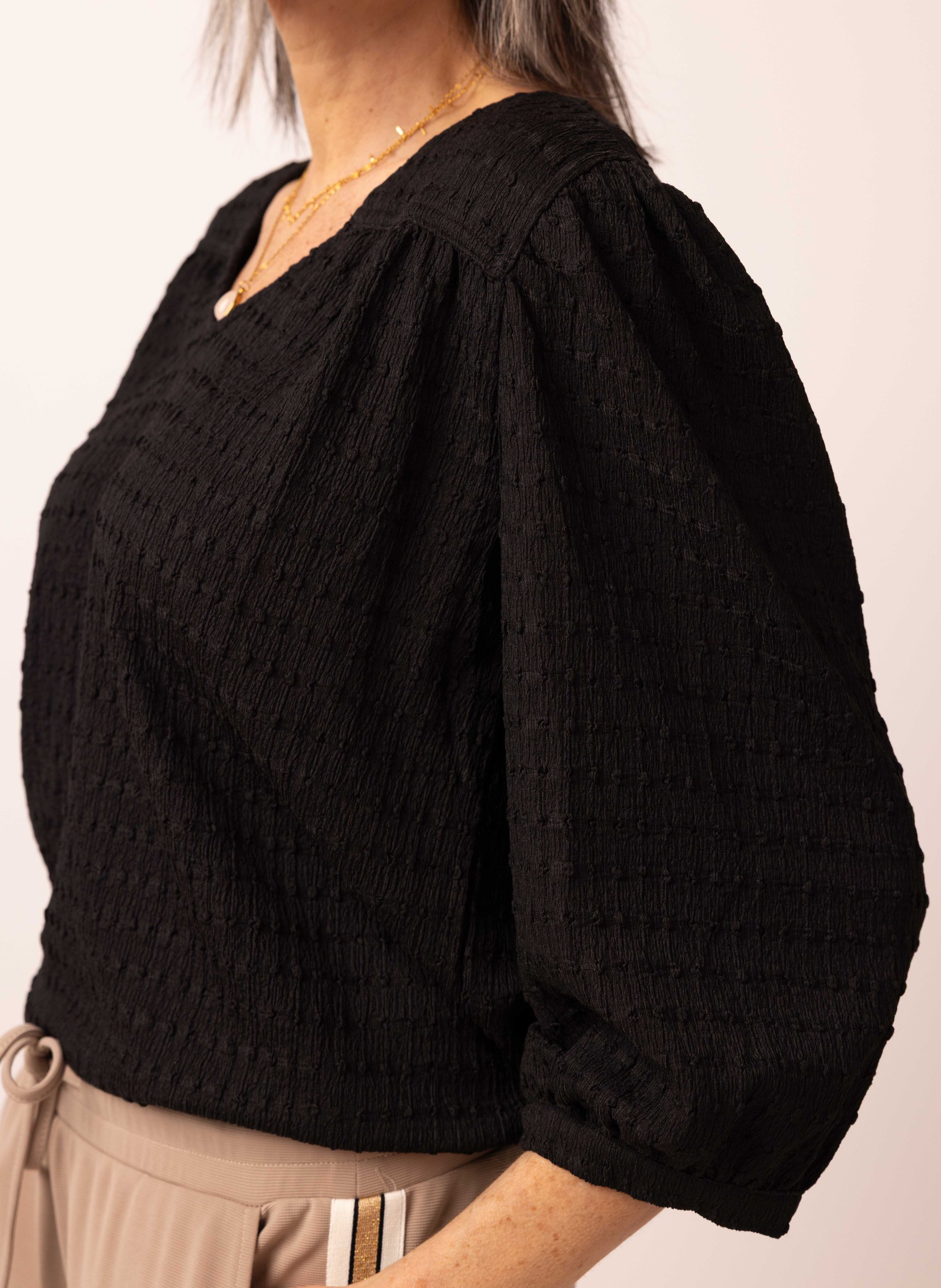 Deze blouse met V-hals heeft driekwart pofmouwen en een structuur in de stof.