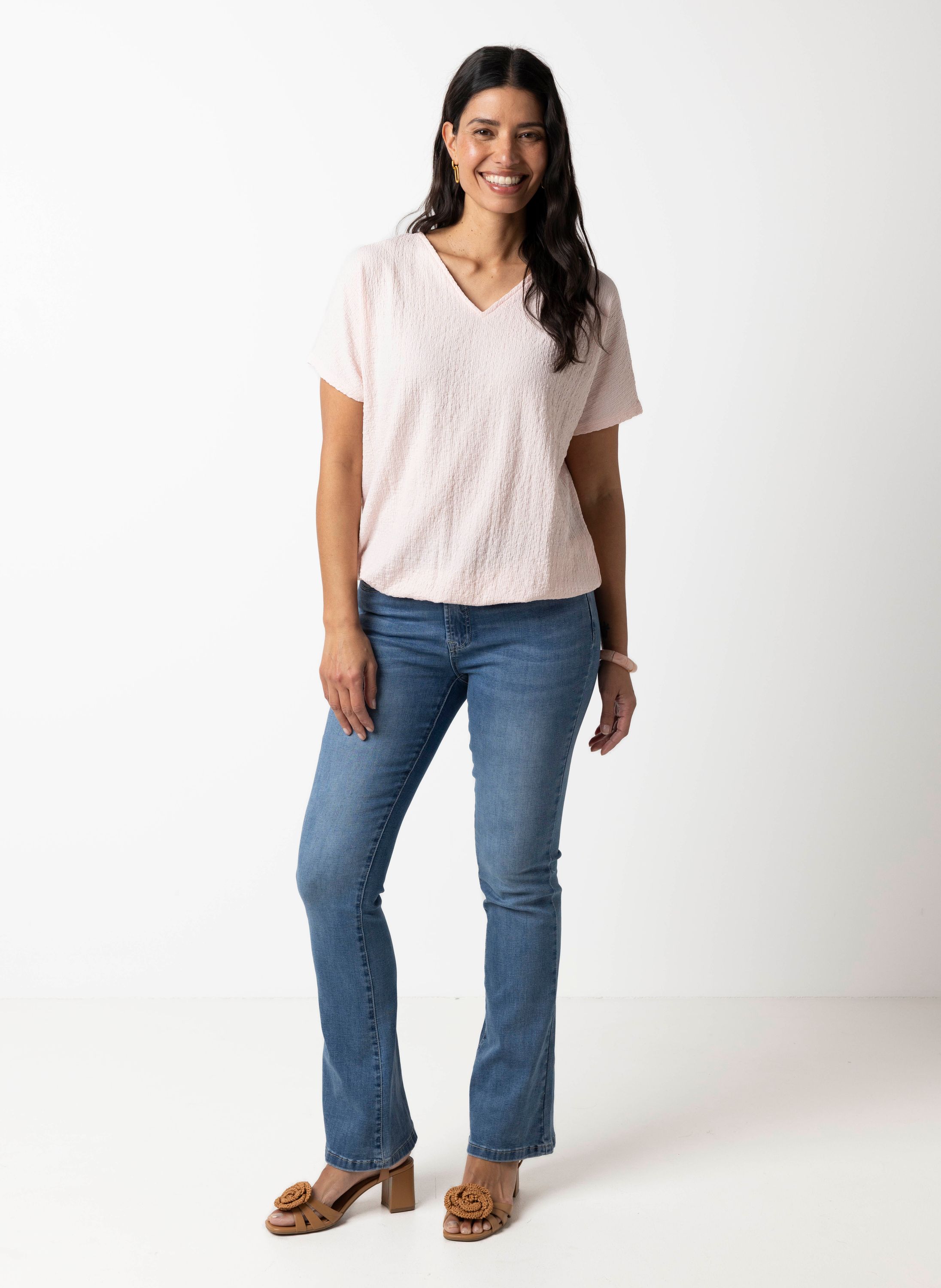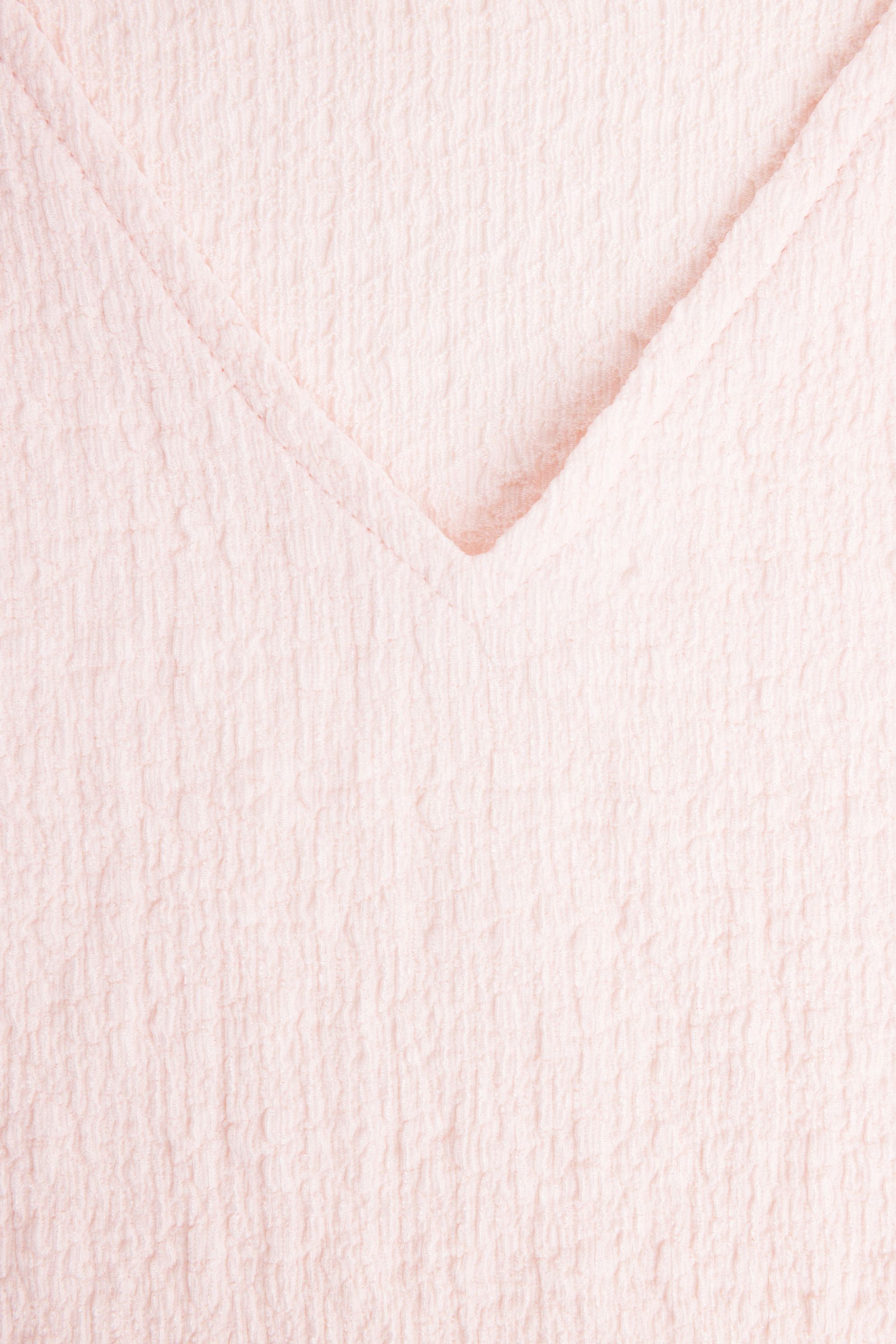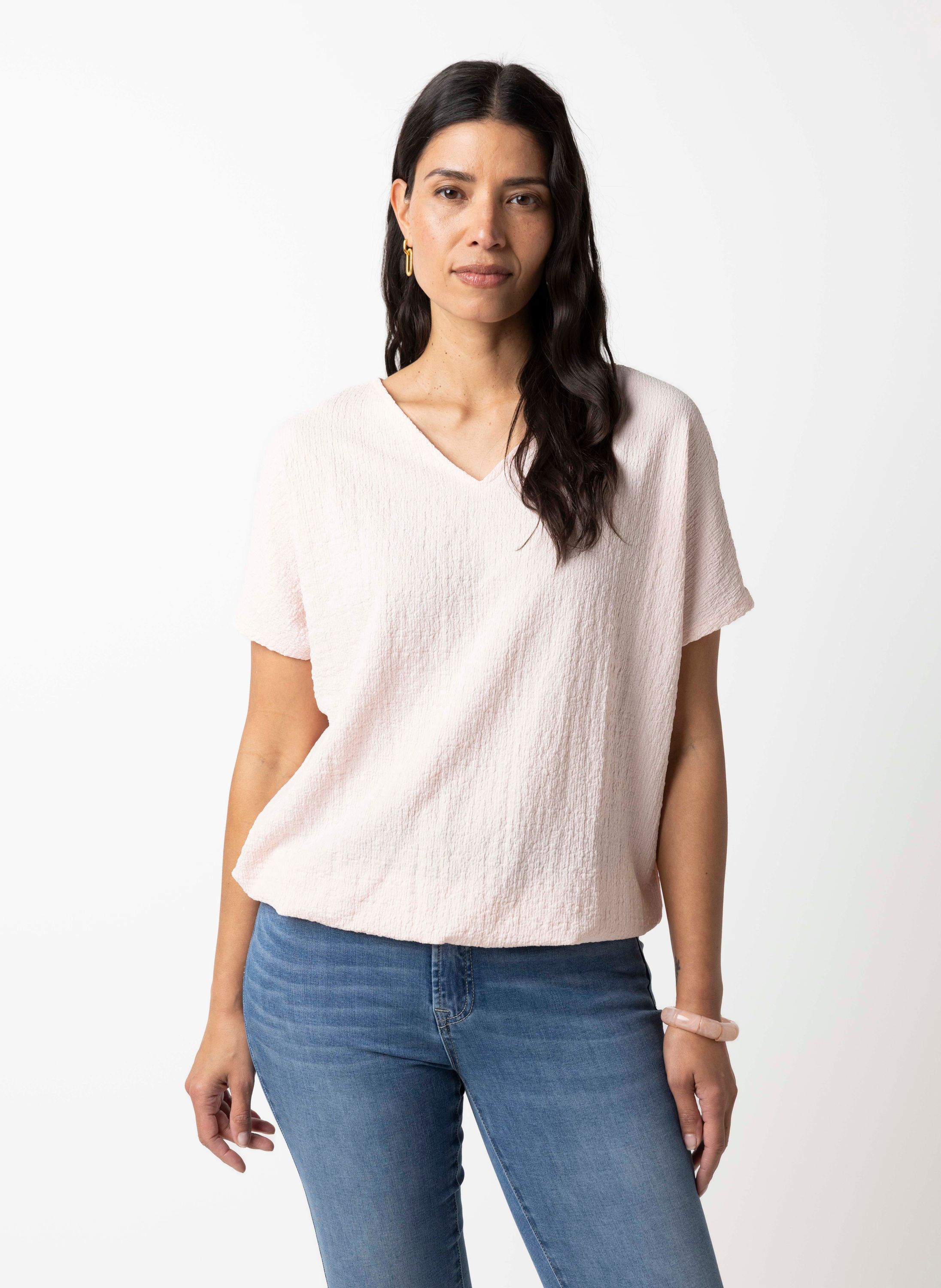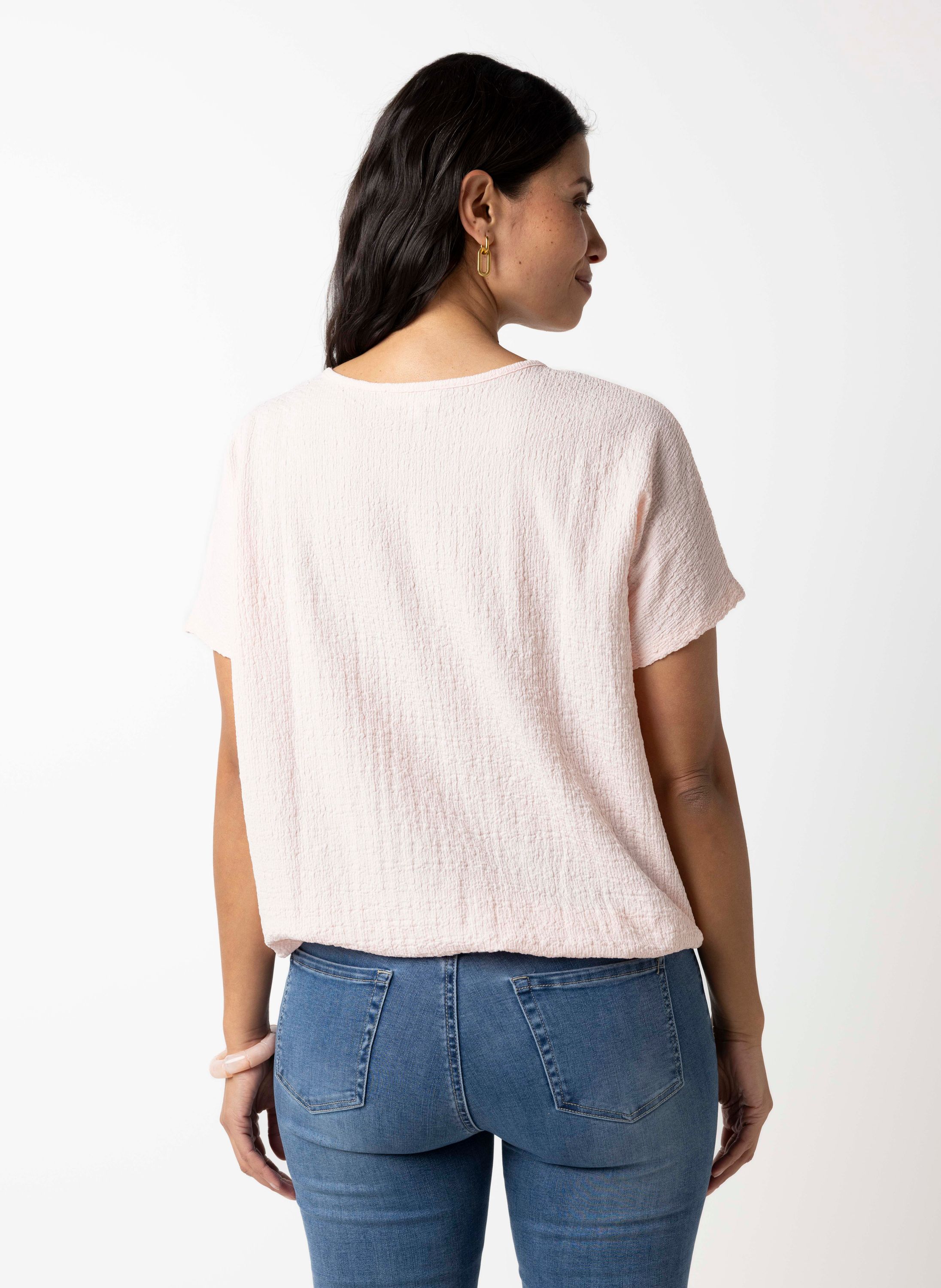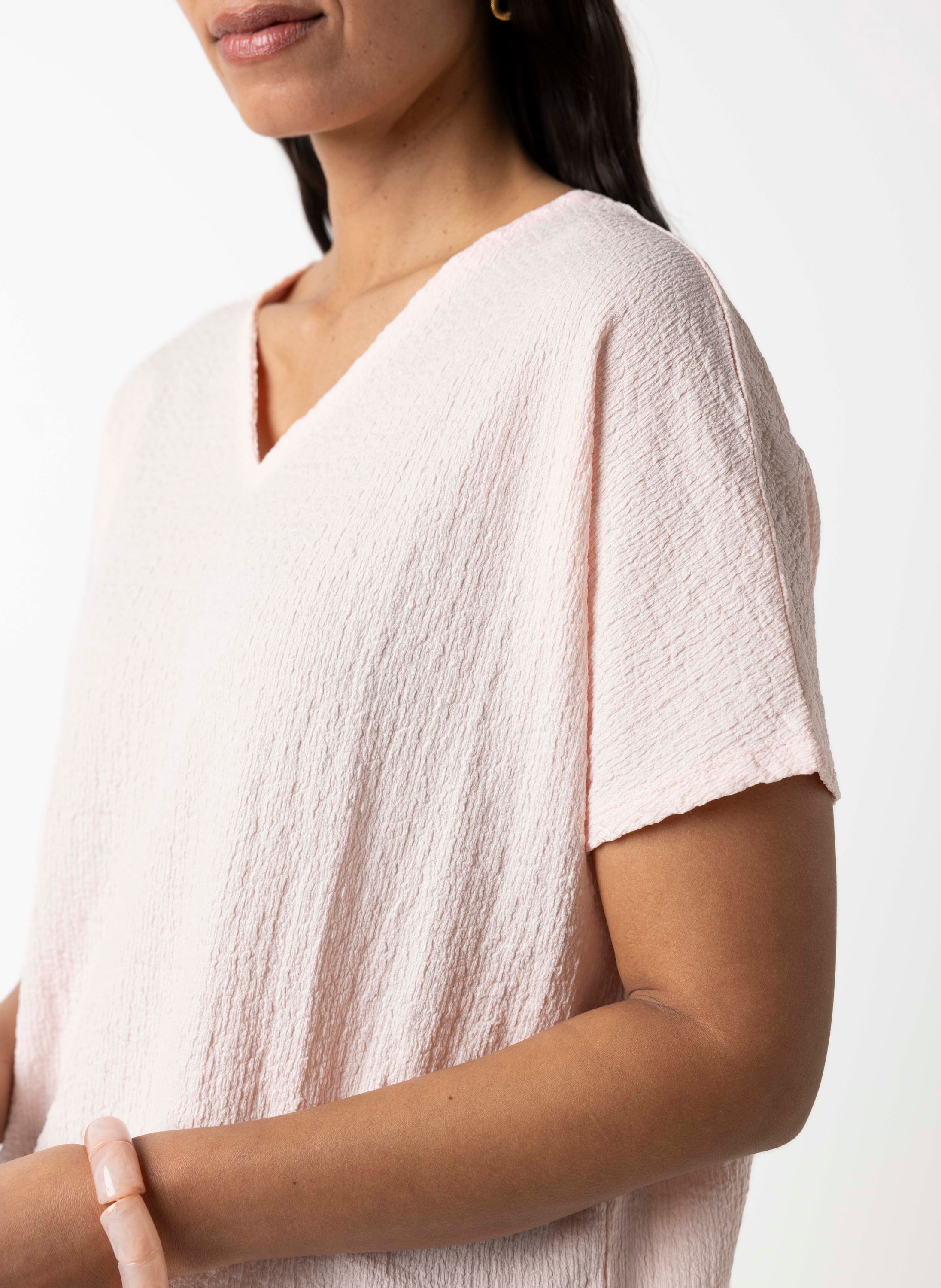 Dit shirt met V-hals en aangeknipte korte mouwen heeft een elastische band aan de onderzijde en een stof met structuur voor een speels effect.