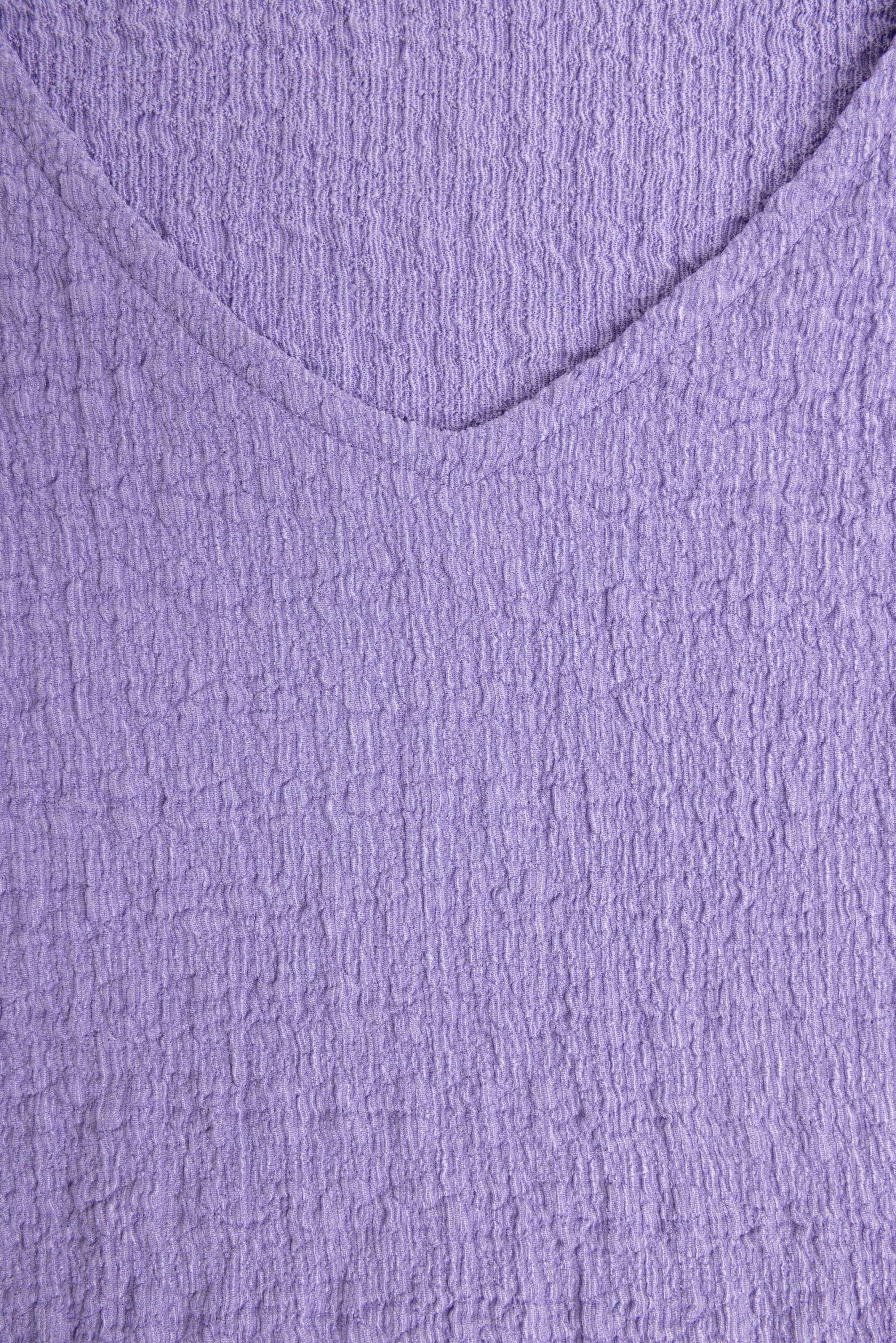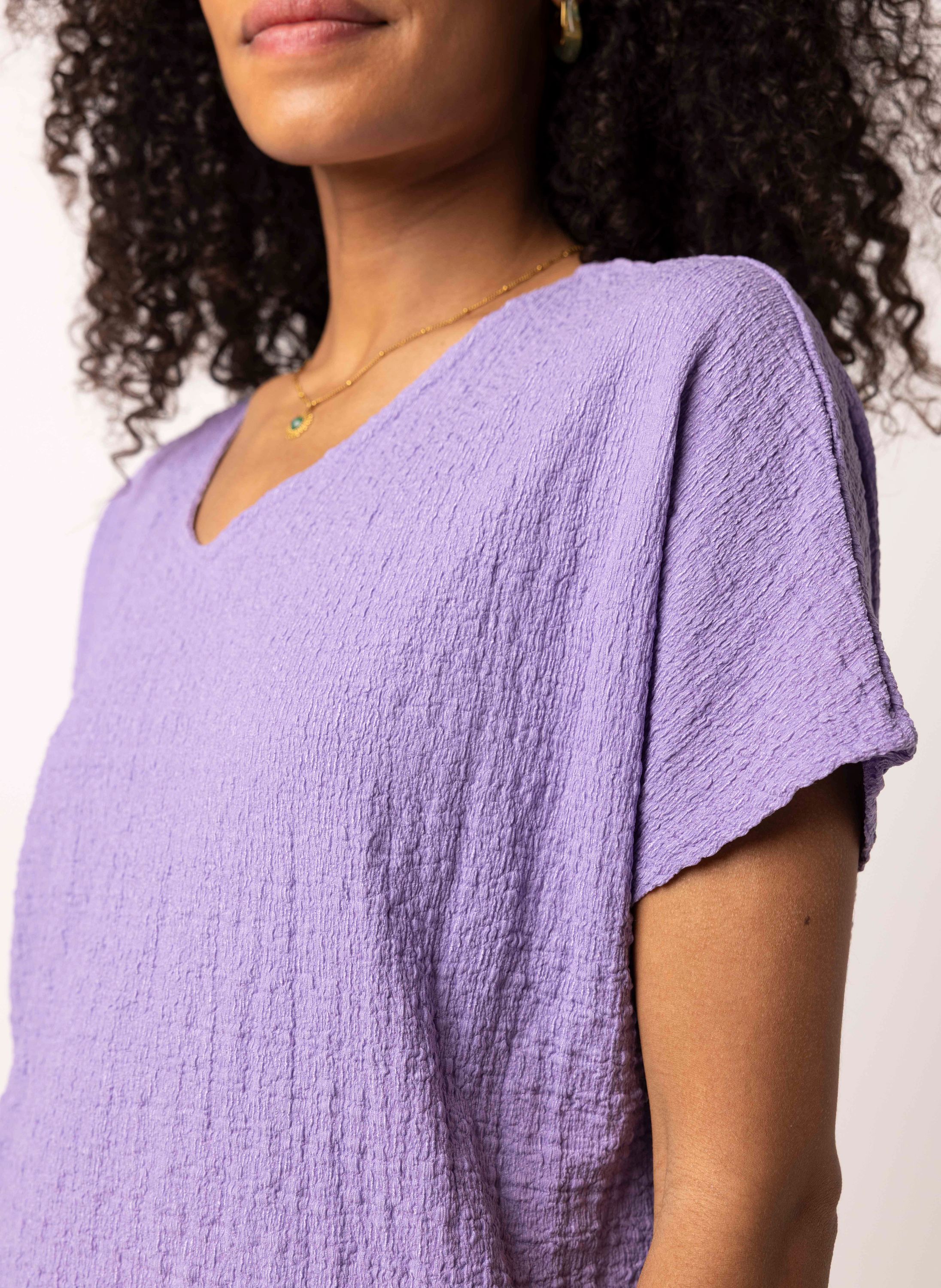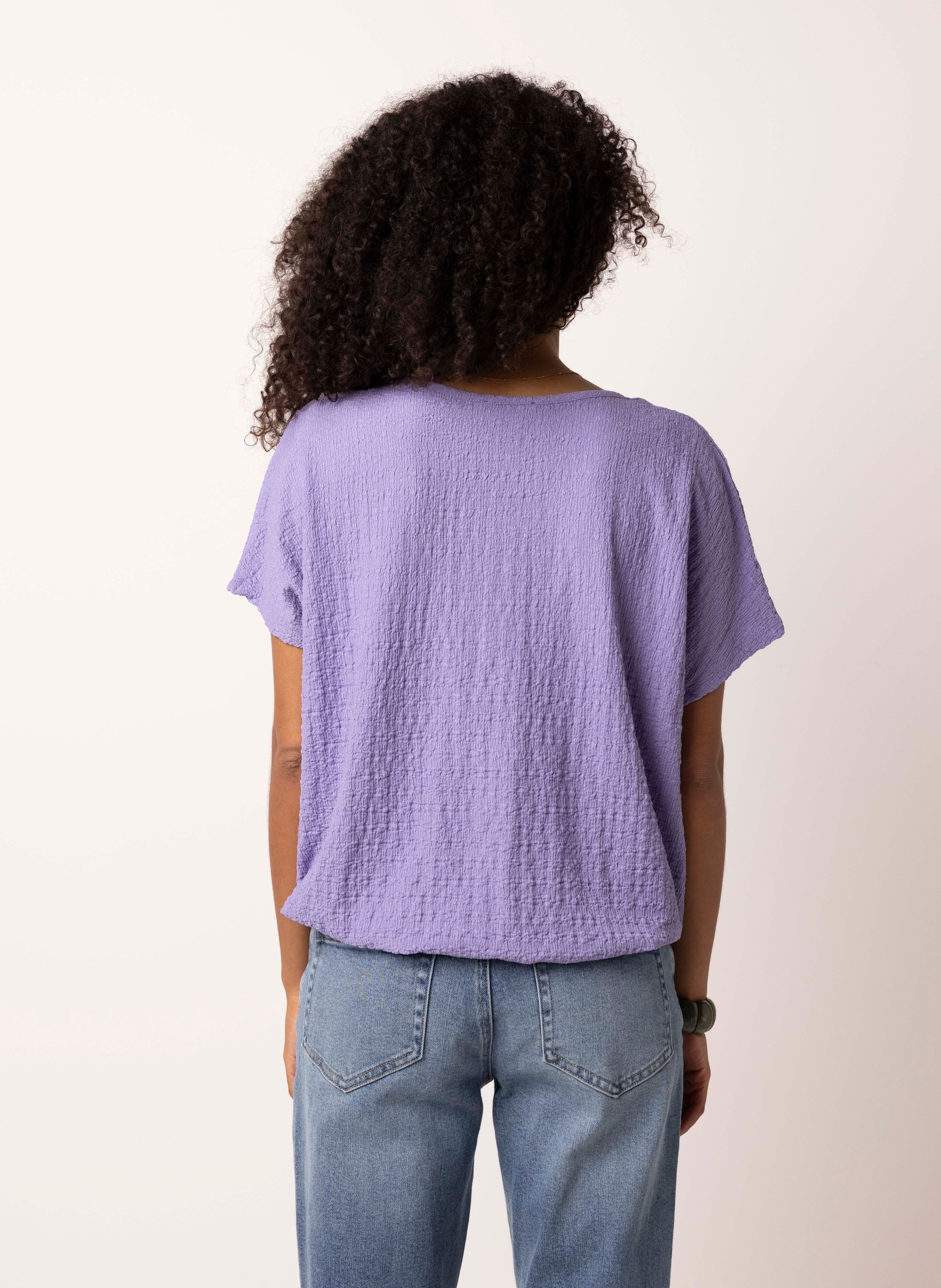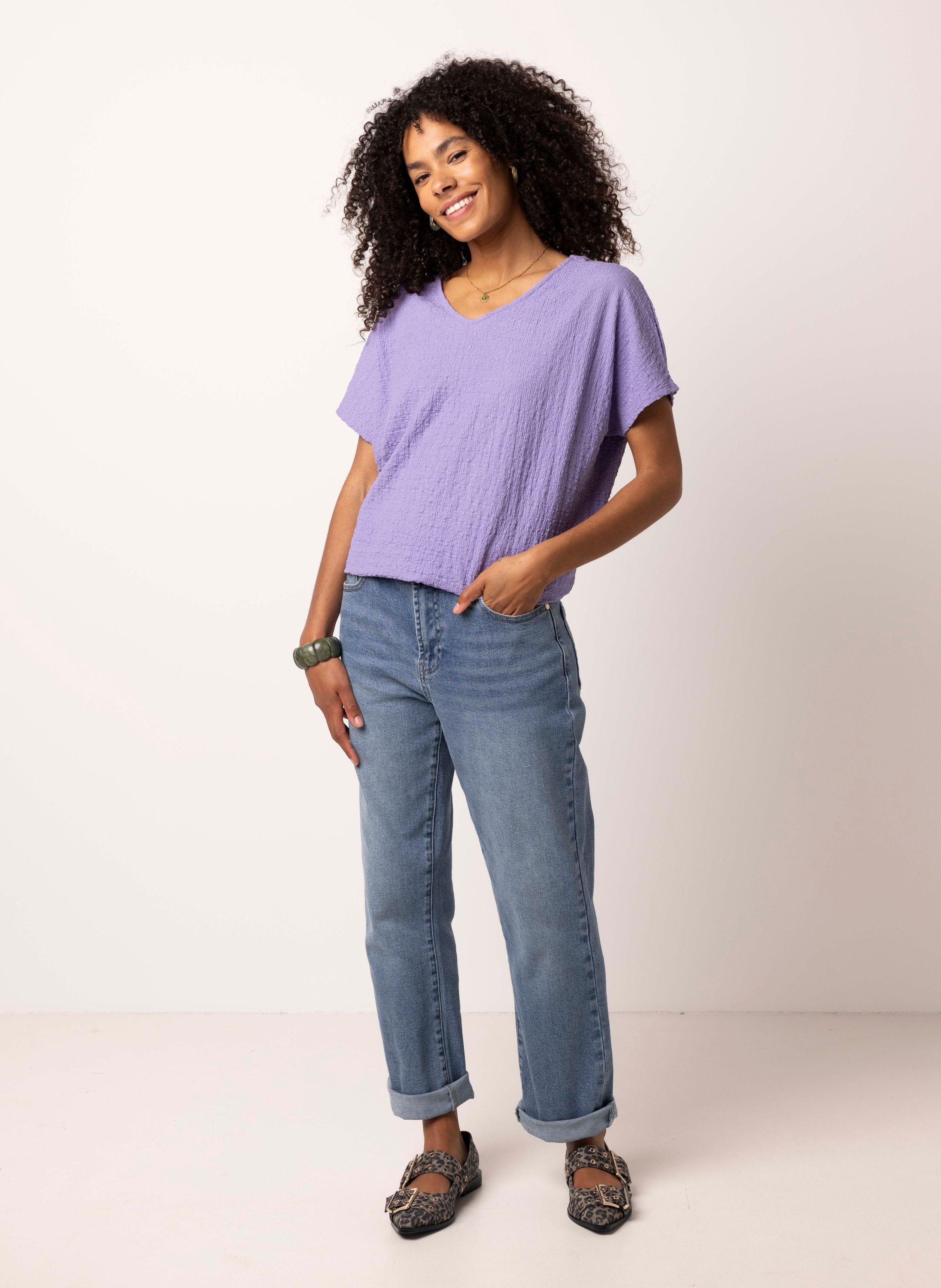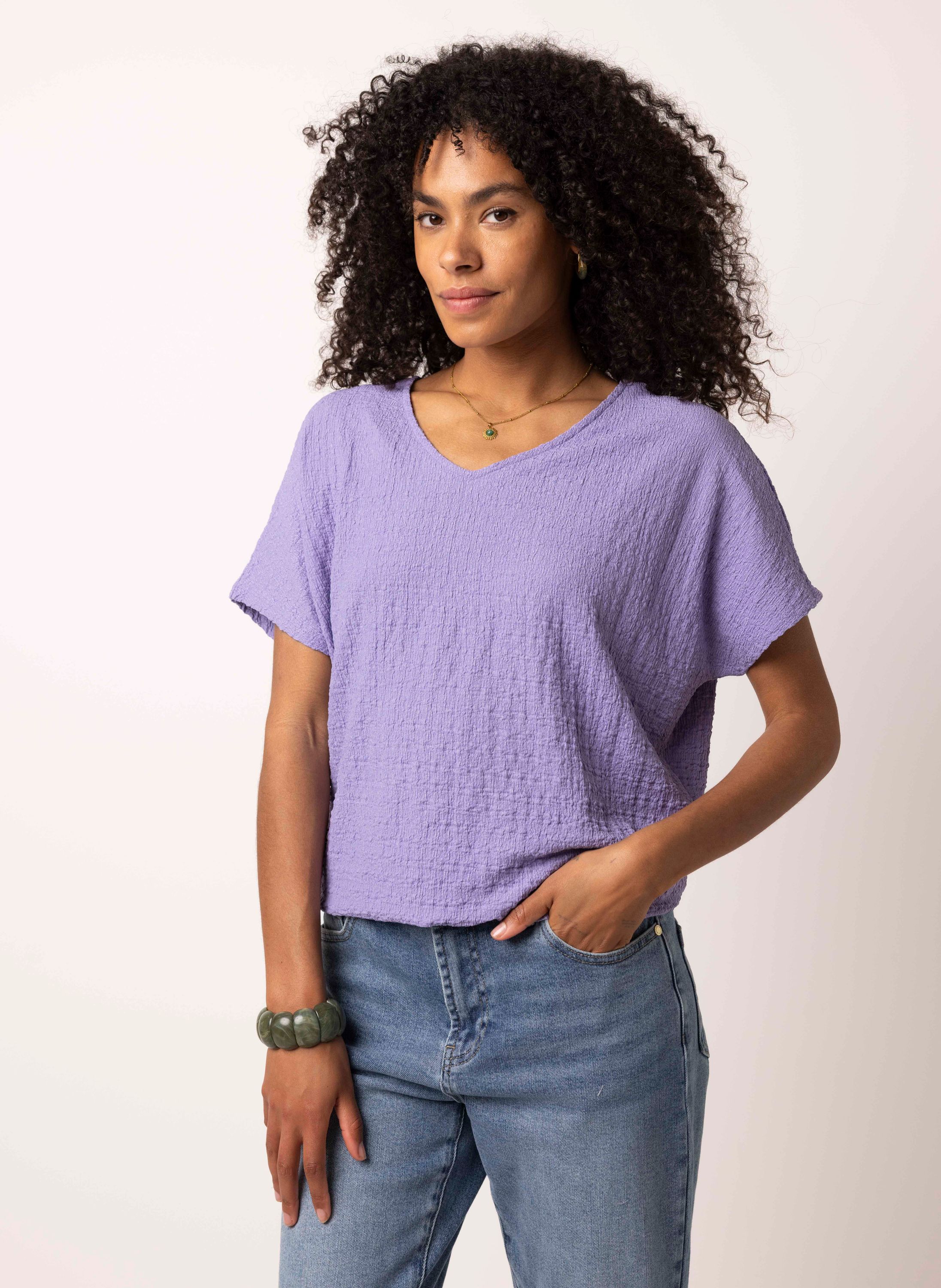 Dit shirt met V-hals en aangeknipte korte mouwen heeft een elastische band aan de onderzijde en een stof met structuur voor een speels effect.