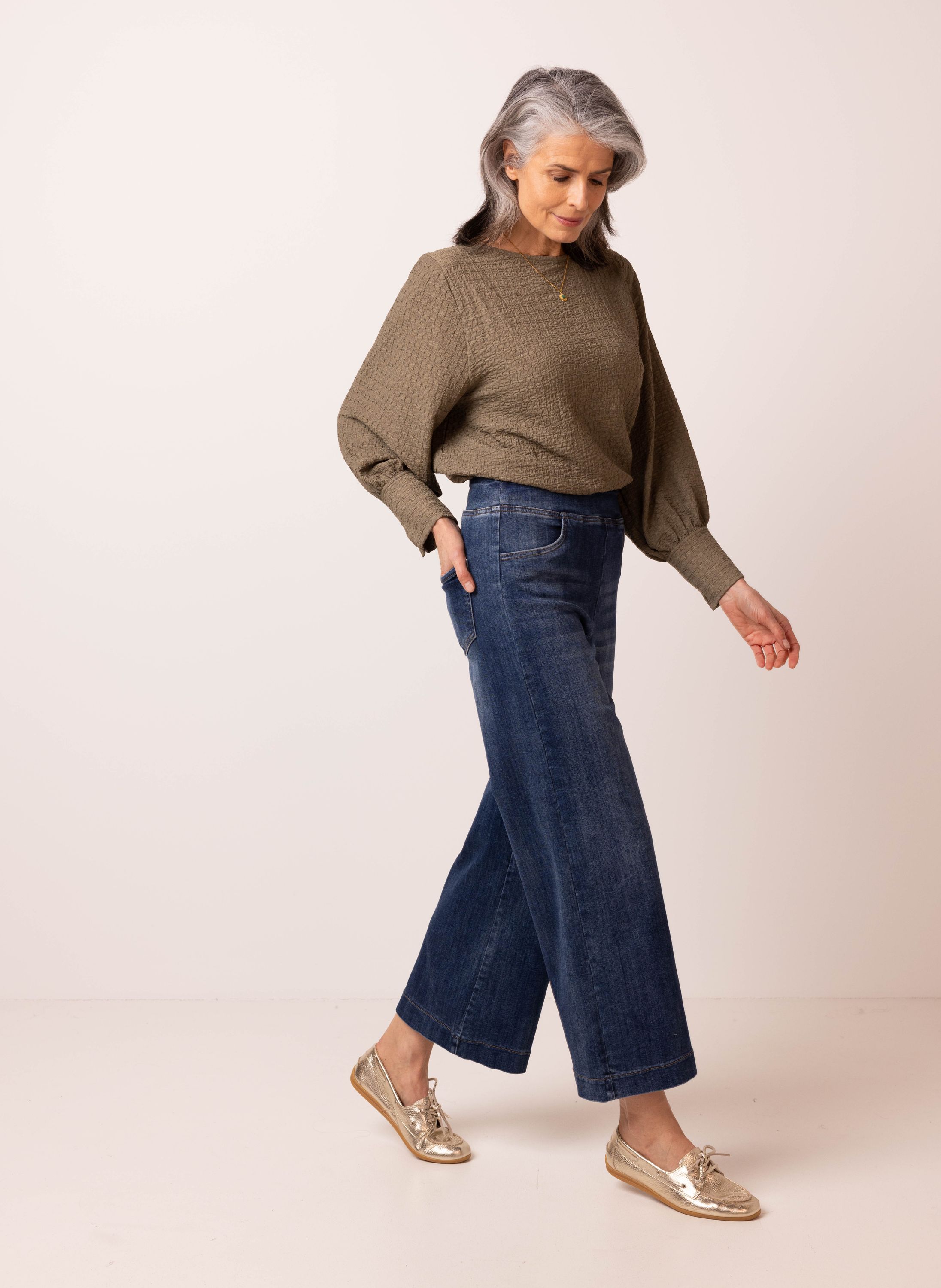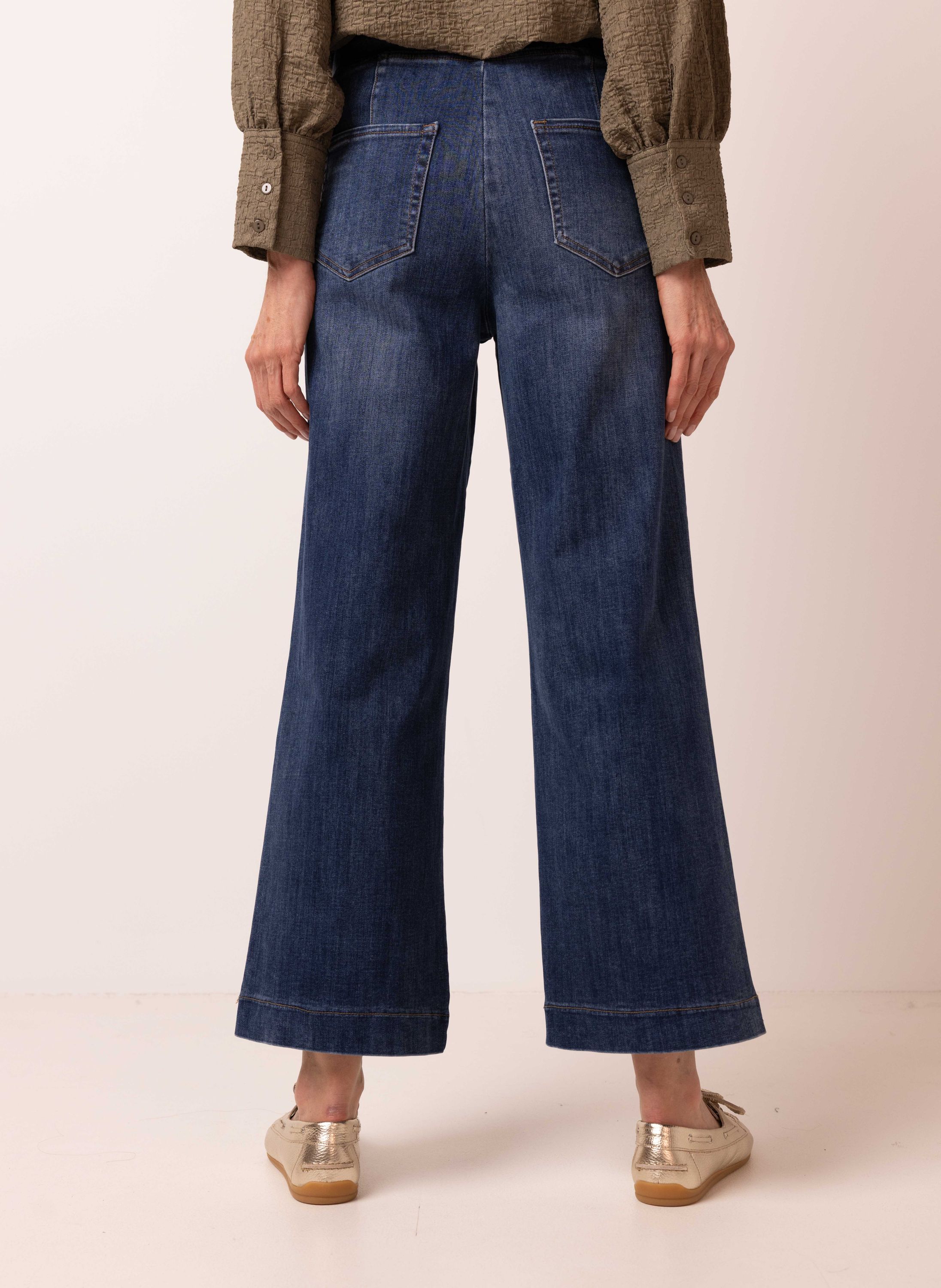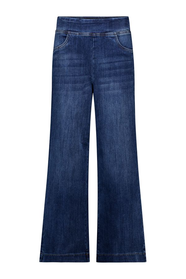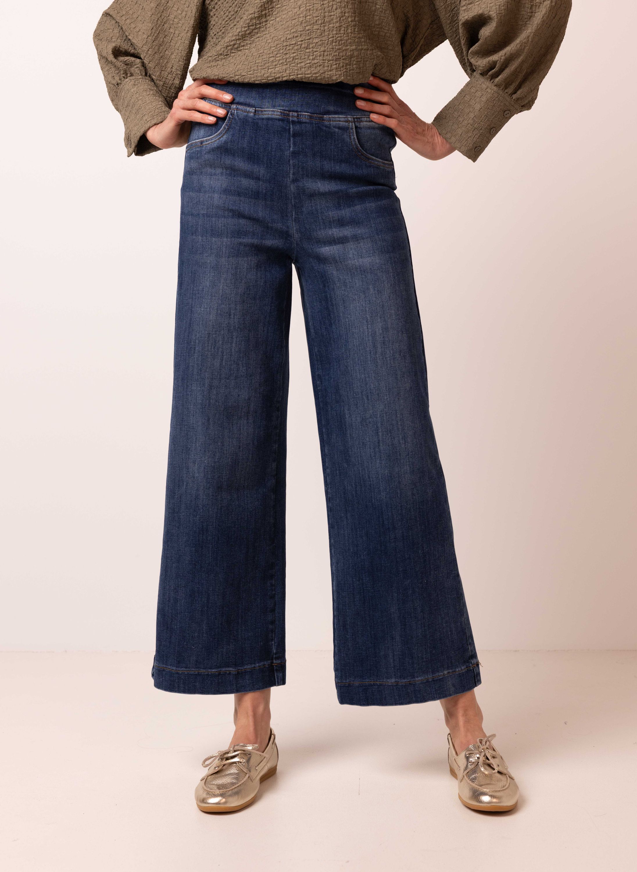 Deze high waist wide fit jeans heeft een elastische tailleband en steekzakken aan de voorzijde. Dit nieuwe model combineert het comfort van een joggingbroek en de tijdloze look van een denim met wijde pijp. Deze jeans is ideaal voor vrouwen met een lengte tussen de 1.65 en 1.70 meter.