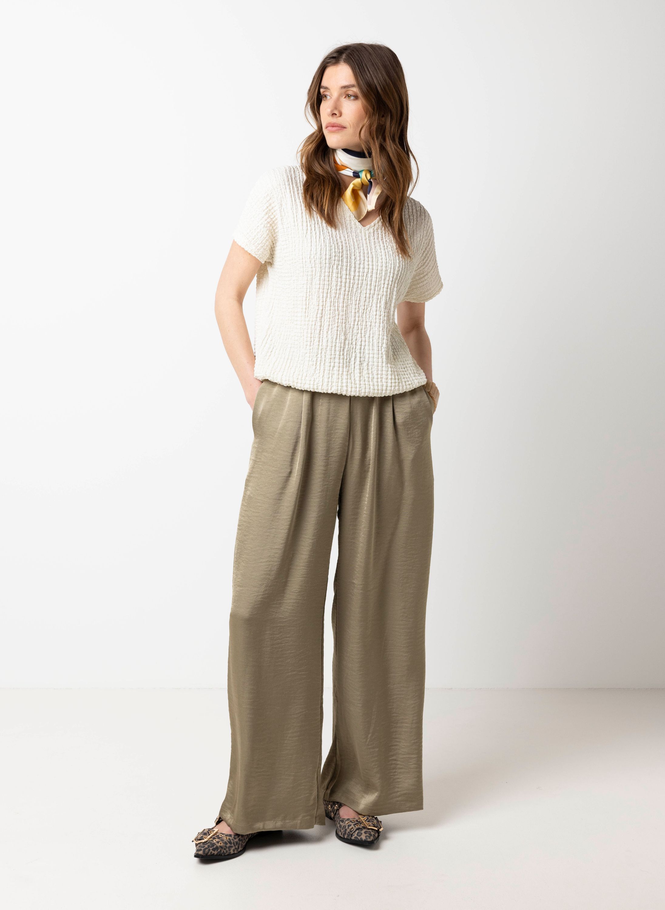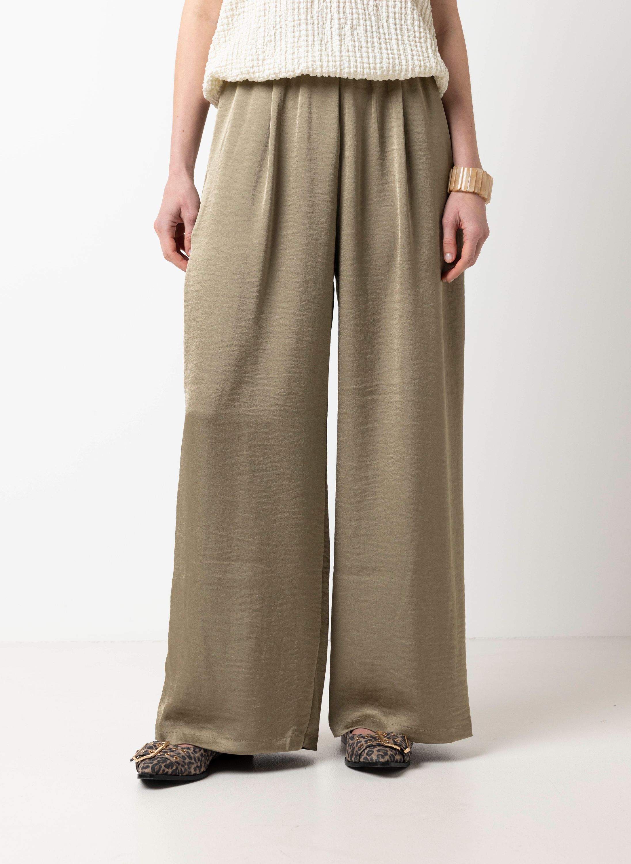 Deze high waist wide fit broek met elastische tailleband en steekzakken is uitgevoerd in satijn en heeft een mooie glans.