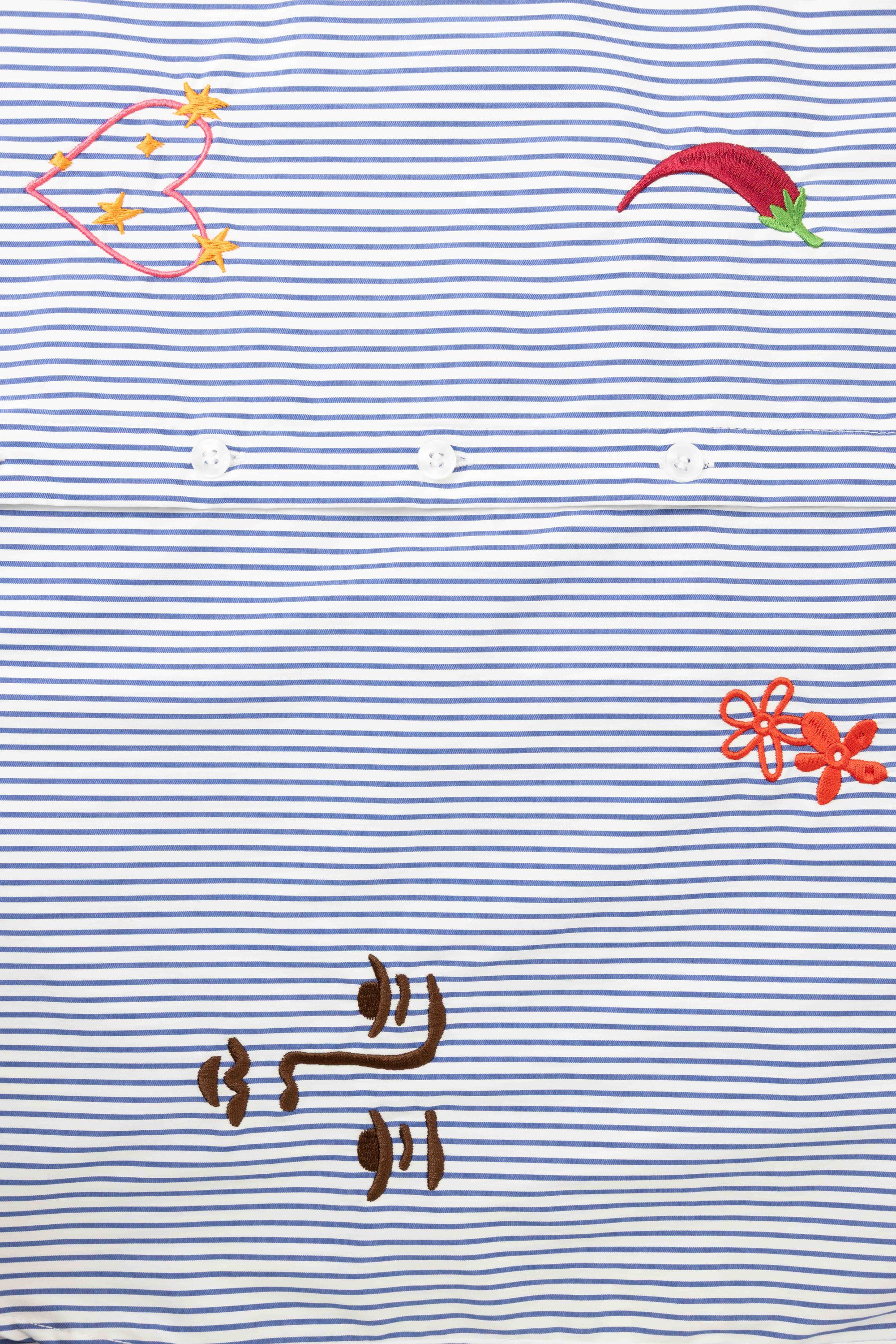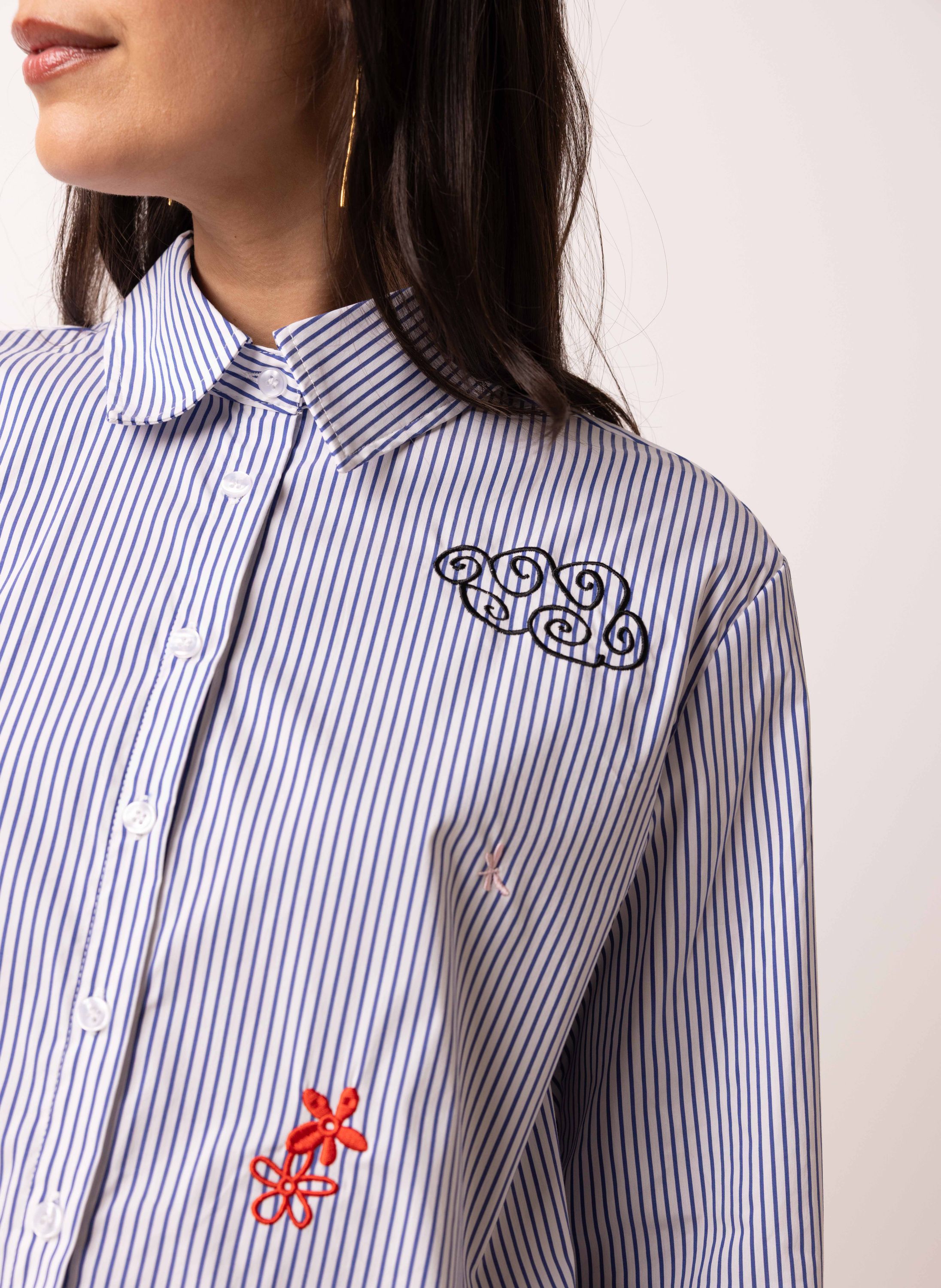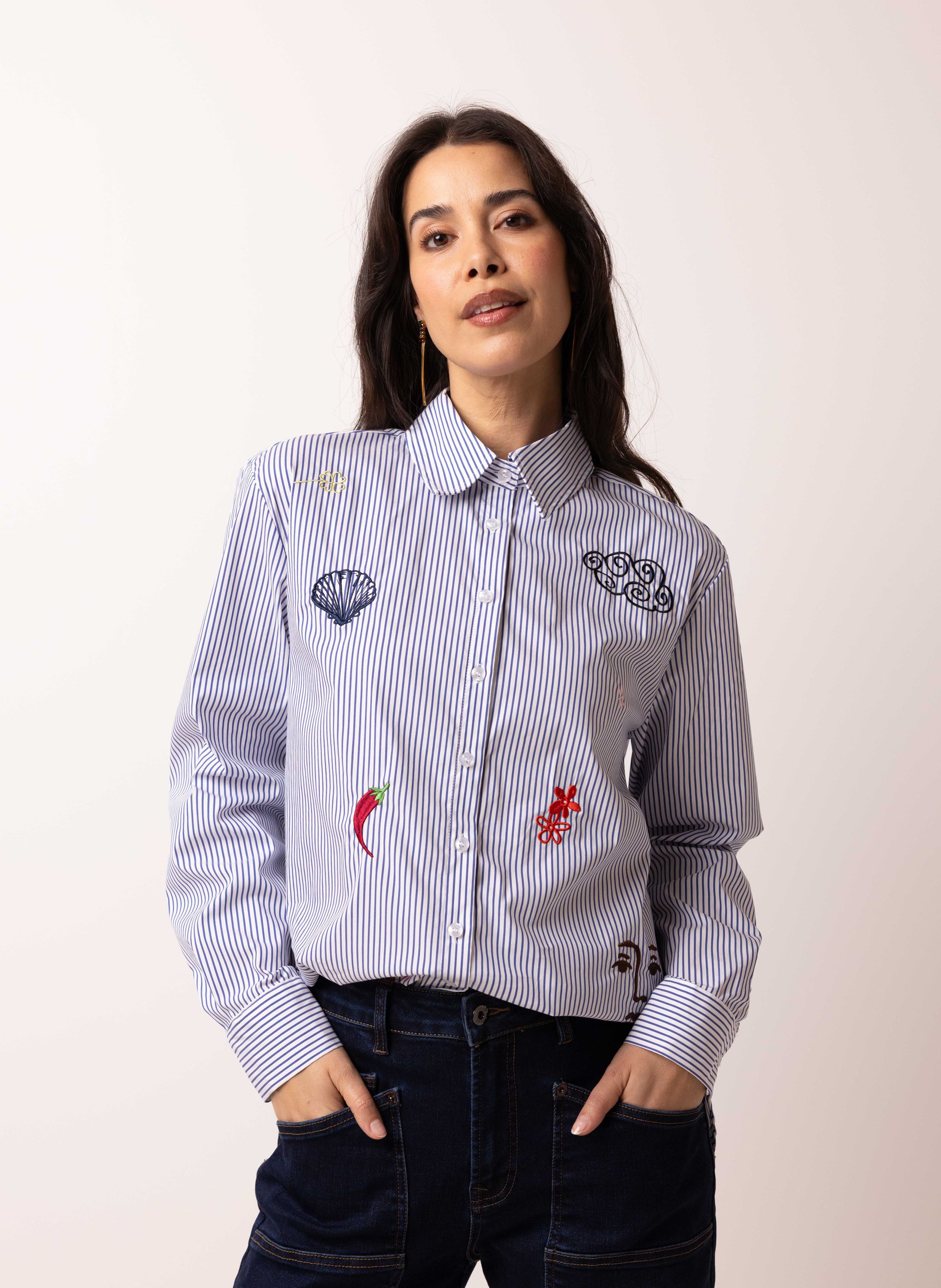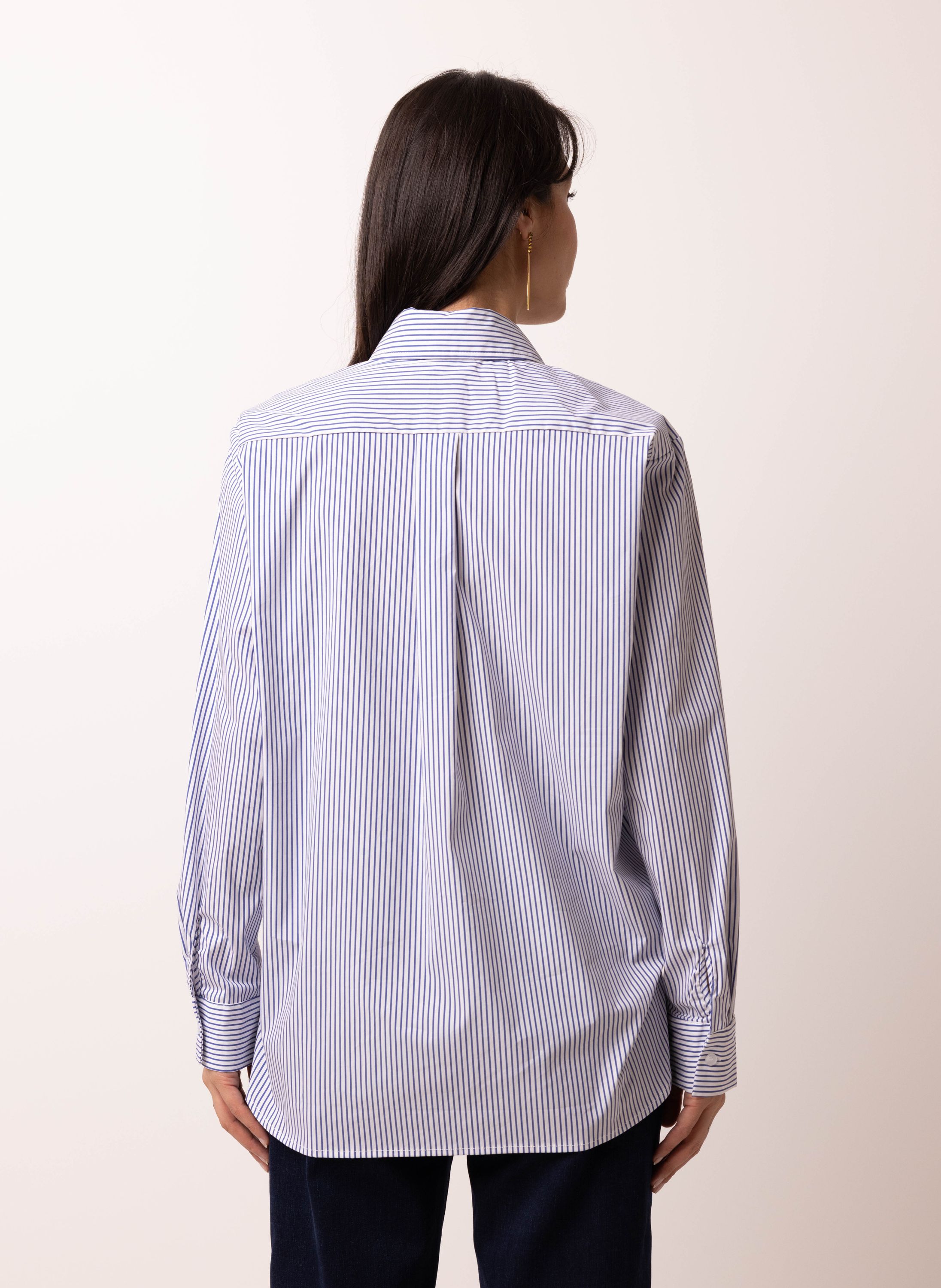 Deze blouse met klassieke kraag heeft een knoopsluiting, lange mouwen en een plooirand aan de achterzijde.