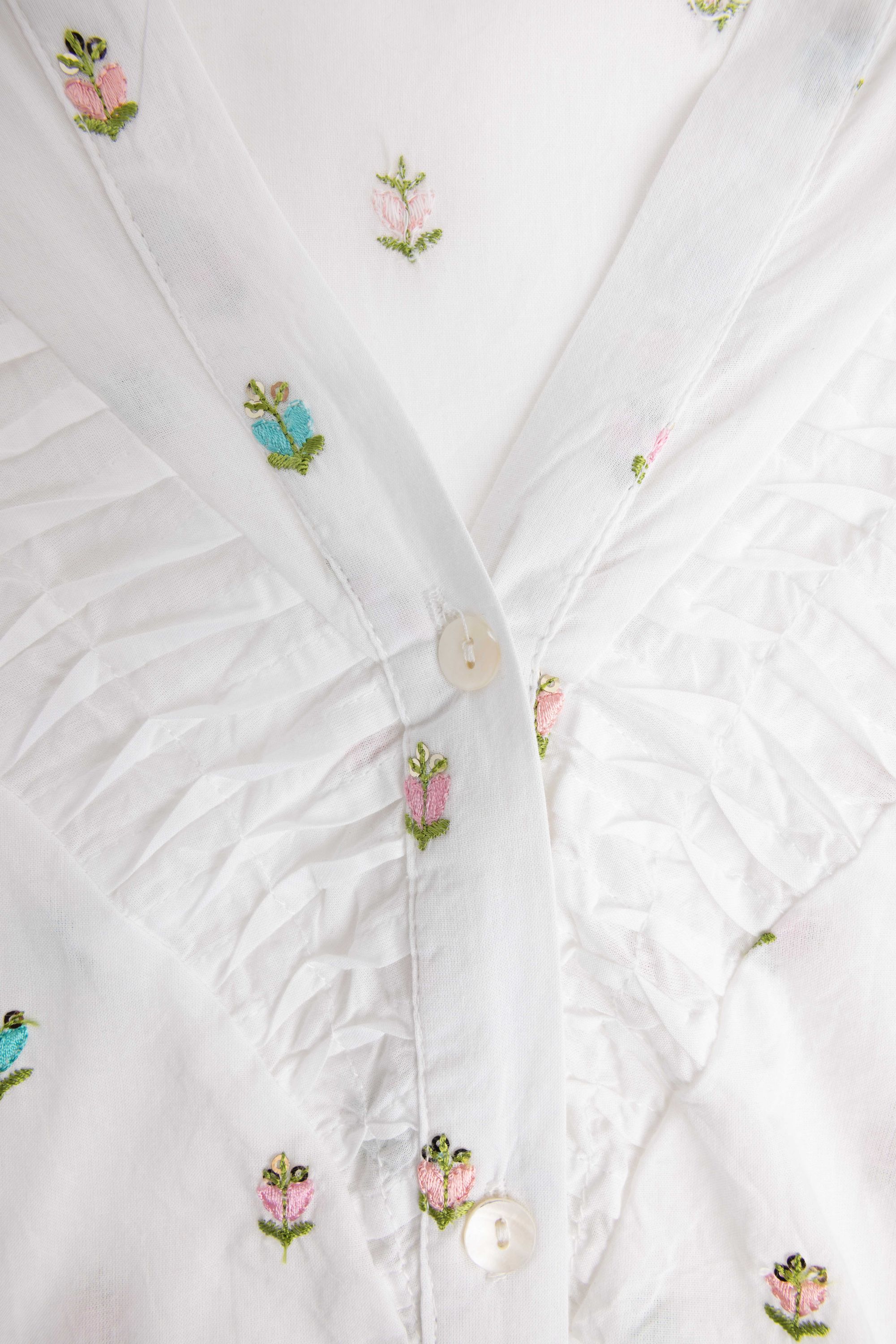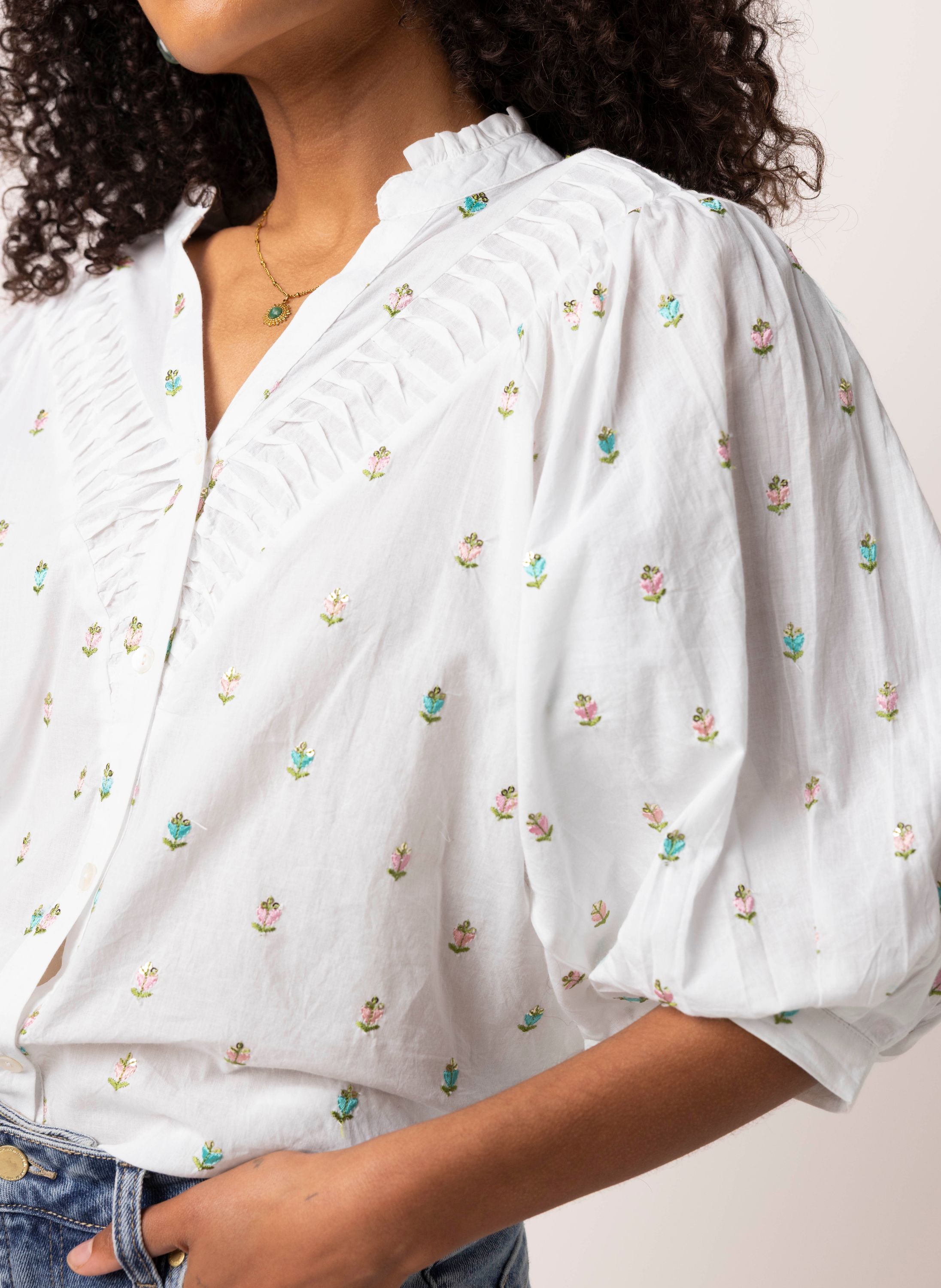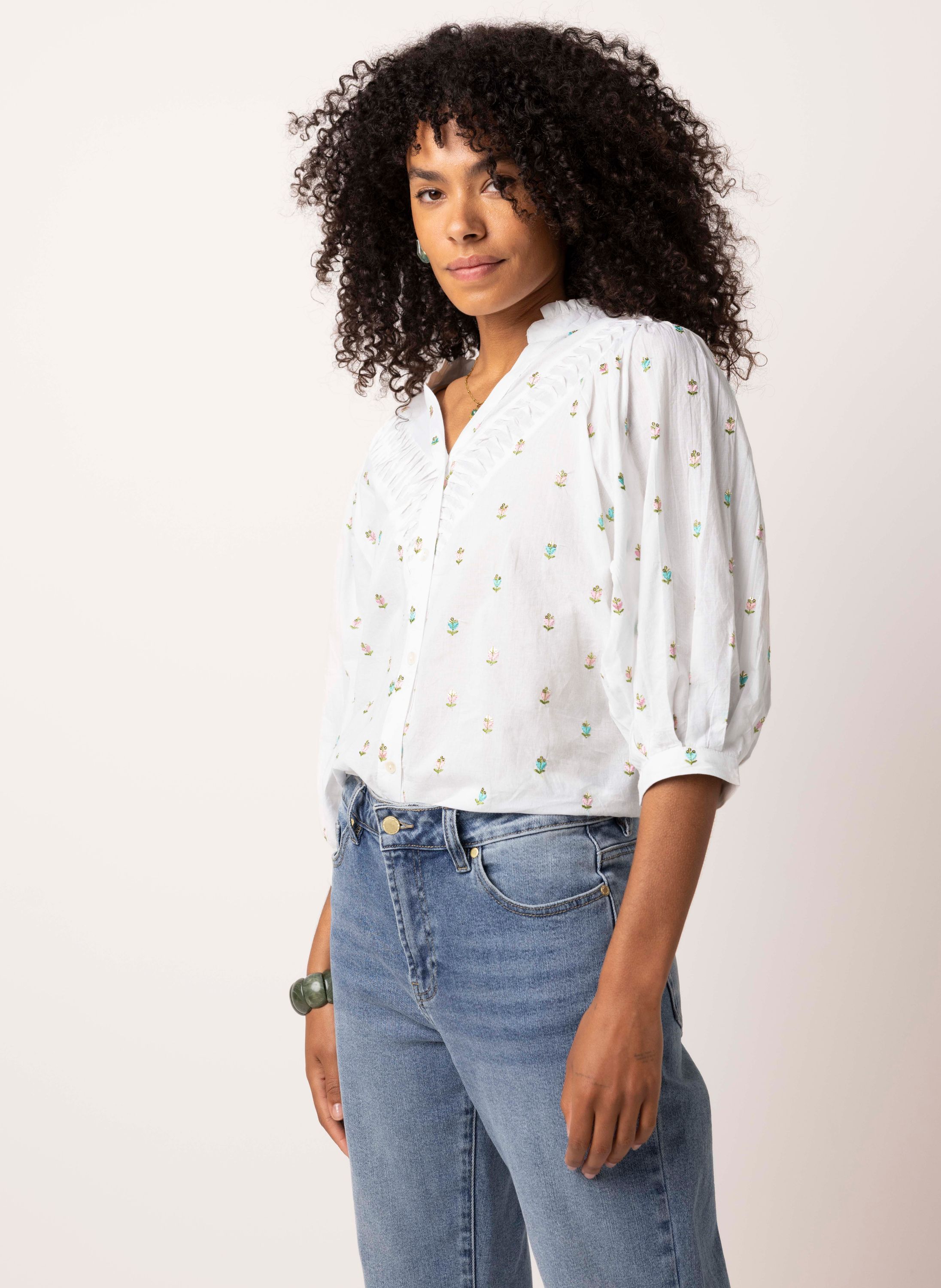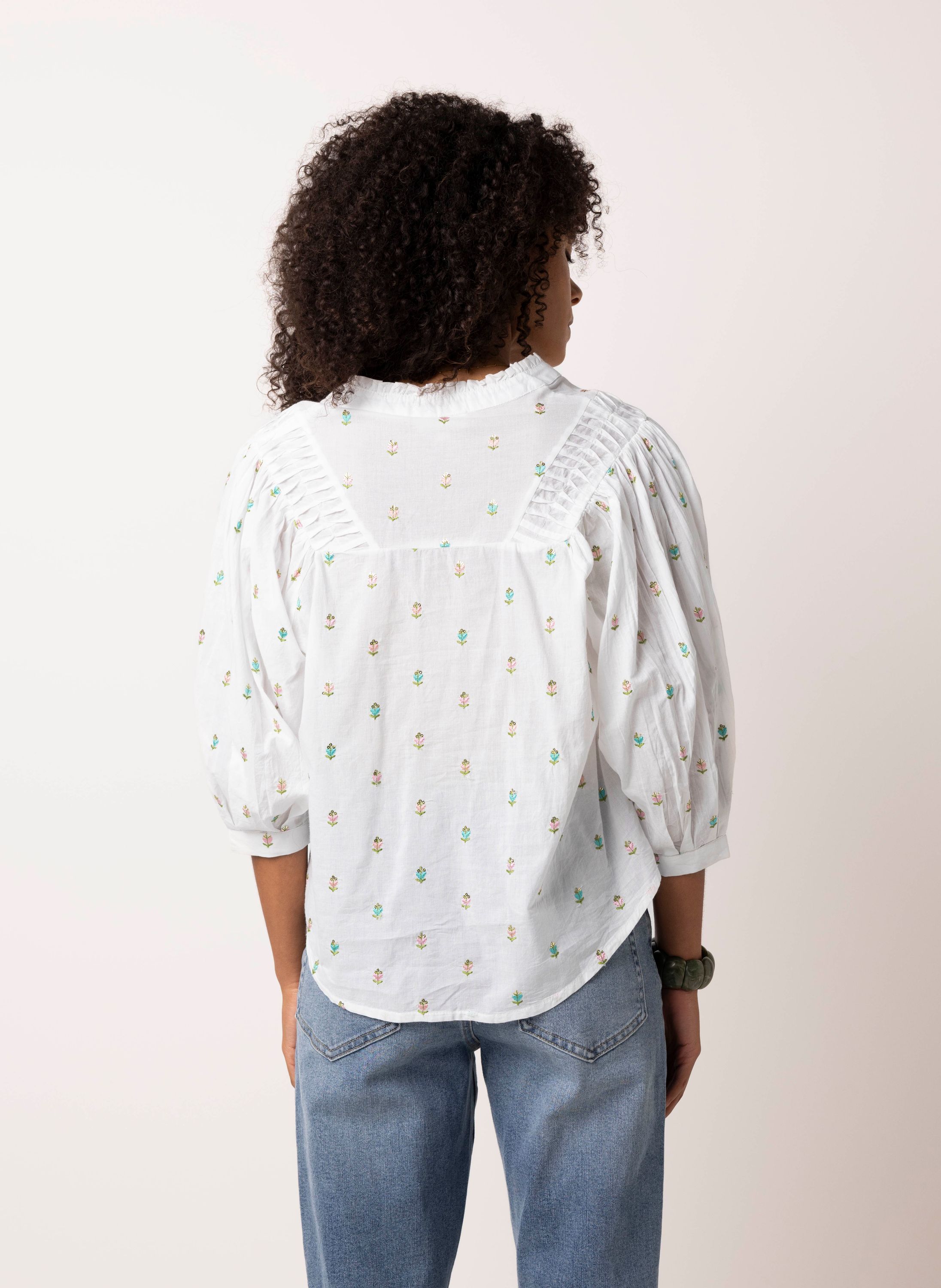 Deze katoenen blouse met V-hals, knoopsluiting en driekwart mouwen schijnt licht door. We adviseren je er een Marianne top onder te dragen.
