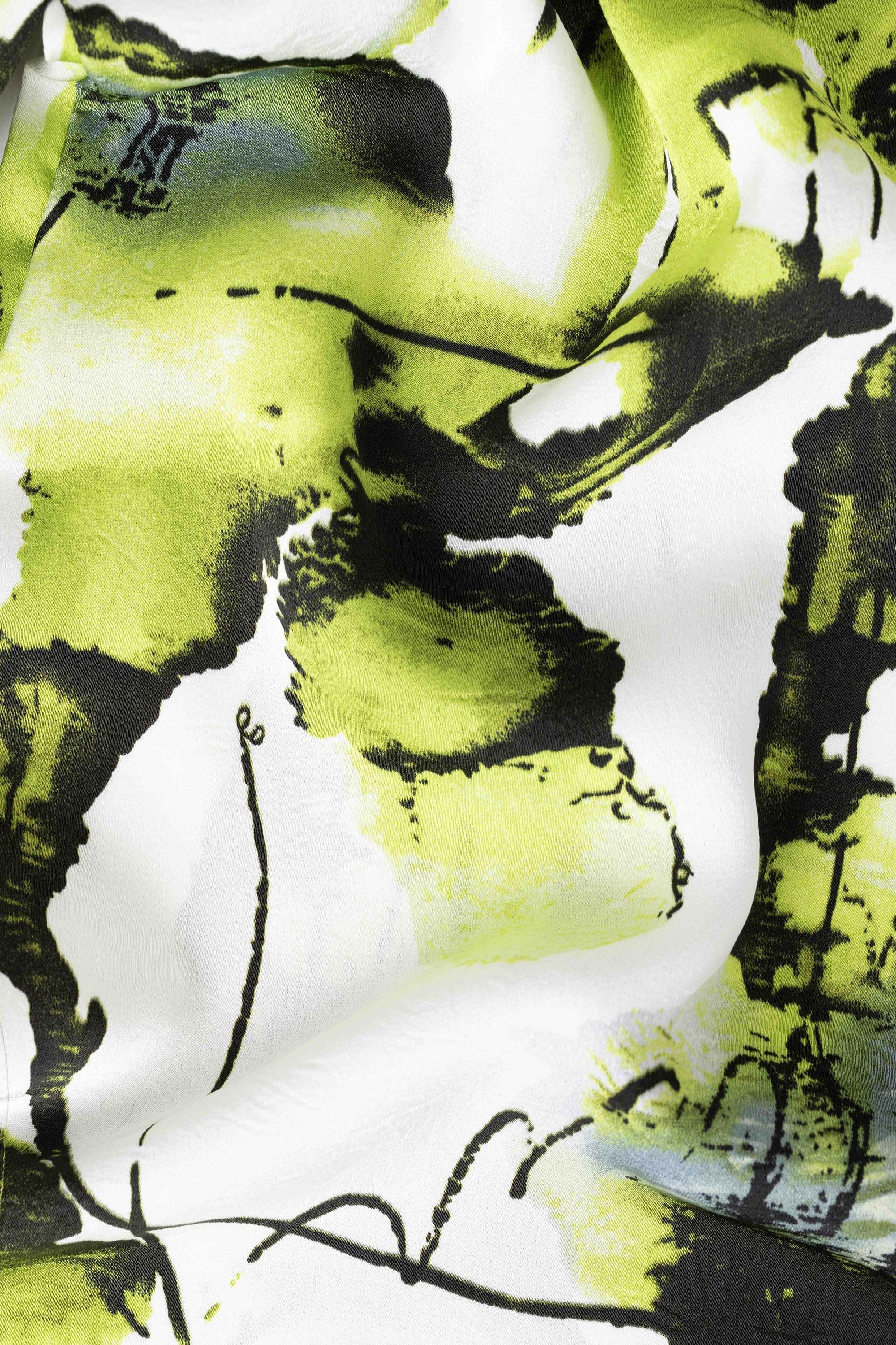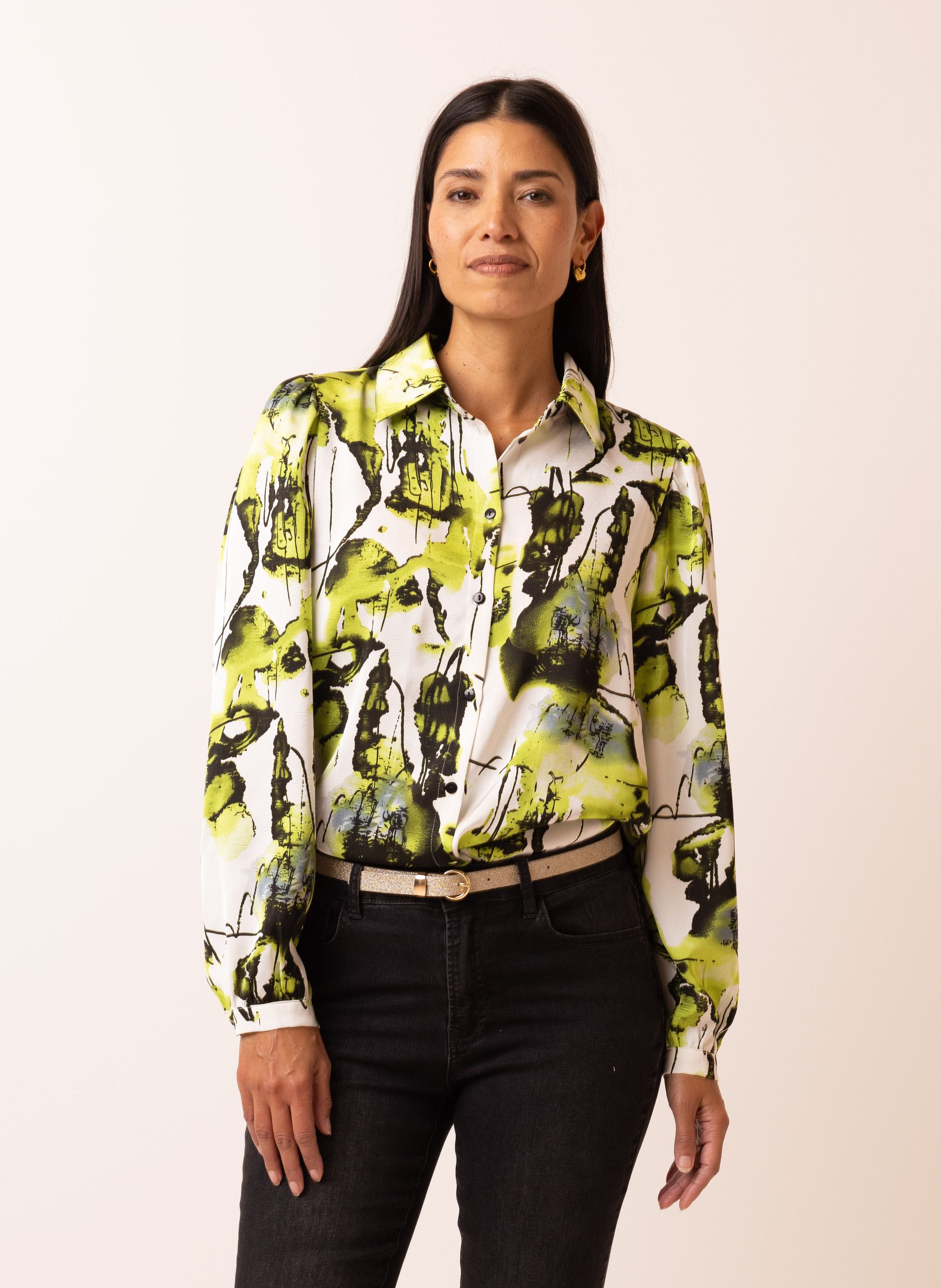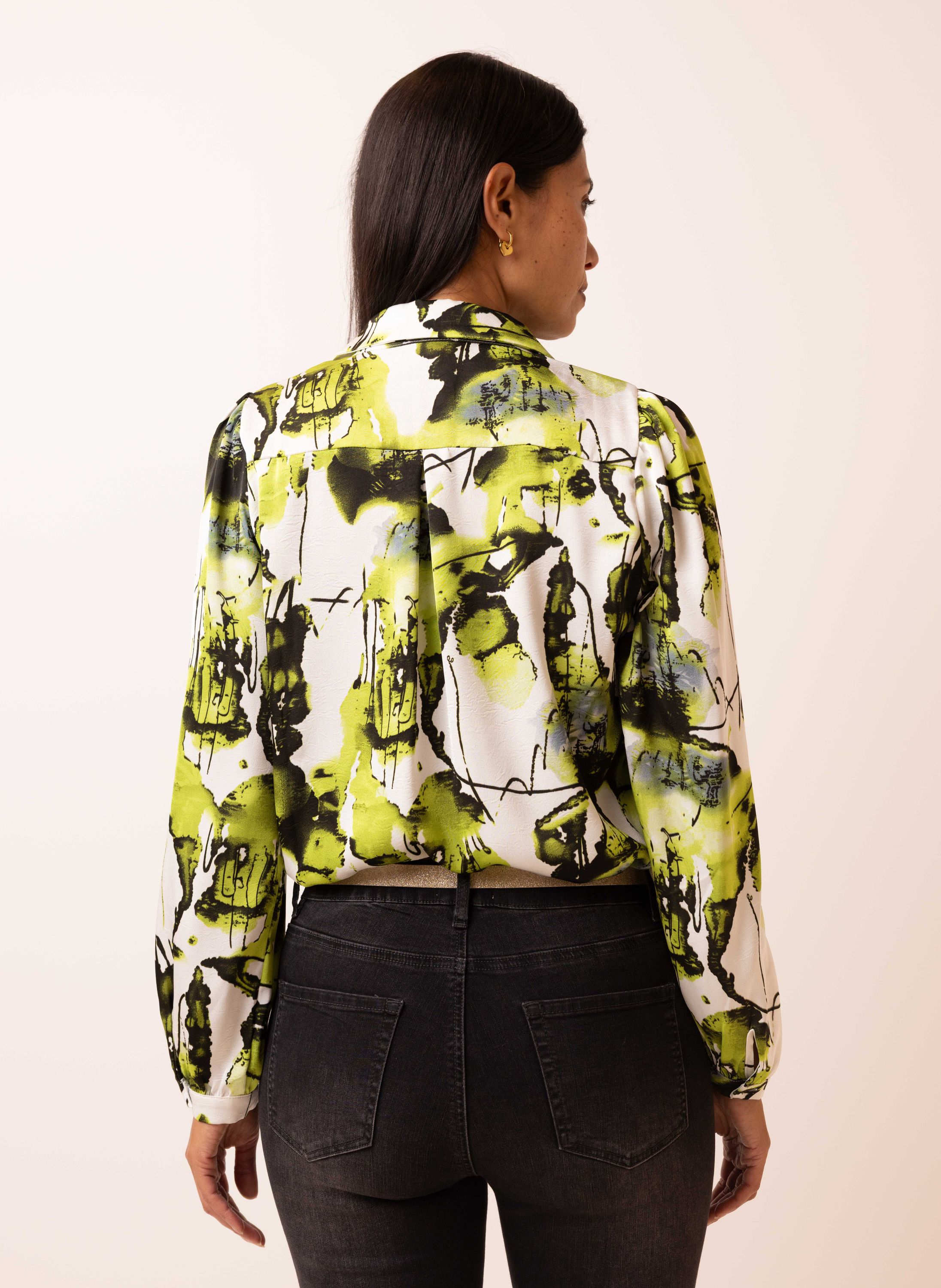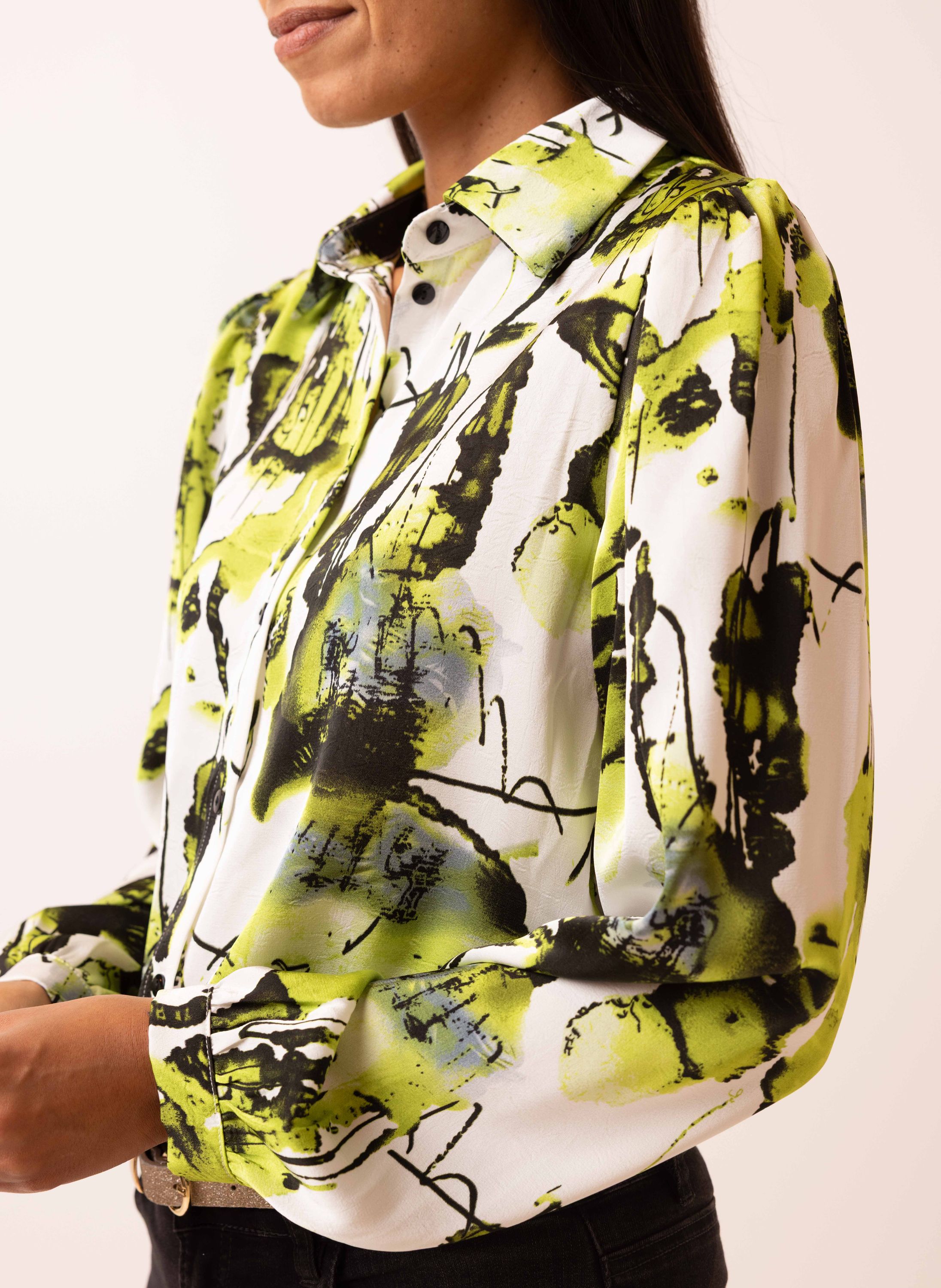 Deze blouse heeft een klassieke kraag, knoopsluiting, lange pofmouwen en plooirand aan de achterzijde.